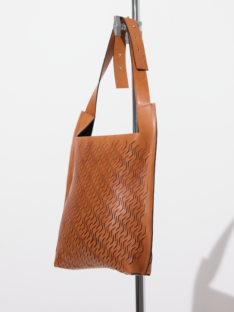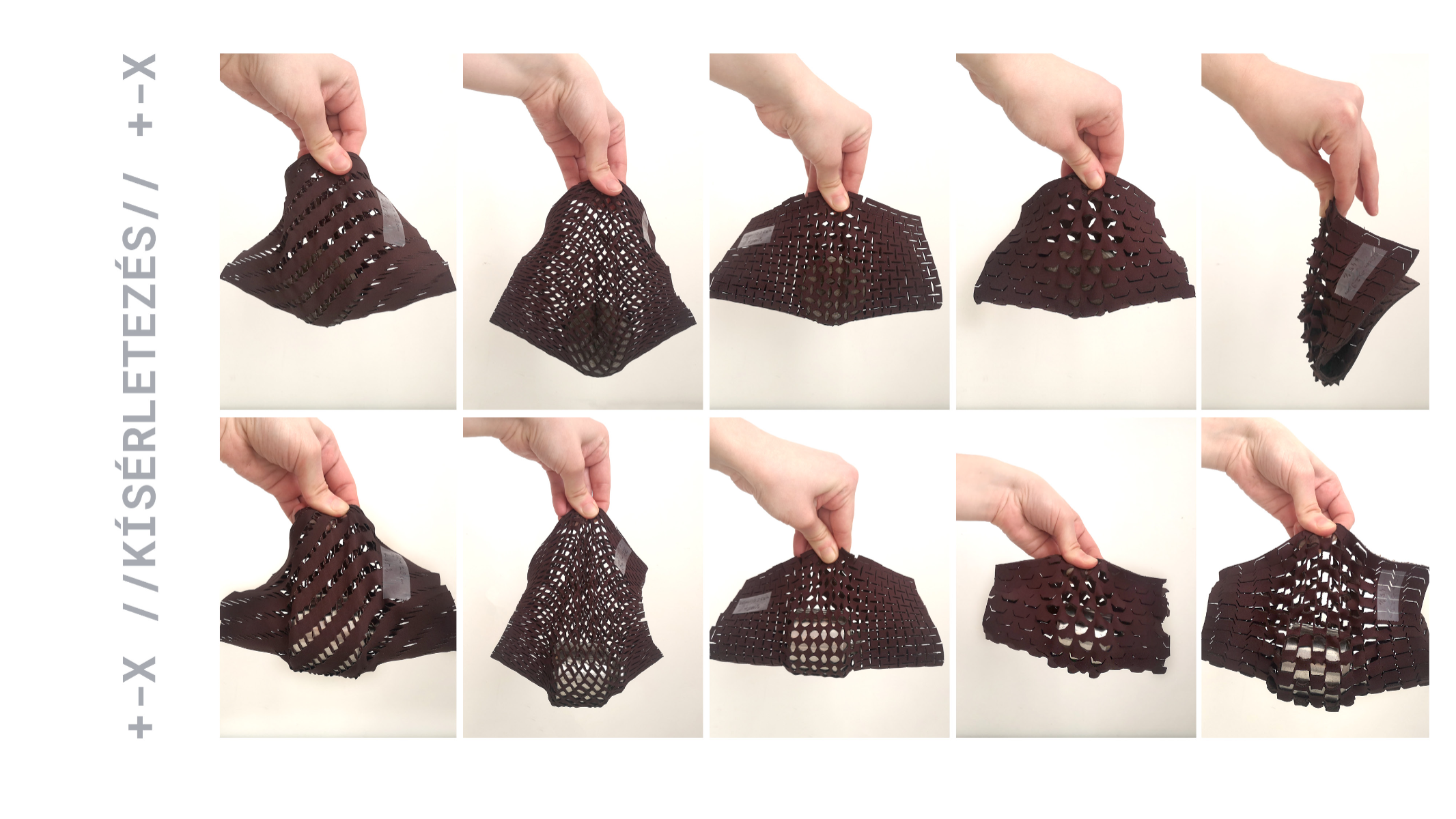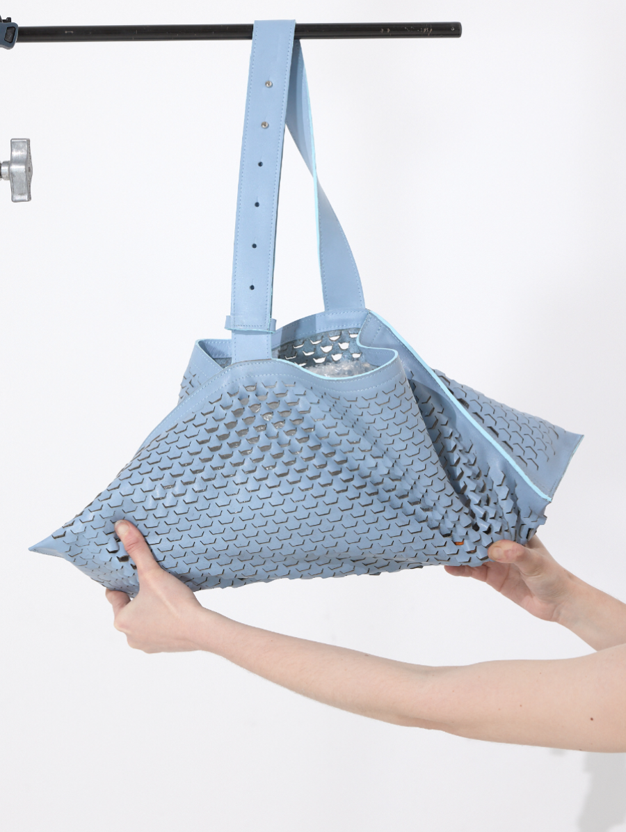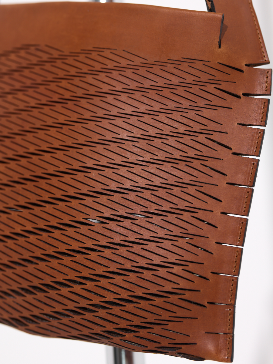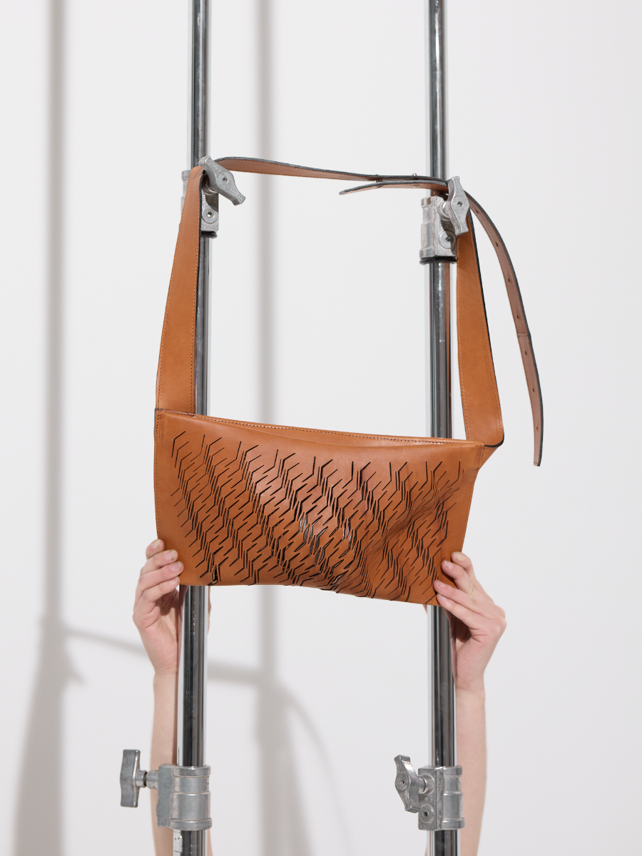 My graduate collection is a group of adaptive shape-changing clothing accessories. The objects are made using a minimal tailoring method with laser-cut perforations to create flexible structures, which makes it possible to size and shape the transformation of the bags in an adaptive way using the elements inserted in them. The collection pieces minimize the amount of raw material used and tailoring waste during manufacturing. I present pattern systems and variations on leather materials of different thicknesses and characters through the scale and pattern variations of the several cut surfaces.