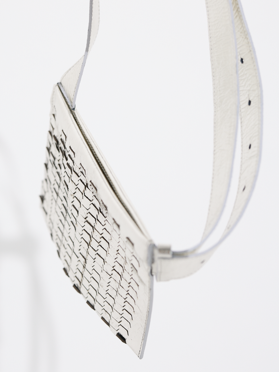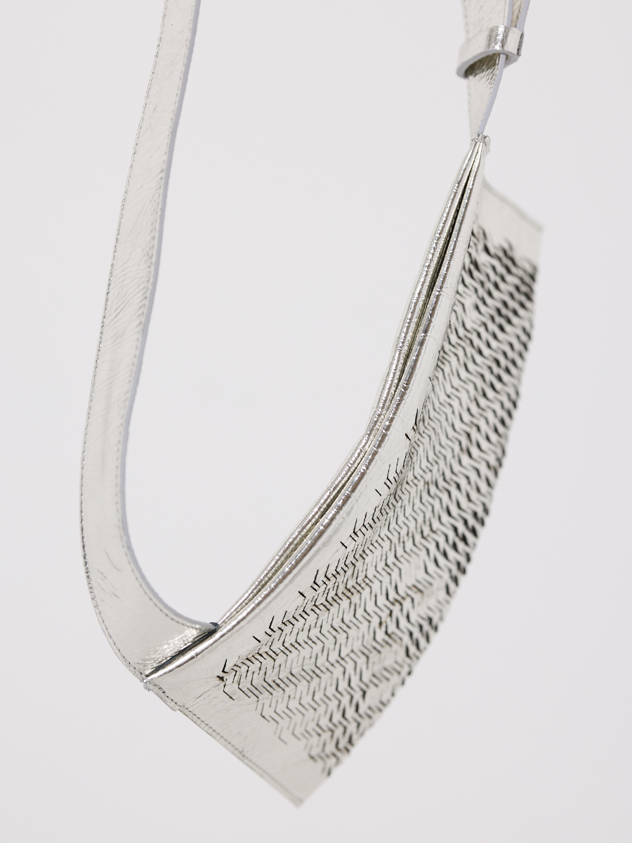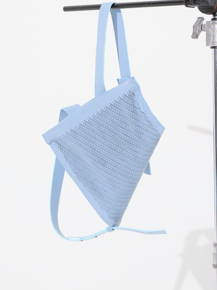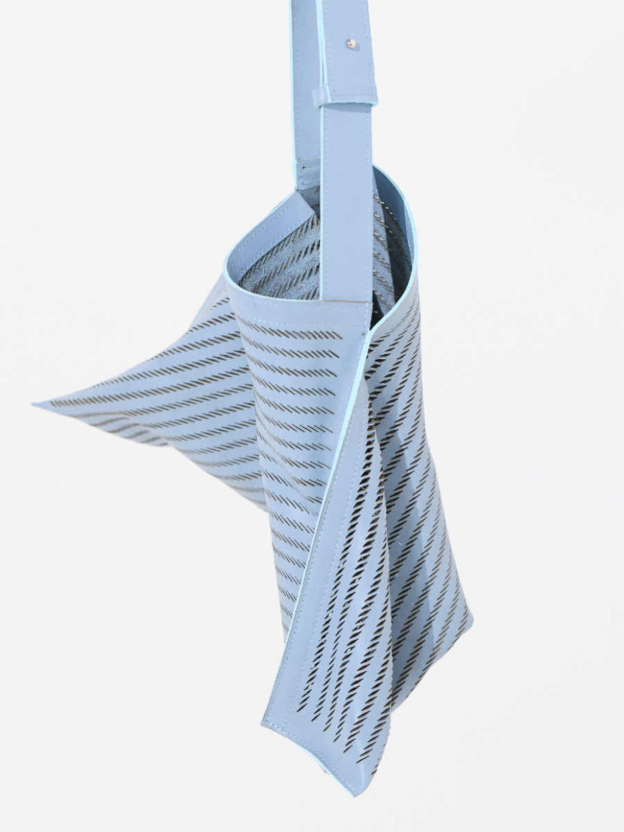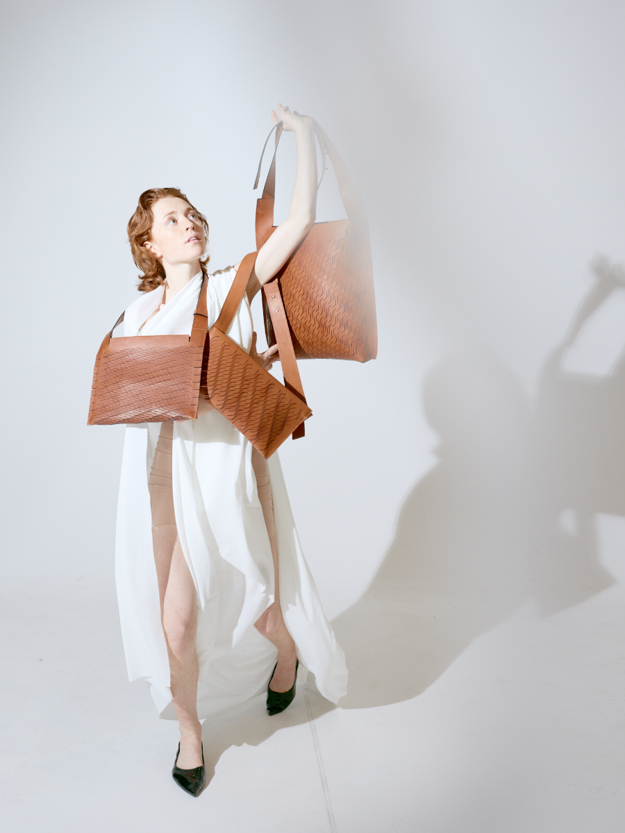 My graduate collection is a group of adaptive shape-changing clothing accessories. The objects are made using a minimal tailoring method with laser-cut perforations to create flexible structures, which makes it possible to size and shape the transformation of the bags in an adaptive way using the elements inserted in them. The collection pieces minimize the amount of raw material used and tailoring waste during manufacturing. I present pattern systems and variations on leather materials of different thicknesses and characters through the scale and pattern variations of the several cut surfaces.