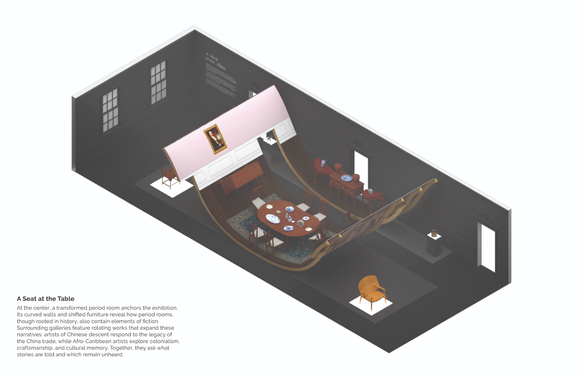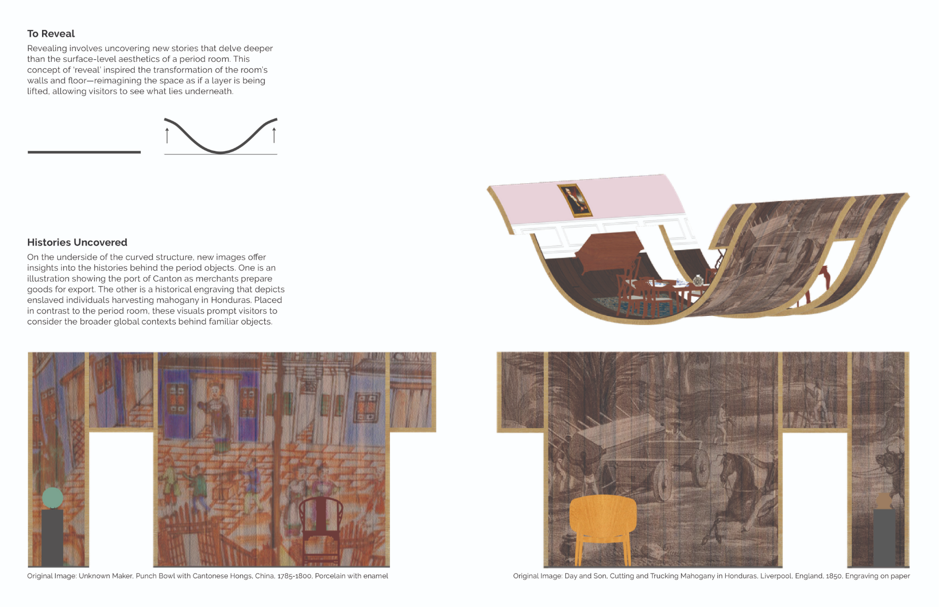 Period rooms—immersive museum spaces that recreate historic interiors—provide glimpses into past domestic life but often fail to capture the broader cultural and political contexts of their time. Traditionally focused on Eurocentric elite households, they frequently obscure the experiences of marginalized communities and the global systems of trade, slavery, and colonialism that shaped many objects. As museums strive for greater inclusivity, period rooms can be reimagined through new display strategies, contemporary interventions, and overlooked artifacts. Focusing on the RISD Museum’s Pendleton House, this project proposes how transforming period rooms can deepen visitor engagement and broaden historical narratives. Full thesis book: https://digitalcommons.risd.edu/cgi/viewcontent.cgi?article=2447&context=masterstheses