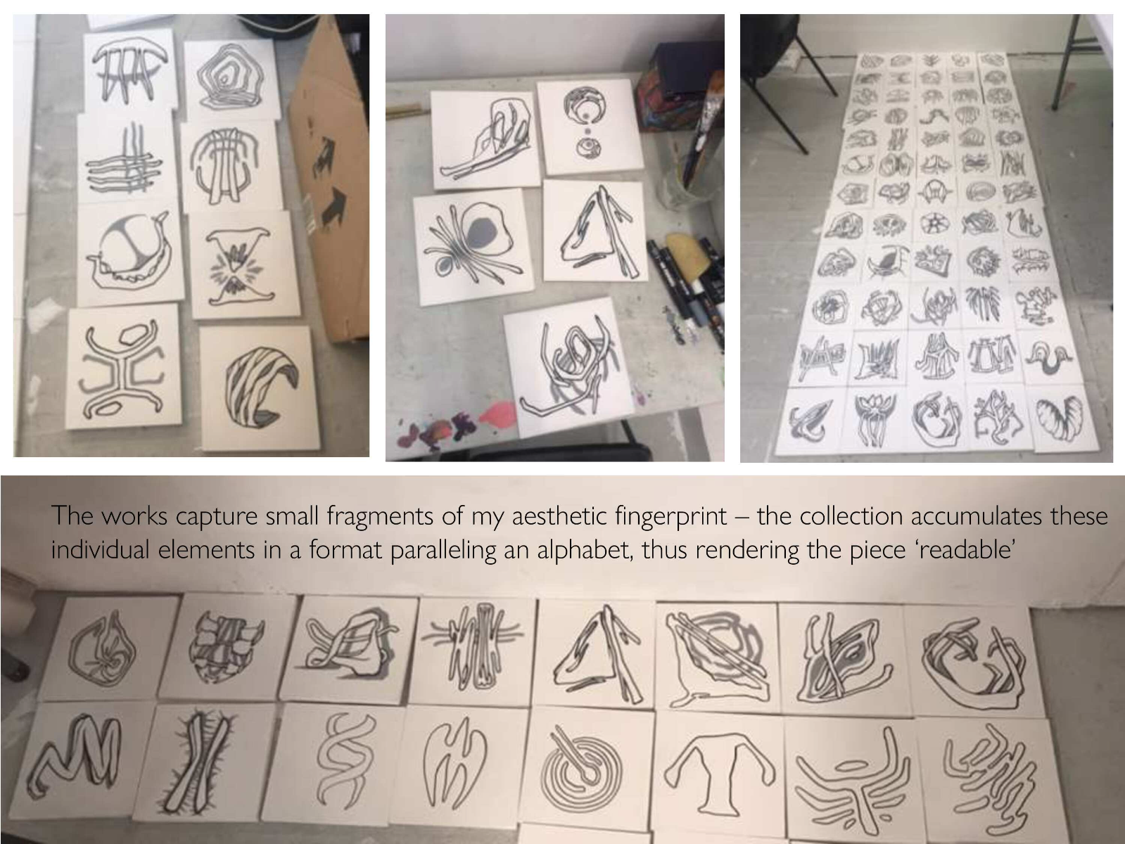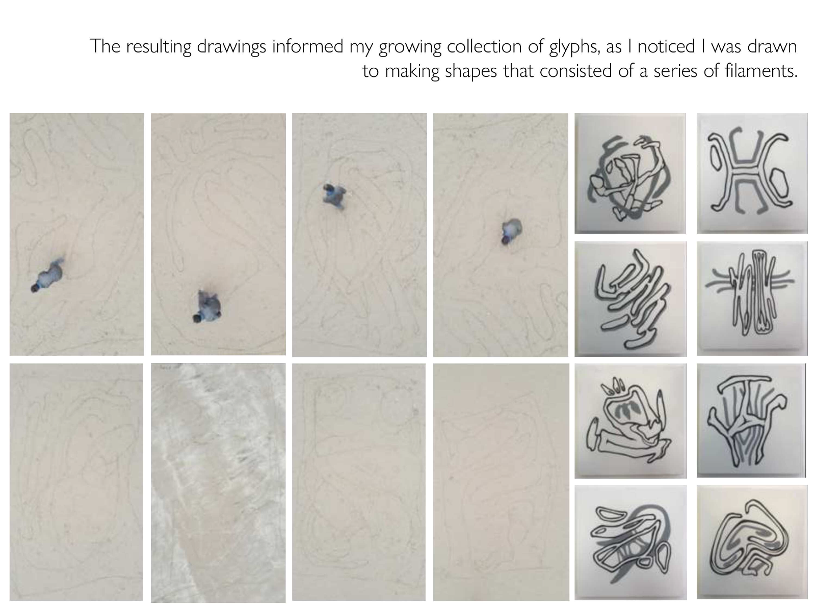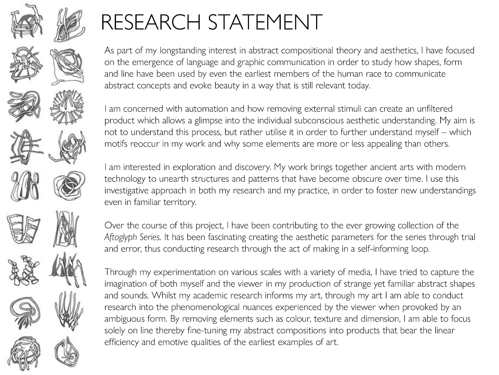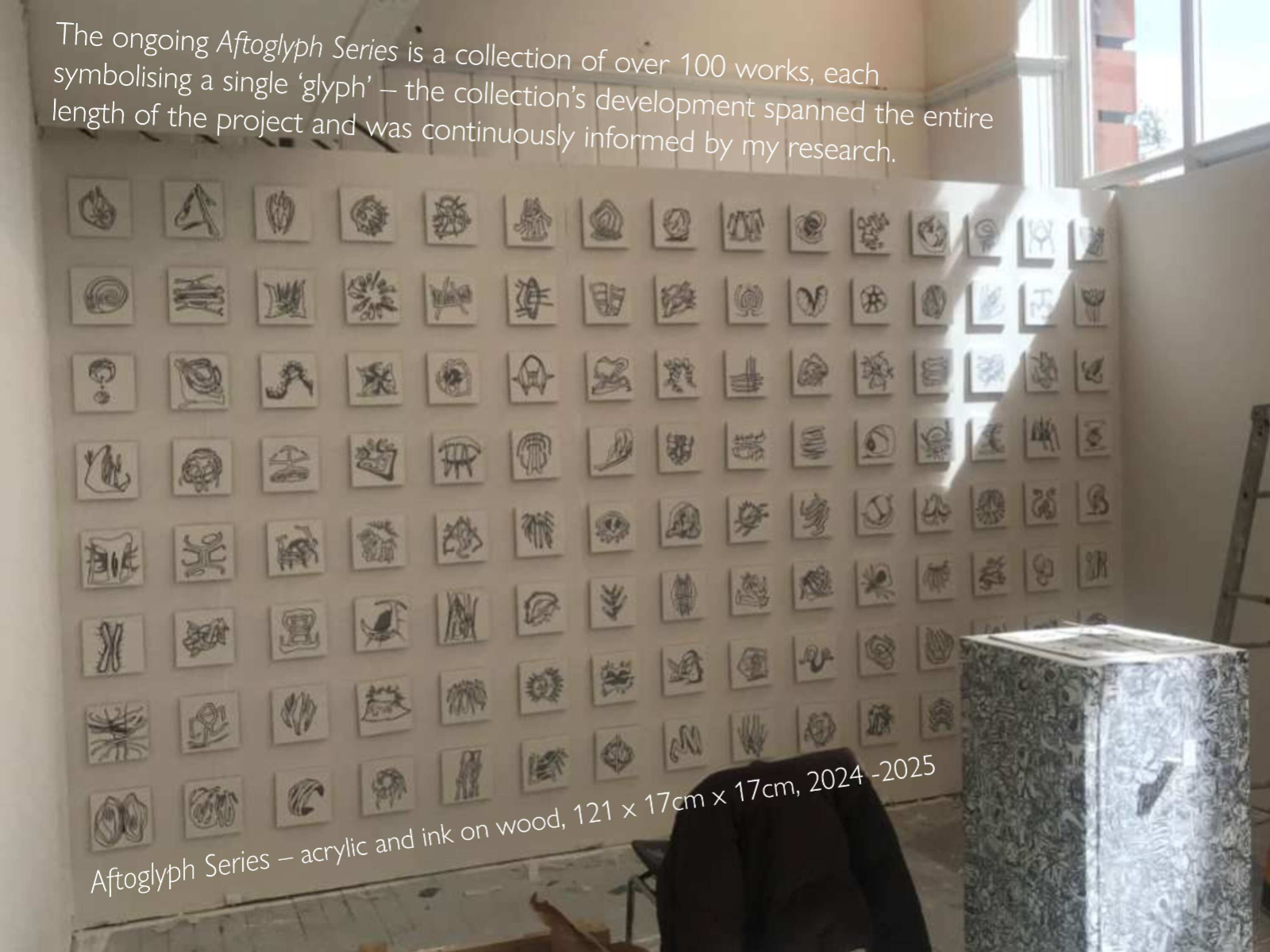 The human need to communicate and ‘leave a mark’ is ancient, visible even in the earliest traces of prehistoric life. Symbols - both representational and abstract - have persisted throughout history, surviving even the twentieth century’s so-called ‘death of painting.’ In my Aftoglyph installation, I created 121 glyphs shaped from forms that feel both organic and alien. Each distills my exploration of line and form into a visual fingerprint of my aesthetic language, shaped by targeted research and refined automation. My work seeks the obscure while probing the innate. The installation’s fragments invite viewers to assemble meaning for themselves.