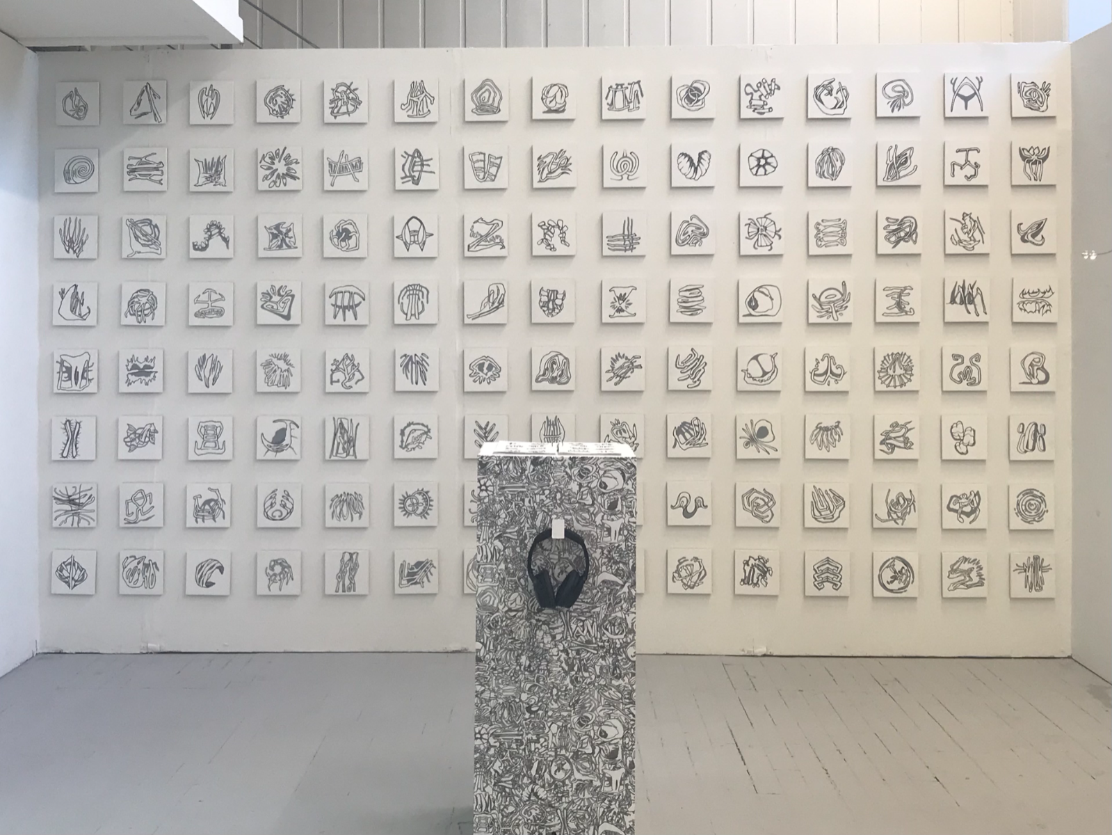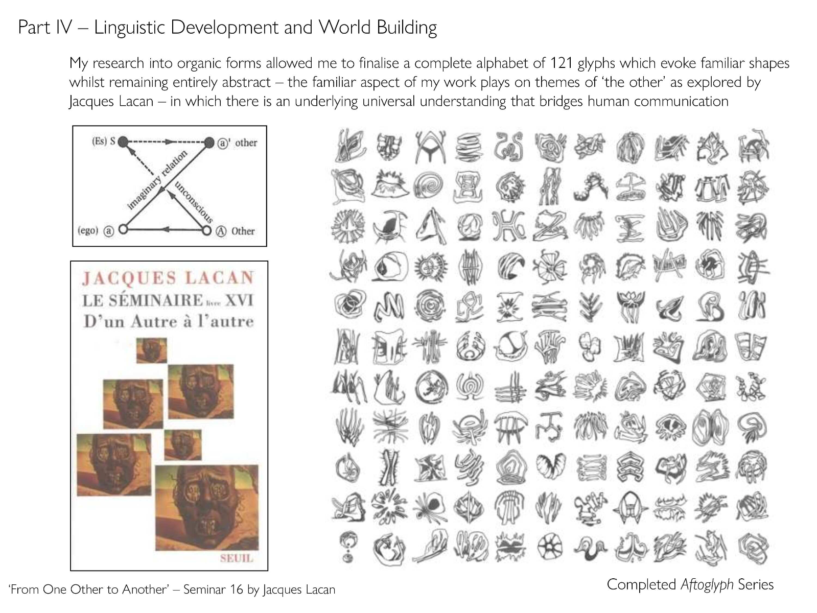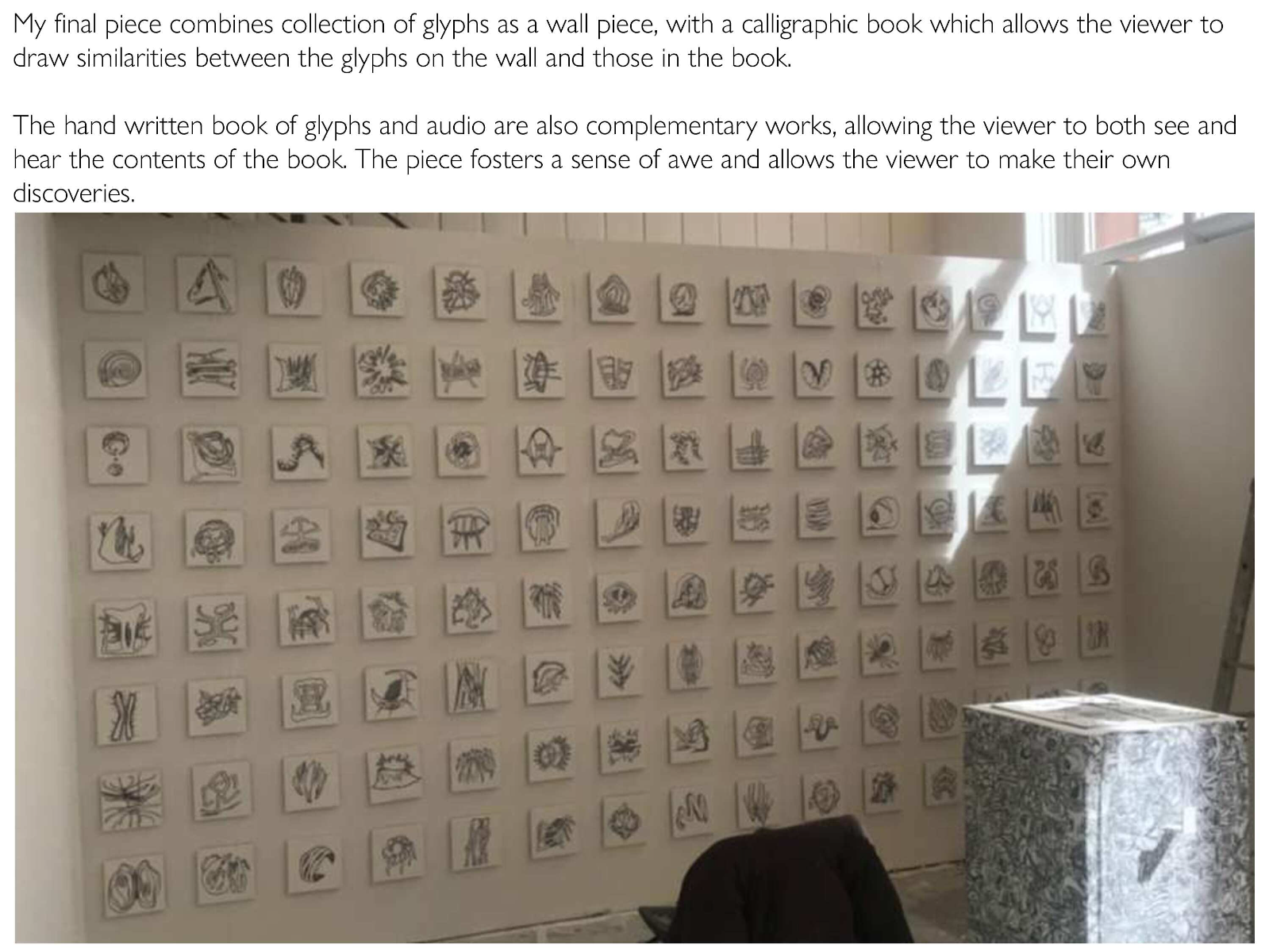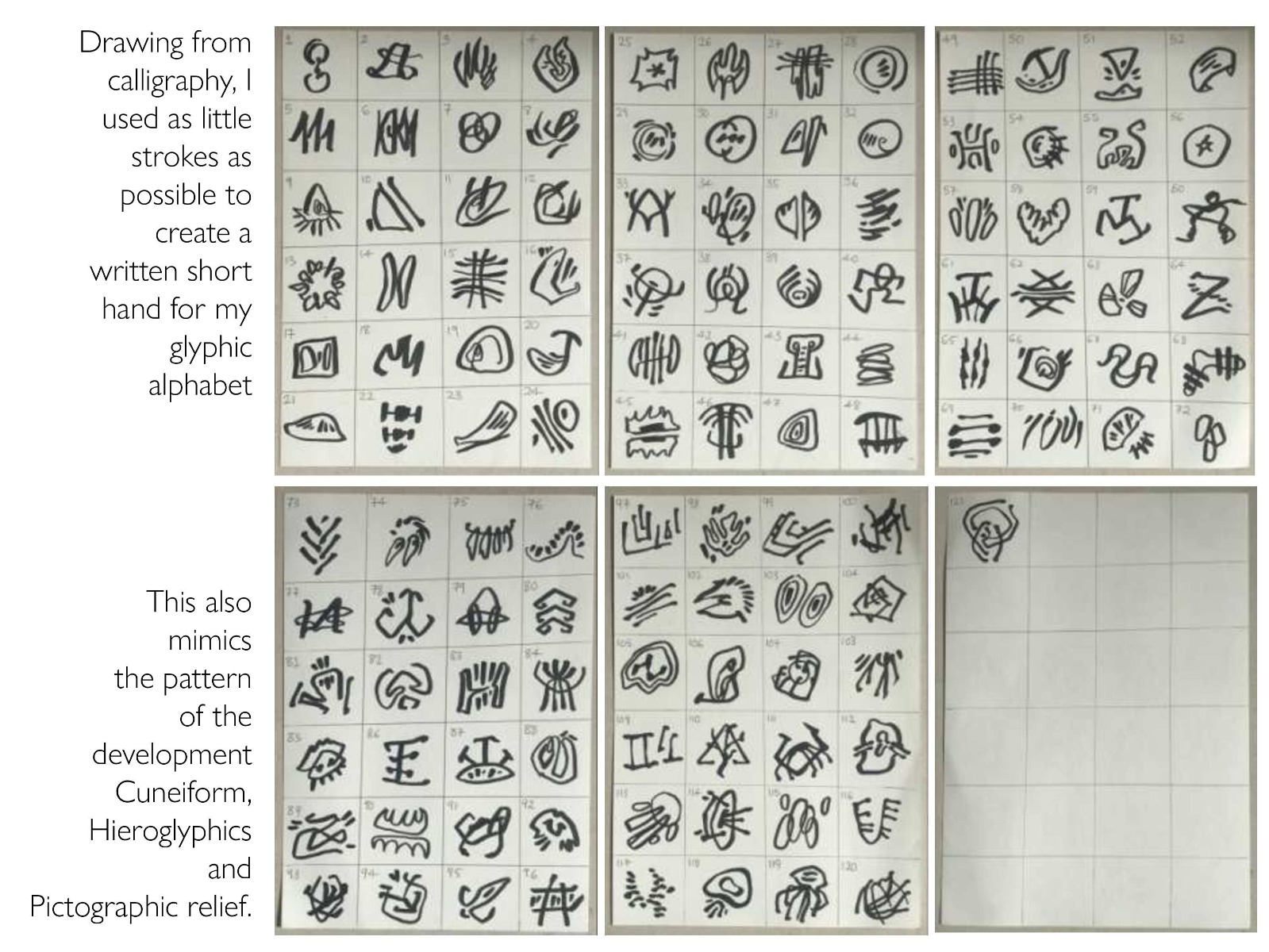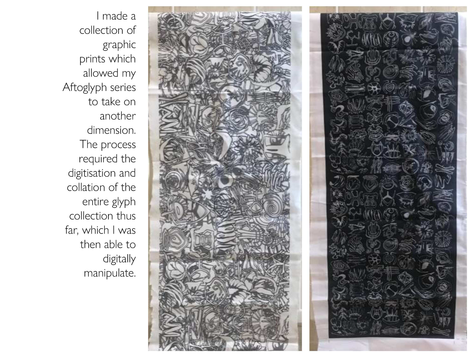 The human need to communicate and ‘leave a mark’ is ancient, visible even in the earliest traces of prehistoric life. Symbols - both representational and abstract - have persisted throughout history, surviving even the twentieth century’s so-called ‘death of painting.’ In my Aftoglyph installation, I created 121 glyphs shaped from forms that feel both organic and alien. Each distills my exploration of line and form into a visual fingerprint of my aesthetic language, shaped by targeted research and refined automation. My work seeks the obscure while probing the innate. The installation’s fragments invite viewers to assemble meaning for themselves.