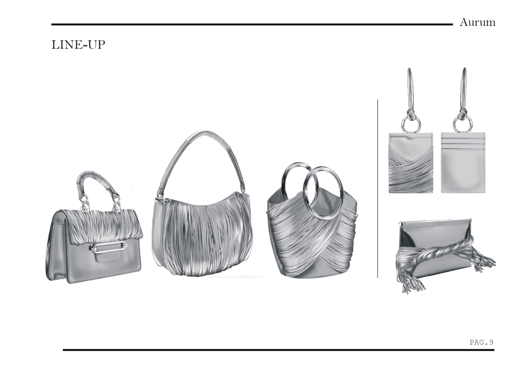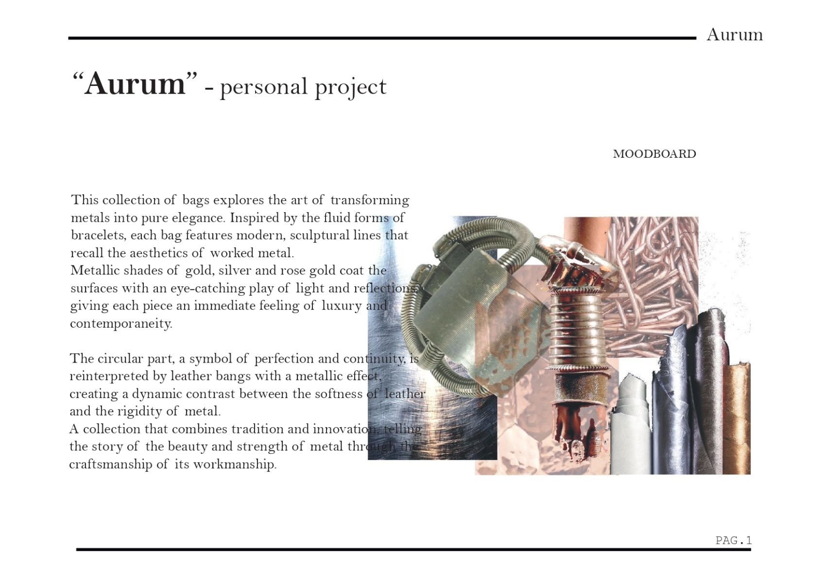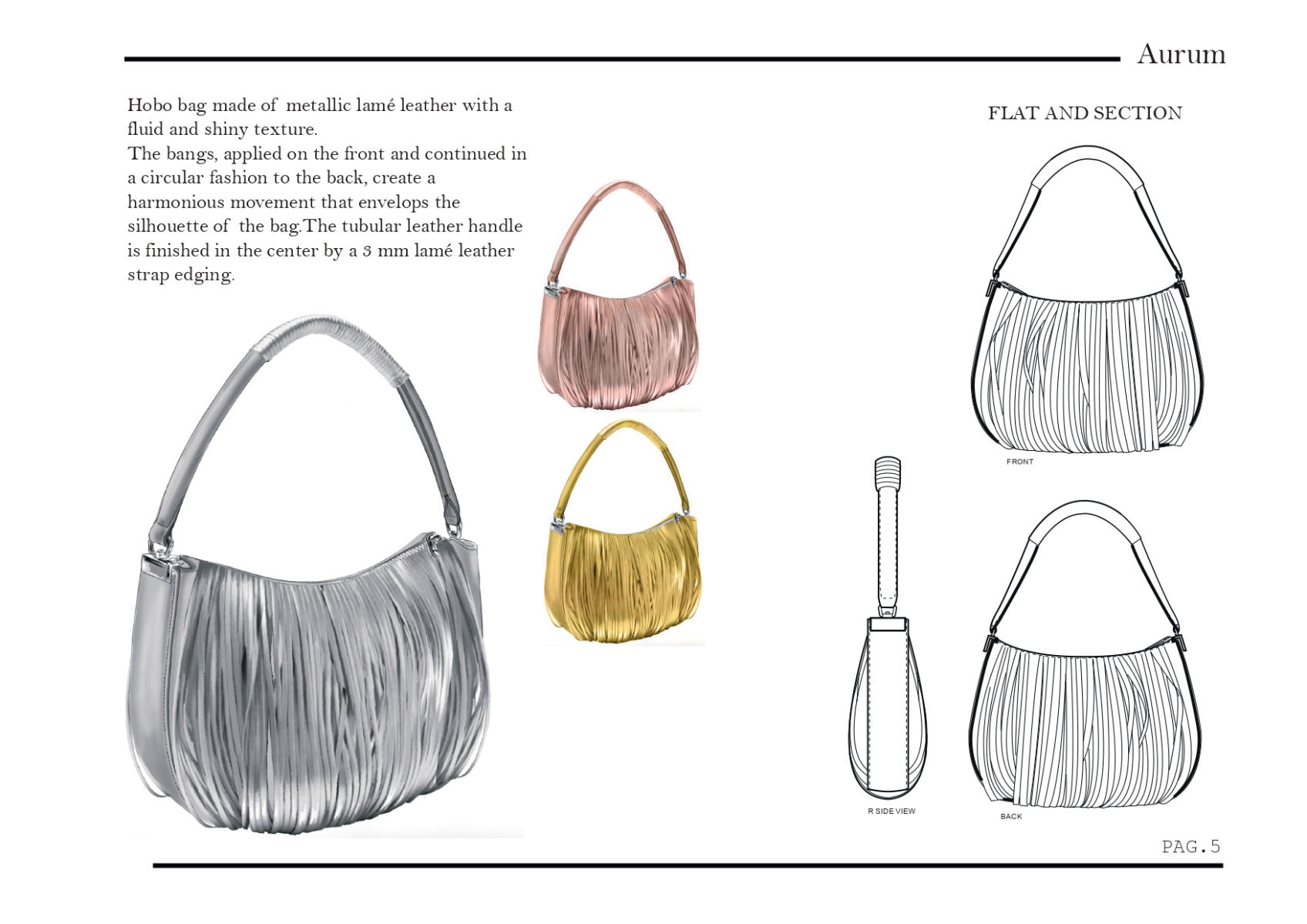 This collection of bags explores the art of transforming metals into pure elegance. Inspired by the fluid forms of bracelets, each bag features modern, sculptural lines that recall the aesthetics of worked metal. Metallic shades of gold, silver and rose gold coat the surfaces with an eye-catching play of light and reflections giving each piece an immediate feeling of luxury and contemporaneity. The circular part, a symbol of perfection and continuity, is reinterpreted by leather bangs with a metallic effect. creating a dynamic contrast between the softness of leather and the rigidity of metal. A collection that combines tradition and innovation, telling the story of the beauty and strength of metal through th craftsmanship of its workmanship.