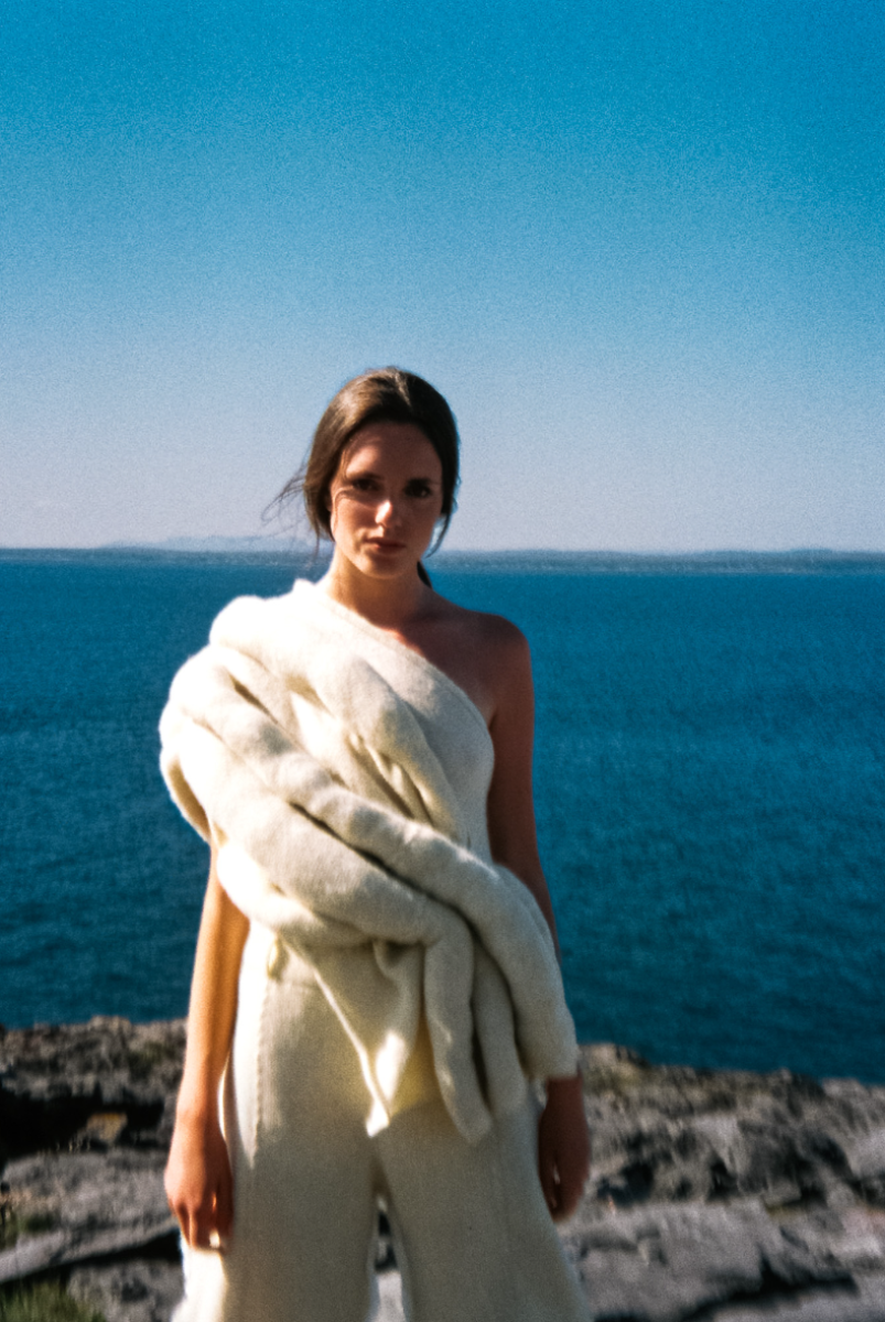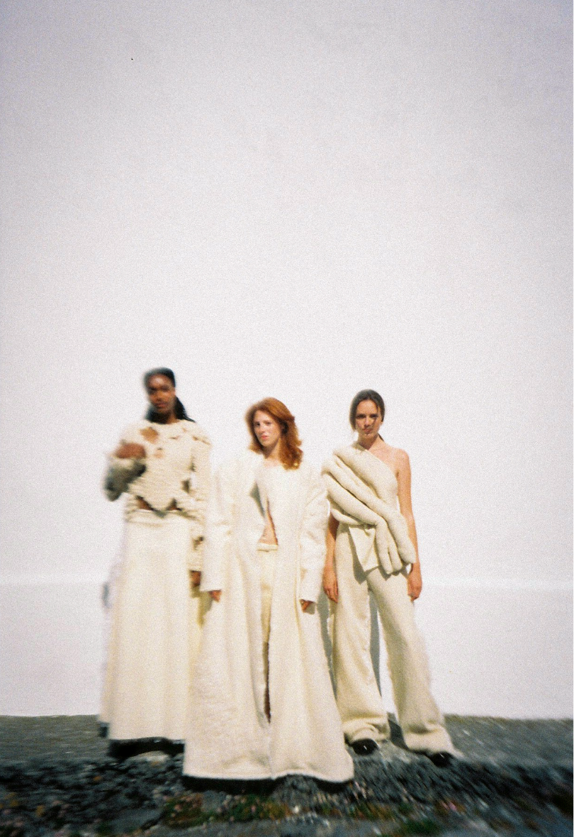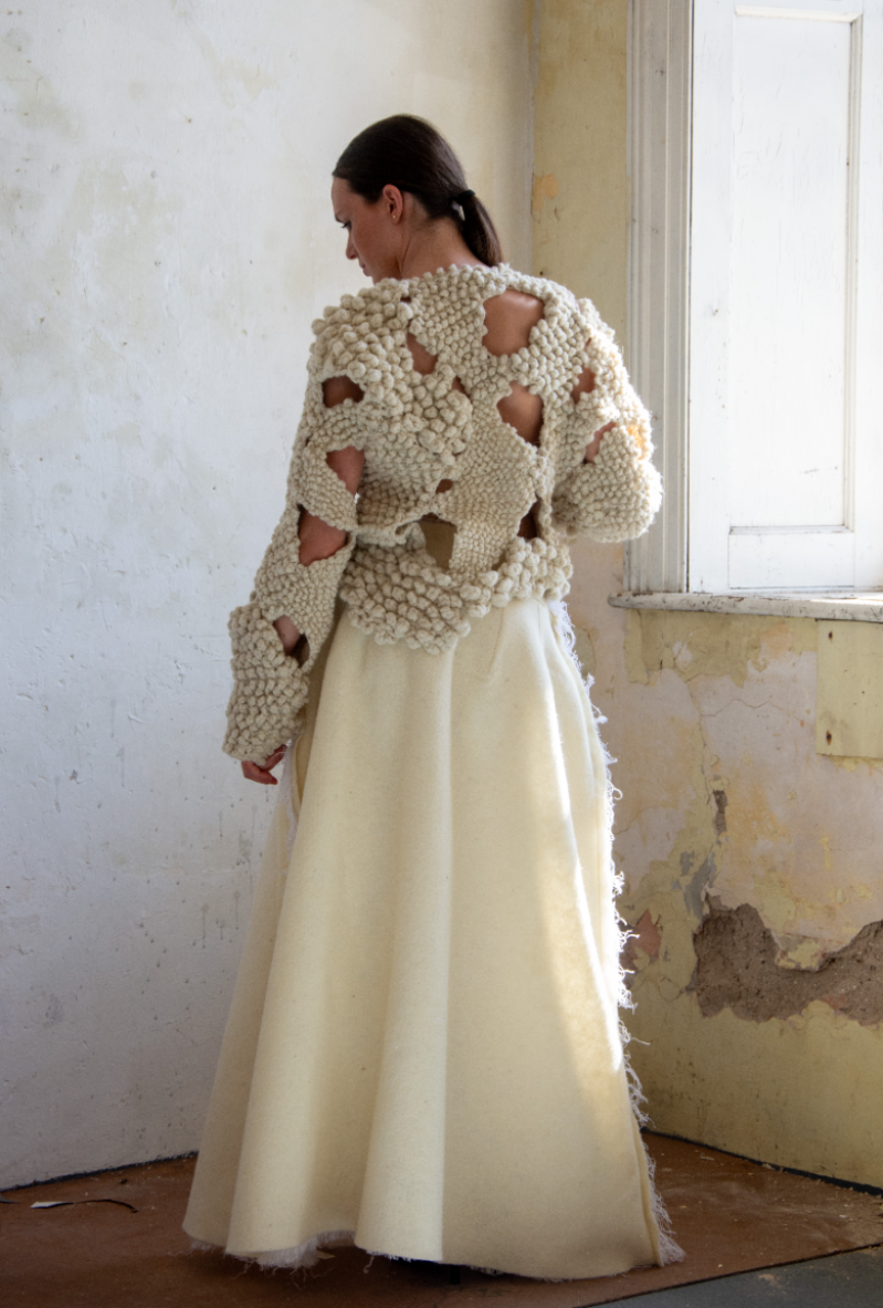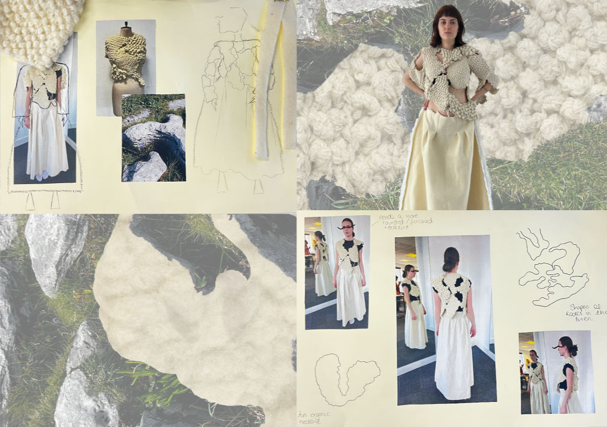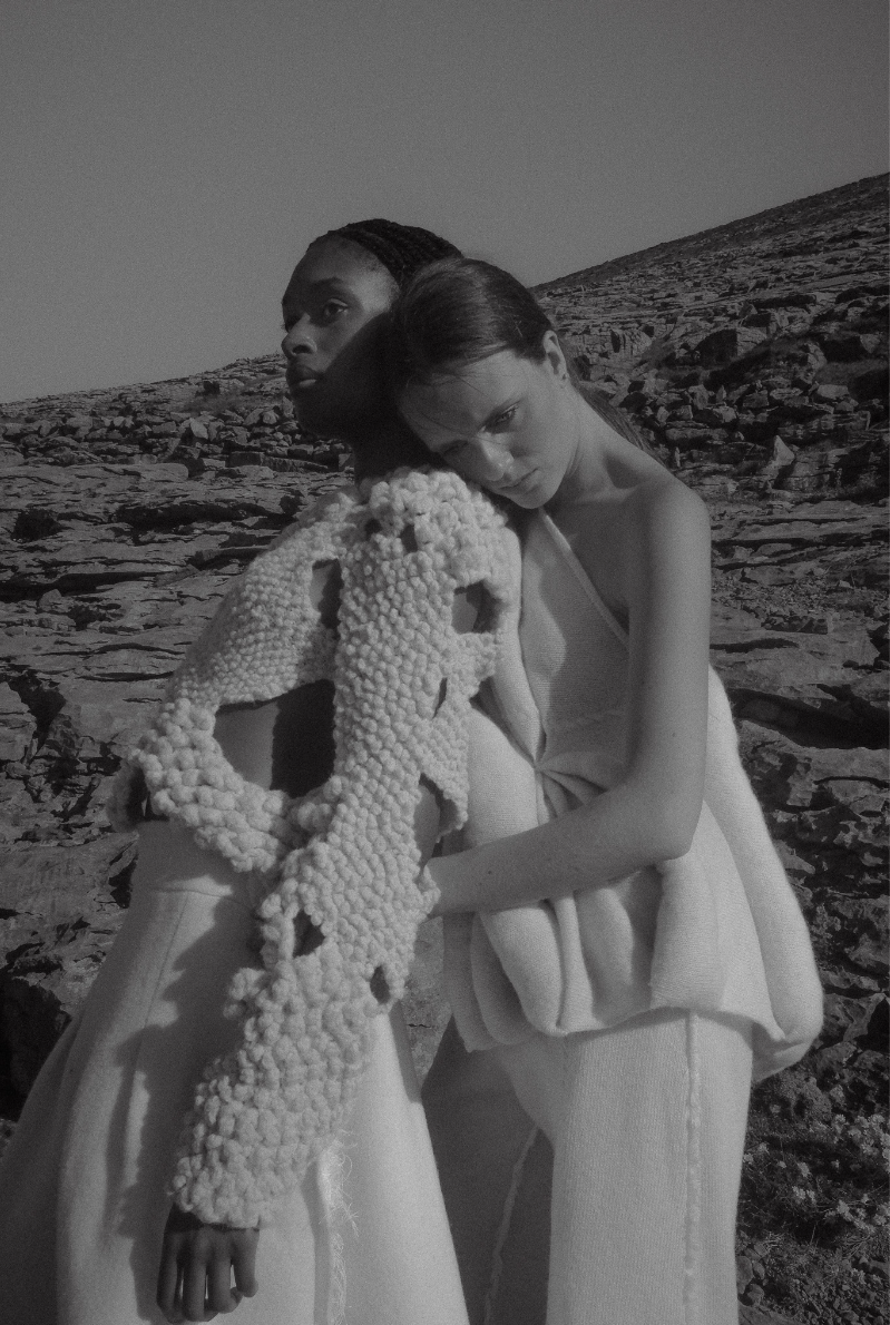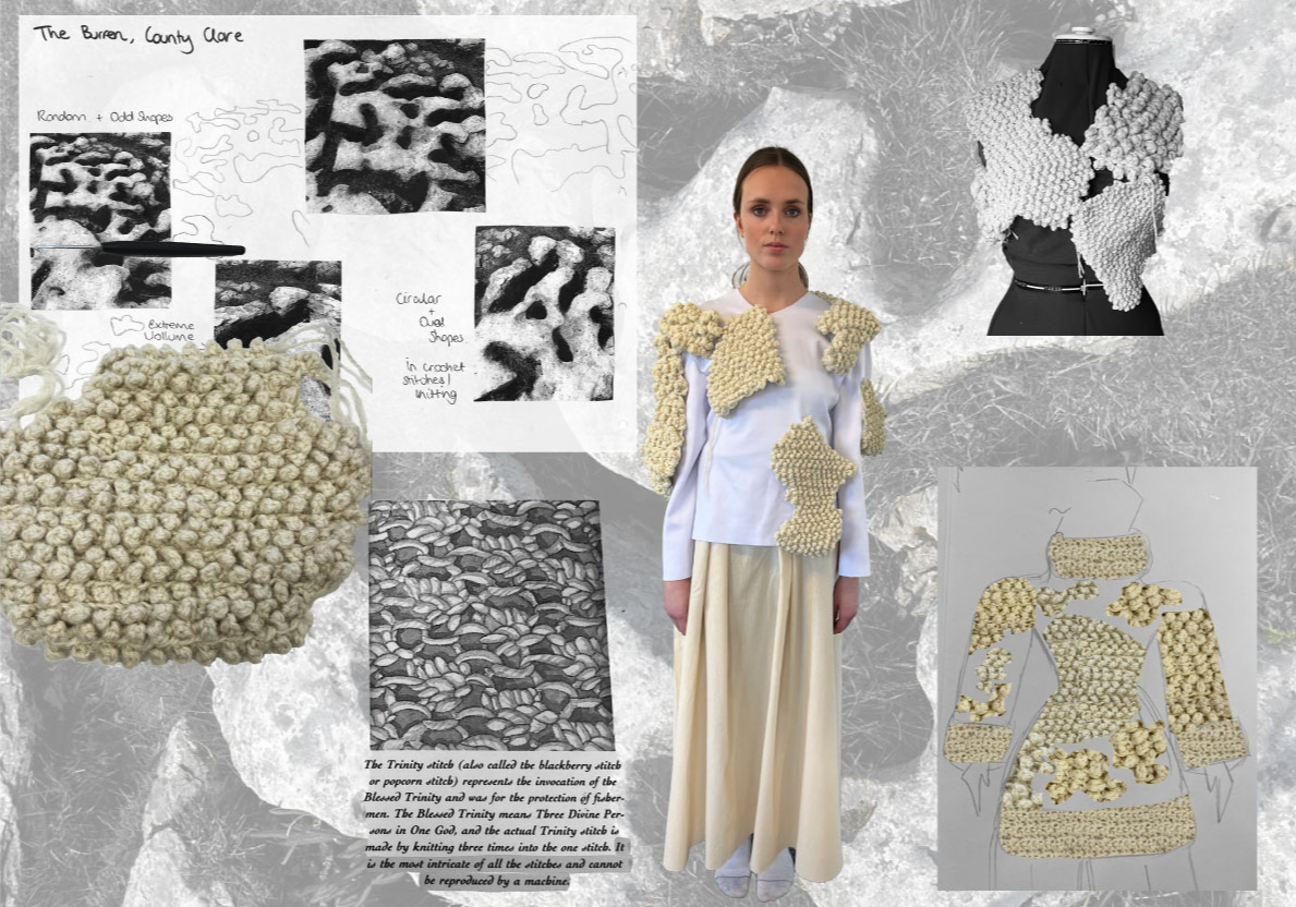 Irish wool is a classified waste product in Ireland and the wool industry has been struggling because of the increase and the accessibility of synthetic fibers and wool from warmer climates, which is less coarse due to a lower micron count. Sarah's graduate collection “BÁINÍN” is focused on the issues surrounding Irish wool with emphasis on the Galway Wool, (Ireland’s only native breed of sheep). She has researched the issues regarding Irish wool which is that it is quite itchy in its raw form but believes that the structure that this coarse, raw material provides is that of very few biodegradable, garment-suitable-materials. Wool is the original fibre and is fire retardant, reduces dust mites, temperature controlling and it is biodegradable. Wool has been proven to be a slow releasing fertilizer to soil. We are constantly being told that Irish wool (which is quite coarse due to our cold climate) is not suitable for high fashion. This collection was a research on how we could incorporate other materials with traceable Irish wool in order to make garments that could be worn. Sarah also treated and significantly softened the yarn she did use. Sarah lined garments with deadstock Irish linen which is already in this country and layered the knit trousers over a pair of linen trousers making this outfit modular and more versatile. Sourcing and traceability was vital for this collection and transparency is something very important to Sarah as a sustainable fashion and textile designer. For the materials of this collection, Sarah sourced traceable raw Galway wool and traceable Galway spun yarn and used dead-stock, end of roll Irish linen for lining. Low emission processes were used to create this biodegradable collection such as knit, crochet and felting. Any threads used for sewing were one hundred percent cotton. Textural and silhouette inspiration was drawn from the Burren in county Clare. Sarah referenced couture garments from Parisian fashion houses in the mid 1900's (a time when Irish wool was being used and valued in the industry) and contrasted this with the garments that the Irish people had been wearing at this same time. The importance of partnership and building communities between farmers, wool scourers, spinners, designers’ and researchers was a very important part of this project. Connecting the farmer to the garment was a goal that Sarah has achieved. All wool used in this collection will fertilize the soil if the garment ever reached landfill.