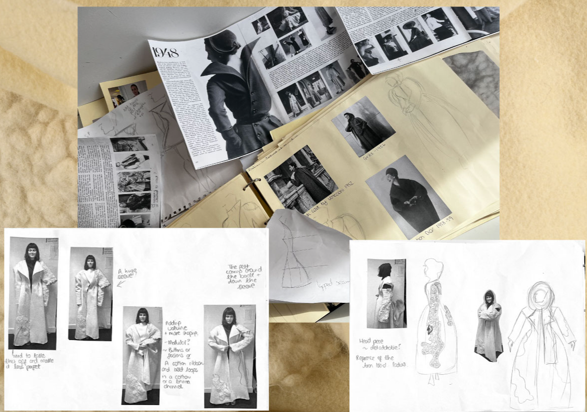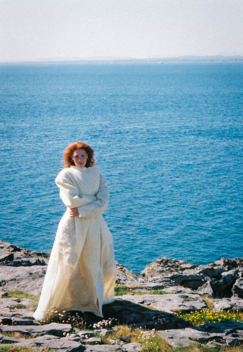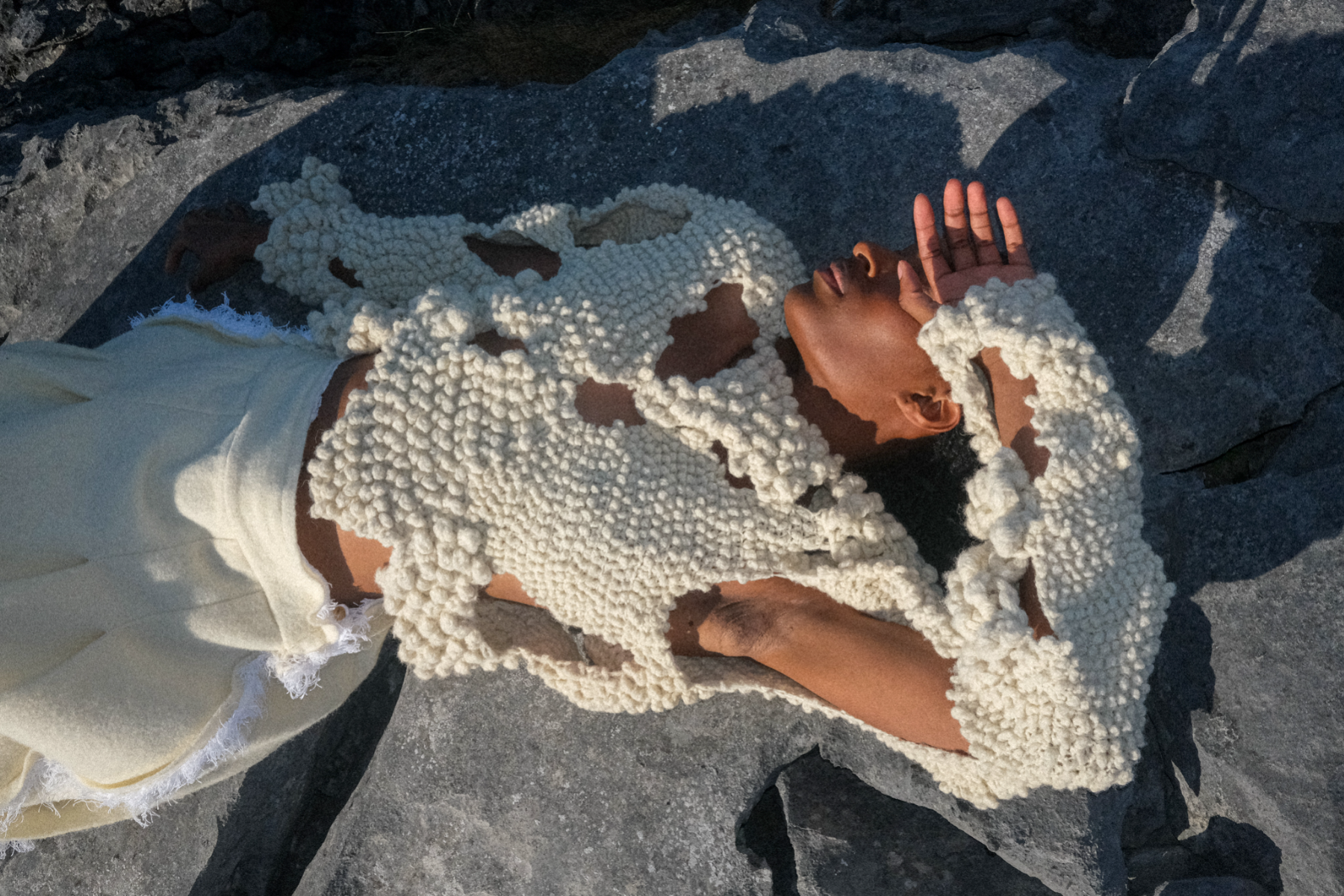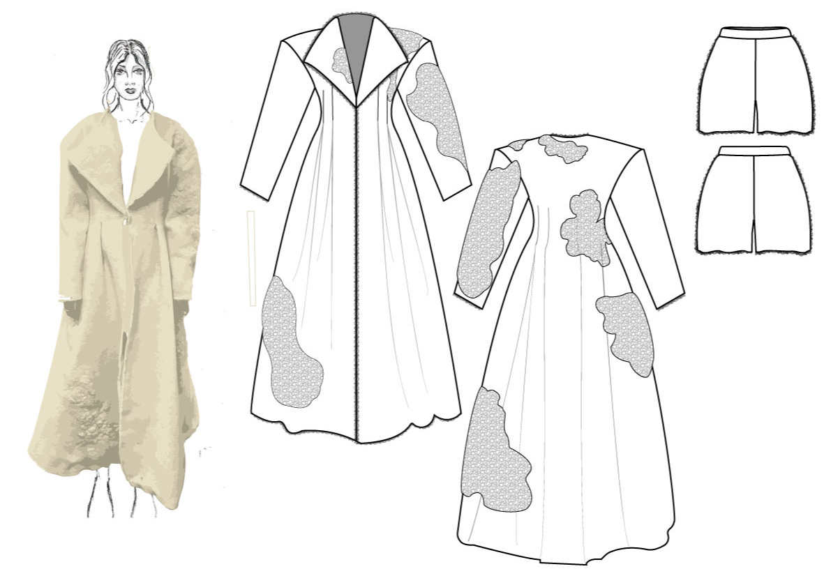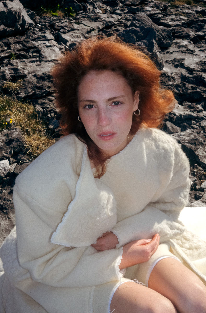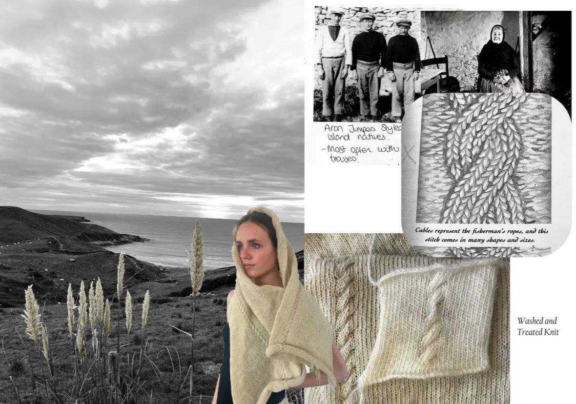 Irish wool is a classified waste product in Ireland and the wool industry has been struggling because of the increase and the accessibility of synthetic fibers and wool from warmer climates, which is less coarse due to a lower micron count. Sarah's graduate collection “BÁINÍN” is focused on the issues surrounding Irish wool with emphasis on the Galway Wool, (Ireland’s only native breed of sheep). She has researched the issues regarding Irish wool which is that it is quite itchy in its raw form but believes that the structure that this coarse, raw material provides is that of very few biodegradable, garment-suitable-materials. Wool is the original fibre and is fire retardant, reduces dust mites, temperature controlling and it is biodegradable. Wool has been proven to be a slow releasing fertilizer to soil. We are constantly being told that Irish wool (which is quite coarse due to our cold climate) is not suitable for high fashion. This collection was a research on how we could incorporate other materials with traceable Irish wool in order to make garments that could be worn. Sarah also treated and significantly softened the yarn she did use. Sarah lined garments with deadstock Irish linen which is already in this country and layered the knit trousers over a pair of linen trousers making this outfit modular and more versatile. Sourcing and traceability was vital for this collection and transparency is something very important to Sarah as a sustainable fashion and textile designer. For the materials of this collection, Sarah sourced traceable raw Galway wool and traceable Galway spun yarn and used dead-stock, end of roll Irish linen for lining. Low emission processes were used to create this biodegradable collection such as knit, crochet and felting. Any threads used for sewing were one hundred percent cotton. Textural and silhouette inspiration was drawn from the Burren in county Clare. Sarah referenced couture garments from Parisian fashion houses in the mid 1900's (a time when Irish wool was being used and valued in the industry) and contrasted this with the garments that the Irish people had been wearing at this same time. The importance of partnership and building communities between farmers, wool scourers, spinners, designers’ and researchers was a very important part of this project. Connecting the farmer to the garment was a goal that Sarah has achieved. All wool used in this collection will fertilize the soil if the garment ever reached landfill.