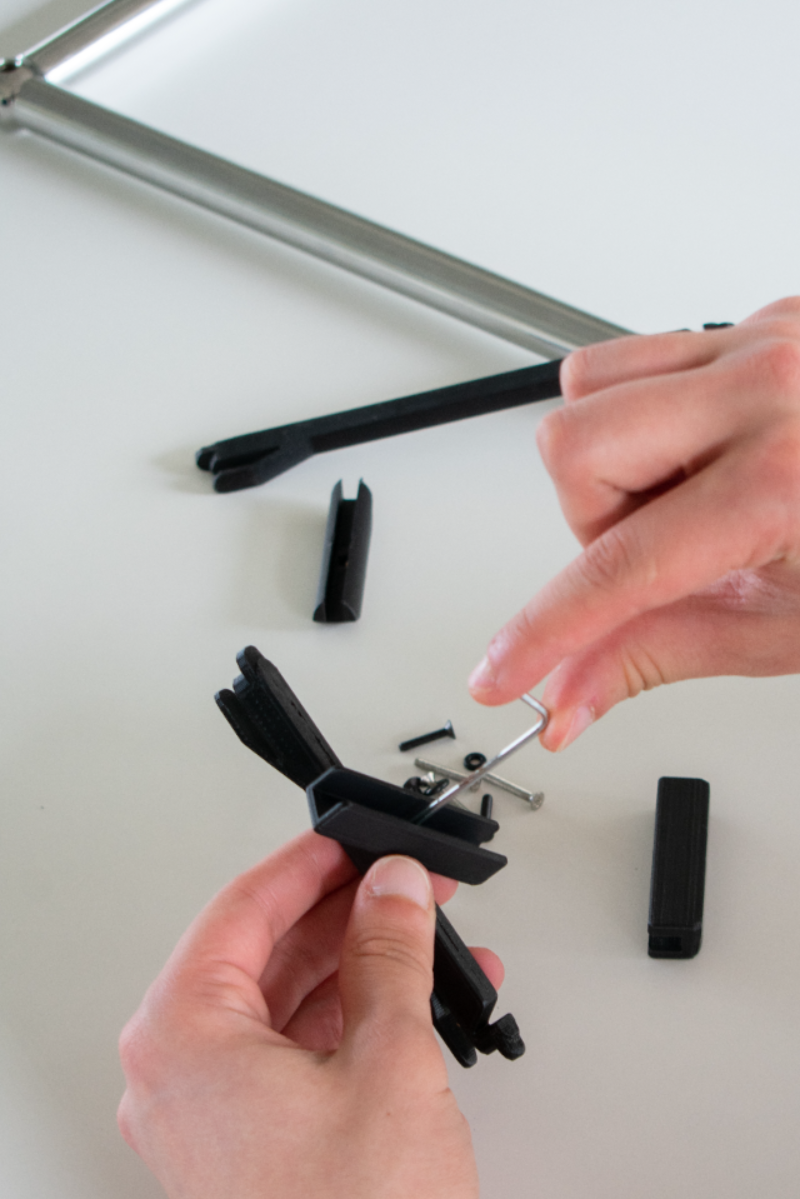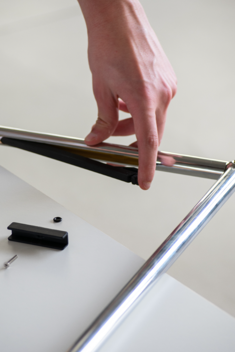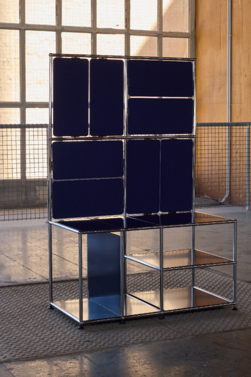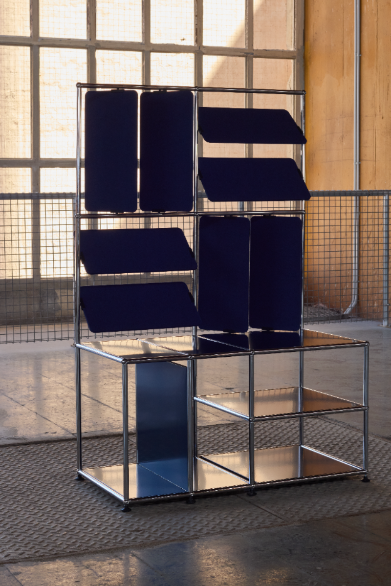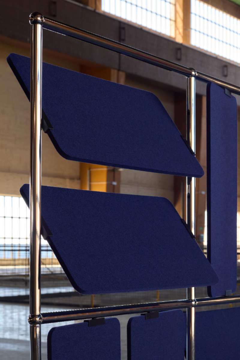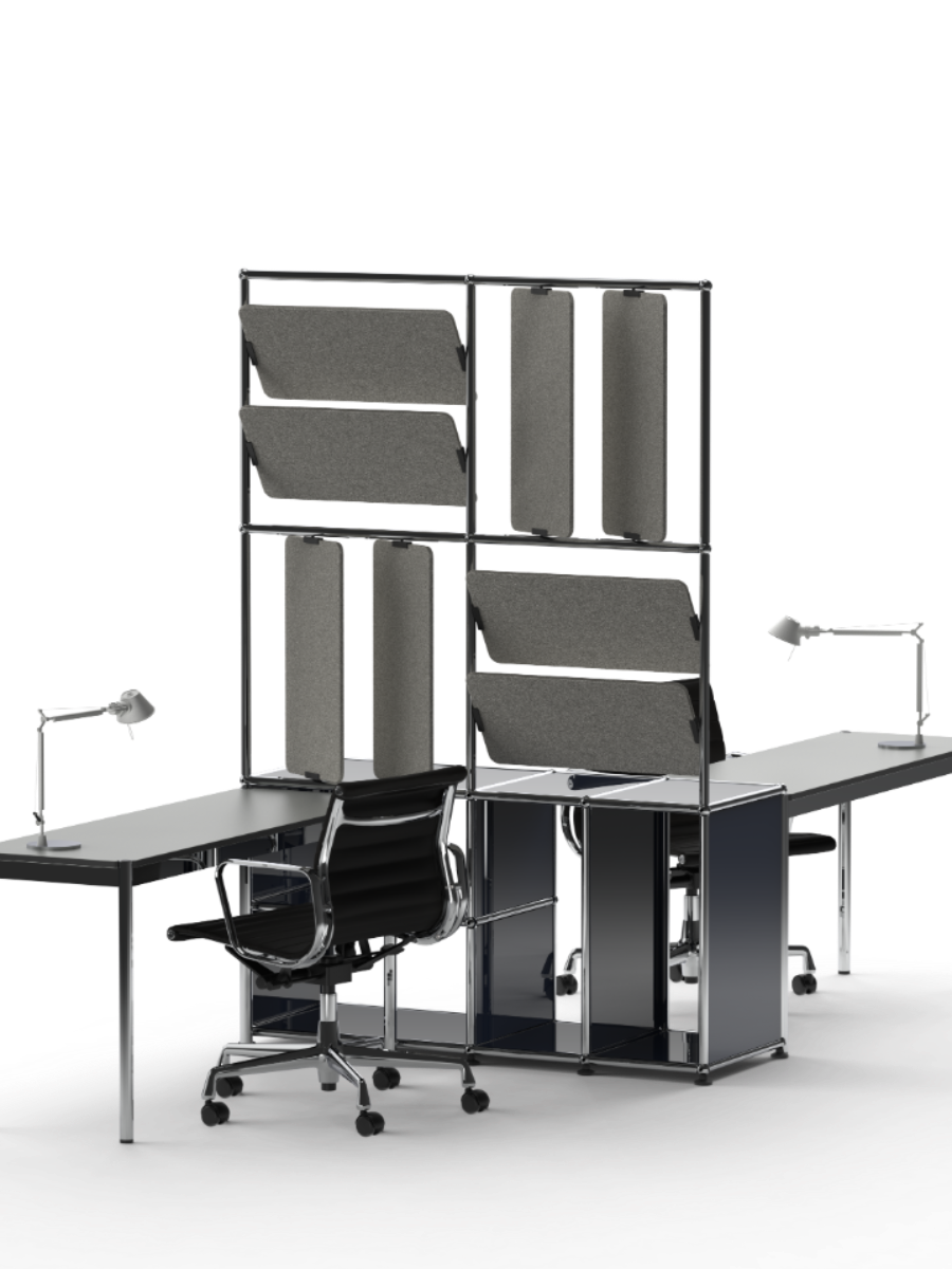 This Final Degree Project proposes an innovative solution for contemporary workspaces through the design of sound-absorbing office dividers integrated into the USM Haller modular system. Based on research into the historical evolution of office design and the challenges of open offices, a connecting piece was developed to attach recycled polyester panels that can rotate 360 degrees, without altering the original structure. The project strikes a balance between the technical and the poetic, enhancing the versatility of the USM Haller system while respecting its modular logic, offering a lightweight, adaptable solution to current needs for comfort, privacy, and concentration.