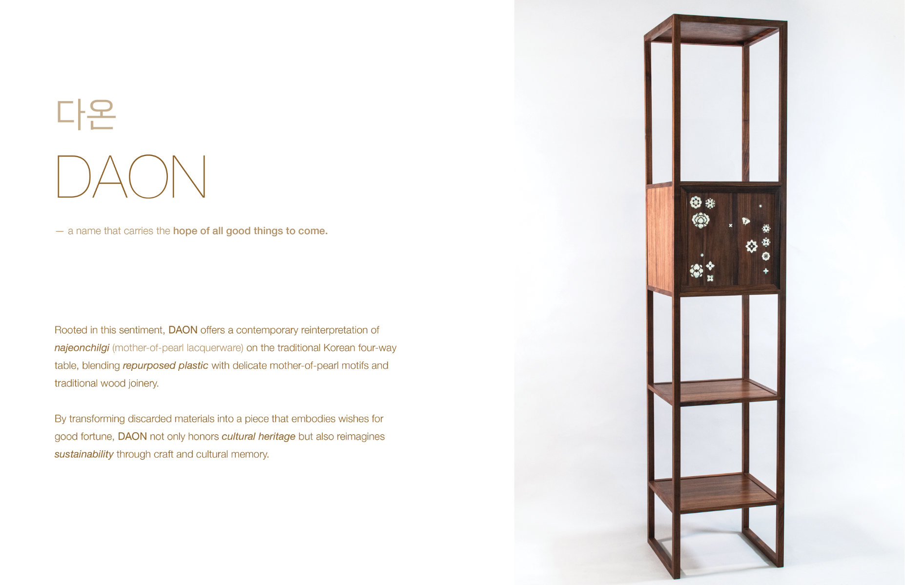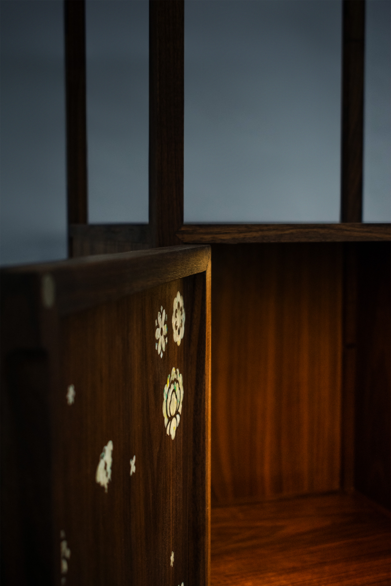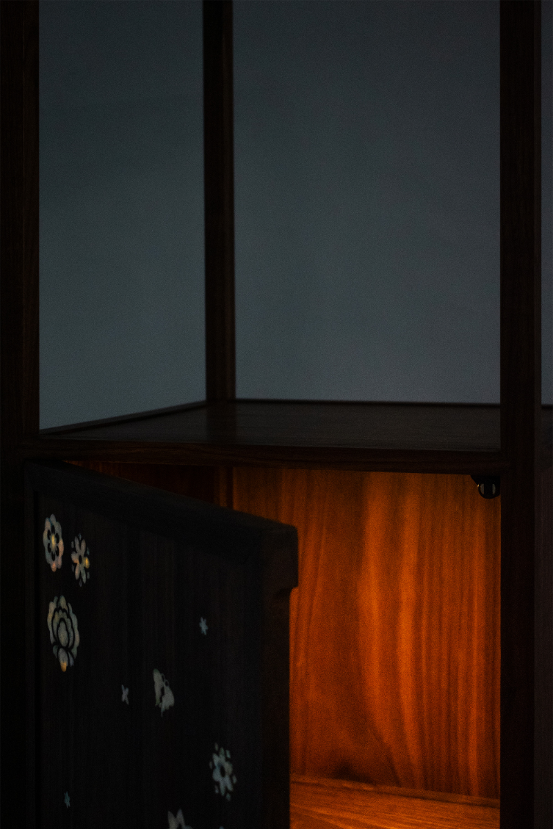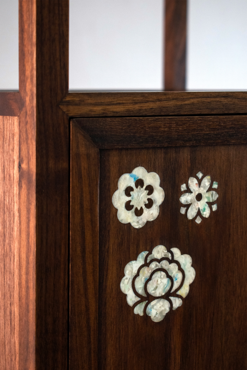 다온 DAON — a name that carries the hope of all good things to come. Rooted in this sentiment, DAON offers a contemporary reinterpretation of najeonchilgi (mother-of-pearl lacquerware) on the traditional Korean four-way table, combining repurposed plastic with delicate mother-of-pearl motifs and traditional wood joinery. The motifs are inspired by Hwajeopdo, a traditional Korean painting of flowers and butterflies. Peonies symbolize wealth and honor, while butterflies represent love and prosperity — together, they carry wishes for a life filled with joy and abundance for loved ones. The plastic motifs were created by melting recycled polypropylene into sheets, which were then precisely cut using a waterjet machine. By combining modern fabrication with traditional techniques, DAON establishes a dialogue between craftsmanship and innovation. By transforming discarded materials into a piece that embodies wishes for good fortune, DAON not only honors cultural heritage but also reimagines sustainability through craft and cultural memory. Internal lighting is integrated into the cabinet to highlight the plastic’s translucence, allowing the motifs to subtly glow in low-light settings. Reflecting the understated and refined beauty of traditional Joseon-era minimalism, the cabinet features a push-to-open mechanism, eliminating handles for a clean and minimalist appearance. For more information: https://2025.theshow-ecuad.org/project/daon/