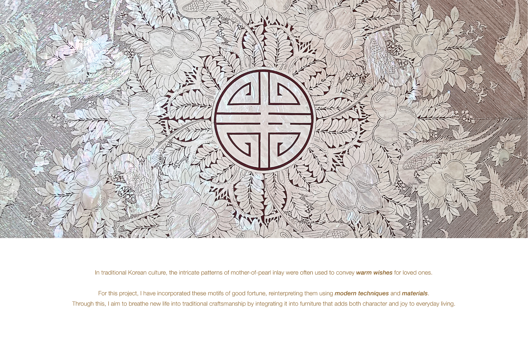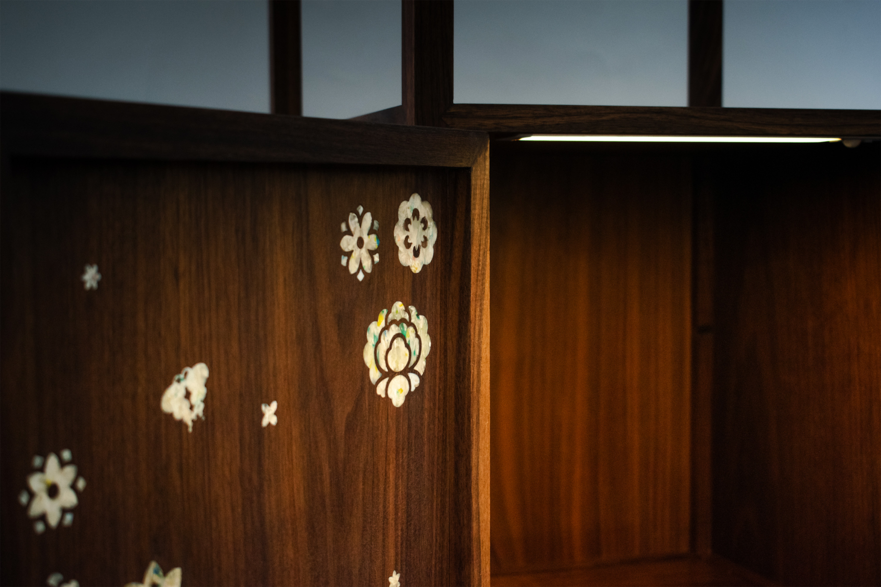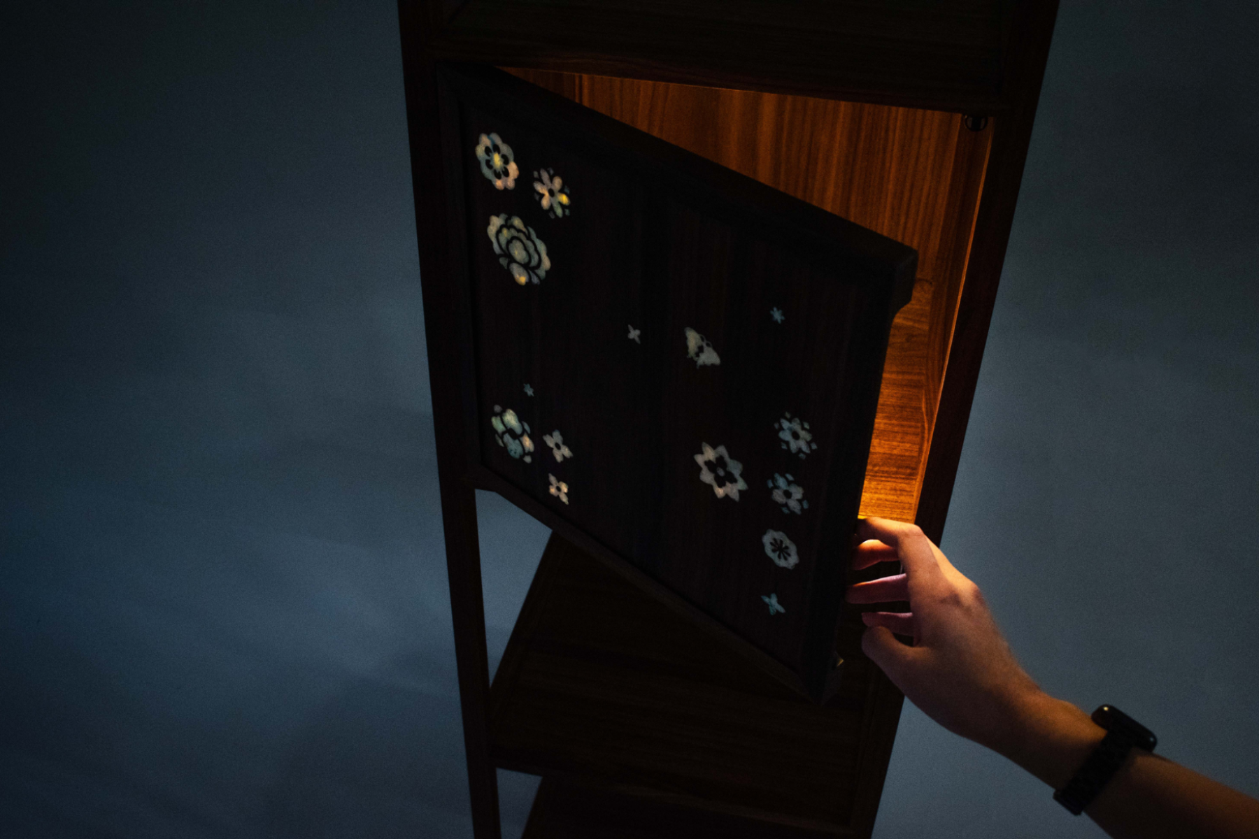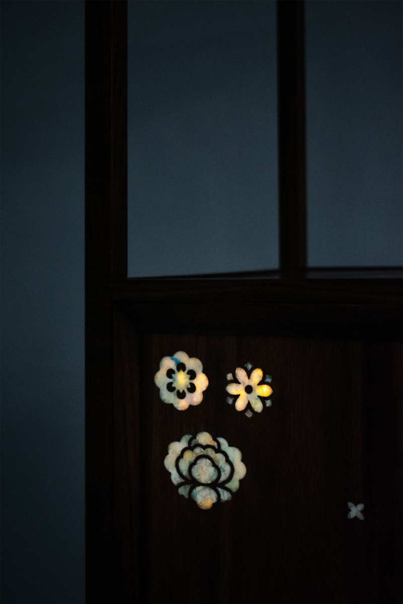 다온 DAON — a name that carries the hope of all good things to come. Rooted in this sentiment, DAON offers a contemporary reinterpretation of najeonchilgi (mother-of-pearl lacquerware) on the traditional Korean four-way table, combining repurposed plastic with delicate mother-of-pearl motifs and traditional wood joinery. The motifs are inspired by Hwajeopdo, a traditional Korean painting of flowers and butterflies. Peonies symbolize wealth and honor, while butterflies represent love and prosperity — together, they carry wishes for a life filled with joy and abundance for loved ones. The plastic motifs were created by melting recycled polypropylene into sheets, which were then precisely cut using a waterjet machine. By combining modern fabrication with traditional techniques, DAON establishes a dialogue between craftsmanship and innovation. By transforming discarded materials into a piece that embodies wishes for good fortune, DAON not only honors cultural heritage but also reimagines sustainability through craft and cultural memory. Internal lighting is integrated into the cabinet to highlight the plastic’s translucence, allowing the motifs to subtly glow in low-light settings. Reflecting the understated and refined beauty of traditional Joseon-era minimalism, the cabinet features a push-to-open mechanism, eliminating handles for a clean and minimalist appearance. For more information: https://2025.theshow-ecuad.org/project/daon/
