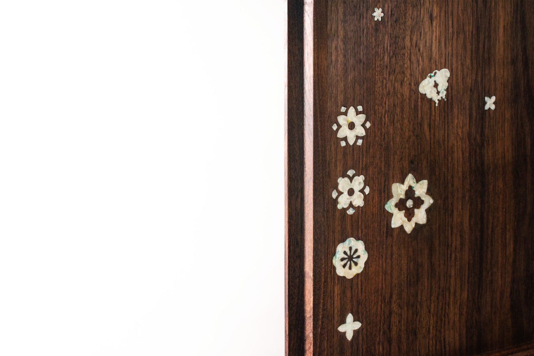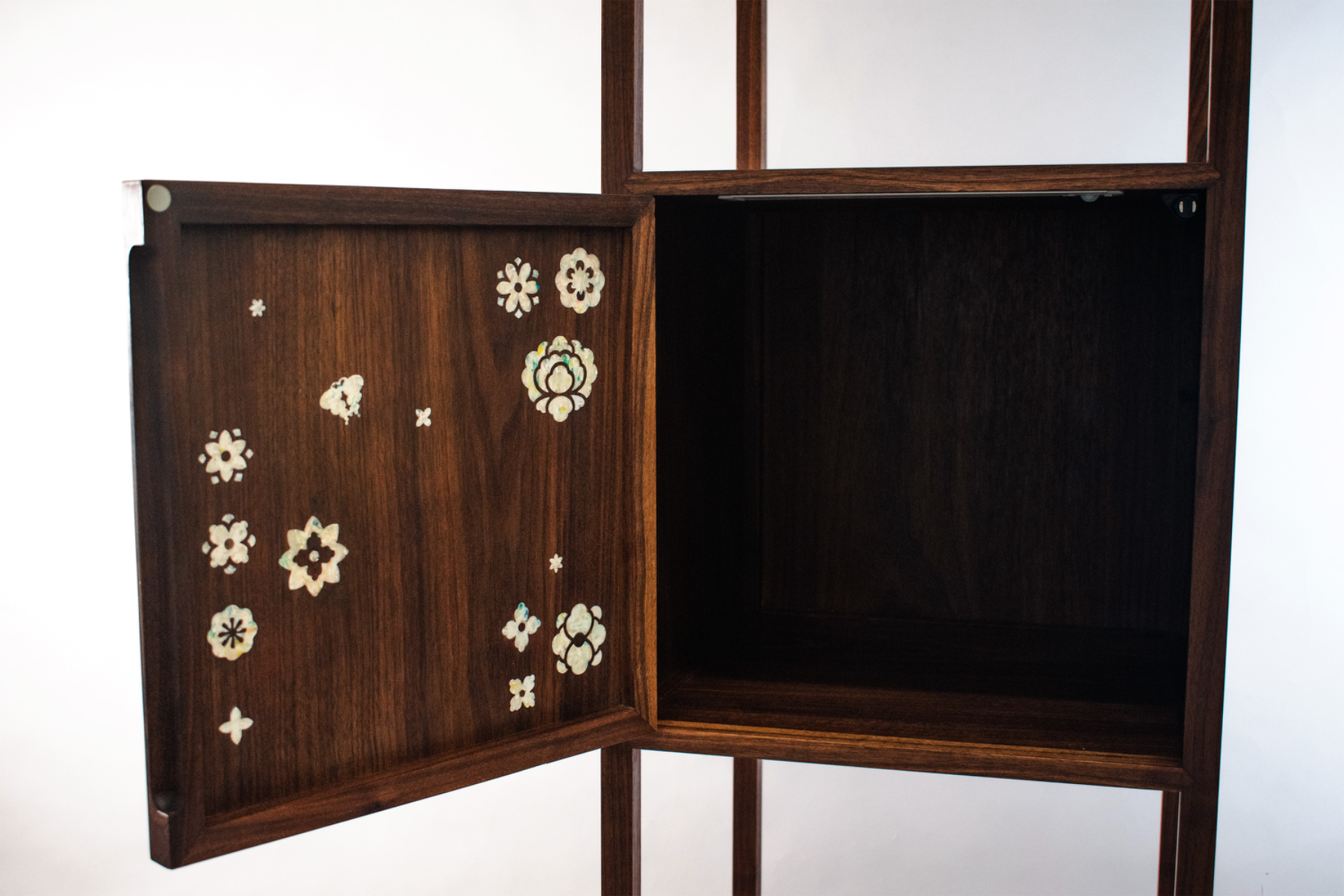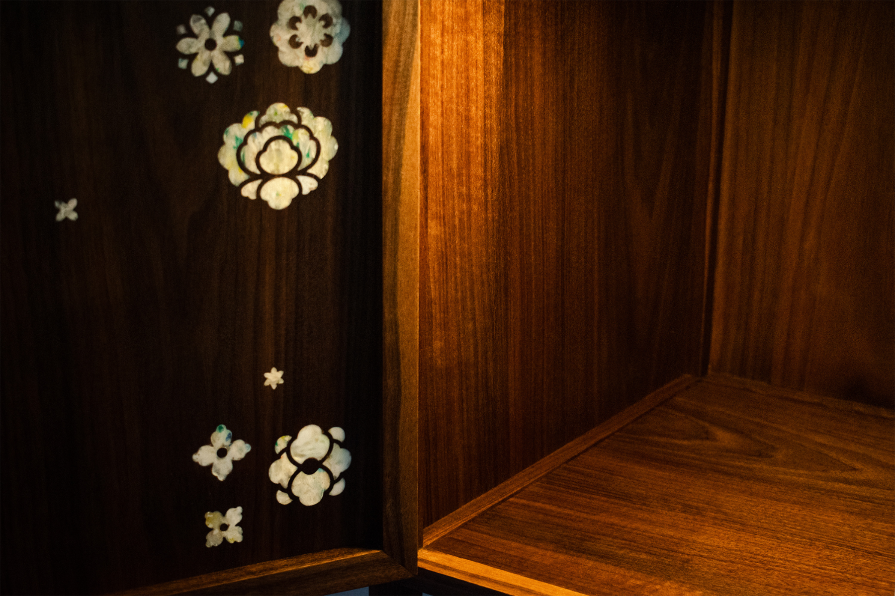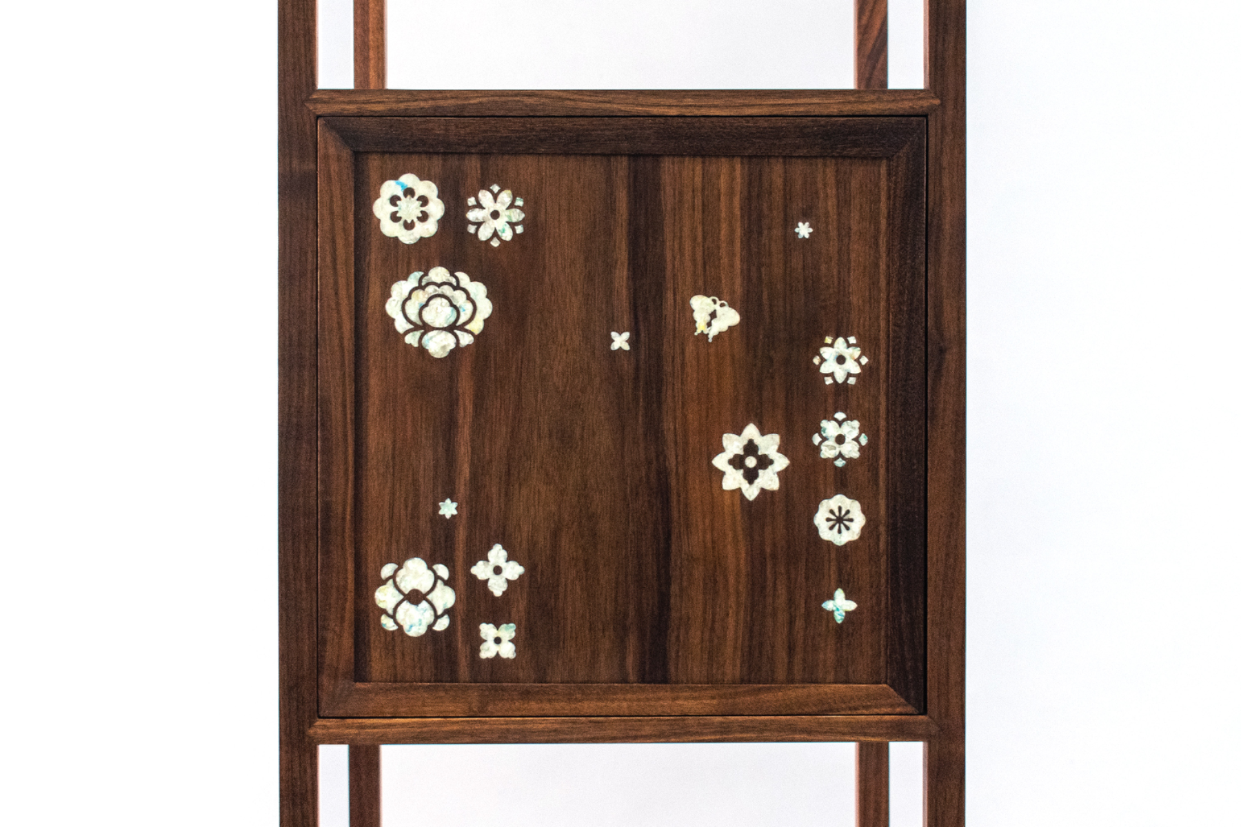 다온 DAON — a name that carries the hope of all good things to come. Rooted in this sentiment, DAON offers a contemporary reinterpretation of najeonchilgi (mother-of-pearl lacquerware) on the traditional Korean four-way table, combining repurposed plastic with delicate mother-of-pearl motifs and traditional wood joinery. The motifs are inspired by Hwajeopdo, a traditional Korean painting of flowers and butterflies. Peonies symbolize wealth and honor, while butterflies represent love and prosperity — together, they carry wishes for a life filled with joy and abundance for loved ones. The plastic motifs were created by melting recycled polypropylene into sheets, which were then precisely cut using a waterjet machine. By combining modern fabrication with traditional techniques, DAON establishes a dialogue between craftsmanship and innovation. By transforming discarded materials into a piece that embodies wishes for good fortune, DAON not only honors cultural heritage but also reimagines sustainability through craft and cultural memory. Internal lighting is integrated into the cabinet to highlight the plastic’s translucence, allowing the motifs to subtly glow in low-light settings. Reflecting the understated and refined beauty of traditional Joseon-era minimalism, the cabinet features a push-to-open mechanism, eliminating handles for a clean and minimalist appearance. For more information: https://2025.theshow-ecuad.org/project/daon/