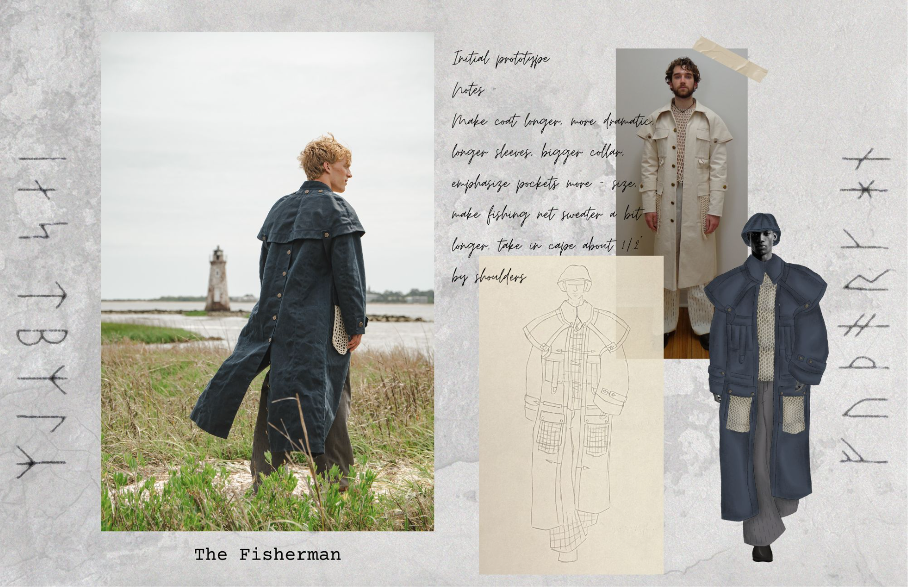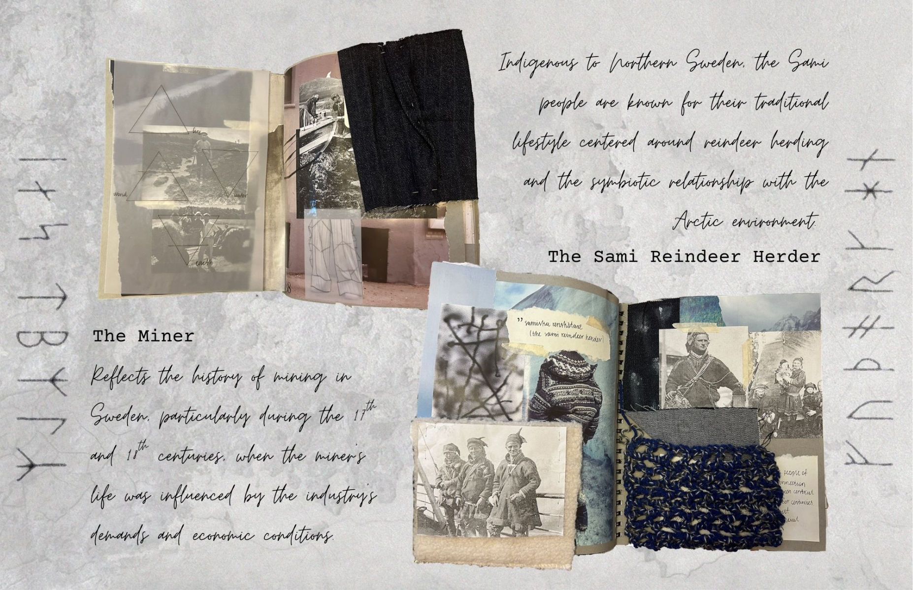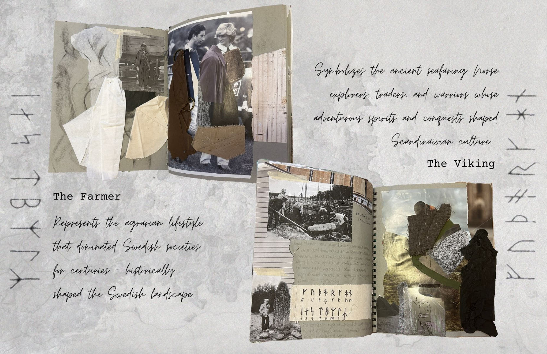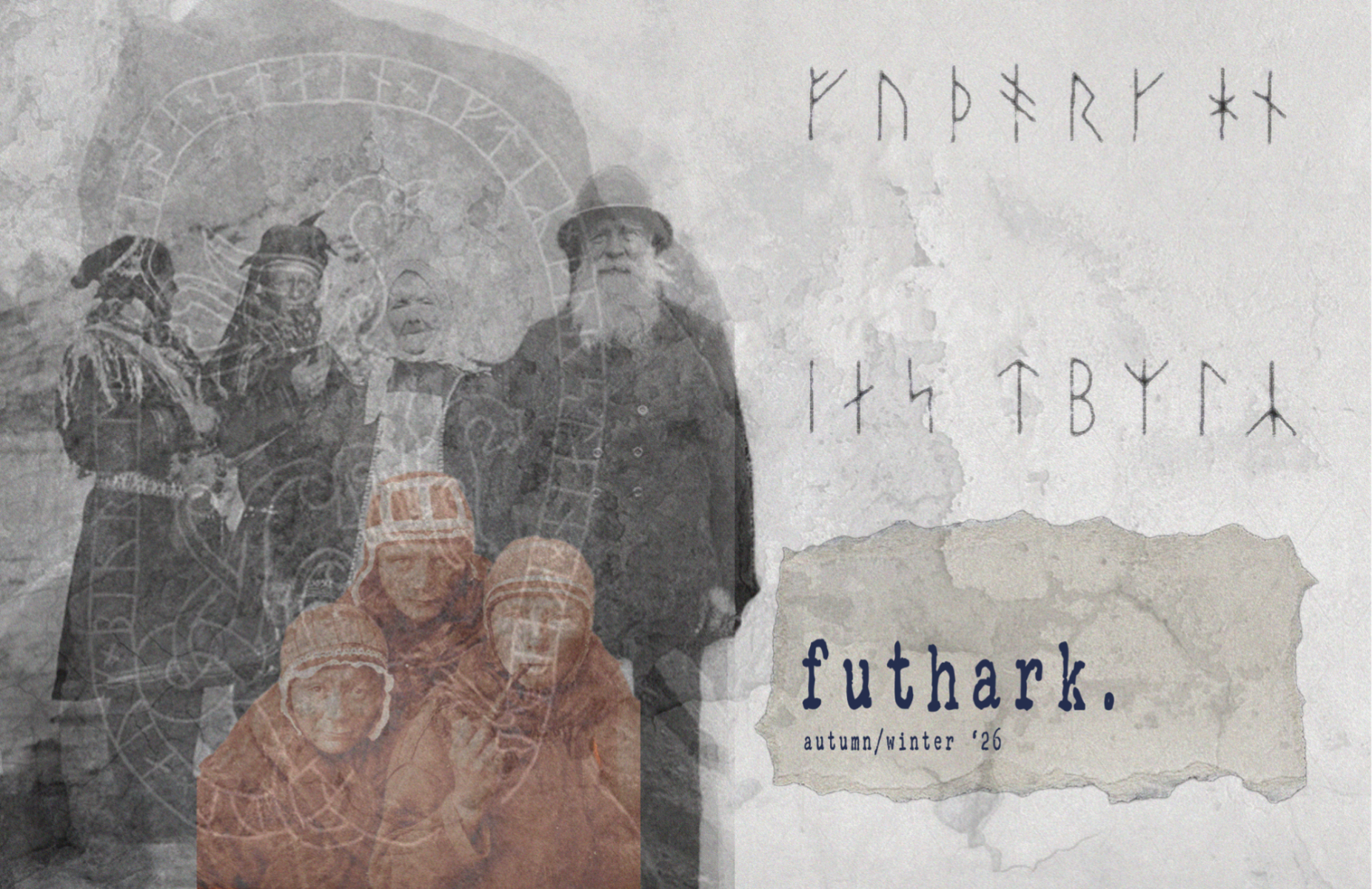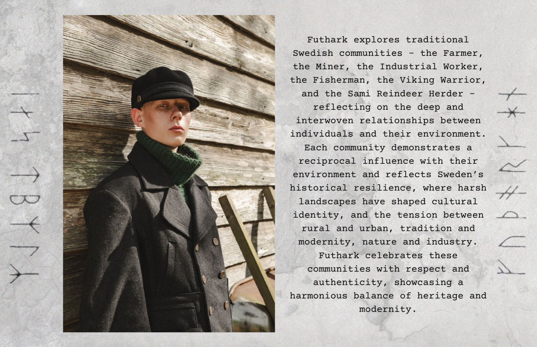 Futhark explores traditional Swedish communities - the Farmer, the Miner, the Industrial Worker, the Fisherman, the Viking Warrior, and the Sami Reindeer Herder - reflecting on the deep and interwoven relationships between individuals and their environment. Each community demonstrates a reciprocal influence with the environment and reflects Sweden's historical resilience, where harsh landscapes have shaped cultural identity, and the tension between rural and urban, tradition and modernity, nature and industry. Futhark celebrates these communities with respect and authenticity, showcasing a harmonious balance of heritage and modernity. At the heart of this concept lies the cyclical relationship between people and the environment: as our environments mold societal and cultural structures, so do we reshape the world around us. This collection invites a reflection on how modern Swedish society can learn from its historical communities to create a more balanced and sustainable relationship with its surroundings. CREDITS Photography by Samuel Murray Talent by Benjamin Pulka, Archer Lesser, Jonah Punnett, Aaron Waters, and Peyton Walston Jewelry Design by Rhys Morrow Shoe Design by Hailey Lander