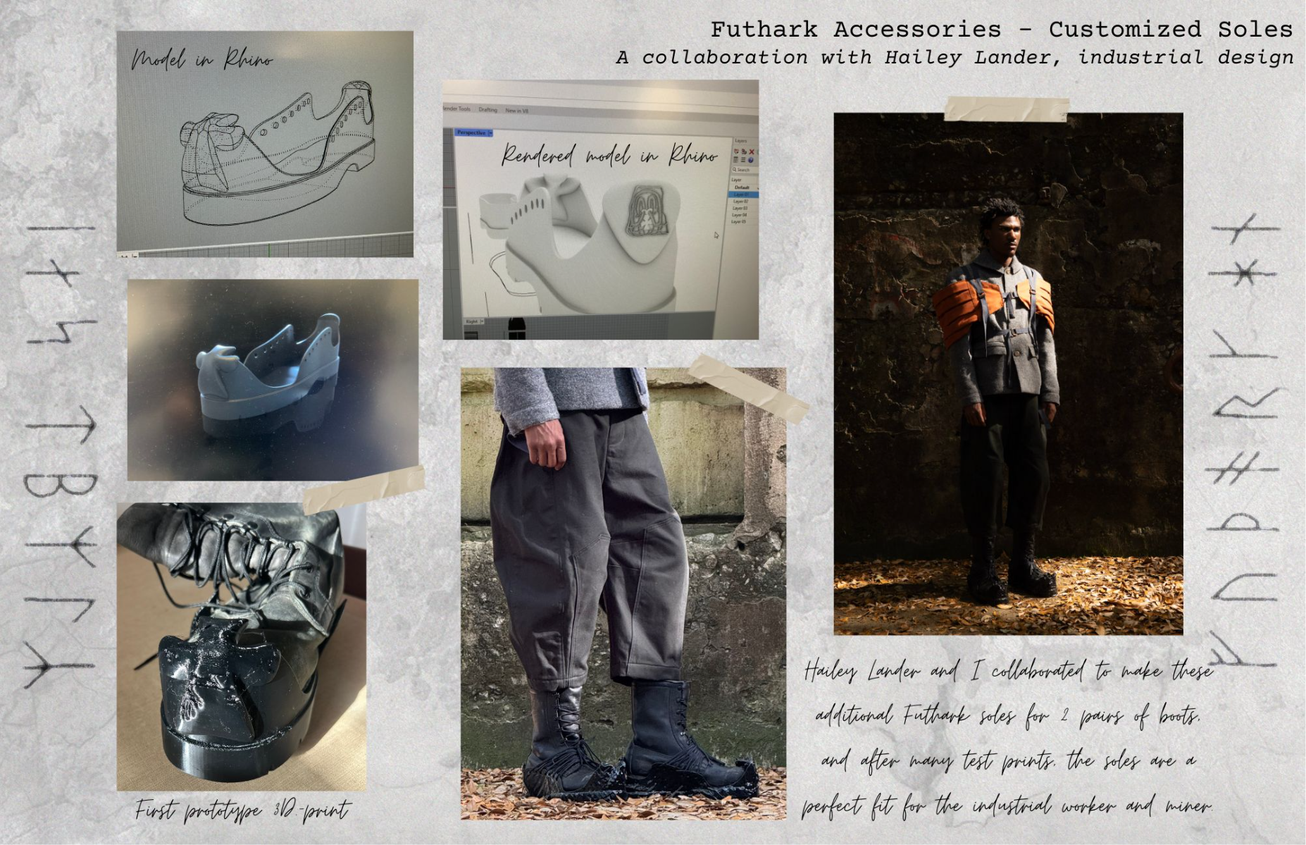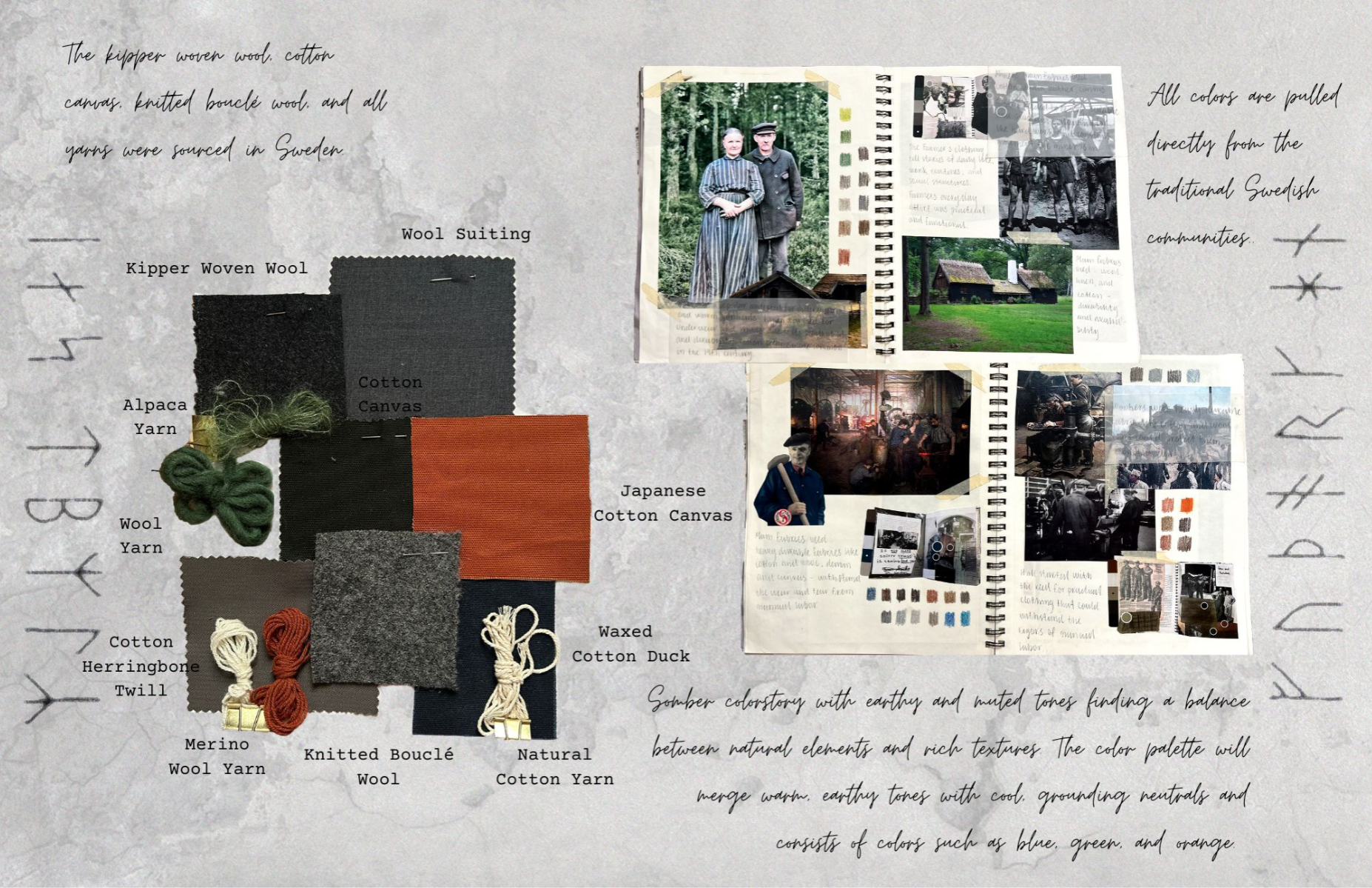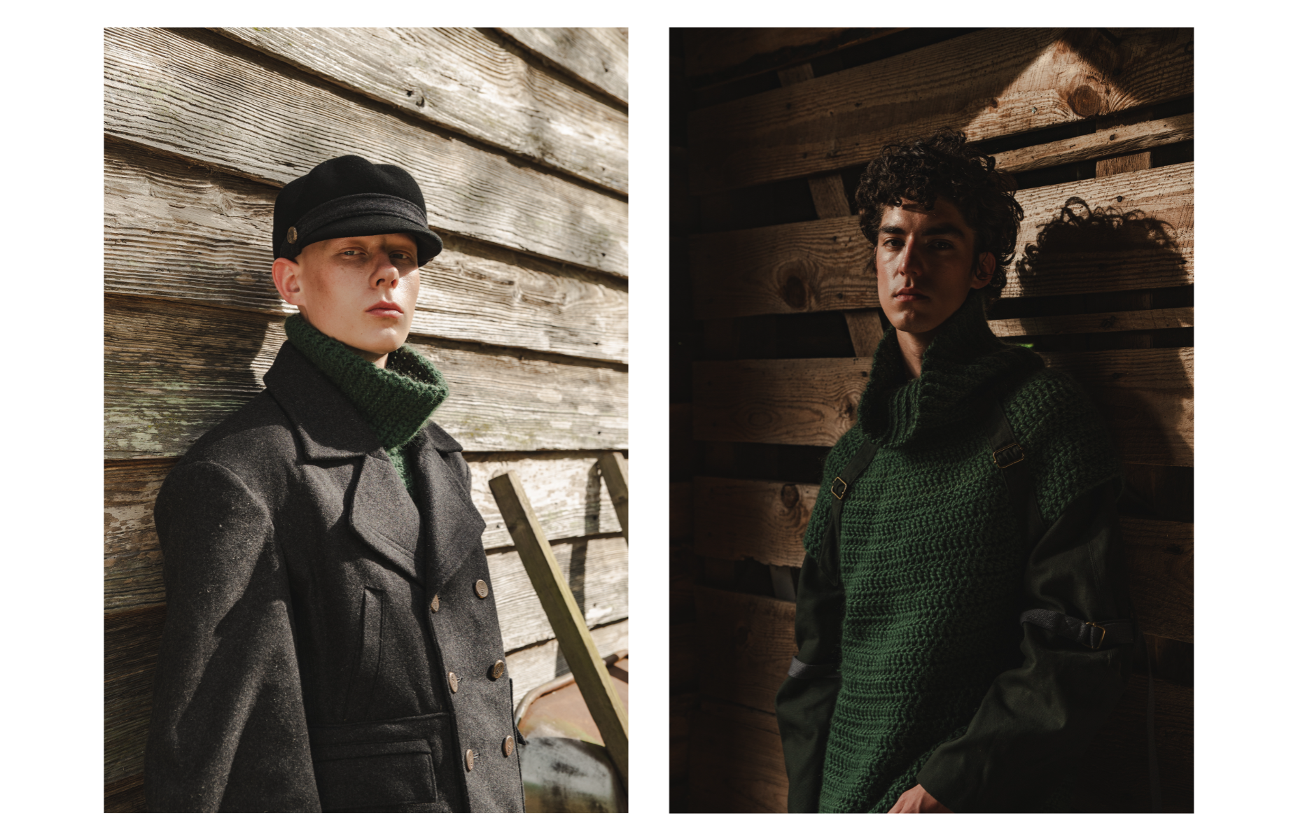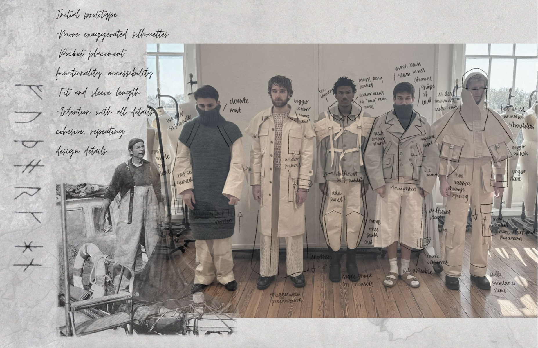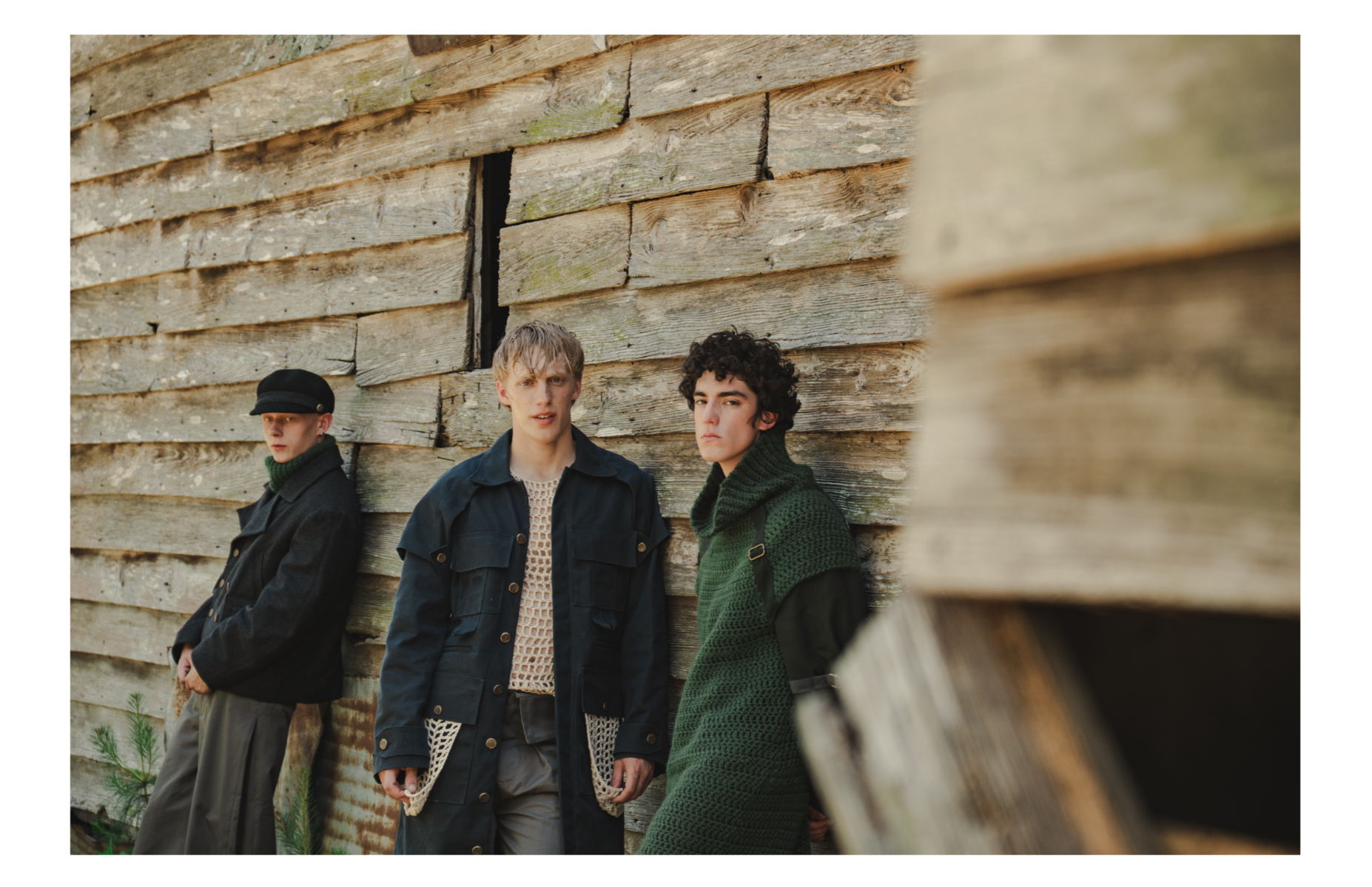 Futhark explores traditional Swedish communities - the Farmer, the Miner, the Industrial Worker, the Fisherman, the Viking Warrior, and the Sami Reindeer Herder - reflecting on the deep and interwoven relationships between individuals and their environment. Each community demonstrates a reciprocal influence with the environment and reflects Sweden's historical resilience, where harsh landscapes have shaped cultural identity, and the tension between rural and urban, tradition and modernity, nature and industry. Futhark celebrates these communities with respect and authenticity, showcasing a harmonious balance of heritage and modernity. At the heart of this concept lies the cyclical relationship between people and the environment: as our environments mold societal and cultural structures, so do we reshape the world around us. This collection invites a reflection on how modern Swedish society can learn from its historical communities to create a more balanced and sustainable relationship with its surroundings. CREDITS Photography by Samuel Murray Talent by Benjamin Pulka, Archer Lesser, Jonah Punnett, Aaron Waters, and Peyton Walston Jewelry Design by Rhys Morrow Shoe Design by Hailey Lander