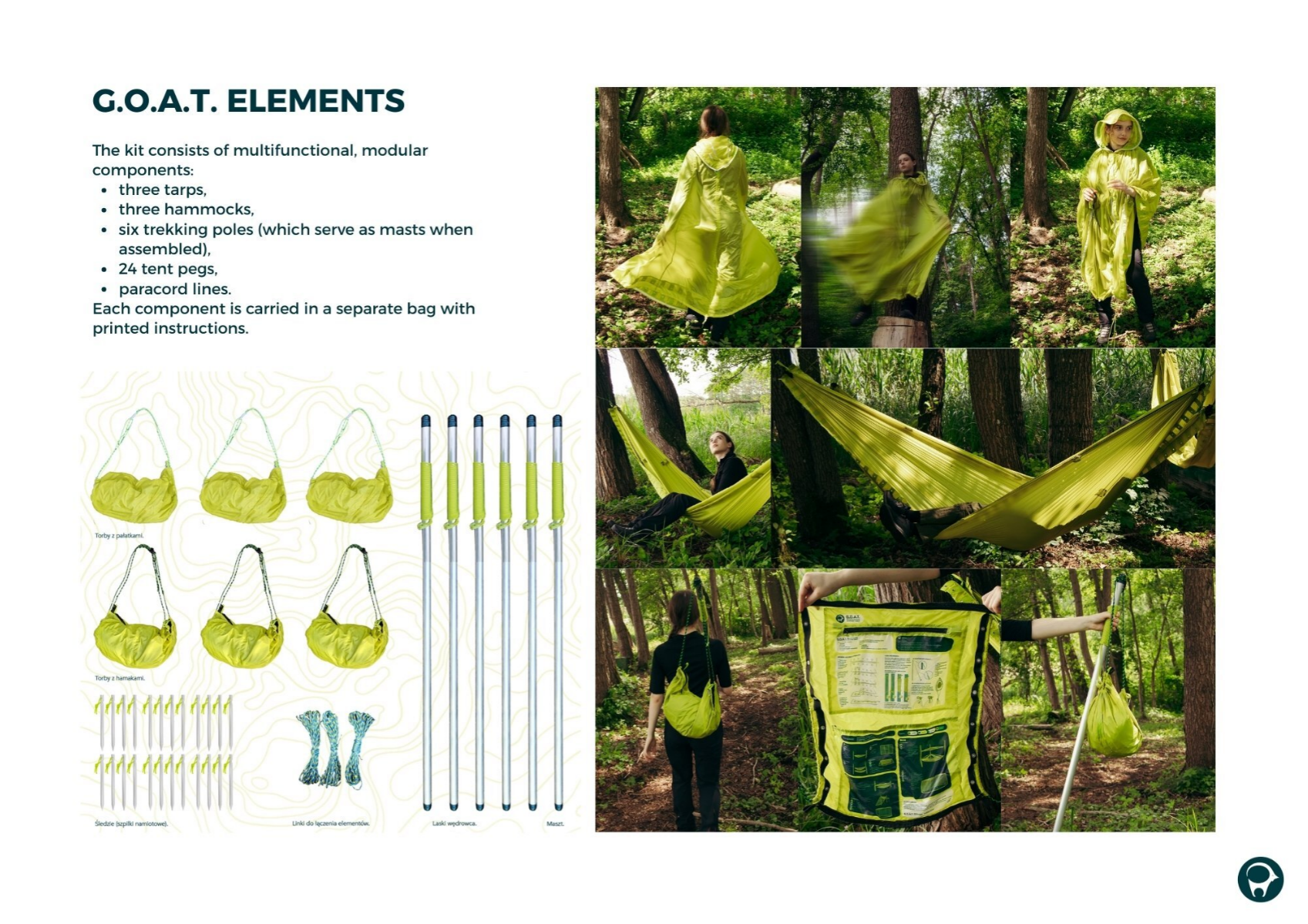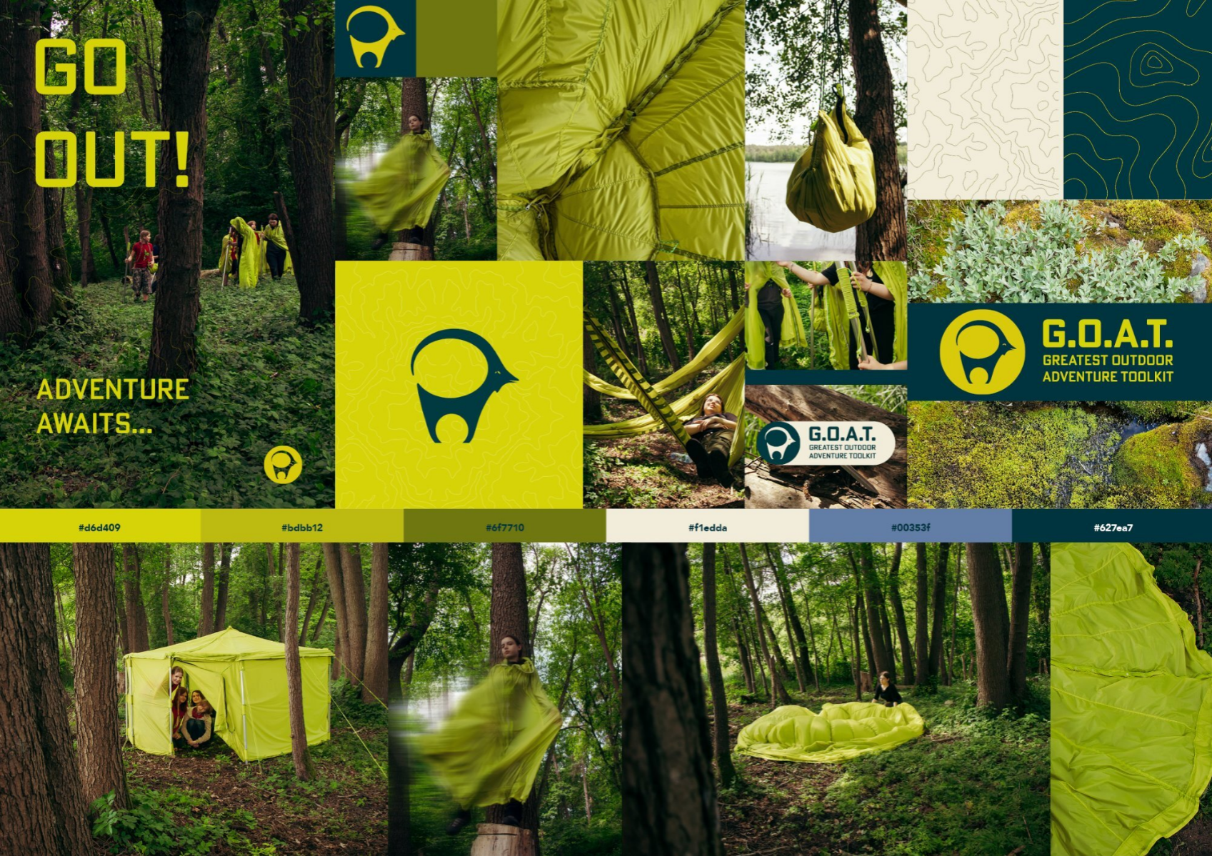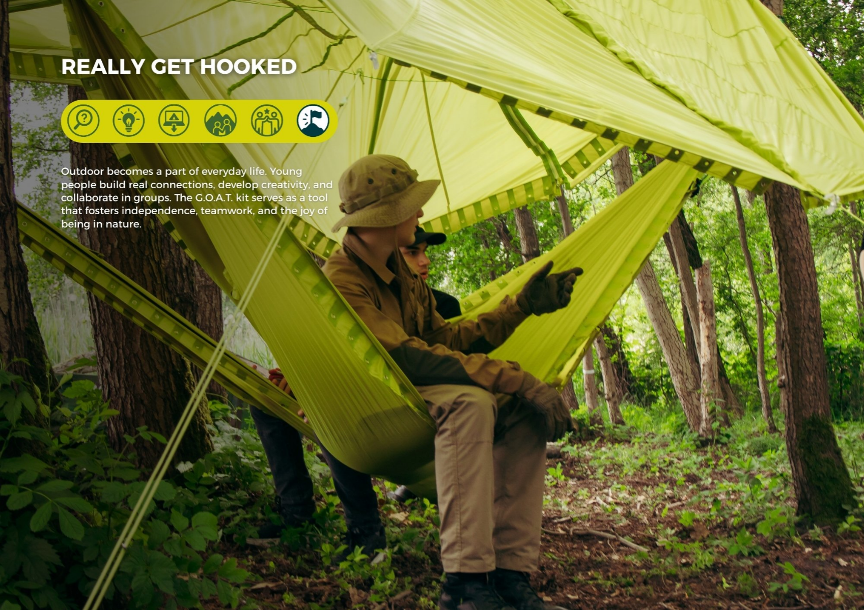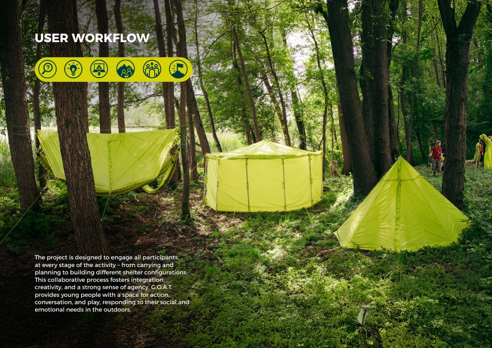 The G.O.A.T. Greatest Outdoor Adventure Toolkit is a product concept designed to support group outdoor activities among teenagers aged 14-18. Inspired by research into how young people spend their free time, it addresses the growing need for peer connection and contact with nature through shared action. The modular kit includes three tarps, three hammocks, six trekking poles (which double as masts), 24 tent pegs, and paracord, each packed with printed instructions. With three difficulty levels, it allows for simple shelters, social spaces, or full yurts. By involving participants in transport, planning, and construction, G.O.A.T. fosters teamwork, creativity, and empowerment.
