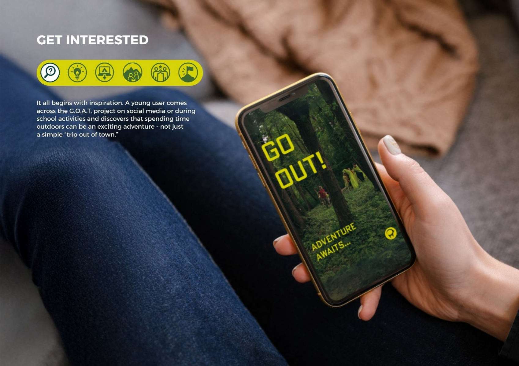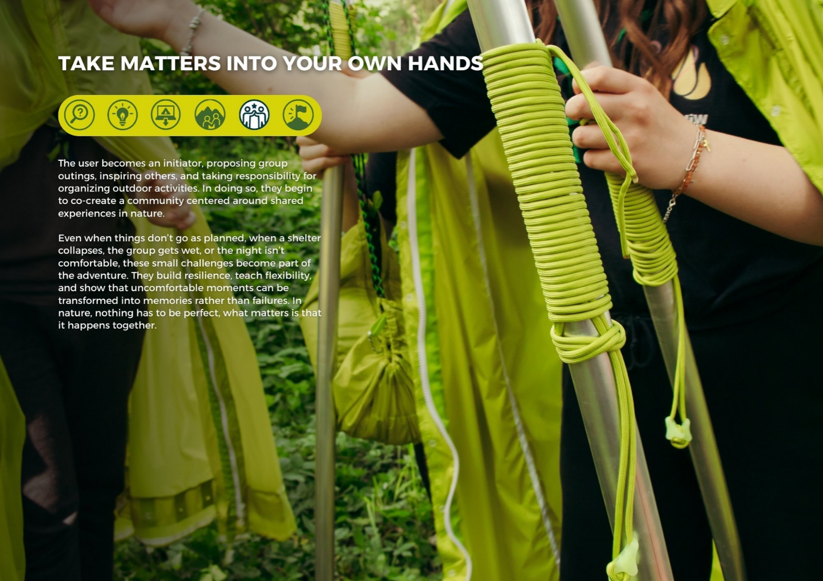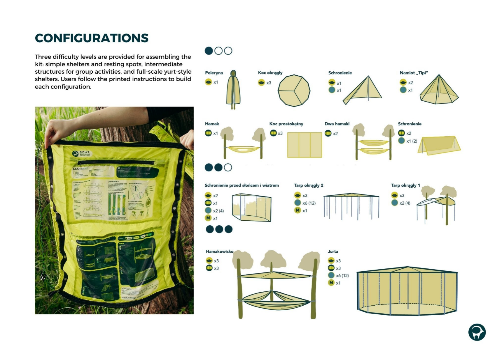 The G.O.A.T. Greatest Outdoor Adventure Toolkit is a product concept designed to support group outdoor activities among teenagers aged 14-18. Inspired by research into how young people spend their free time, it addresses the growing need for peer connection and contact with nature through shared action. The modular kit includes three tarps, three hammocks, six trekking poles (which double as masts), 24 tent pegs, and paracord, each packed with printed instructions. With three difficulty levels, it allows for simple shelters, social spaces, or full yurts. By involving participants in transport, planning, and construction, G.O.A.T. fosters teamwork, creativity, and empowerment.
