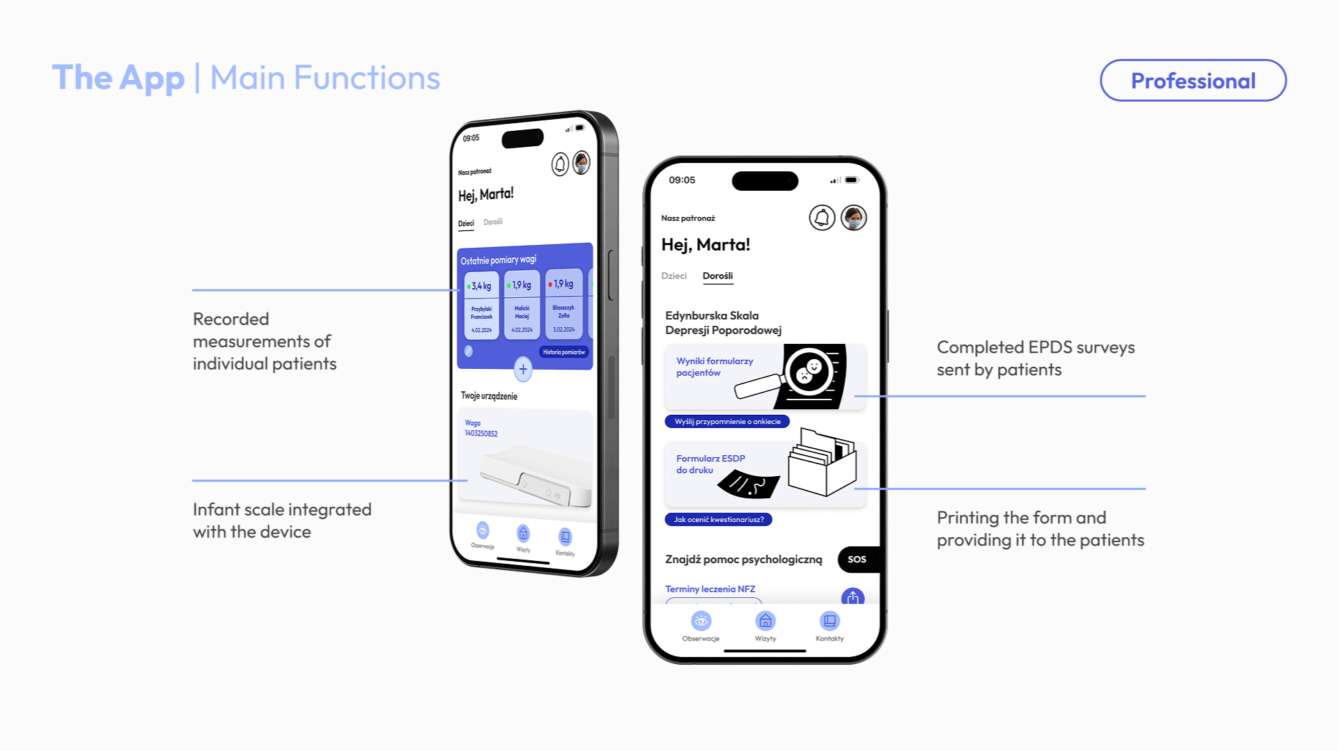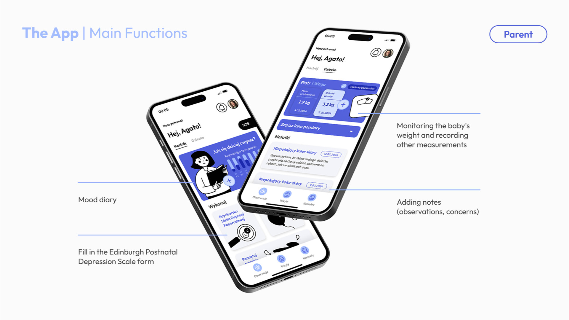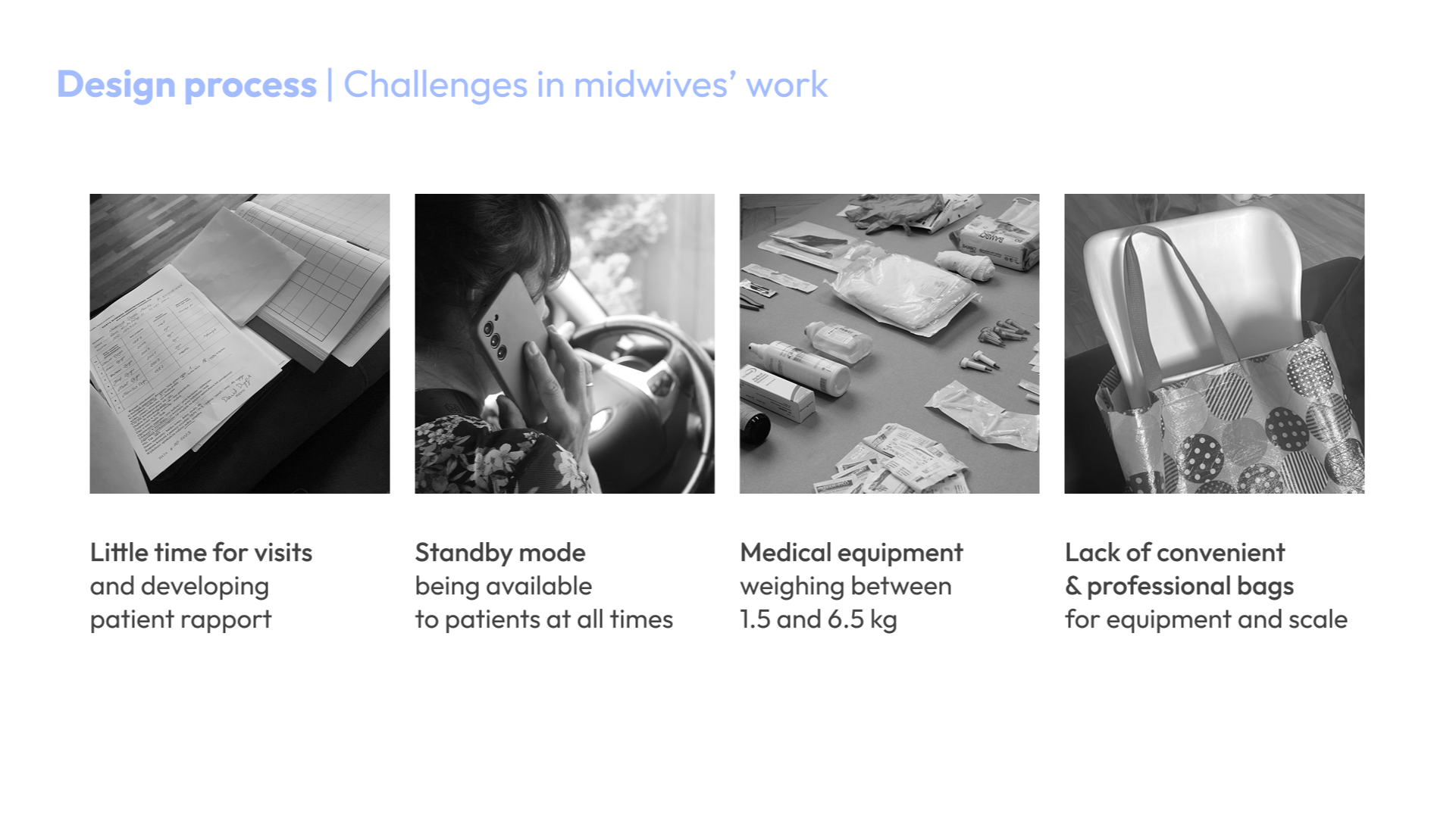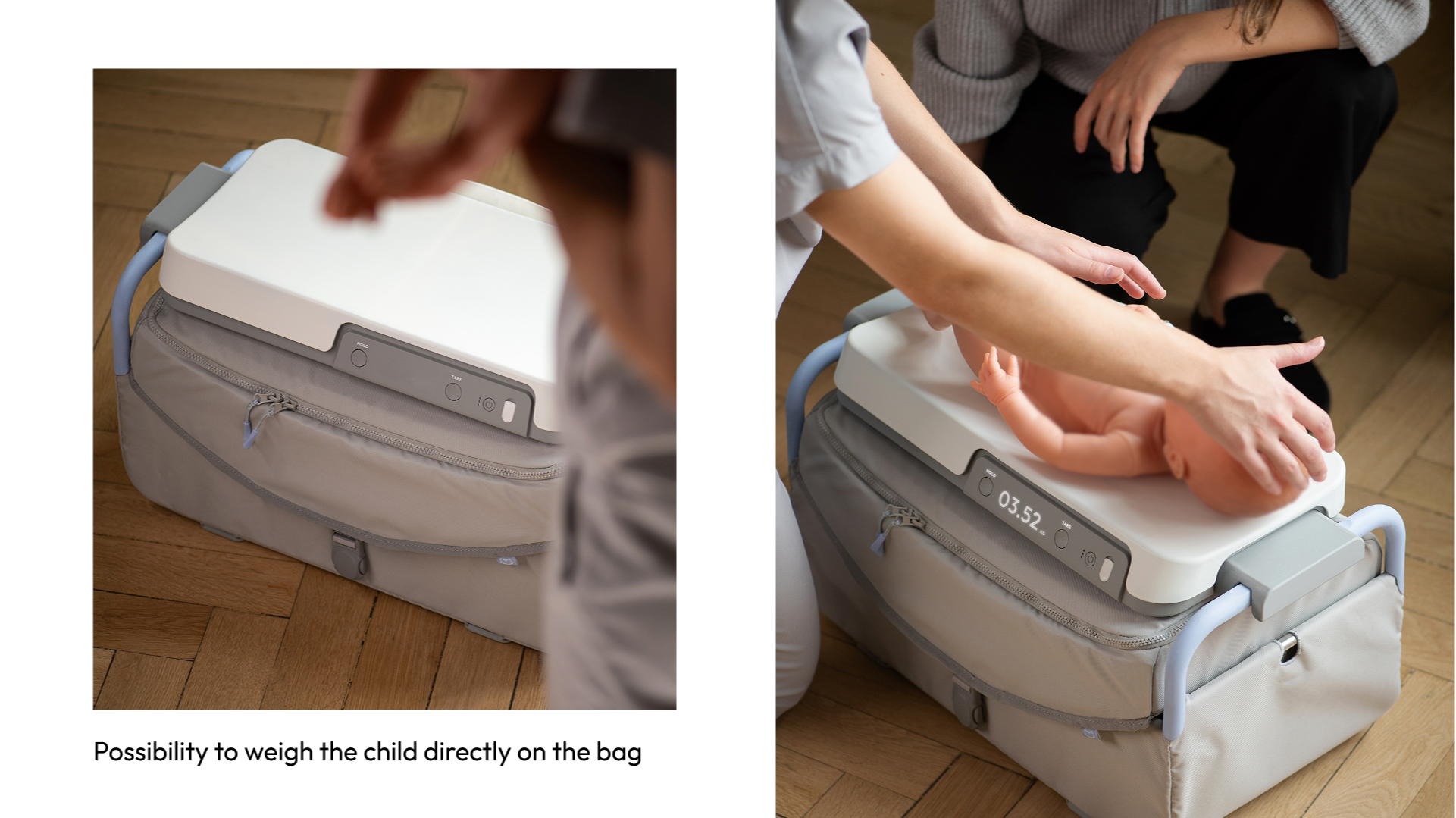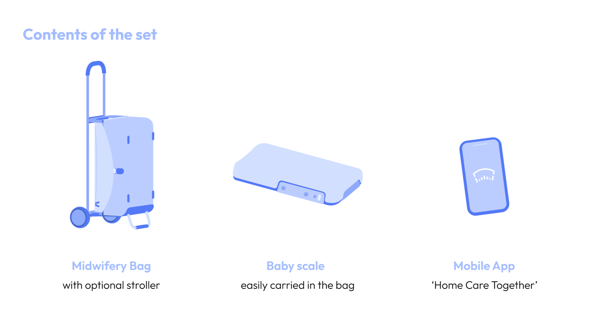 home care for the newborn and mother during the postpartum period. mobile midwife workstation Parents face new challenges when their child is born, and the postnatal period brings many physical and psychological changes for the mother. The midwife plays a crucial role in ensuring the well-being of both mother and baby through home visits. To work effectively, she needs the right tools to streamline her tasks, allowing more time to build meaningful relationships with her patients. The mobile midwife workstation includes a specialist bag with a portable baby scale. An integral part of the project is the “Home Care Together” app, which supports scheduling visits, monitoring the baby’s health, and tracking the parents’ well-being. This solution streamlines the midwife’s workflow while giving parents reliable access to information about visits and their newborn’s health.