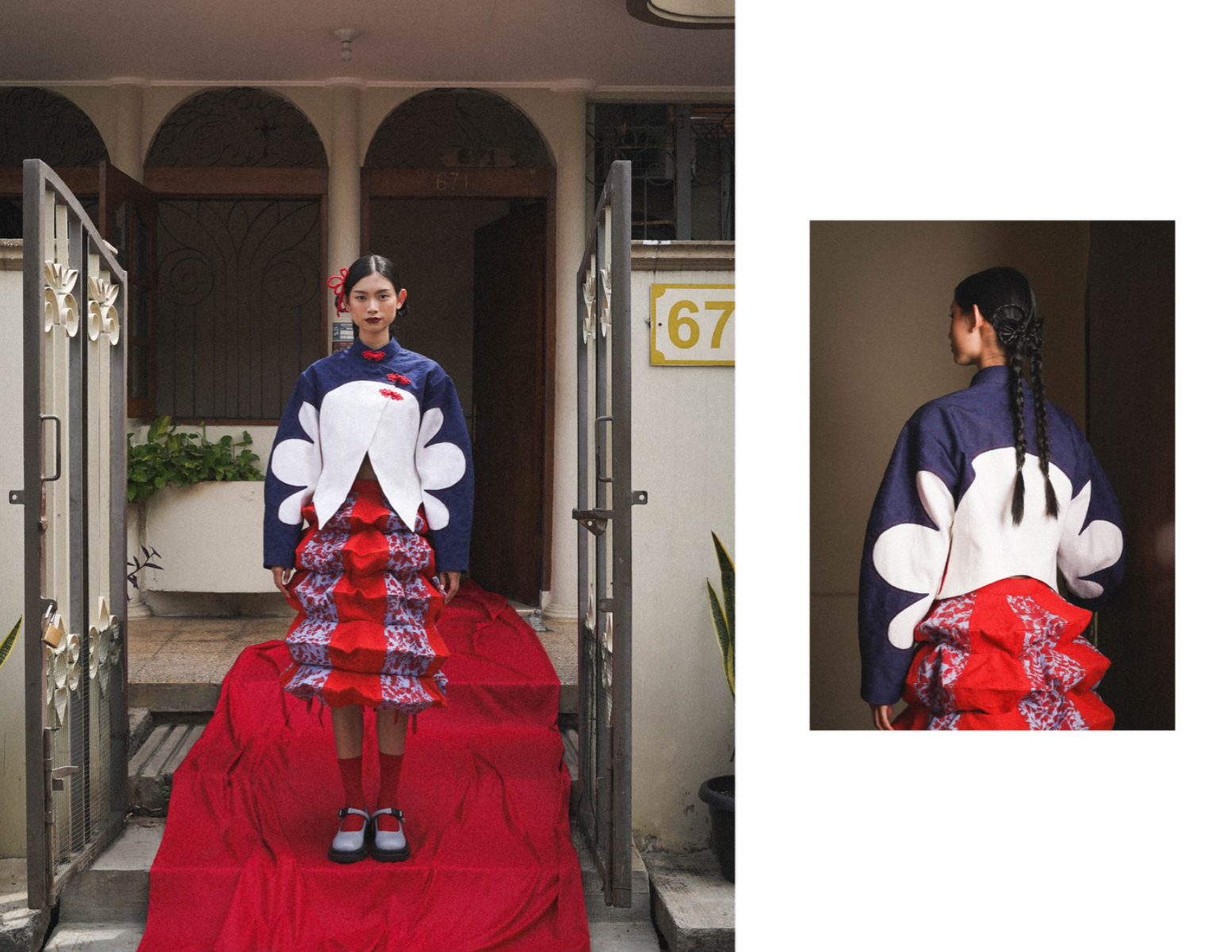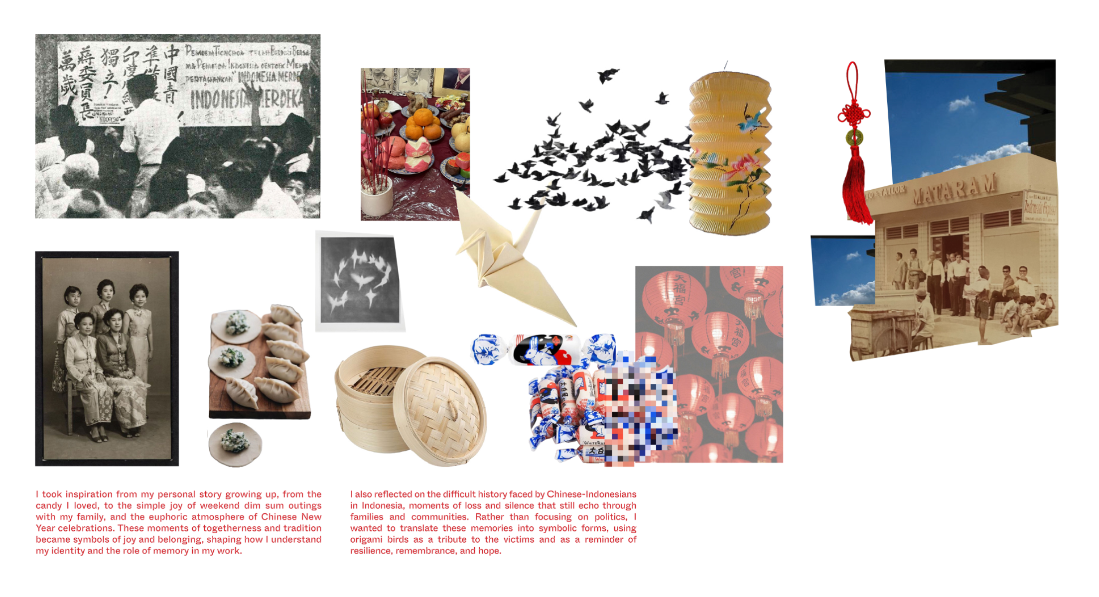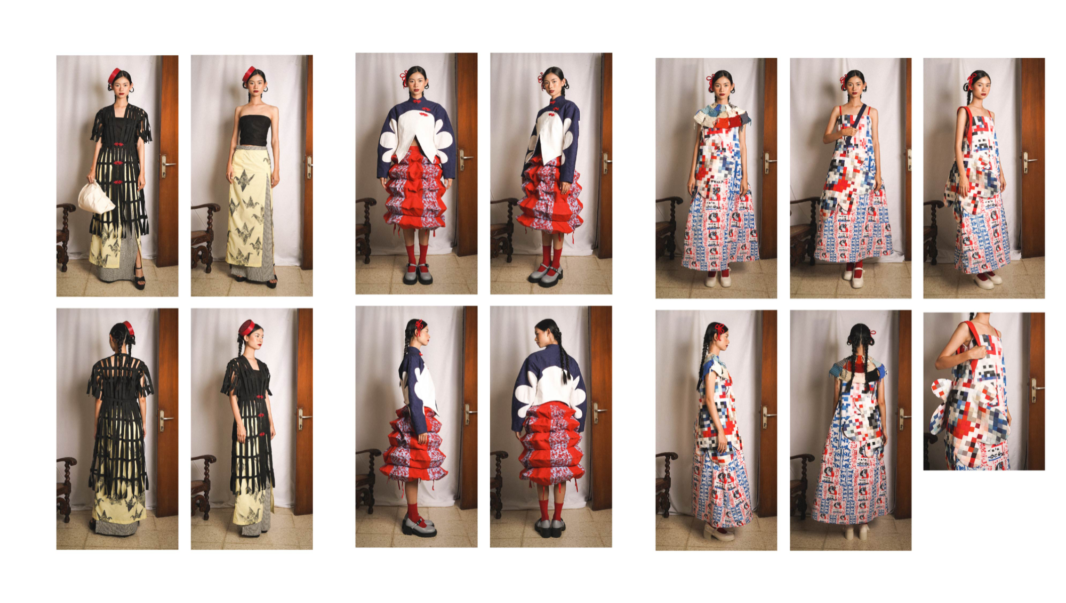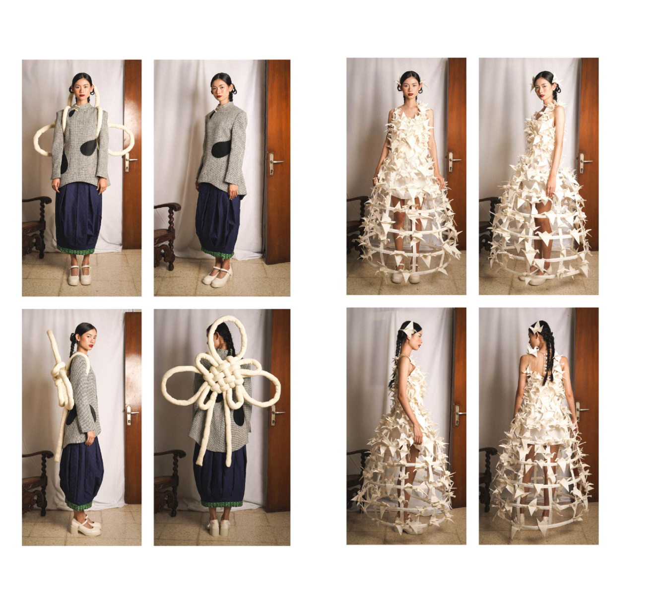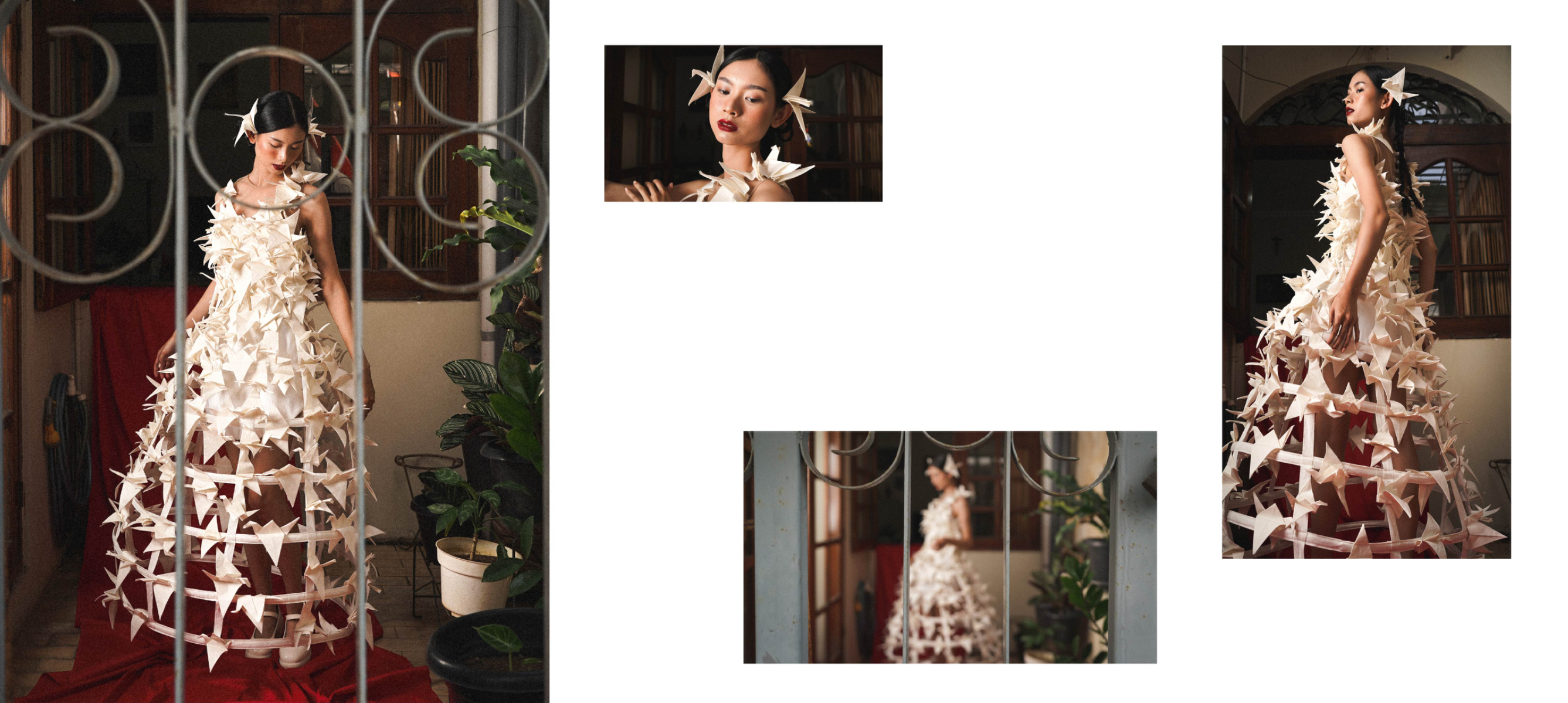 This collection reflects my Chinese-Indonesian identity and the collective memories passed down through my family. It explores both joyful and painful histories: childhood memories like white rabbit candy, and darker moments from my country’s past. Origami birds are used as a symbolic form to honor the victims of these dark past. Through layers, textures, and a variety of textile manipulations, the designs translate memory into garments that carry depth, emotion, and meaning. The collection also draws from Peranakan heritage, subtly integrating traditional Chinese and Indonesian clothing elements such as the cheongsam, kebaya, and batik into silhouettes and details.
