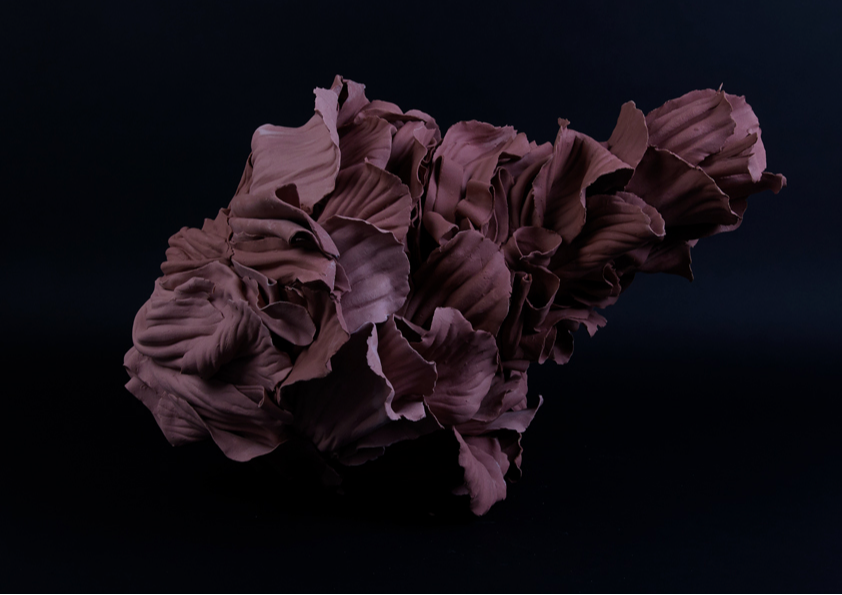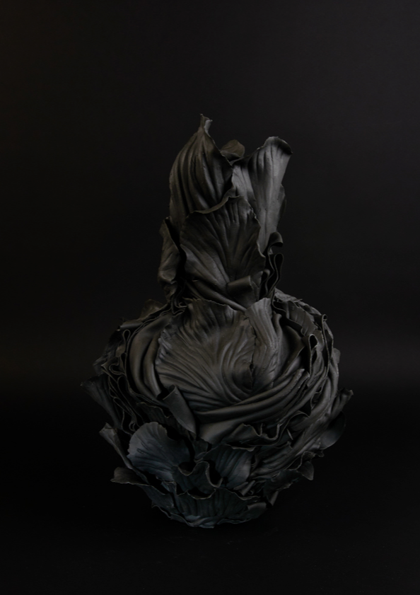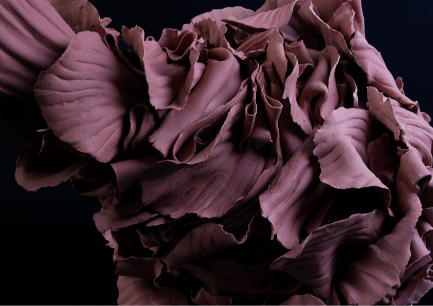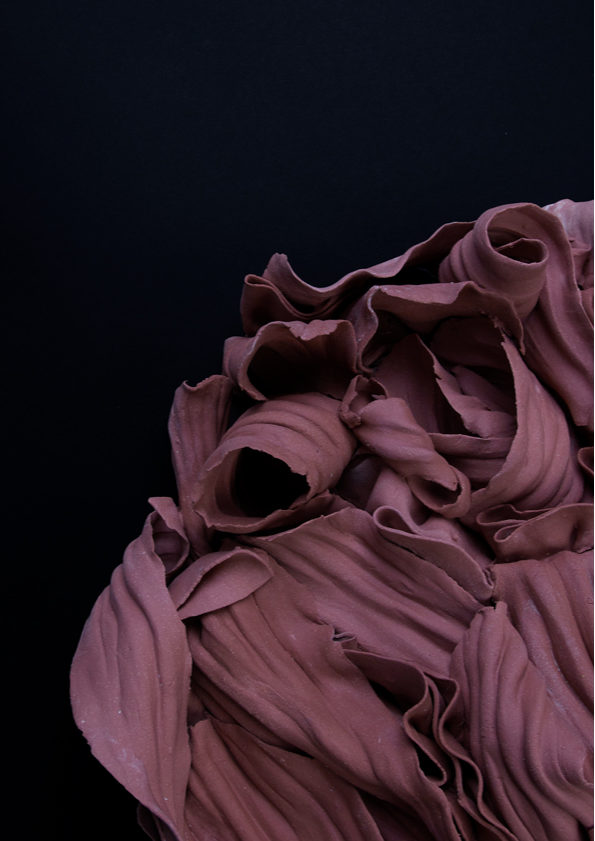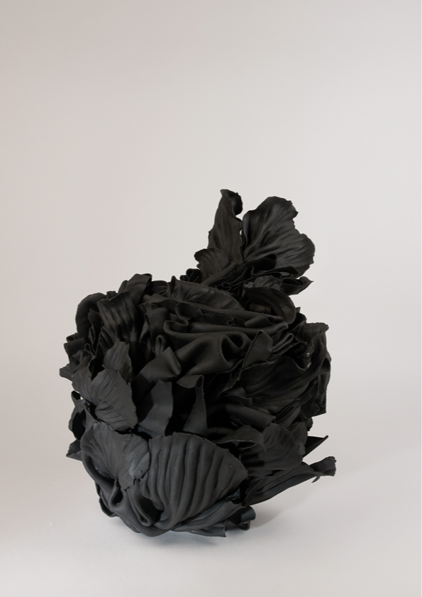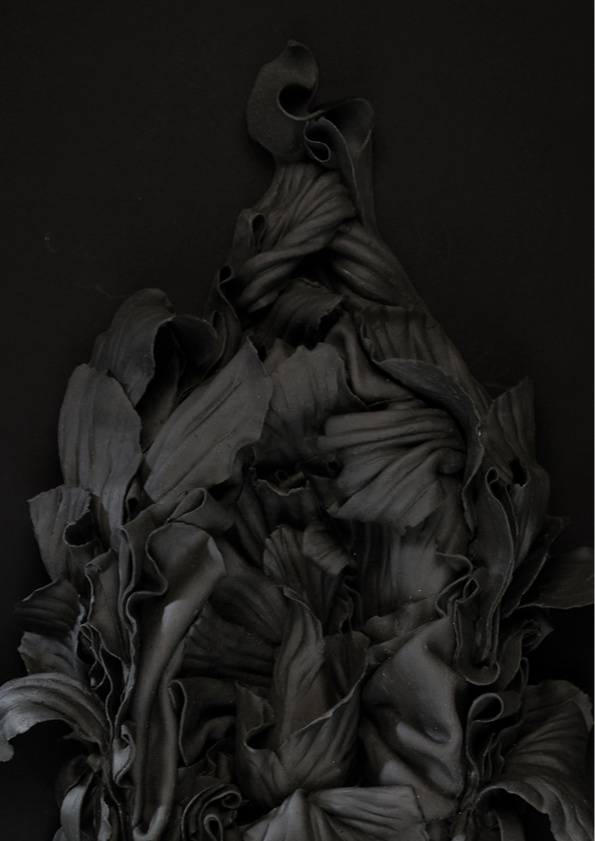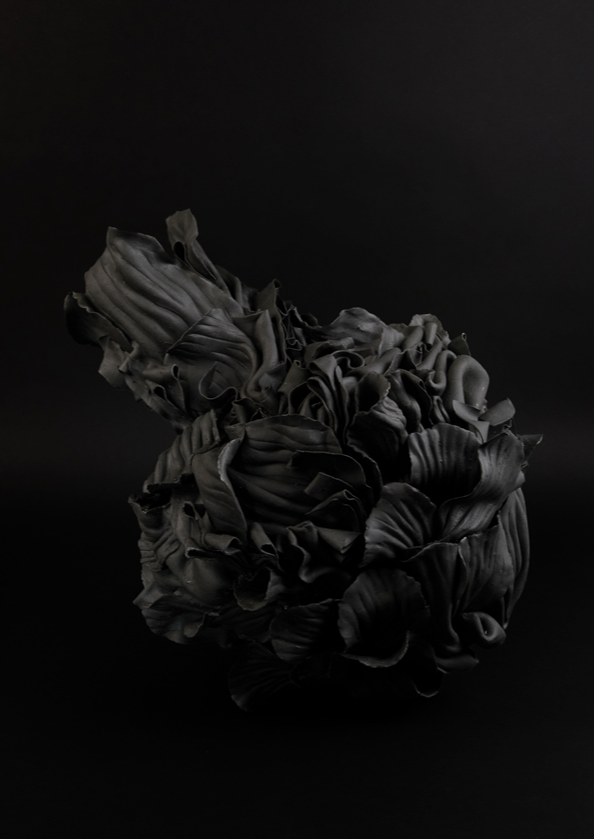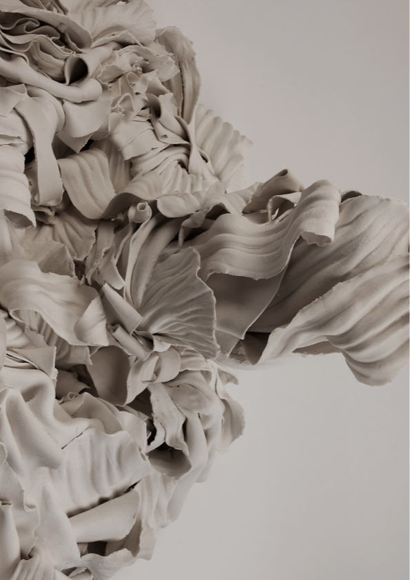 ‘In the alchemical garden’ explores transformation as a continuous, unstable state where materials bloom, decay, and shift in continuous metamorphosis. Drawing on my background in fashion, I work with paper porcelain as if it were cloth, cutting, draping, and pressing it into forms that inhabit the in-between. I create objects that are neither fully formed nor collapsing, but suspended in tension. This material language reflects my fascination with hybridity, instability, and the dialogue between control and surrender in making. My work merges botanical, bodily, and mineral references into seductive yet unsettling objects. Each piece resists a fixed form, embodying the vulnerability, drama, and possibility that is inherent in transformation, and existing in a state where beginnings and endings are inseparable.