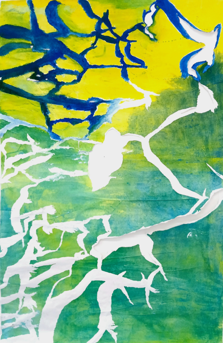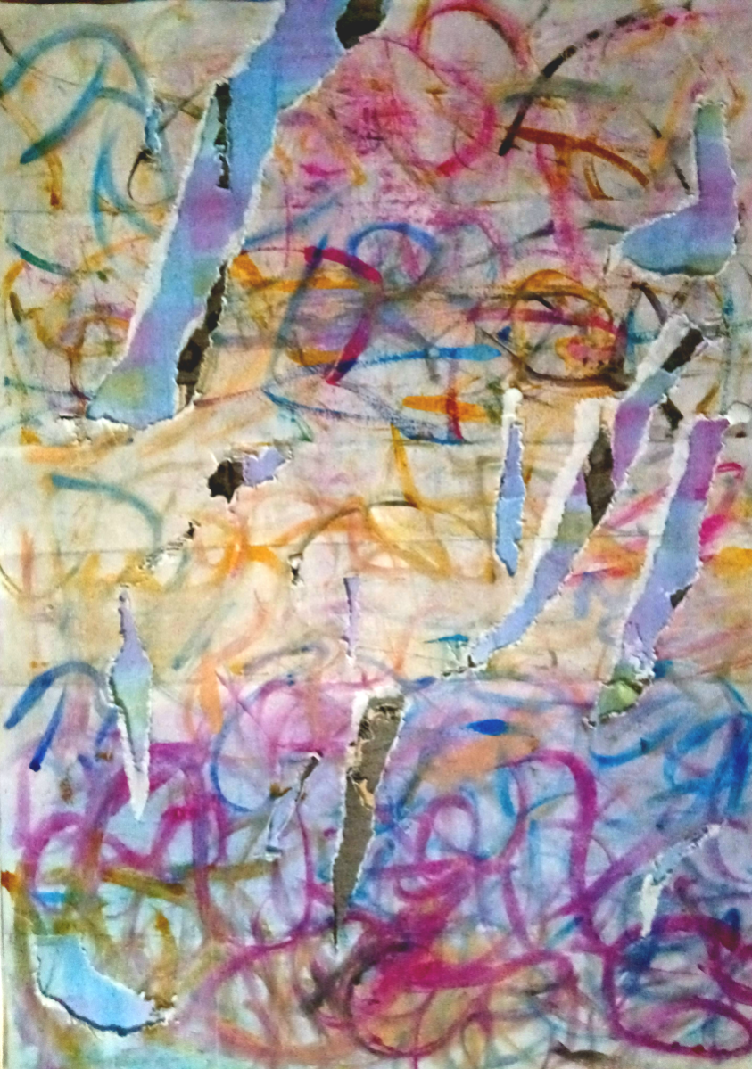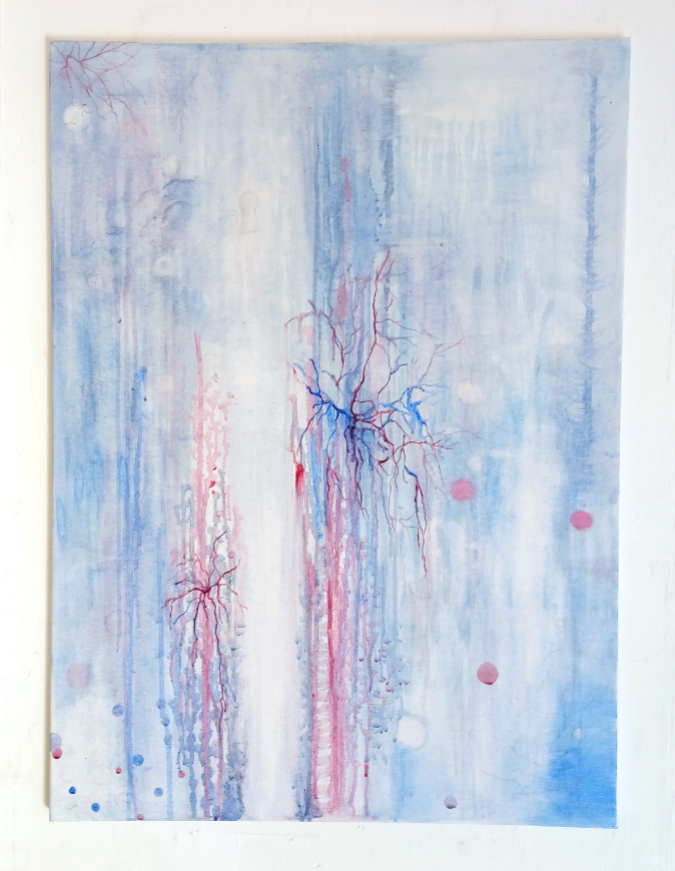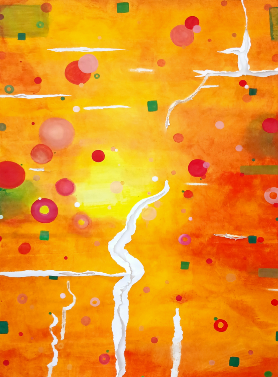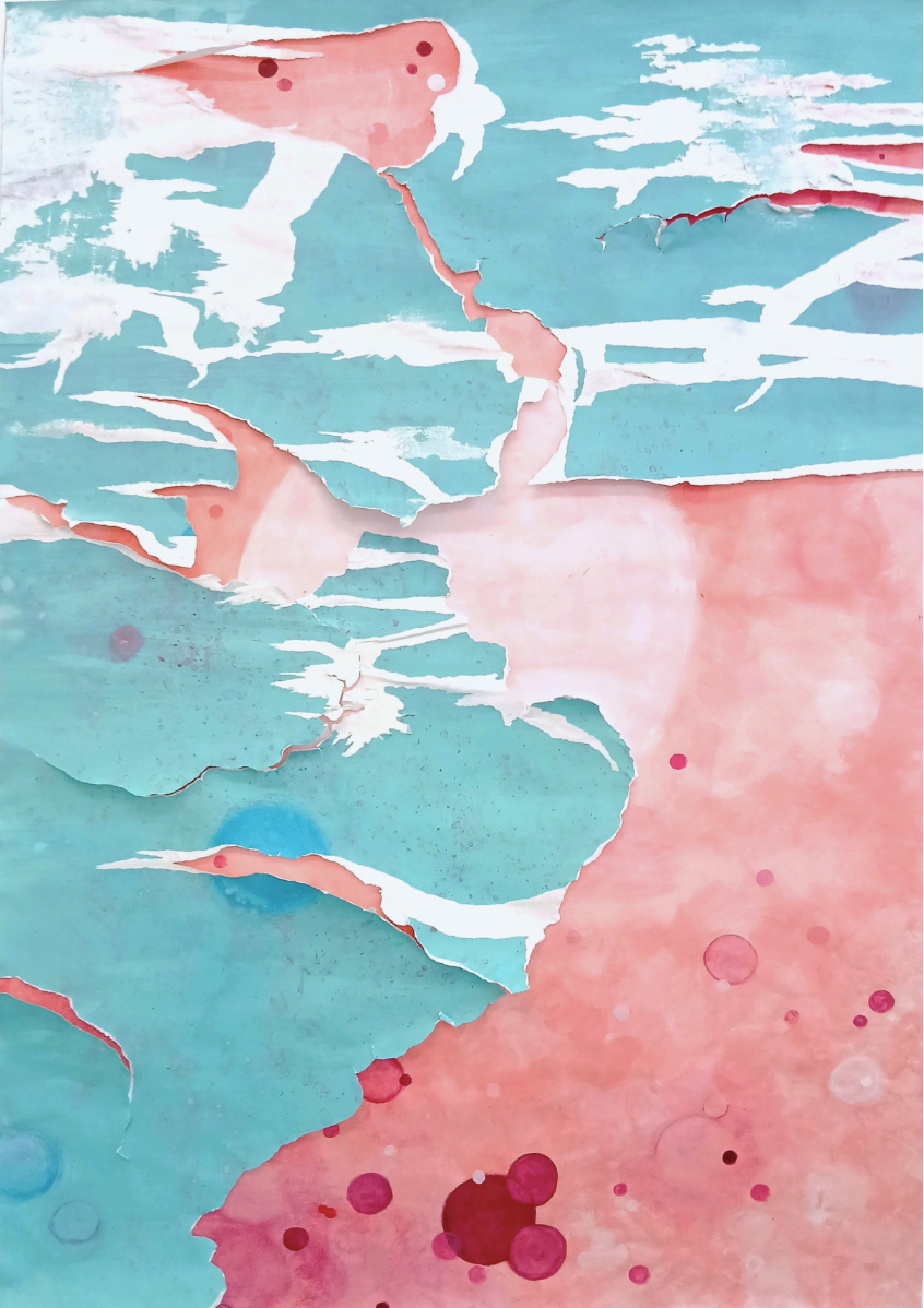 In anthropology, the liminal space comes from the disconnection that develops in the middle of a transformation. This space is something we often do not realize we are in but do know that we feel deeply disconnected, disorientated and overwhelmed with the world around us as the liminal space engulfs us, causing one to become dissociative, disconnected and fragile within liminality. I wanted to explore the liminal space from an emotive aspect describing the in-between through phosphene structures and contrasting palettes and mimicking the repetitive contradictory forces of destruction and creation that occur within liminality. This is represented through the dilution of acrylic paint and the repetitive nature of wiping and adding paint to paper and canvas. With desperate acts of scratching, grazing and ripping paper, we can feel the desperation and anticipation of exiting and entering the liminal space.