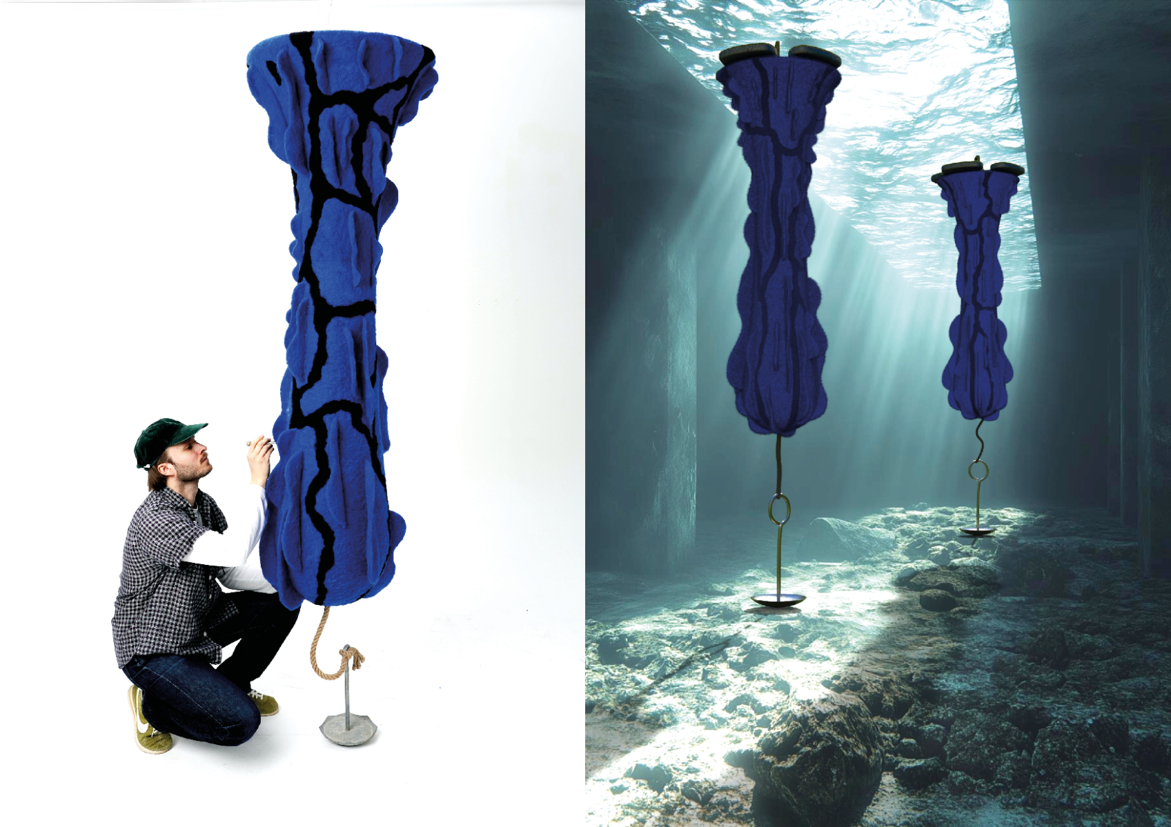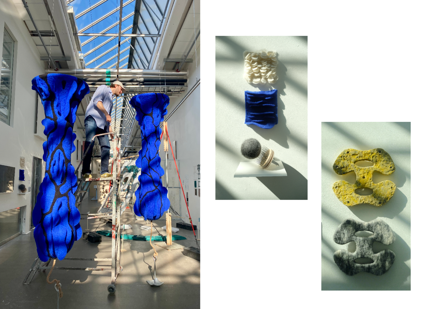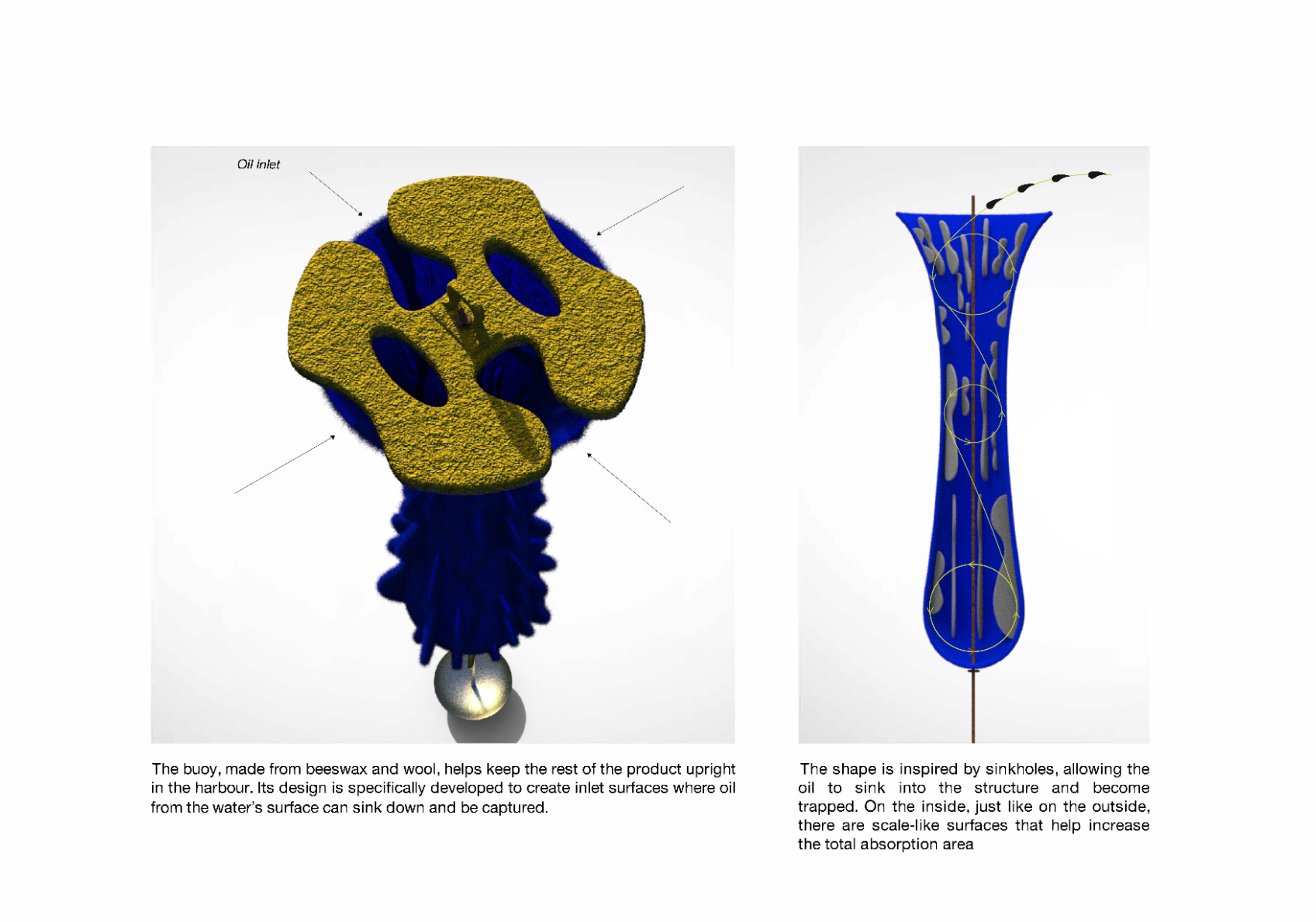 My master’s thesis explores Swedish wool waste as a sustainable and biodegradable solution for cleaning small boat harbours from oil and heavy metals, pollutants that spread throughout the water column and threaten marine ecosystems. Leakage from boats degrades water quality and calls for new, effective and environmentally friendly methods. In collaboration with wool experts, I developed Macro Fibers, a product made from repurposed wool from the meat industry, of which around 1,000 tons are discarded annually in Sweden. Wool can absorb up to 30 times its weight in oil, and the product can be cleaned and reused multiple times, extending its lifecycle and reducing waste. The absorbents are designed with inspiration from nudibranch warning colours and equipped with scale-like structures that increase the active surface area for uptake.