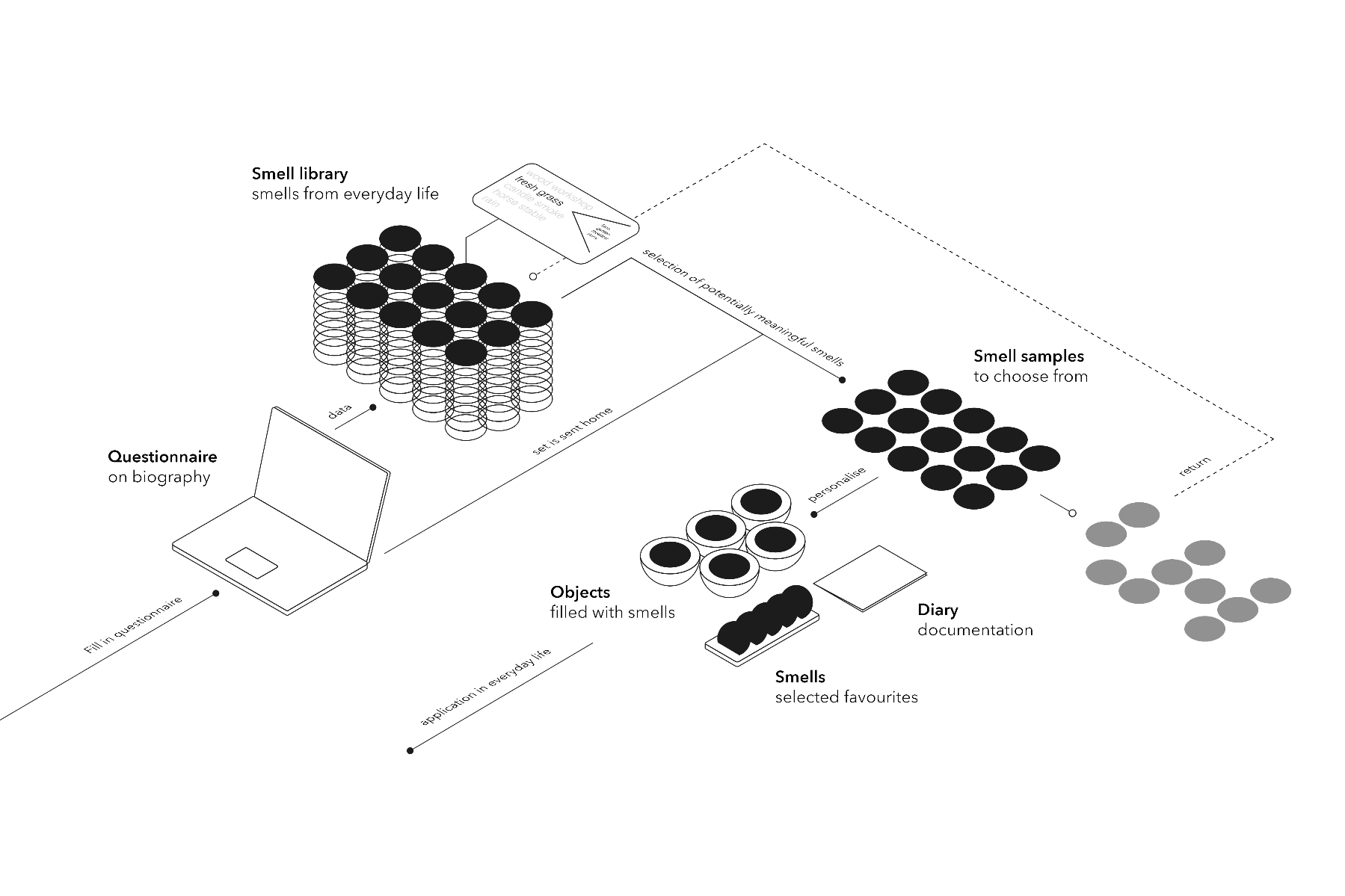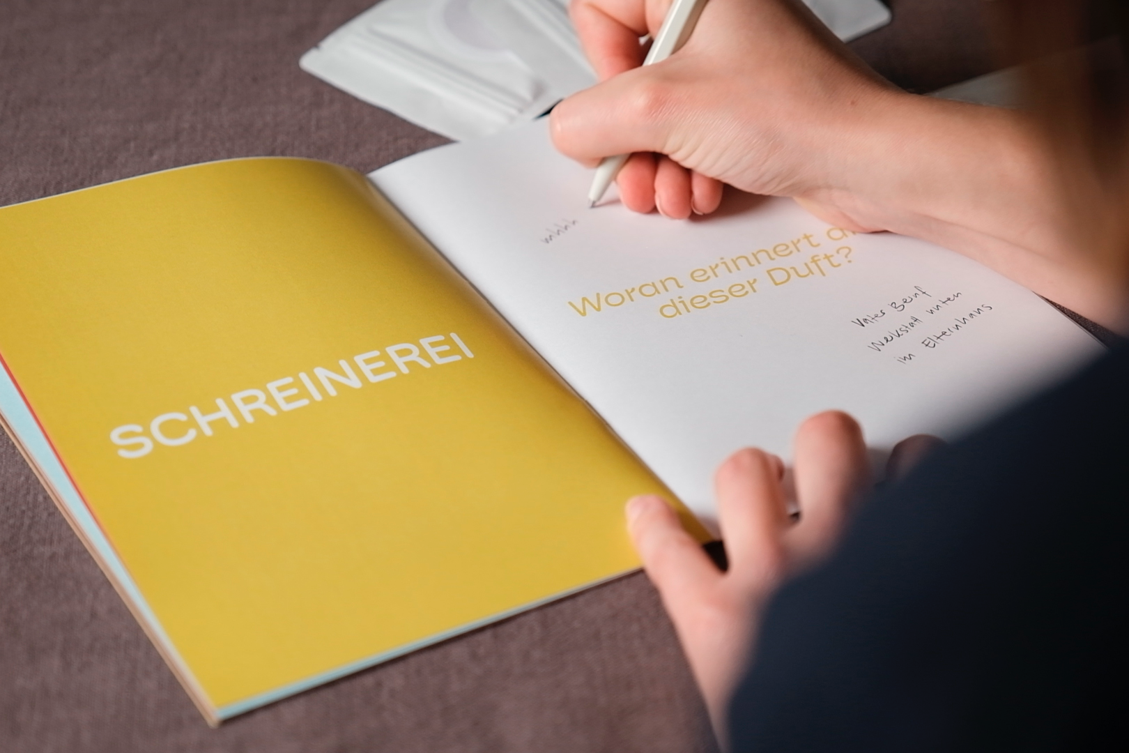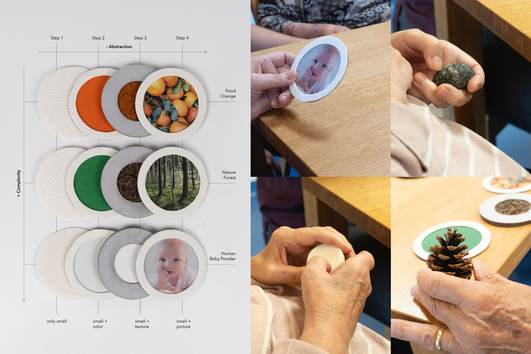 Nothing evokes memories like a familiar scent. Memoscent uses biographically meaningful scents to support people with dementia, easing the transition into care while fostering trust, comfort, and connection. Each kit includes a personalized scent biography, curated scent samples, a journal, and tactile objects that release scent through interaction. Developed with the dementia care center Sonnweid via co-creation and field research, the project turns familiar everyday smells into sensory tools that awaken memories, reinforce identity, and reconnect individuals with themselves and their loved ones.