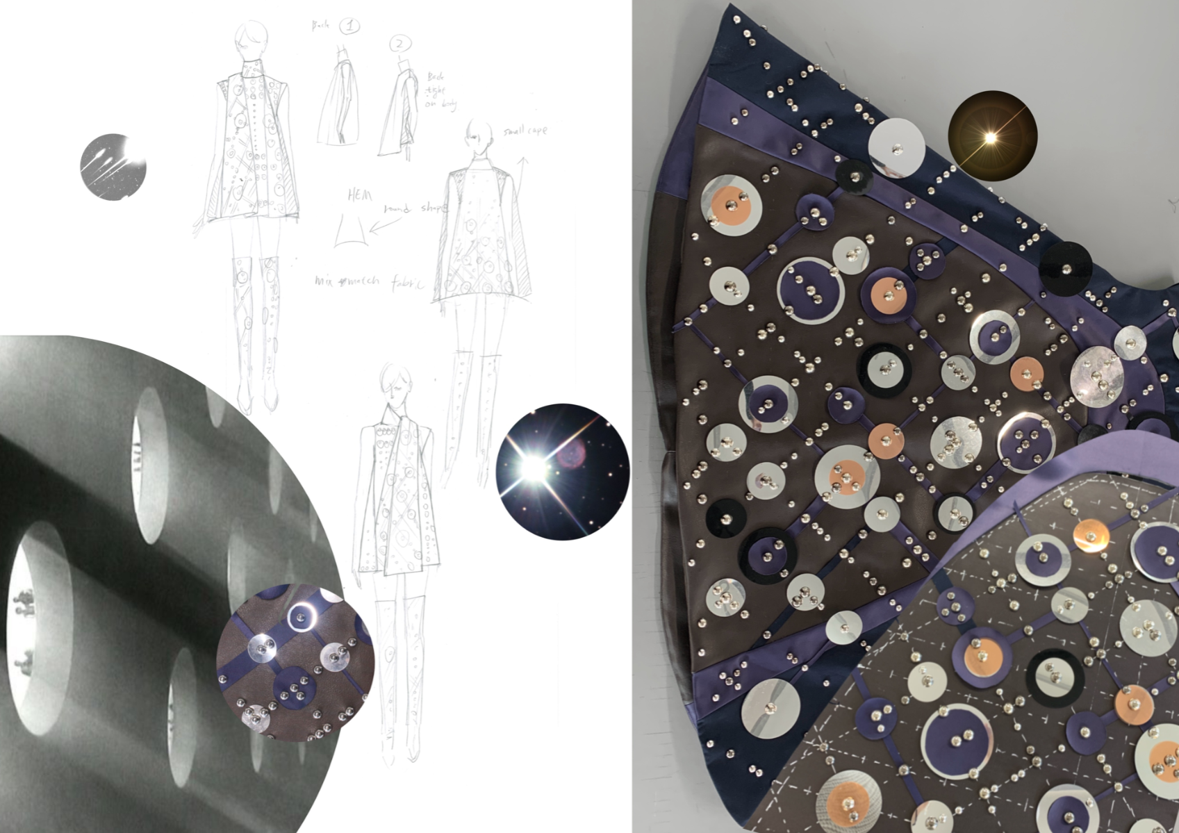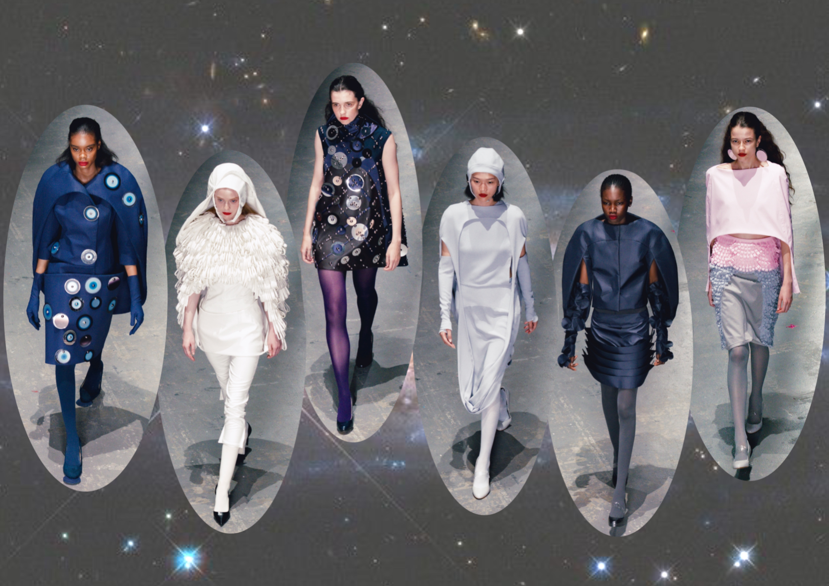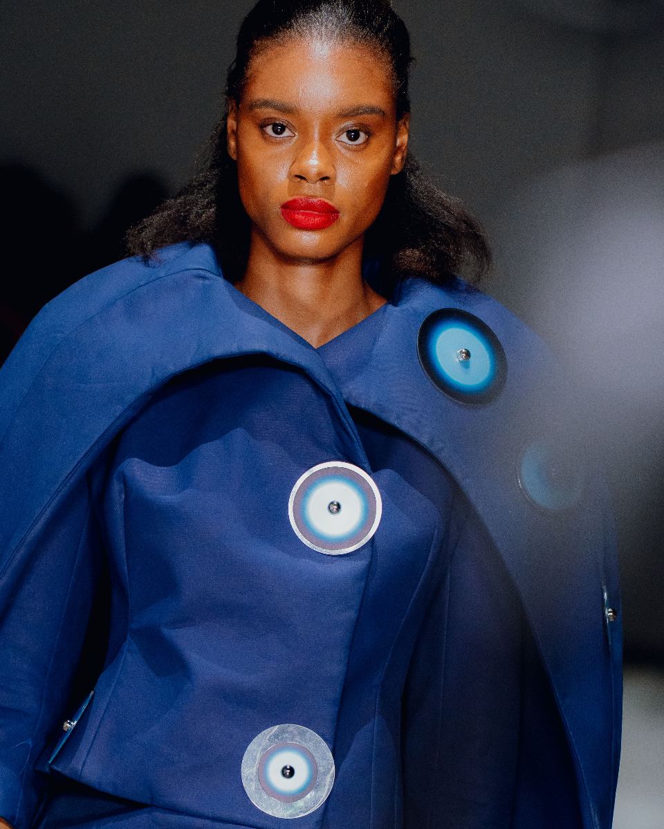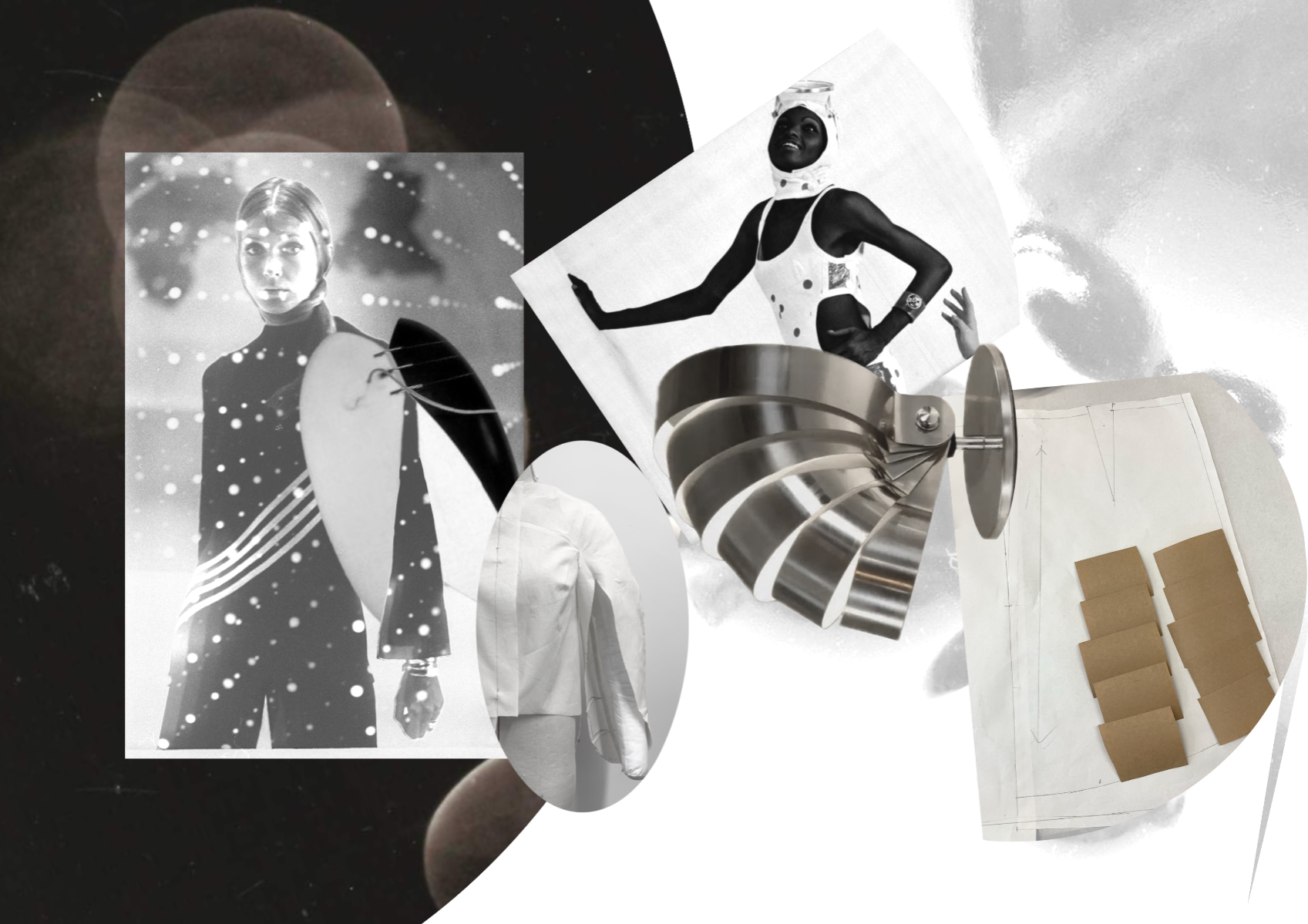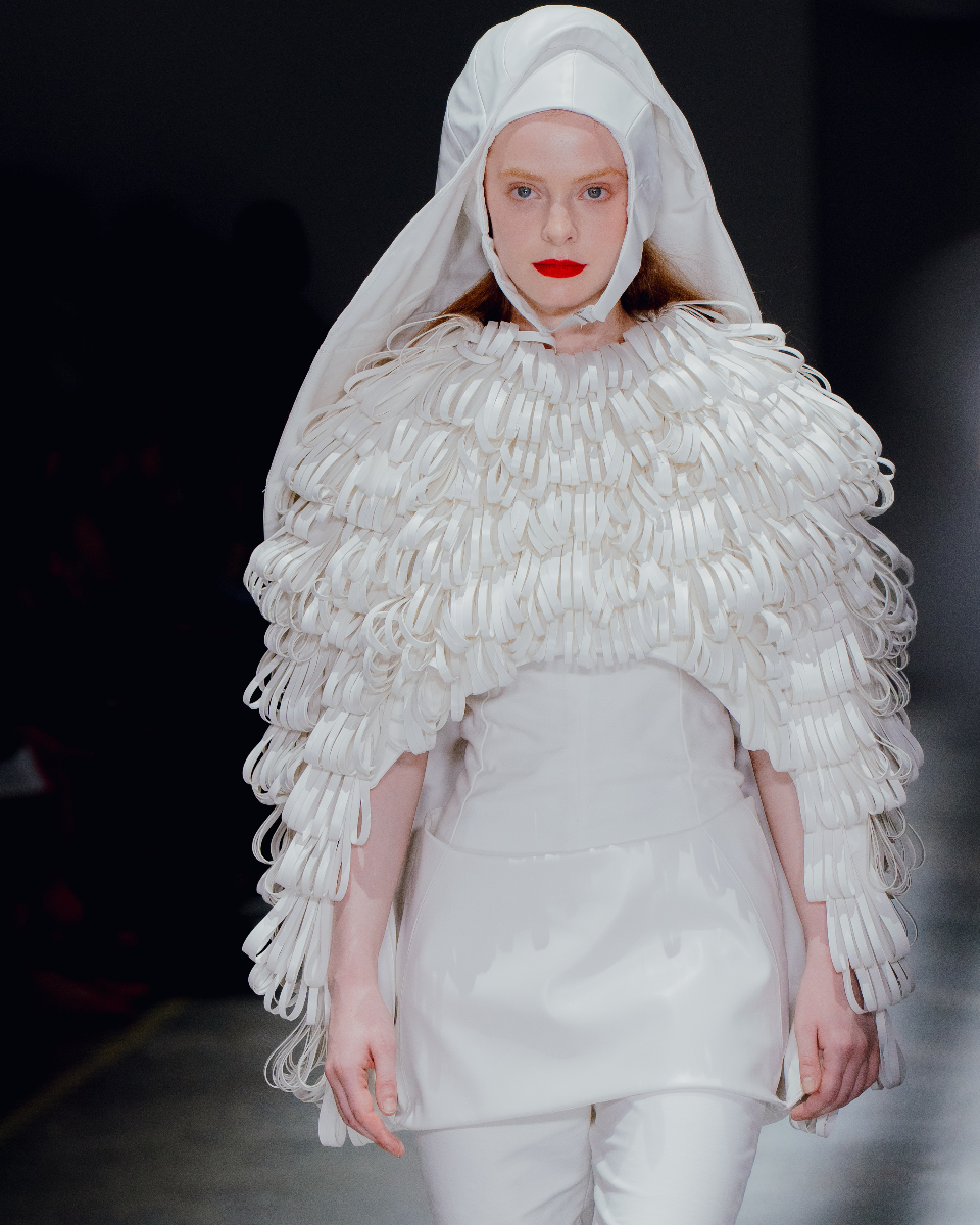 Nostalgic Futurism was born from my childhood fascination with the cosmos and a romantic vision of the unknown and the future. Drawing on elements from 1960s science fiction films and classic minimalism, the collection seeks to capture a subtle, nostalgic emotion. Its silhouettes reference the refined minimal style of the 1960s, taking inspiration from both fashion and product design of the era — clean lines, streamlined forms, mini skirts, the Egg Chair, and the metallic lamps of Ettore Sottsass and E.R. Nele. Fabrics carry ‘cosmic’ references — meteor showers, meteorites, the moon, and the iconic ‘pink suit’ from 60s sci-fi — realised through customised acrylic pieces, hand-cut strip embellishments, an innovative combination of scuba fabric and nylon, and hand-sewn sequins to create the collection’s signature textiles. Centred on shell-like and linear forms, the collection combines these innovative materials to create a full range of outerwear, coats, capes, trousers, skirts, hats, footwear, and jewellery.