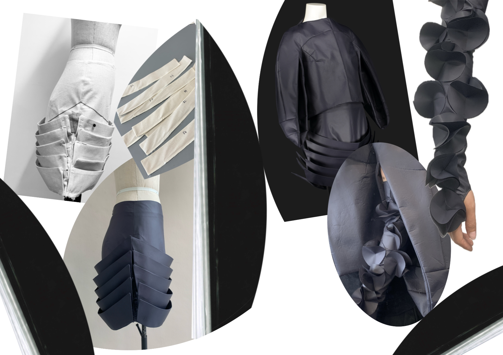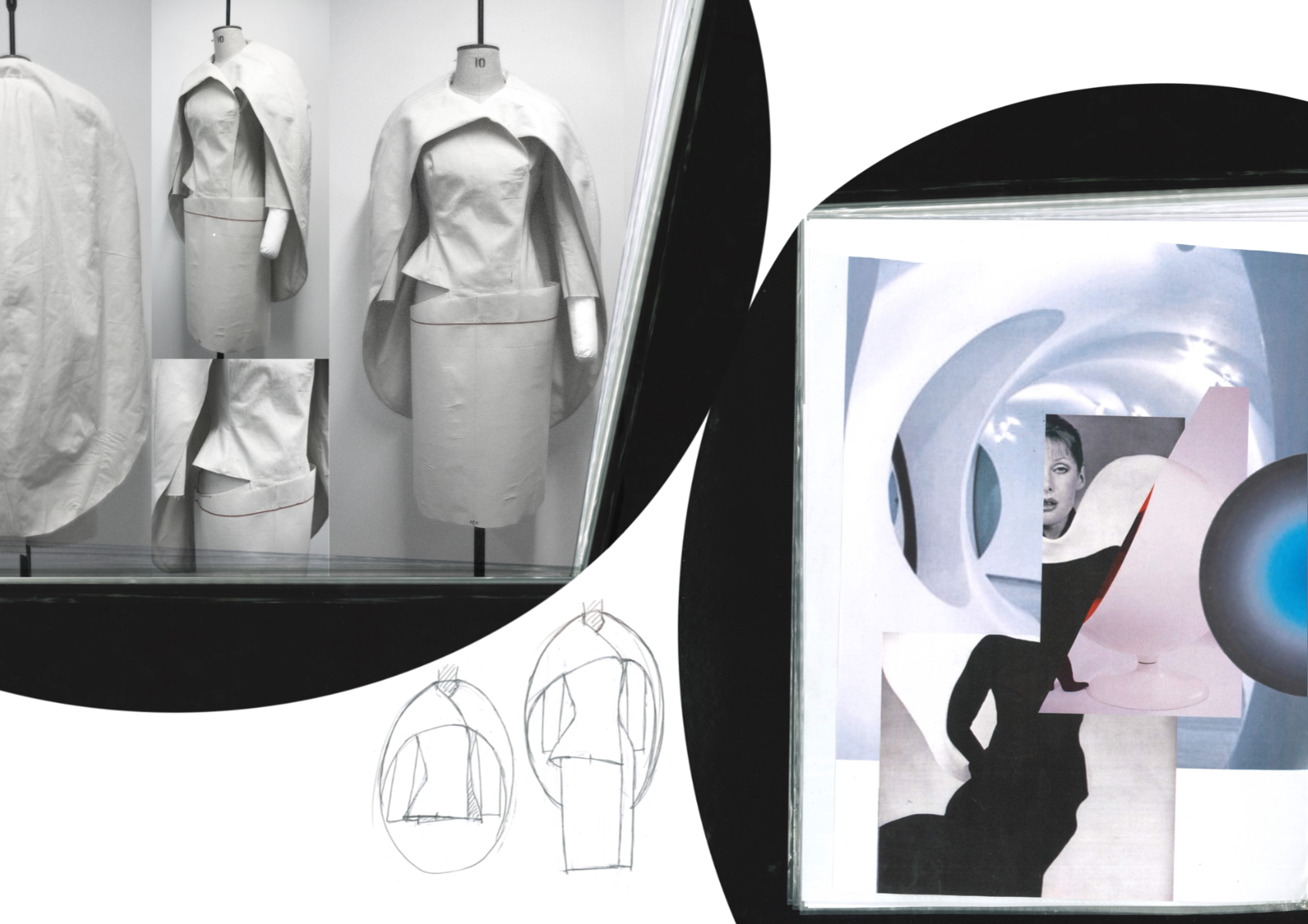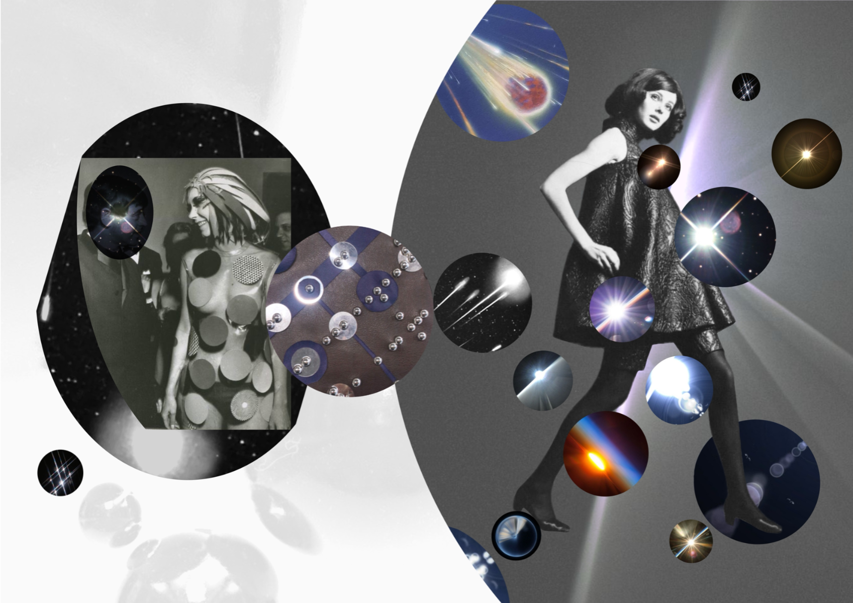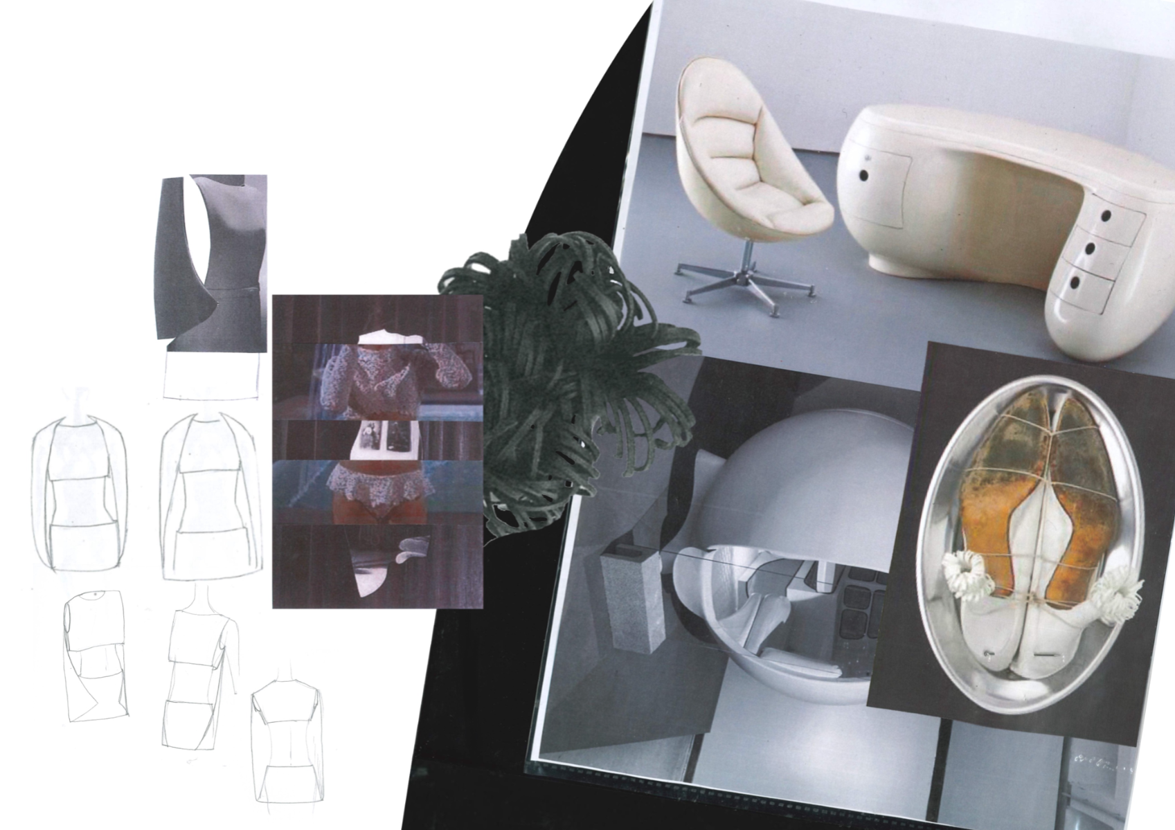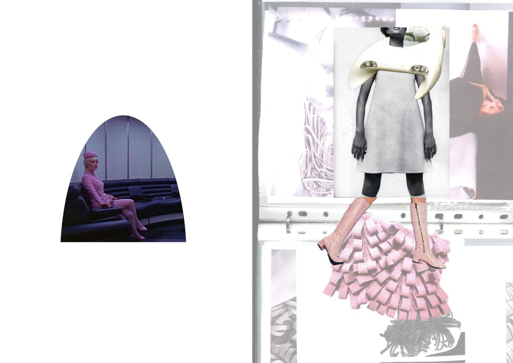 Nostalgic Futurism was born from my childhood fascination with the cosmos and a romantic vision of the unknown and the future. Drawing on elements from 1960s science fiction films and classic minimalism, the collection seeks to capture a subtle, nostalgic emotion. Its silhouettes reference the refined minimal style of the 1960s, taking inspiration from both fashion and product design of the era — clean lines, streamlined forms, mini skirts, the Egg Chair, and the metallic lamps of Ettore Sottsass and E.R. Nele. Fabrics carry ‘cosmic’ references — meteor showers, meteorites, the moon, and the iconic ‘pink suit’ from 60s sci-fi — realised through customised acrylic pieces, hand-cut strip embellishments, an innovative combination of scuba fabric and nylon, and hand-sewn sequins to create the collection’s signature textiles. Centred on shell-like and linear forms, the collection combines these innovative materials to create a full range of outerwear, coats, capes, trousers, skirts, hats, footwear, and jewellery.