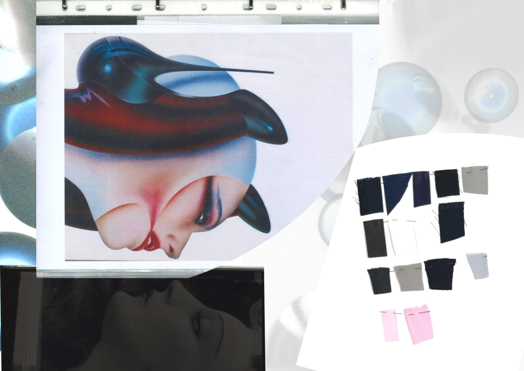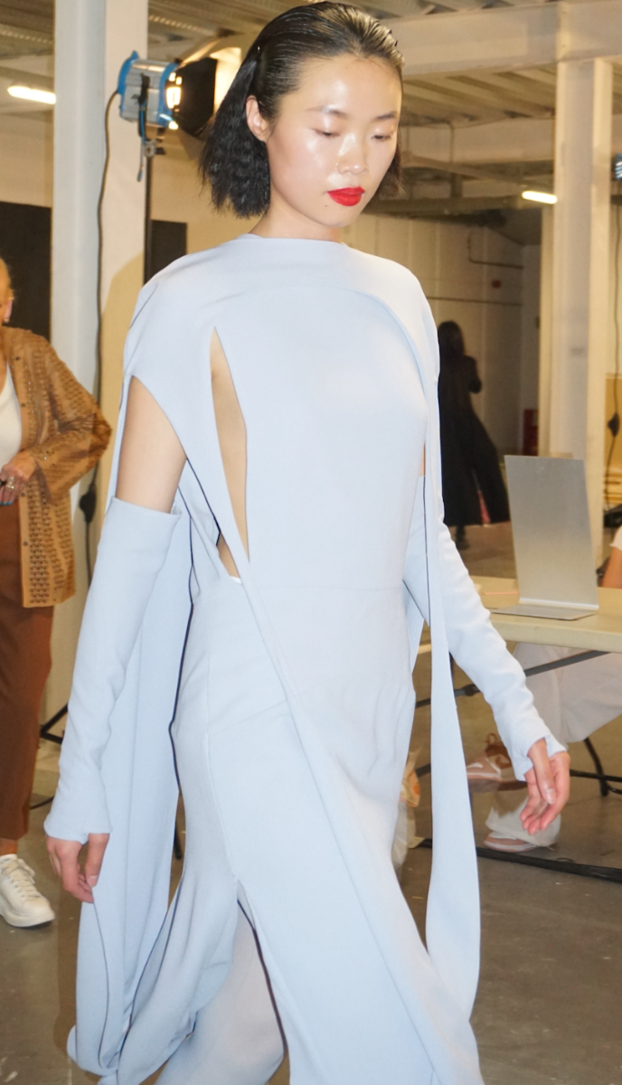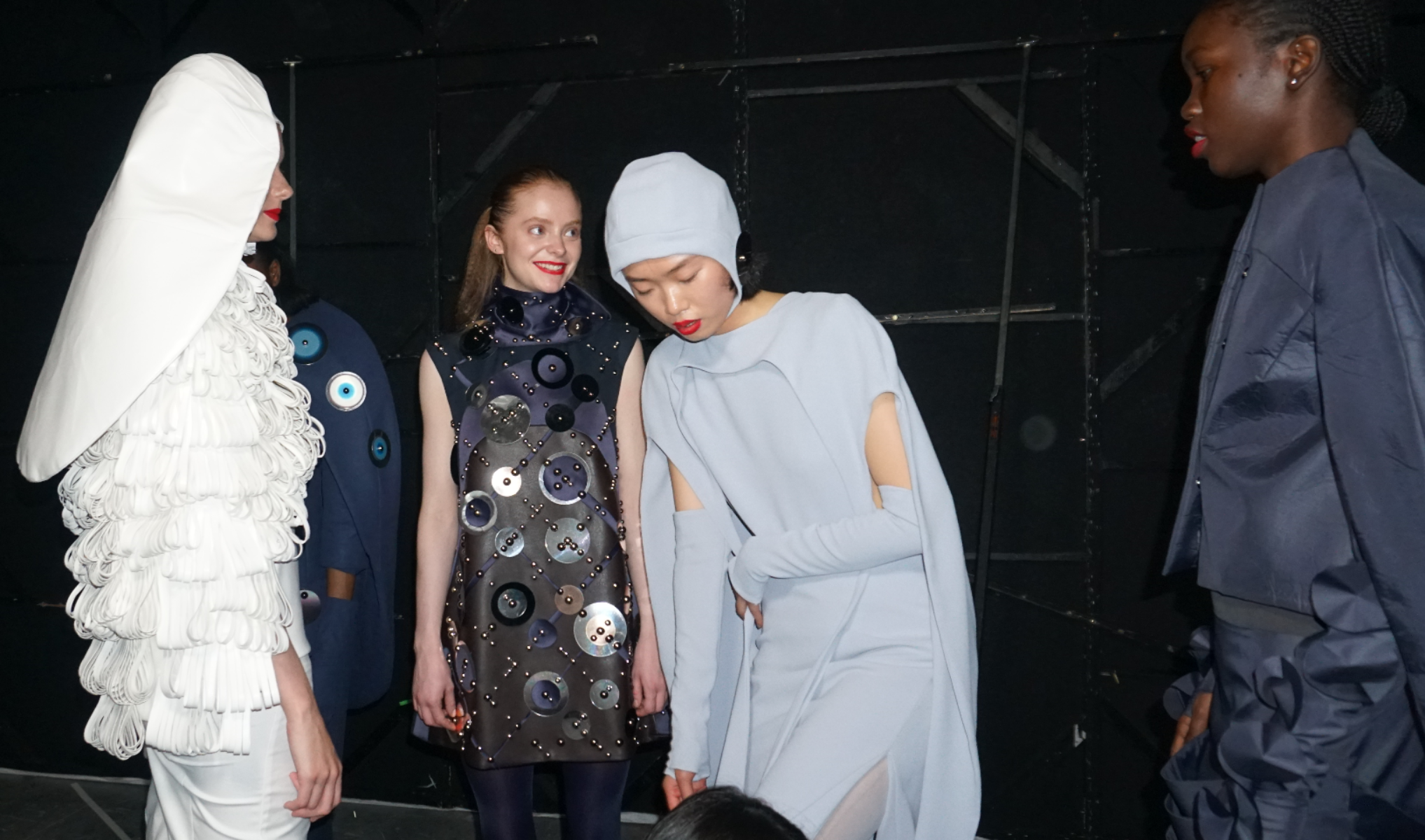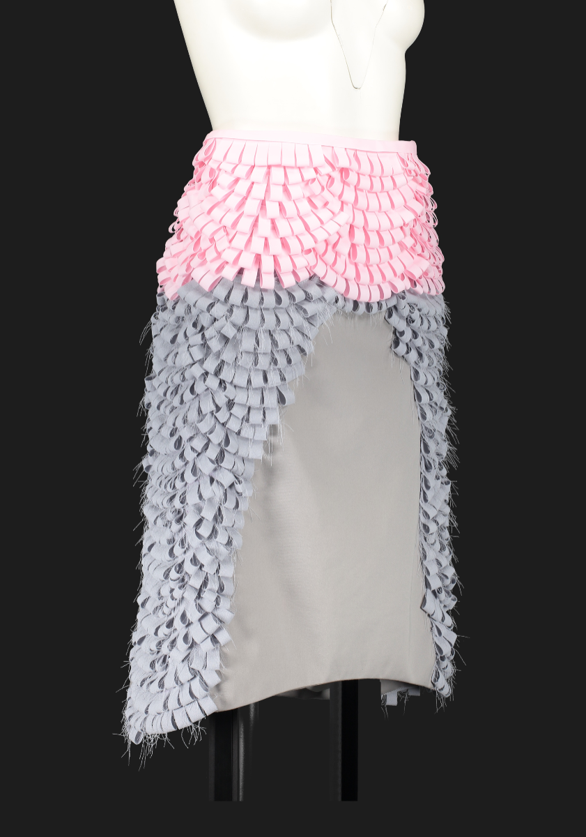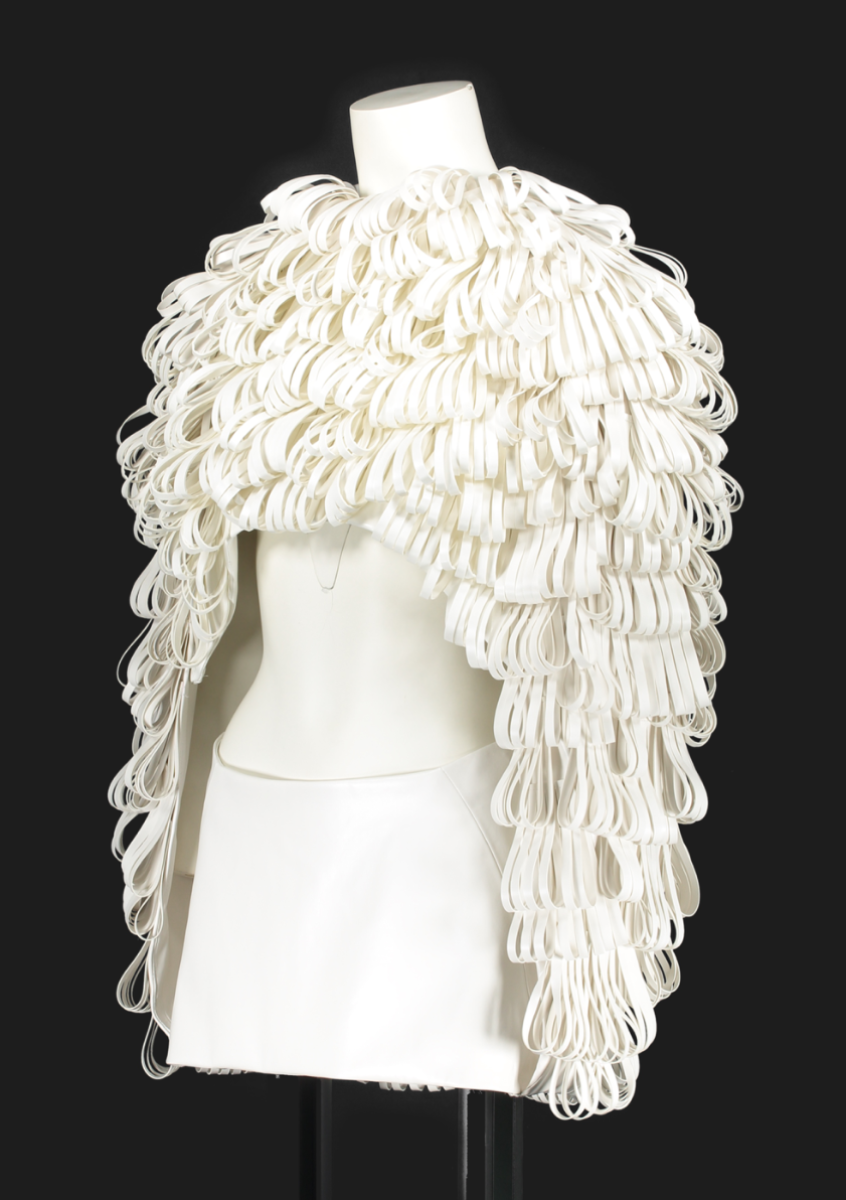 Nostalgic Futurism was born from my childhood fascination with the cosmos and a romantic vision of the unknown and the future. Drawing on elements from 1960s science fiction films and classic minimalism, the collection seeks to capture a subtle, nostalgic emotion. Its silhouettes reference the refined minimal style of the 1960s, taking inspiration from both fashion and product design of the era — clean lines, streamlined forms, mini skirts, the Egg Chair, and the metallic lamps of Ettore Sottsass and E.R. Nele. Fabrics carry ‘cosmic’ references — meteor showers, meteorites, the moon, and the iconic ‘pink suit’ from 60s sci-fi — realised through customised acrylic pieces, hand-cut strip embellishments, an innovative combination of scuba fabric and nylon, and hand-sewn sequins to create the collection’s signature textiles. Centred on shell-like and linear forms, the collection combines these innovative materials to create a full range of outerwear, coats, capes, trousers, skirts, hats, footwear, and jewellery.