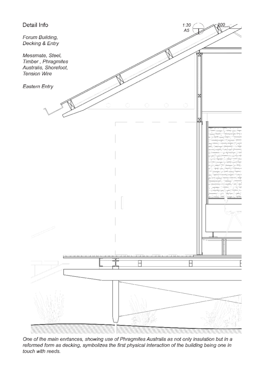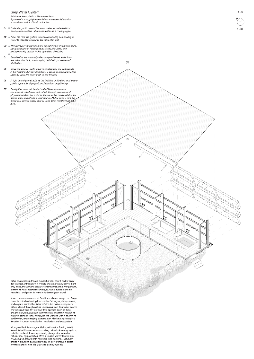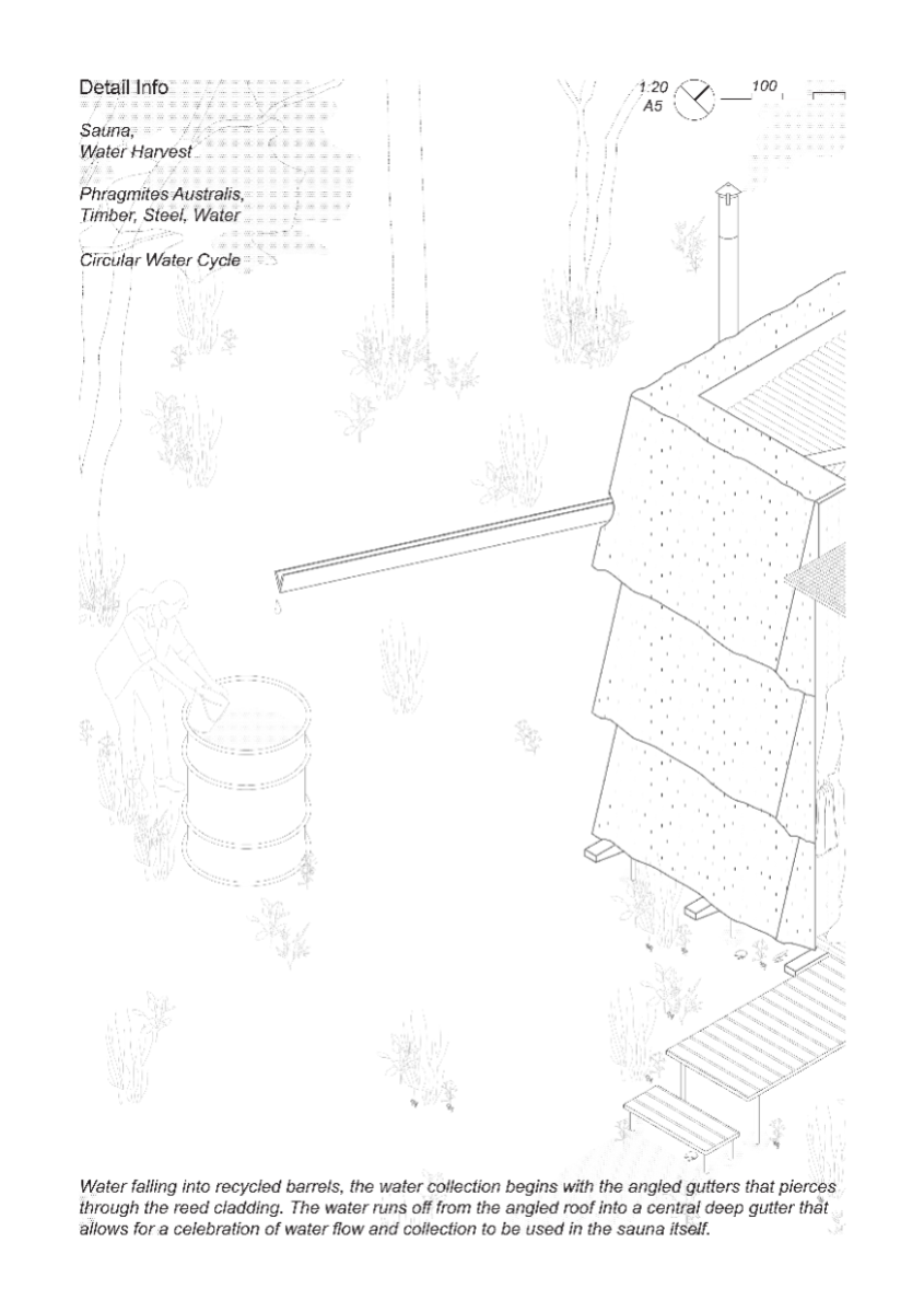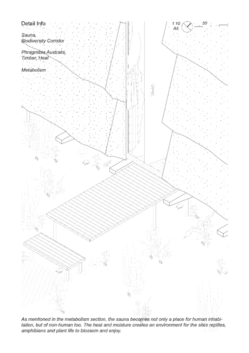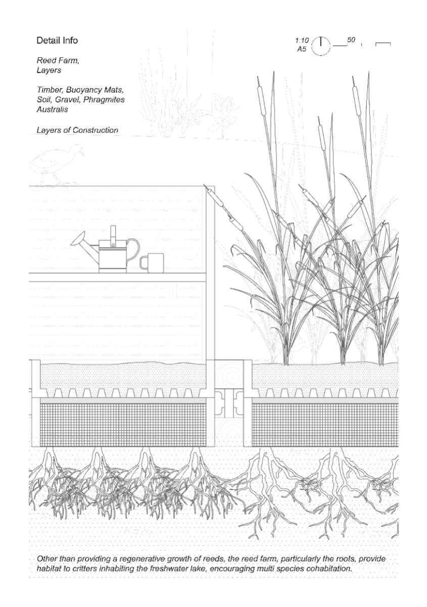 Can material reform serve as a critical framework in the resistance of standardized practice, legislation and centralised material sovereignty, whilst also fostering emergent creative ecologies that are immersed in the healing and remediation of landscapes scarred by anthropogenic systems of control? This thesis investigates material reform using Phragmites australis as both a material and mediator in the ecological healing of Melbournes Westgate Park’s wetland ecology. It explores how regenerative and culturally embedded materials can question colonial material flows, extractive supply chains, and the sites domineering architectural dialect, by contriving bio-regional alternatives that foster a multi-species cohabitation of site. Within its designs, this project examines how locally sourced, ecologically responsive materials can aid in supporting practices of remediation, restoration, and an intra-species stewardship. Central to this thesis are themes of localism, circularity, and care, which are articulated through the development of distributed ecologies, relational infrastructures, and ritualistic spaces for human and non-human gathering. In doing so, the thesis positions architecture not as fixed form, but as a responsive ecology able to facilitate renewed relationships between land, species, and material.