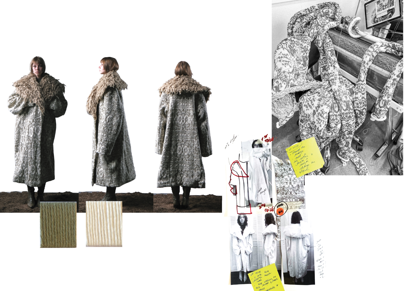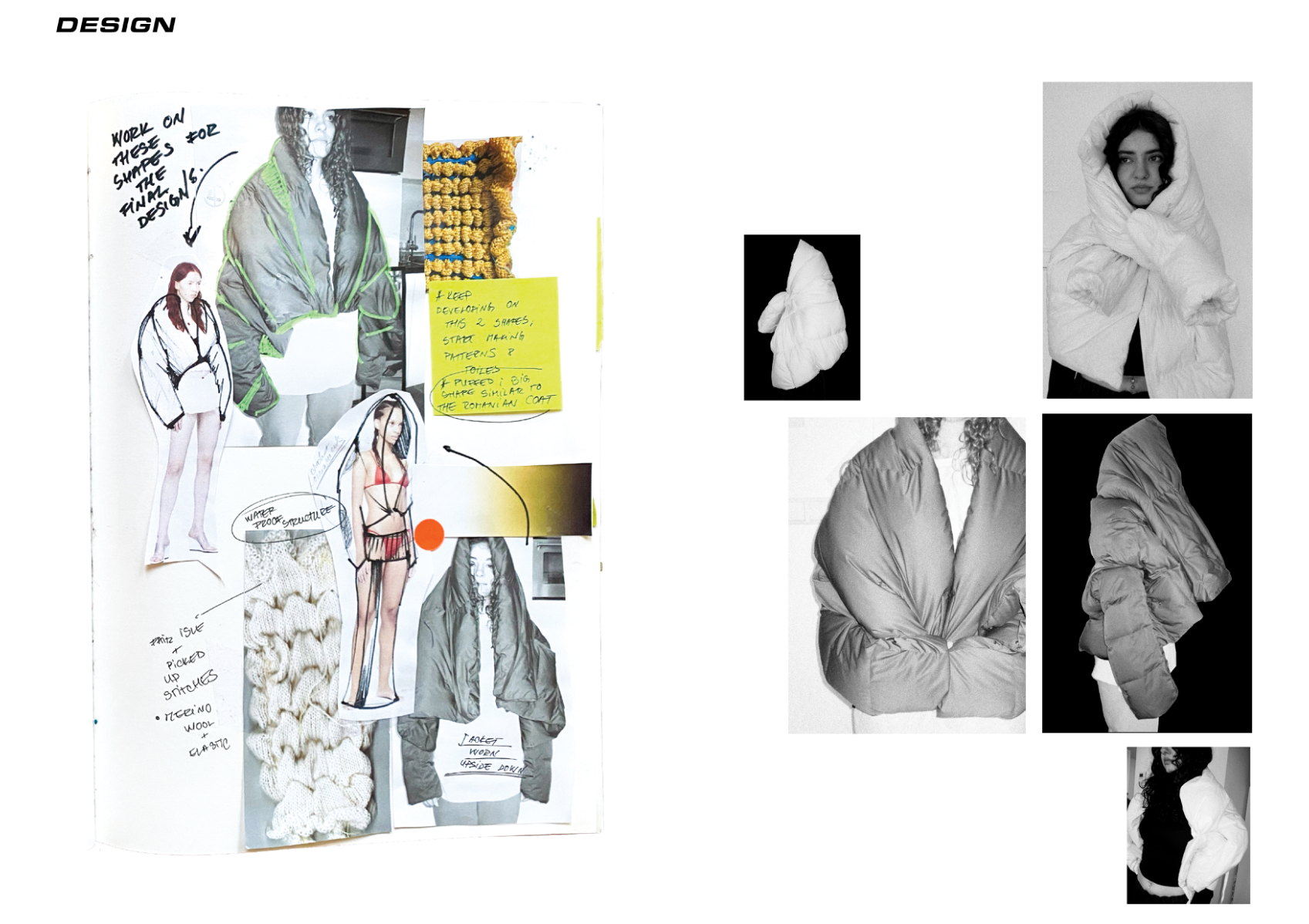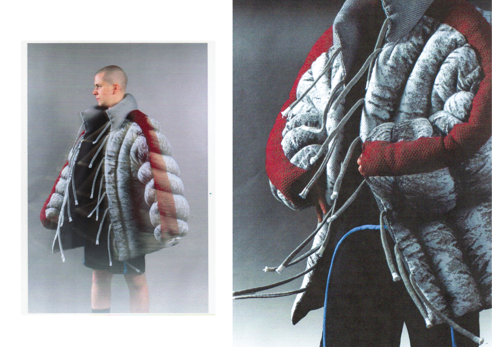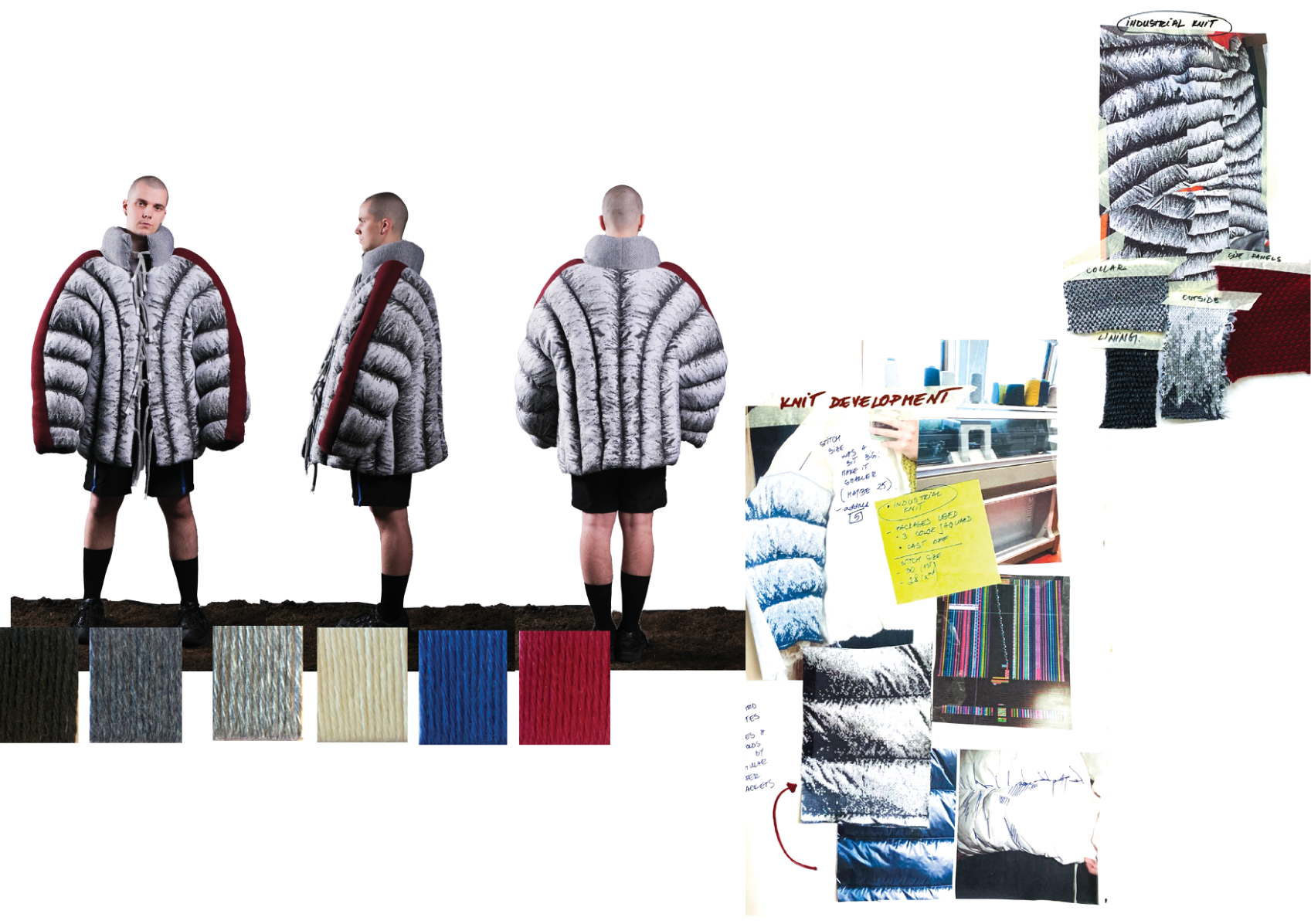 How can craftsmanship, rather than being left behind, help reinvent our current fashion practices? The collection “Resilient Forms” challenges the current state of the fashion industry by functionally reintroducing craftsmanship into our society. The coats worn by Romanian shepherds in the rugged conditions of the Carpathian Mountains are a prime example of how craft can create functional and weather-resistant garments while using natural materials. Drawing inspiration from this traditional context, the project explores techniques such as knitting and the properties of wool to develop improved garment-making methods for today’s needs. The heart of this collection lies in the development of a knitted outerwear line. By delving into the evolution of this protective layer, it draws a parallel between the traditional sheepskin coats and their modern counterpart, the oversized puffer jacket. Garments take on a slower and more sustainable approach to contemporary silhouettes. By bridging the gap between tradition and innovation, the collection “Resilient Forms” is a celebration of the past and a vision for the future, finding harmony between beauty and functionality.