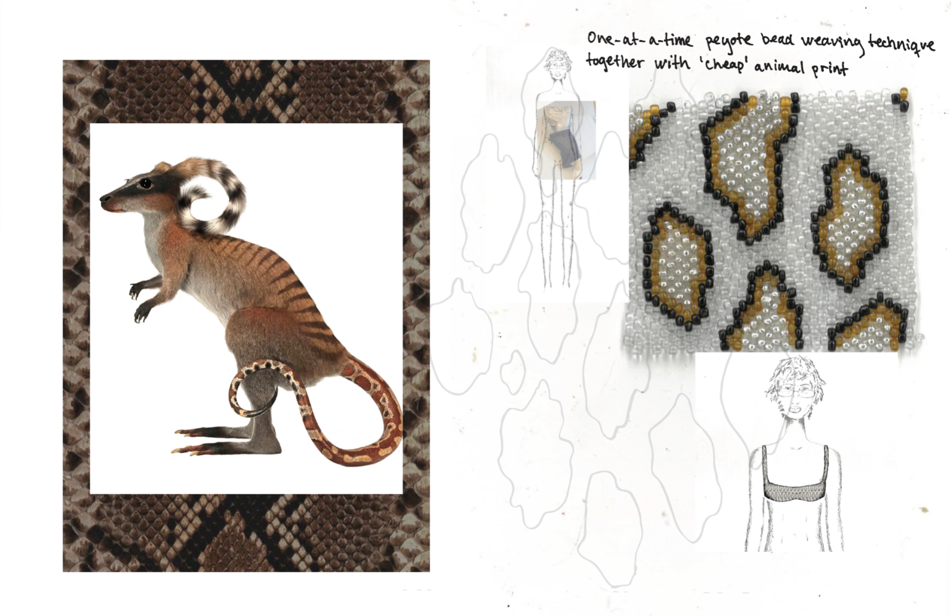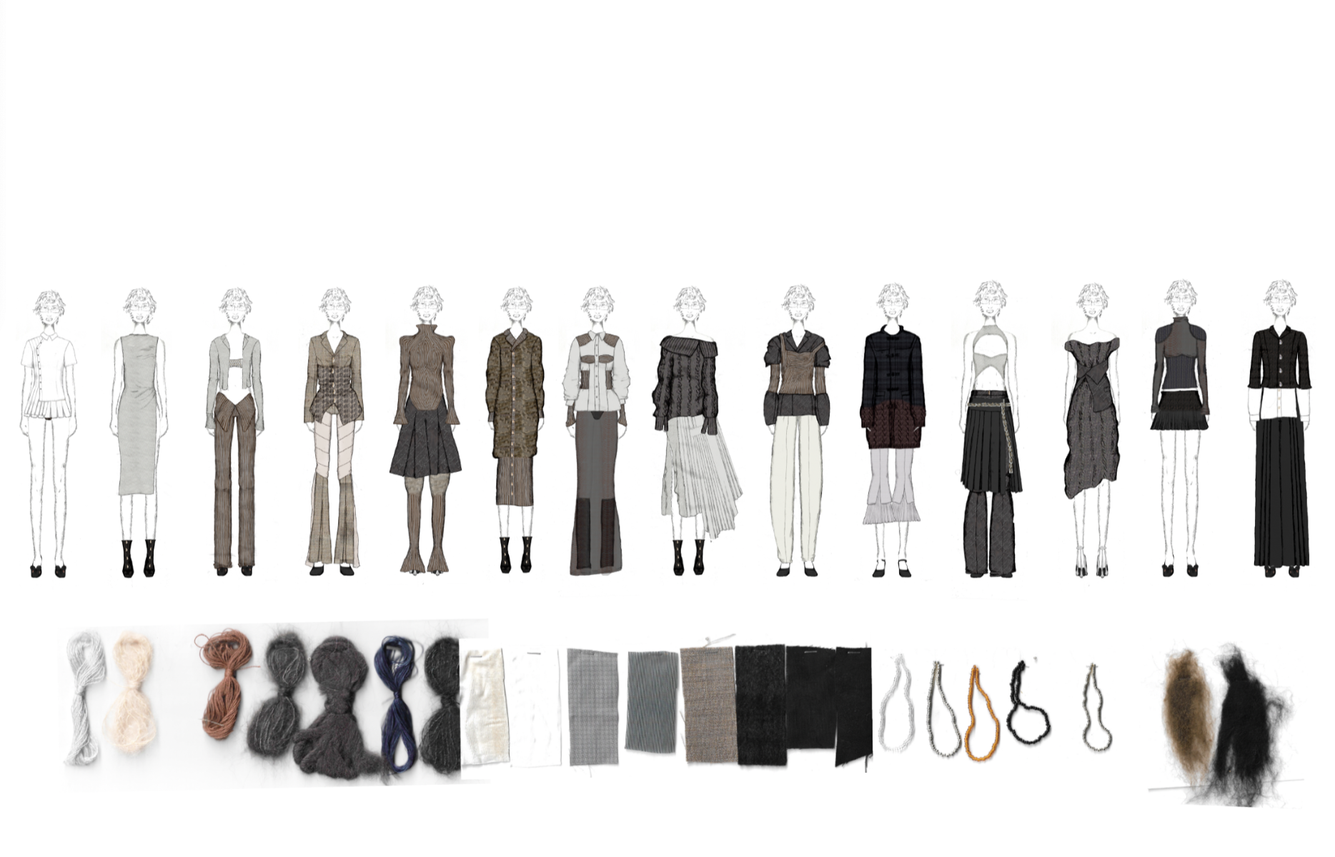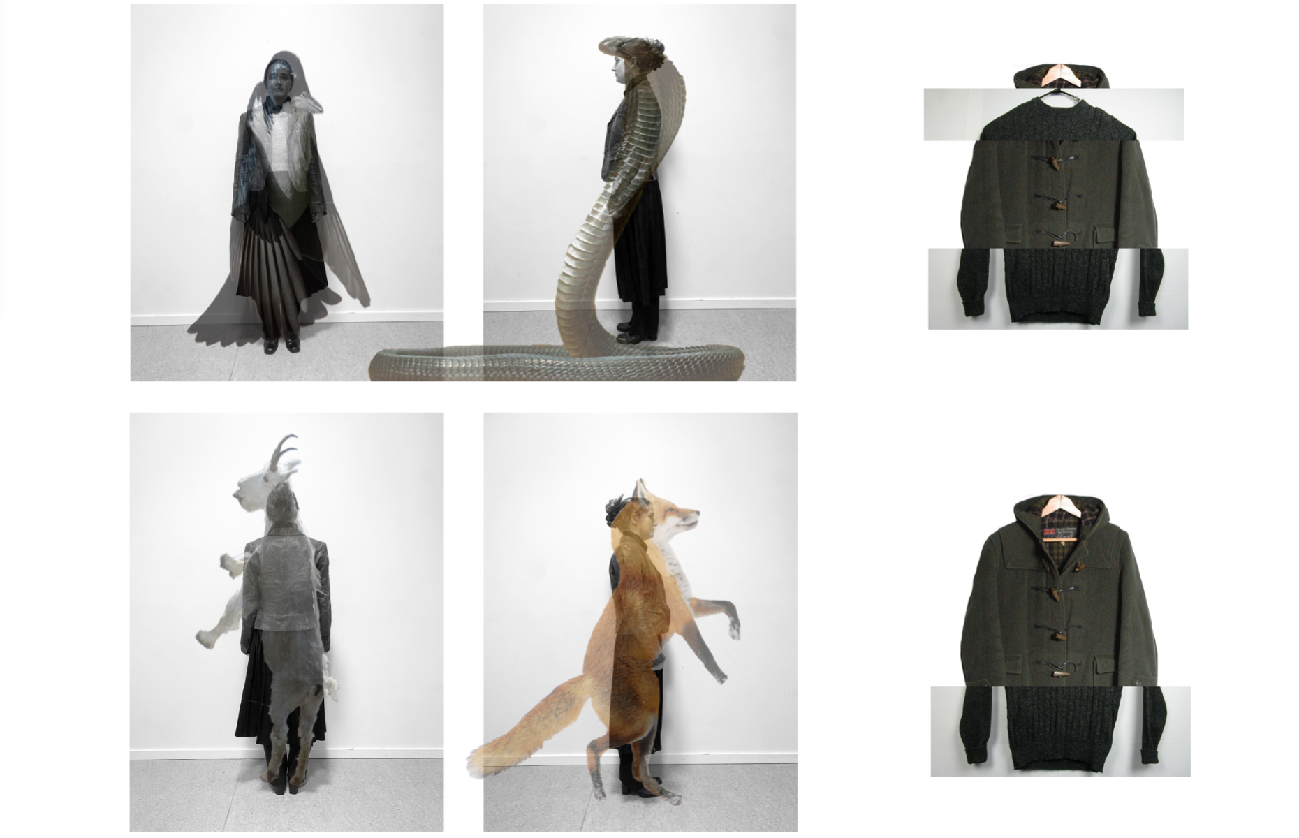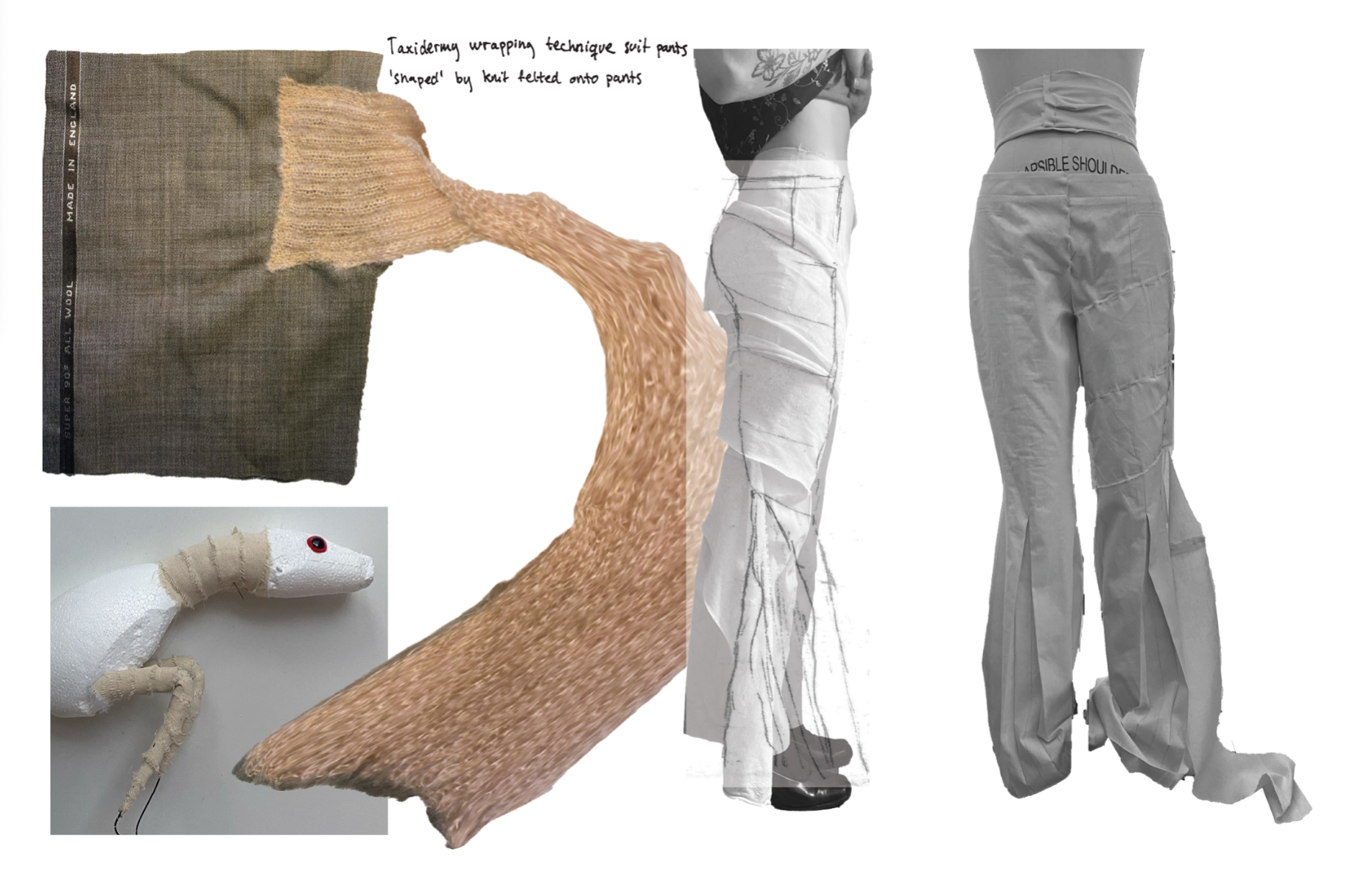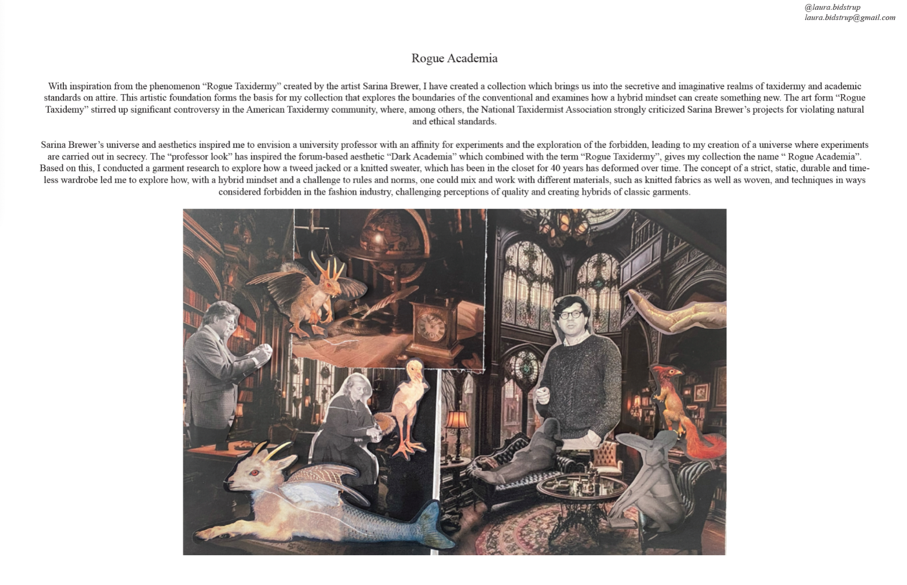 "Rogue Academia" is a collection inspired by Sarina Brewer's controversial "Rogue Taxidermy," blending traditional academic attire with experimental, hybrid aesthetics. The collection explores unconventional materials and techniques to challenge norms and perceptions of quality in fashion. It aims to push the boundaries of the academic wardrobe by merging classic styles with innovative, rule-breaking elements.