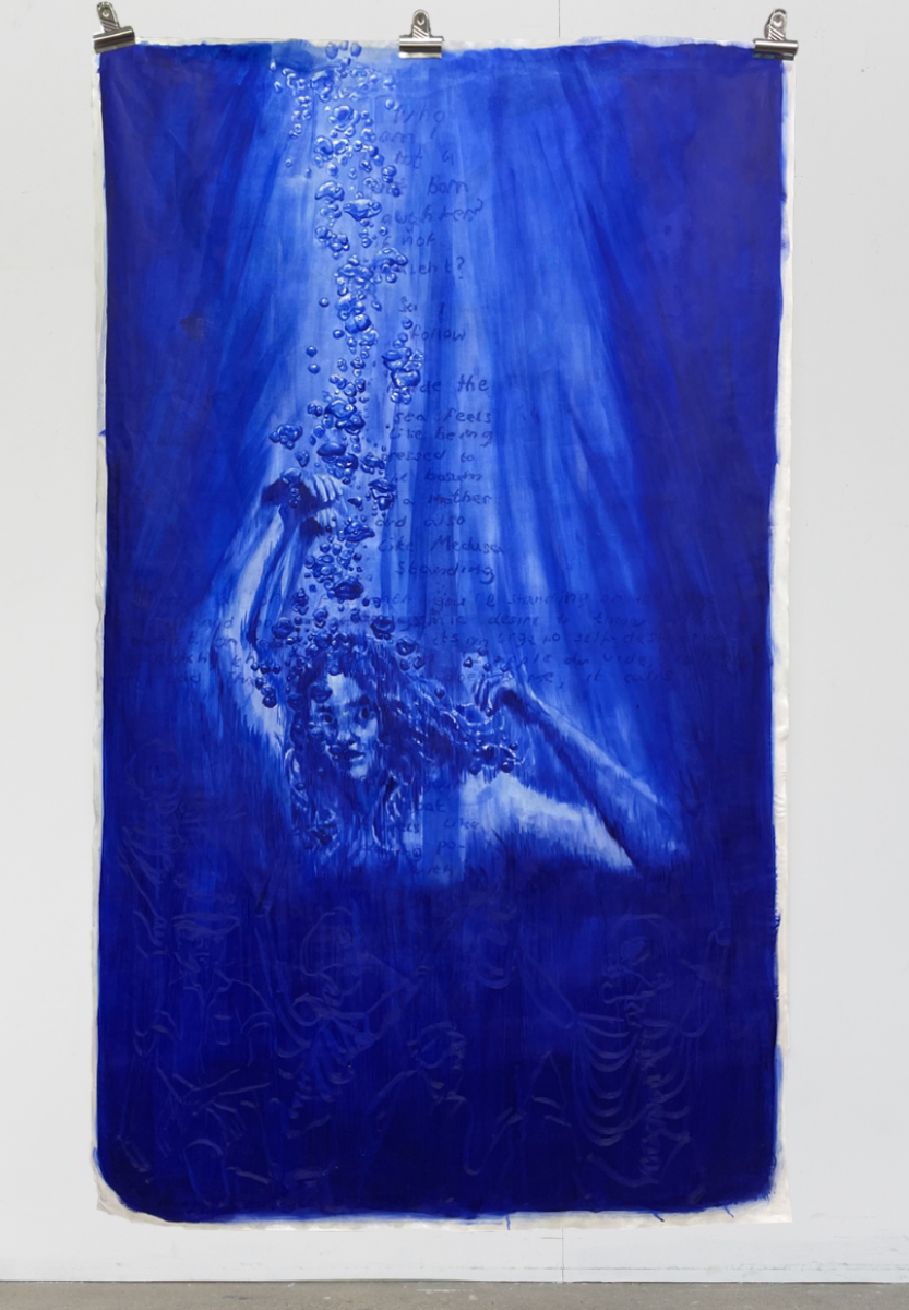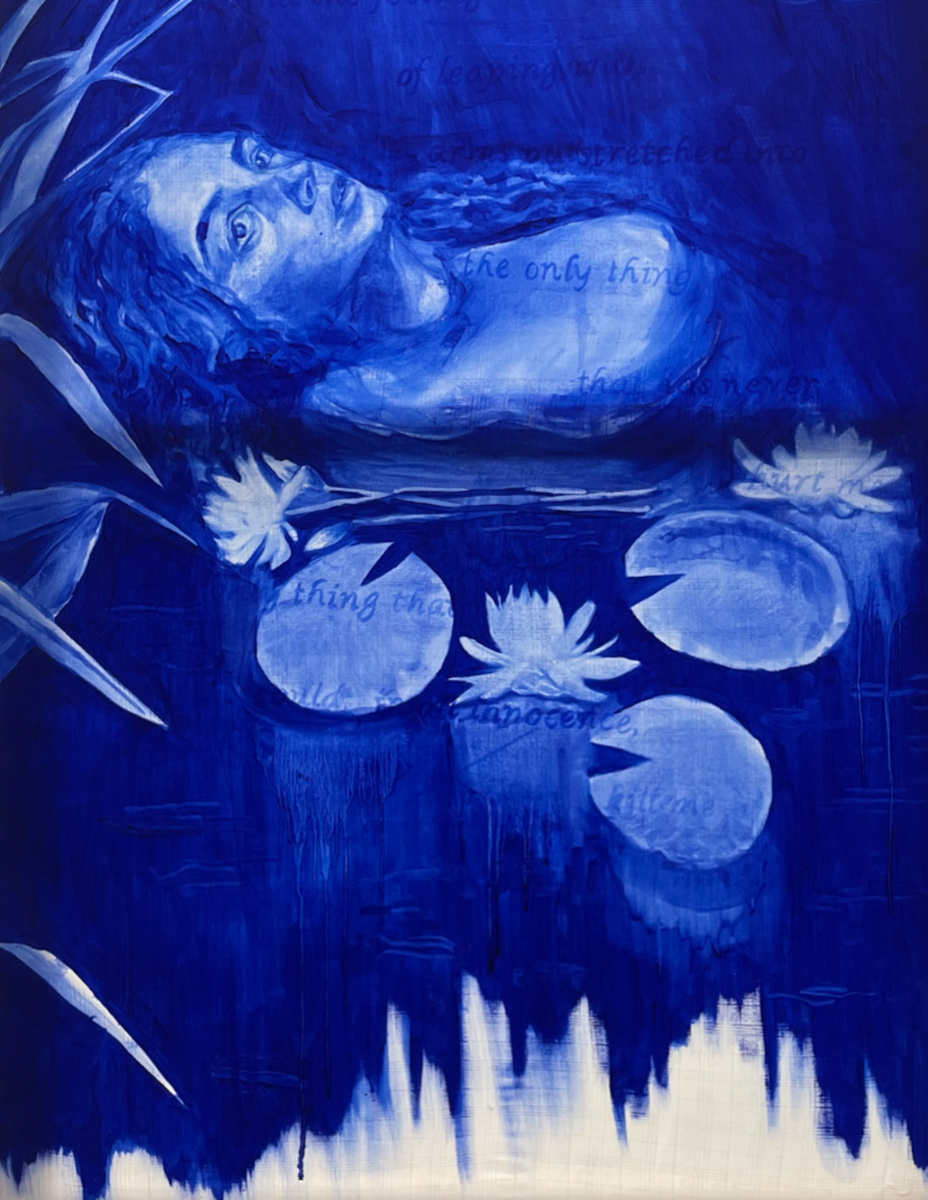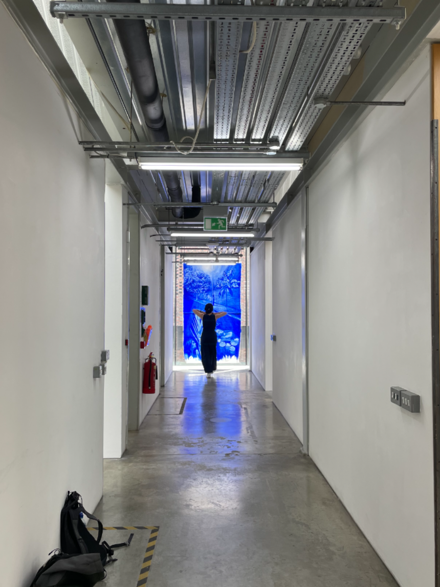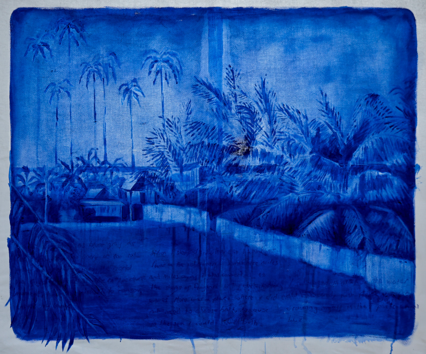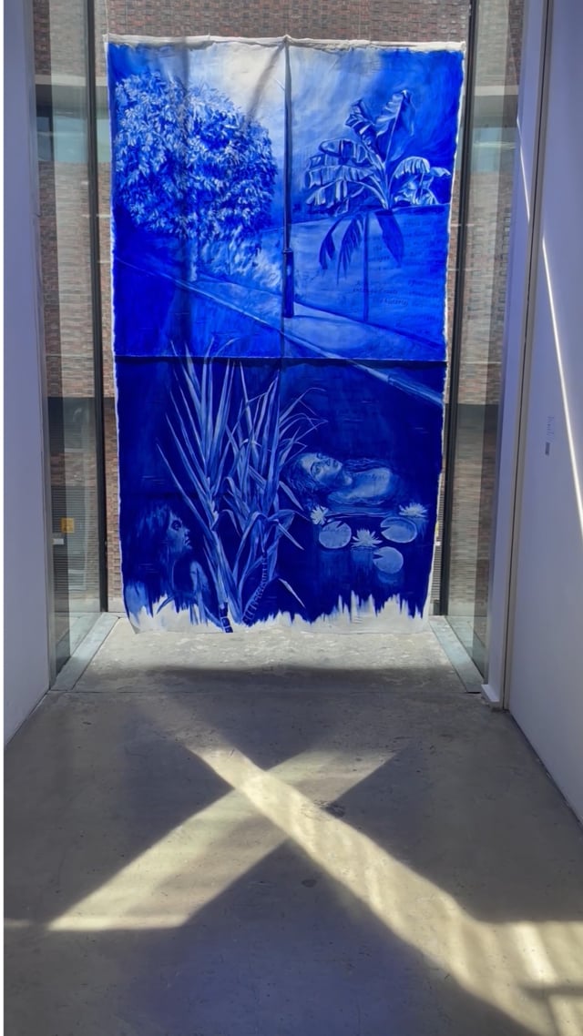 My practice explores an imagined world between Guyana and the UK. Referencing how the sea itself shapes the Caribbean diasporic experience, I use ultramarine blue to signify the legacy of colonialism. Beyond this, I empower Guyanese folklore and subvert the Gothic lens to understand colonialism as an agent of haunting. The final outcomes of the project were painted on sugarcane fabric, recalling my family history in indentured labour. The sugarcane fabric is translucent, allowing words painted on the back of the fabric to appear in natural light. In this way the fabric itself becomes a magical object with its own changing environment. In this body of work plants are used to symbolise the diasporic relationship to homeland. I also use self portraiture to embody myself in my own imagined world.