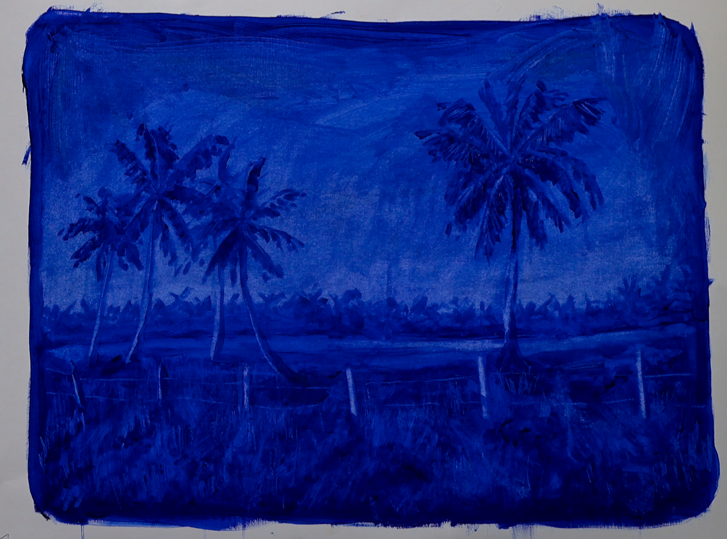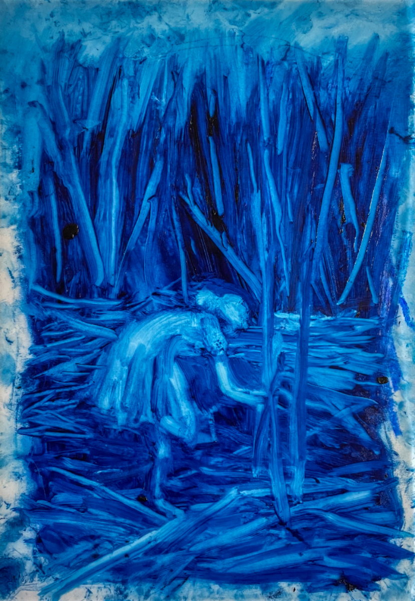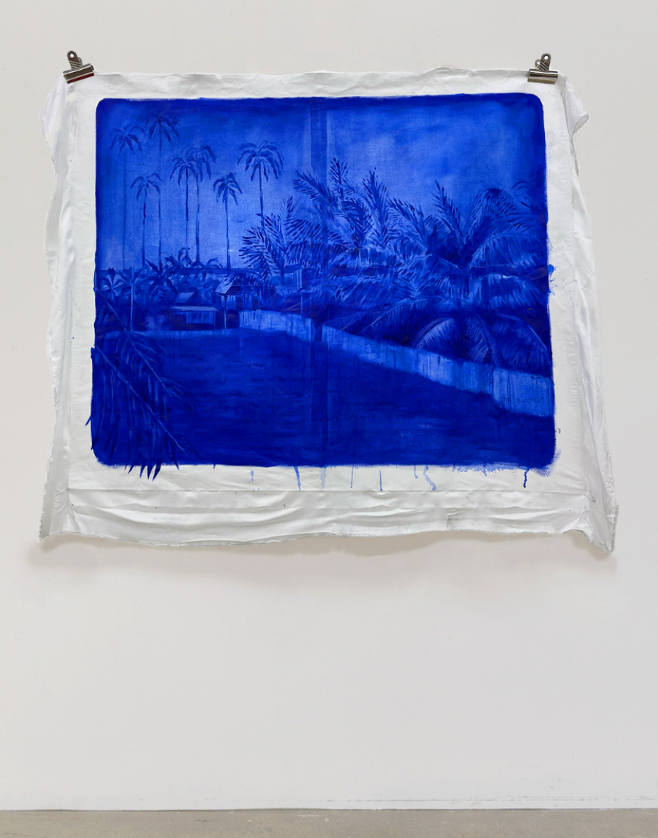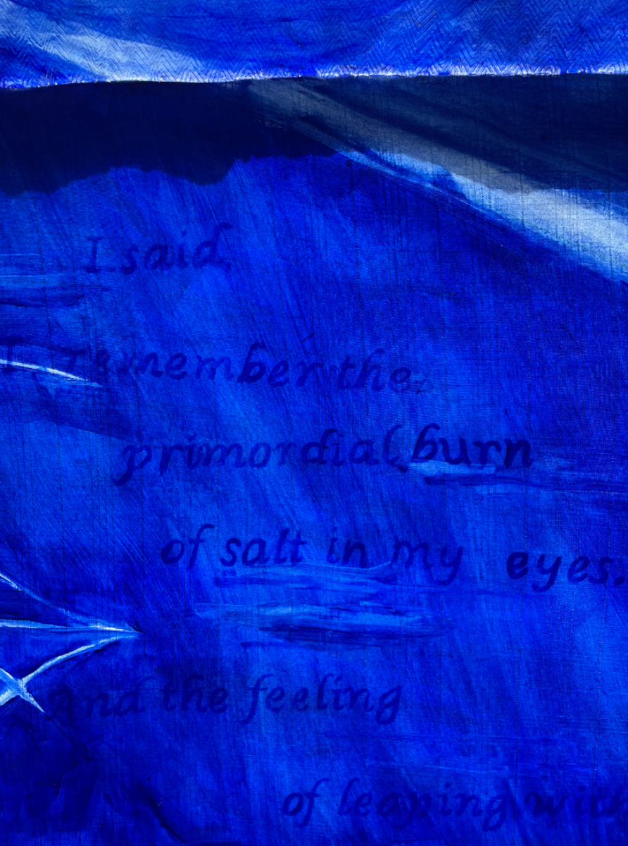 My practice explores an imagined world between Guyana and the UK. Referencing how the sea itself shapes the Caribbean diasporic experience, I use ultramarine blue to signify the legacy of colonialism. Beyond this, I empower Guyanese folklore and subvert the Gothic lens to understand colonialism as an agent of haunting. The final outcomes of the project were painted on sugarcane fabric, recalling my family history in indentured labour. The sugarcane fabric is translucent, allowing words painted on the back of the fabric to appear in natural light. In this way the fabric itself becomes a magical object with its own changing environment. In this body of work plants are used to symbolise the diasporic relationship to homeland. I also use self portraiture to embody myself in my own imagined world.