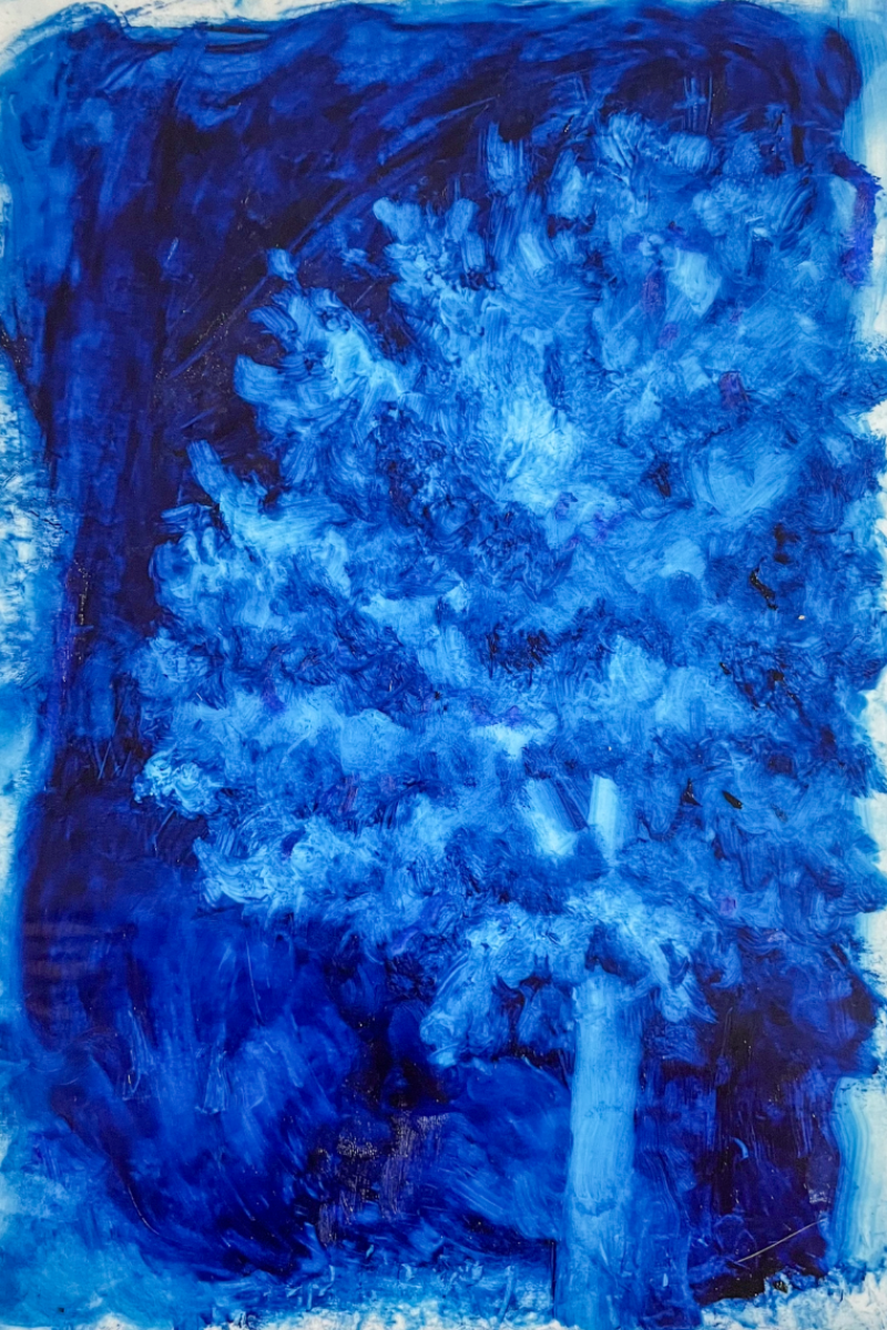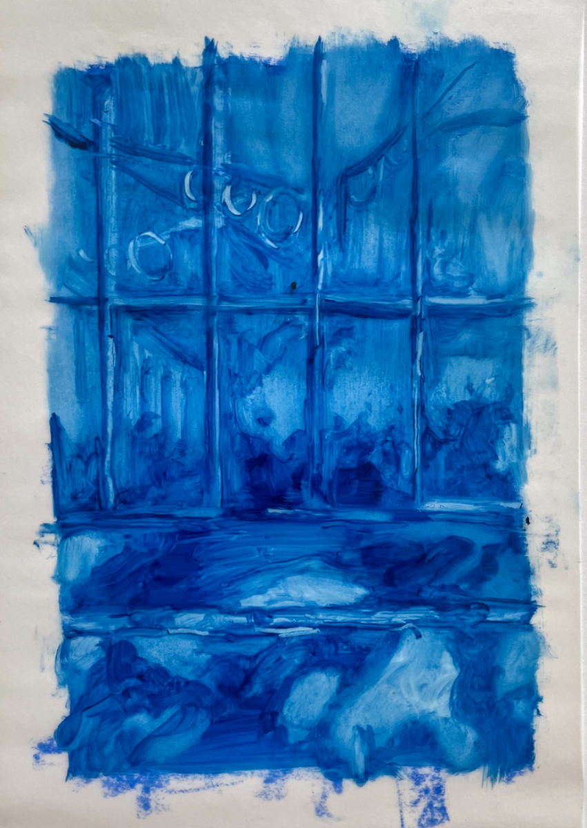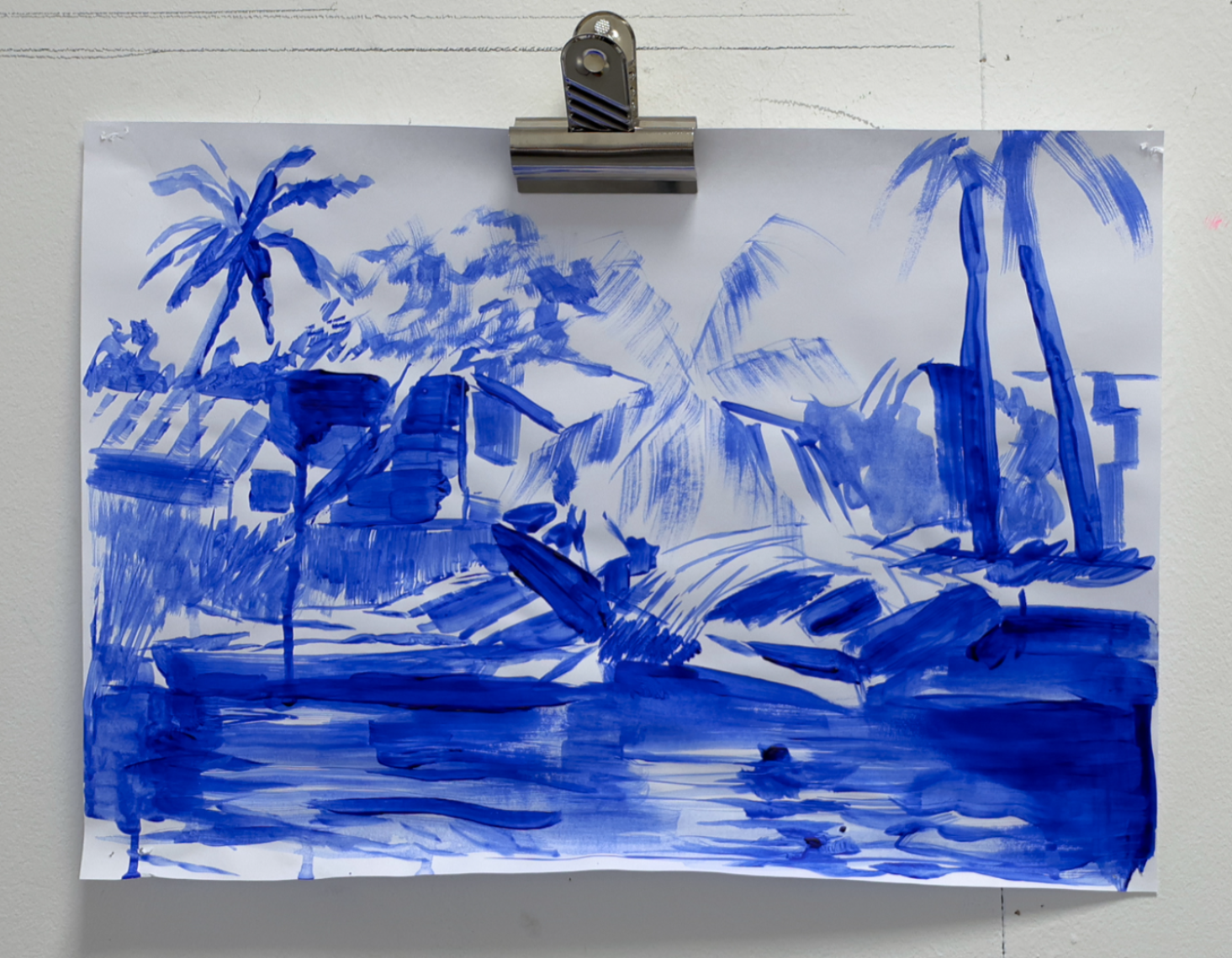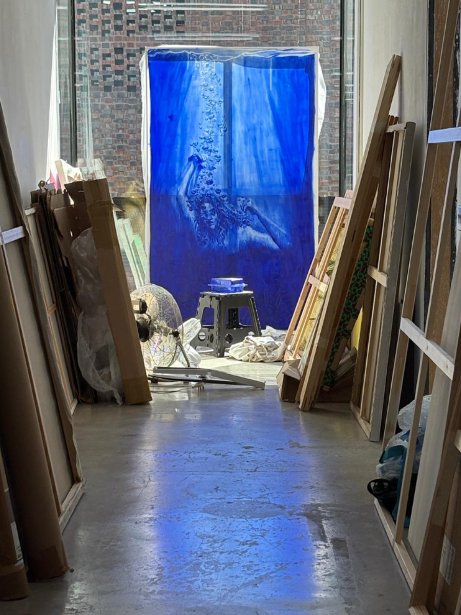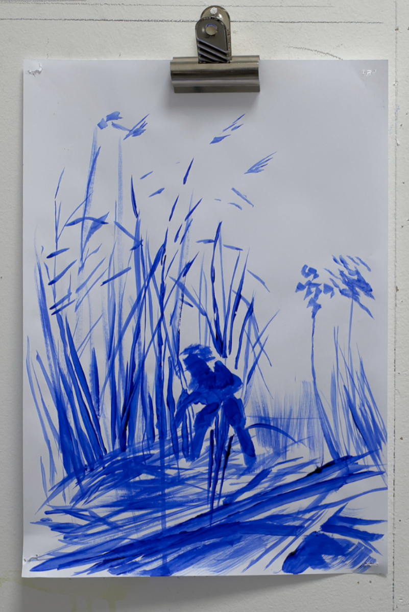 My practice explores an imagined world between Guyana and the UK. Referencing how the sea itself shapes the Caribbean diasporic experience, I use ultramarine blue to signify the legacy of colonialism. Beyond this, I empower Guyanese folklore and subvert the Gothic lens to understand colonialism as an agent of haunting. The final outcomes of the project were painted on sugarcane fabric, recalling my family history in indentured labour. The sugarcane fabric is translucent, allowing words painted on the back of the fabric to appear in natural light. In this way the fabric itself becomes a magical object with its own changing environment. In this body of work plants are used to symbolise the diasporic relationship to homeland. I also use self portraiture to embody myself in my own imagined world.