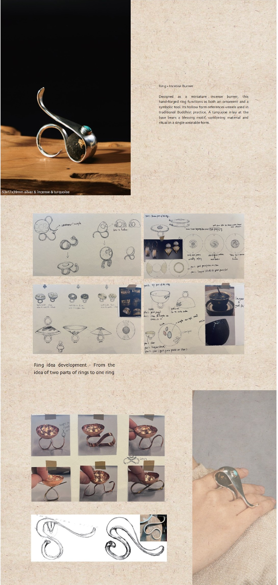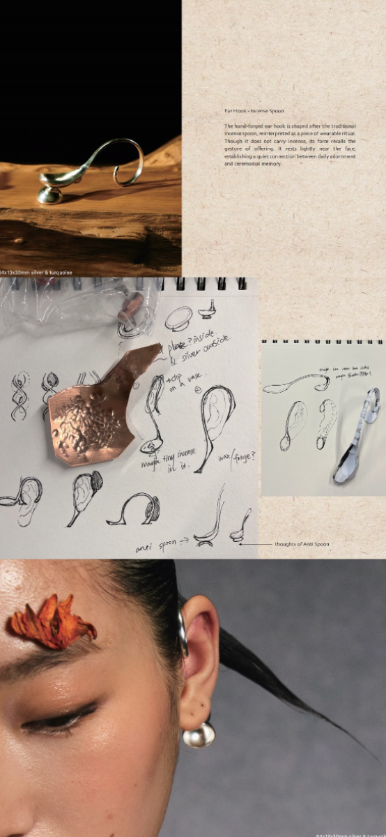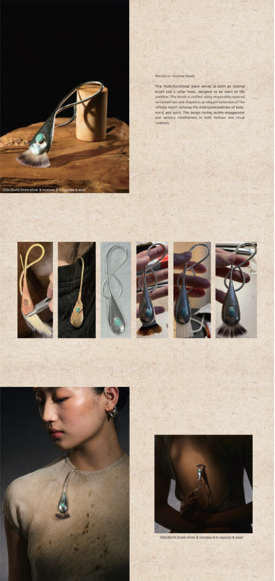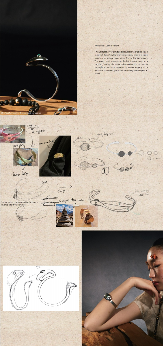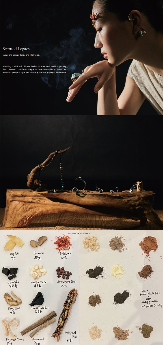 This collection merges traditional Chinese herbal incense with contemporary fashion jewelry, transforming fragrance into a form of wearable art. Each incense bead is meticulously crafted using ancient herbal formulas, embodying the essence of centuries-old traditions. Each piece becomes a living object that not only elevates personal style but also creates a sensory aesthetic space, infused with Oriental beauty. Creating Scented Legacy has been one of the most intimate and transformative experiences of my design journey. This collection was born not just from an artistic impulse, but from a deeply personal period in my life—a moment where fear, responsibility, and emotional fragility converged. As I cared for my hospitalized family and maintained the neglected Buddhist shrine at home, I was unexpectedly introduced to a quiet ritualistic world that offered me solace and healing.