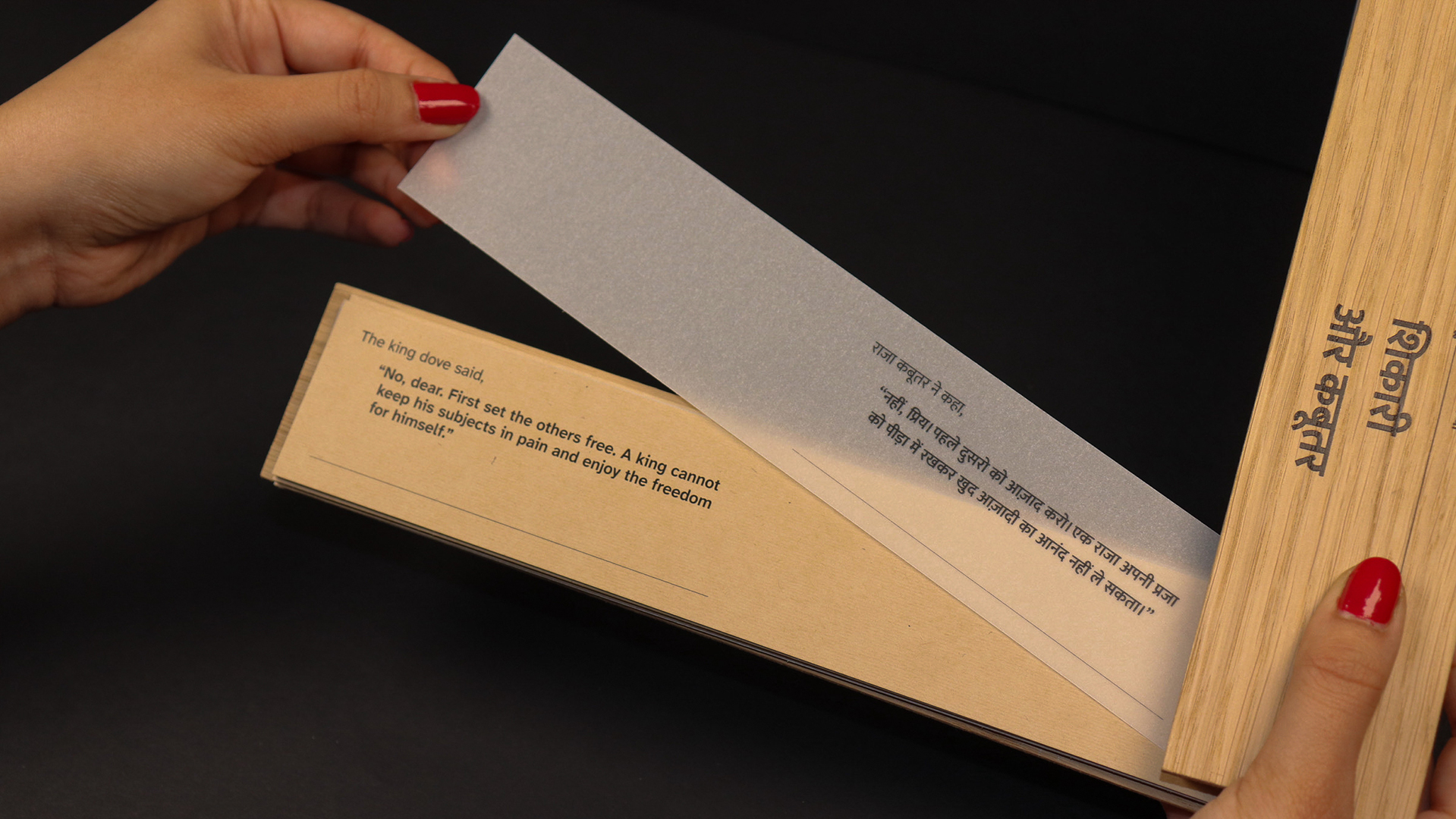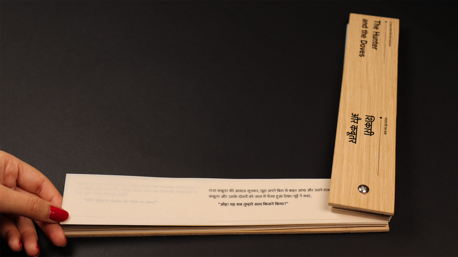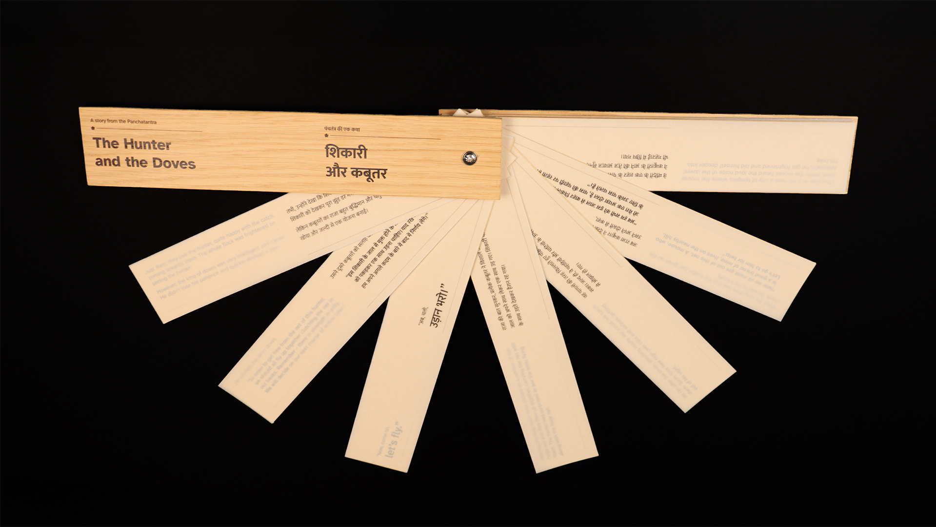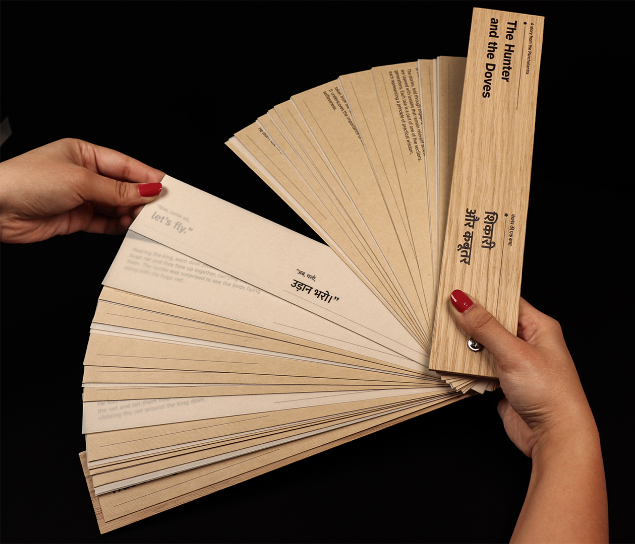 The Hunter and the Doves is an ISTD-accredited bilingual children’s book that bridges tradition and modern reading. Handcrafted with wooden covers and inspired by ancient Indian palm leaf manuscripts, it offers a tactile, interactive format for 21st-century readers. English text appears on earthy brown paper (left) and Hindi on transparent overlays (right), inviting children to shift between languages with curiosity. This gradual, playful approach to language learning preserves cultural heritage through a timeless folktale from the Panchatantra, a classic collection of Indian folktales known for imparting moral lessons across generations, creating an inclusive, accessible, and meaningful reading experience.