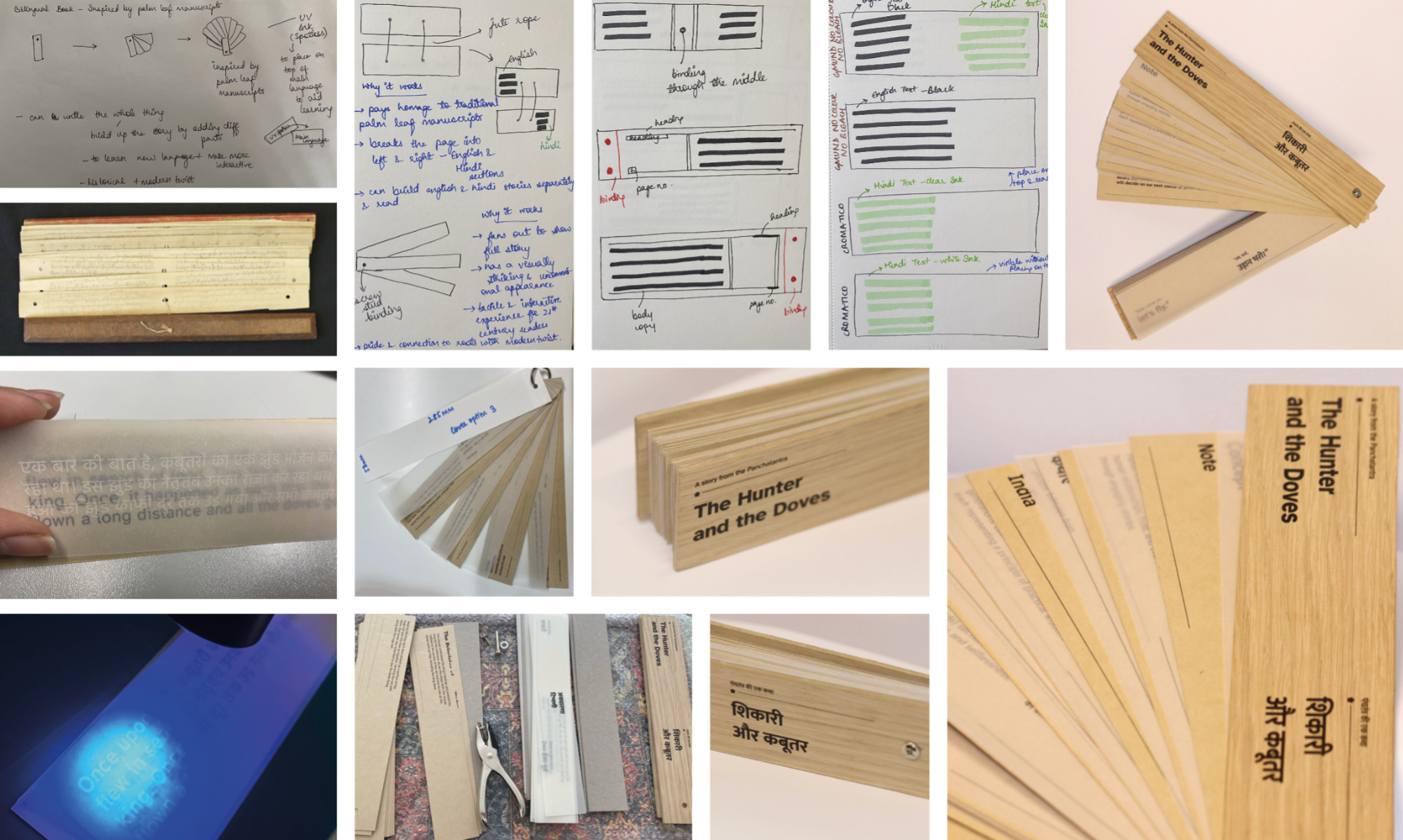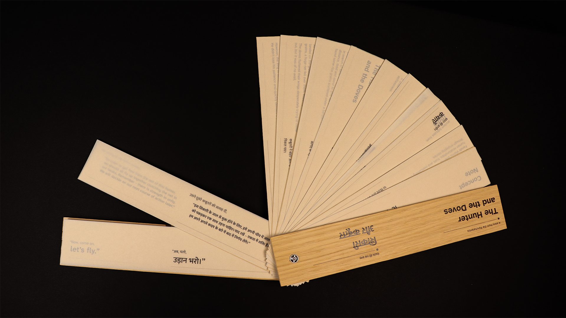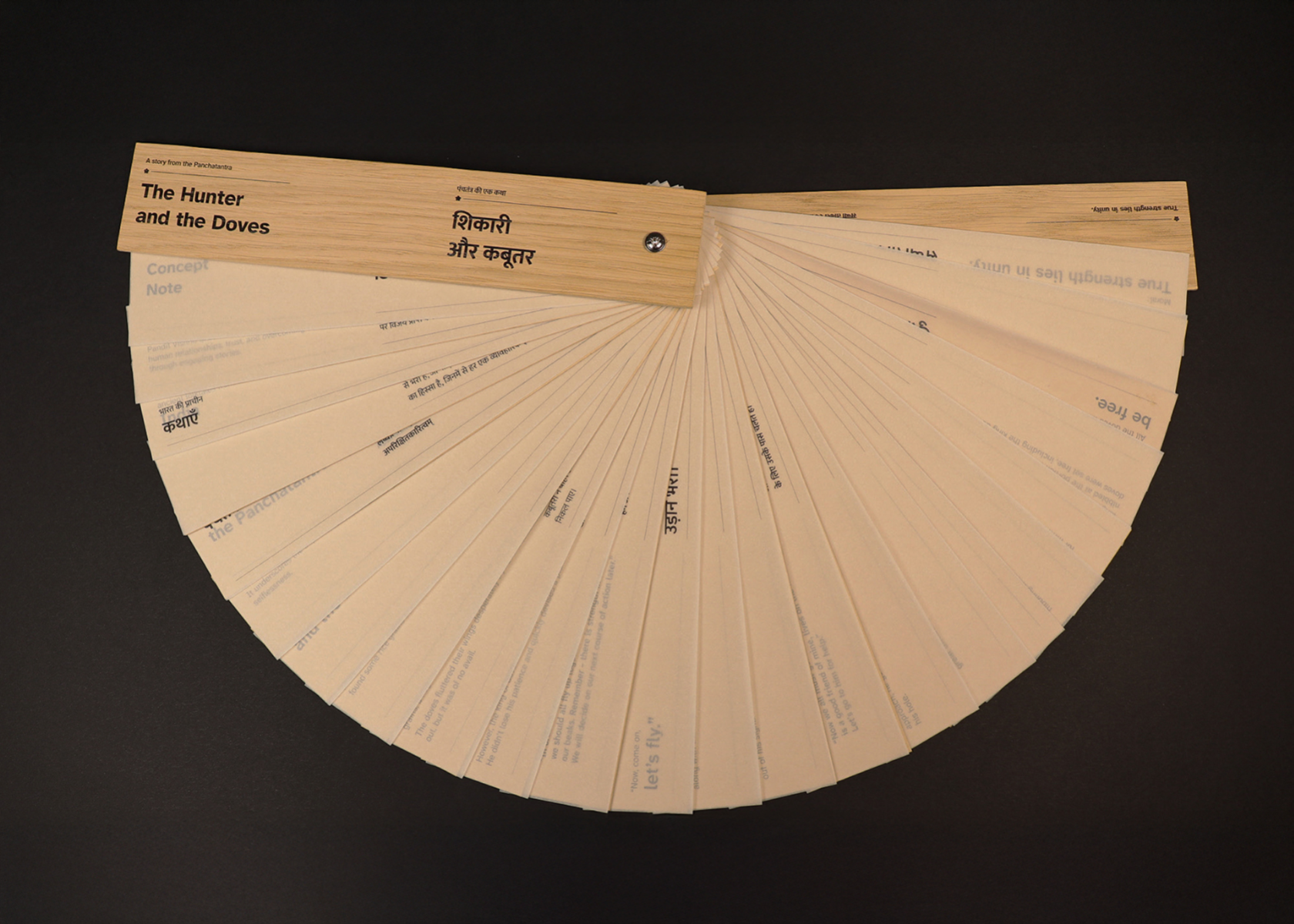 The Hunter and the Doves is an ISTD-accredited bilingual children’s book that bridges tradition and modern reading. Handcrafted with wooden covers and inspired by ancient Indian palm leaf manuscripts, it offers a tactile, interactive format for 21st-century readers. English text appears on earthy brown paper (left) and Hindi on transparent overlays (right), inviting children to shift between languages with curiosity. This gradual, playful approach to language learning preserves cultural heritage through a timeless folktale from the Panchatantra, a classic collection of Indian folktales known for imparting moral lessons across generations, creating an inclusive, accessible, and meaningful reading experience.