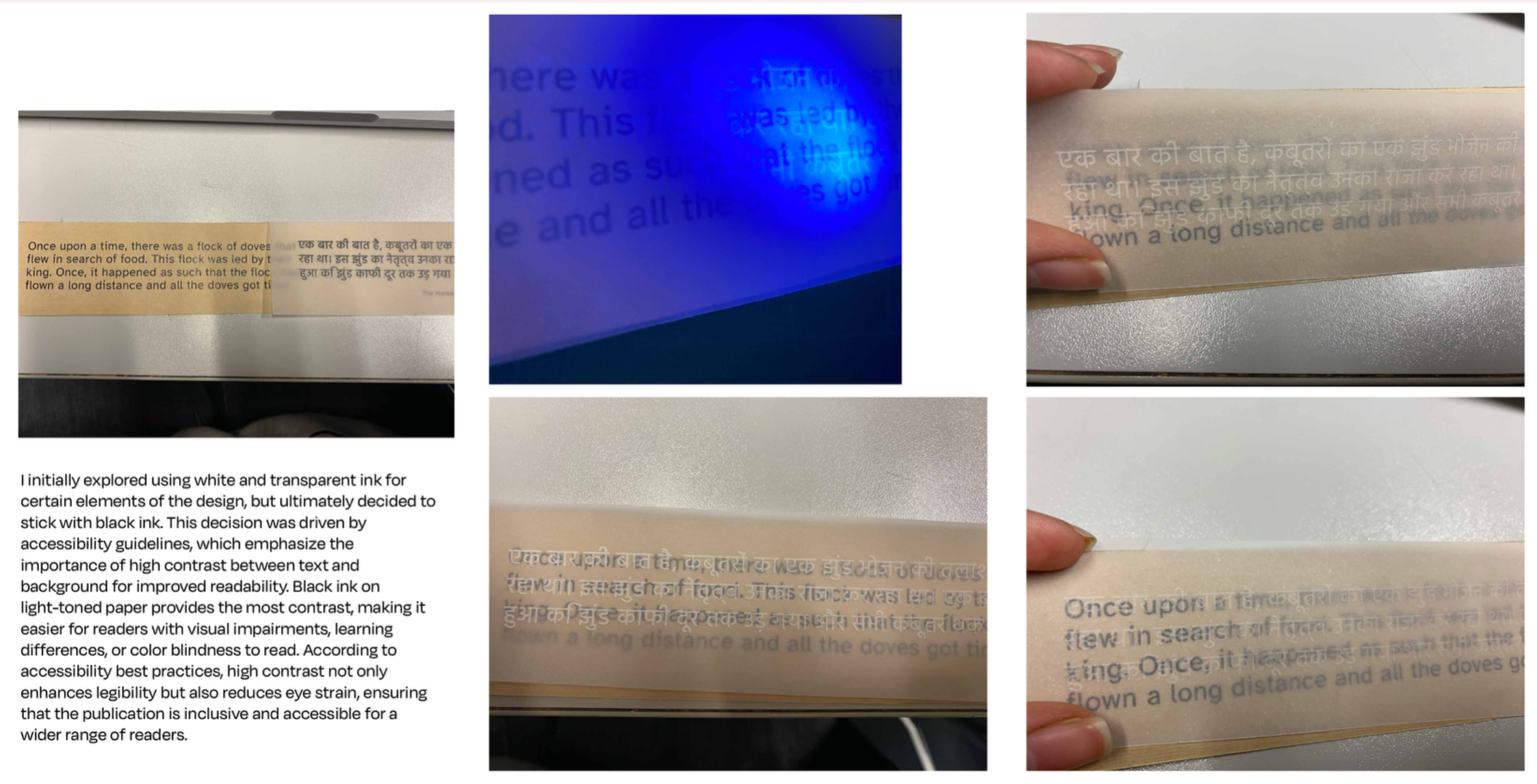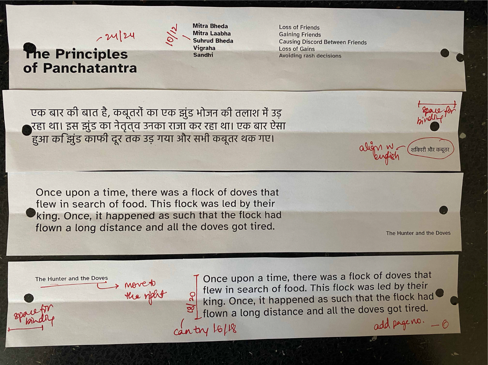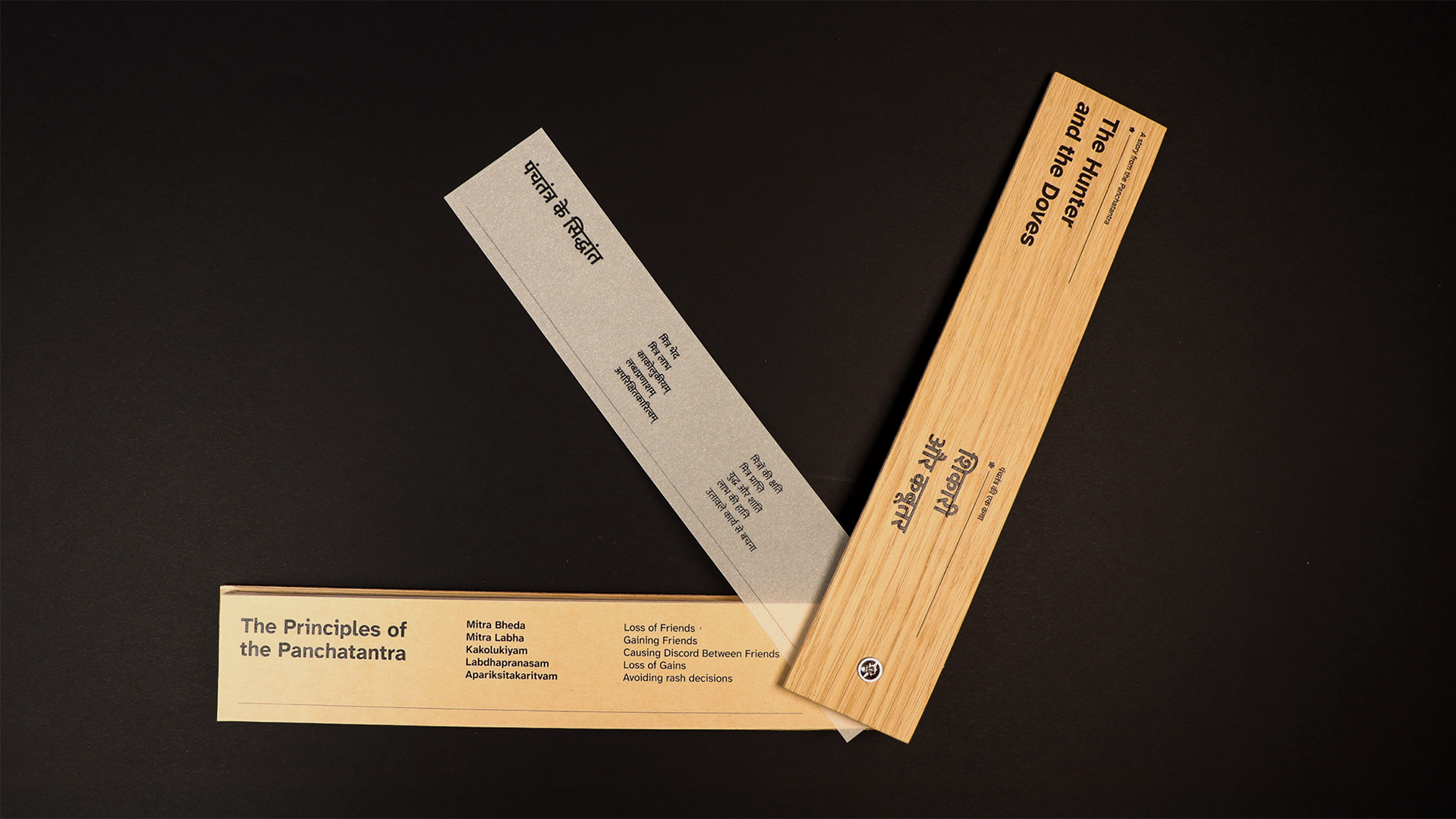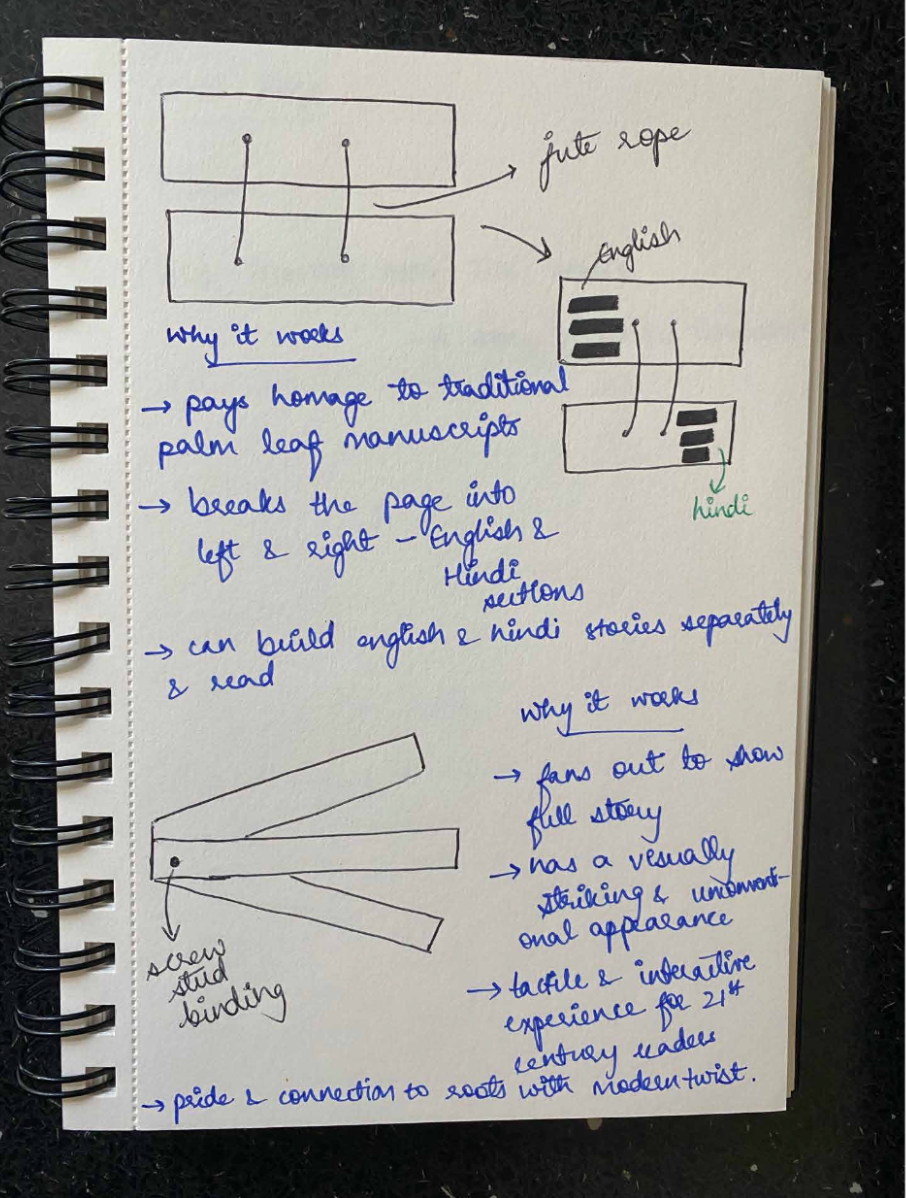 The Hunter and the Doves is an ISTD-accredited bilingual children’s book that bridges tradition and modern reading. Handcrafted with wooden covers and inspired by ancient Indian palm leaf manuscripts, it offers a tactile, interactive format for 21st-century readers. English text appears on earthy brown paper (left) and Hindi on transparent overlays (right), inviting children to shift between languages with curiosity. This gradual, playful approach to language learning preserves cultural heritage through a timeless folktale from the Panchatantra, a classic collection of Indian folktales known for imparting moral lessons across generations, creating an inclusive, accessible, and meaningful reading experience.