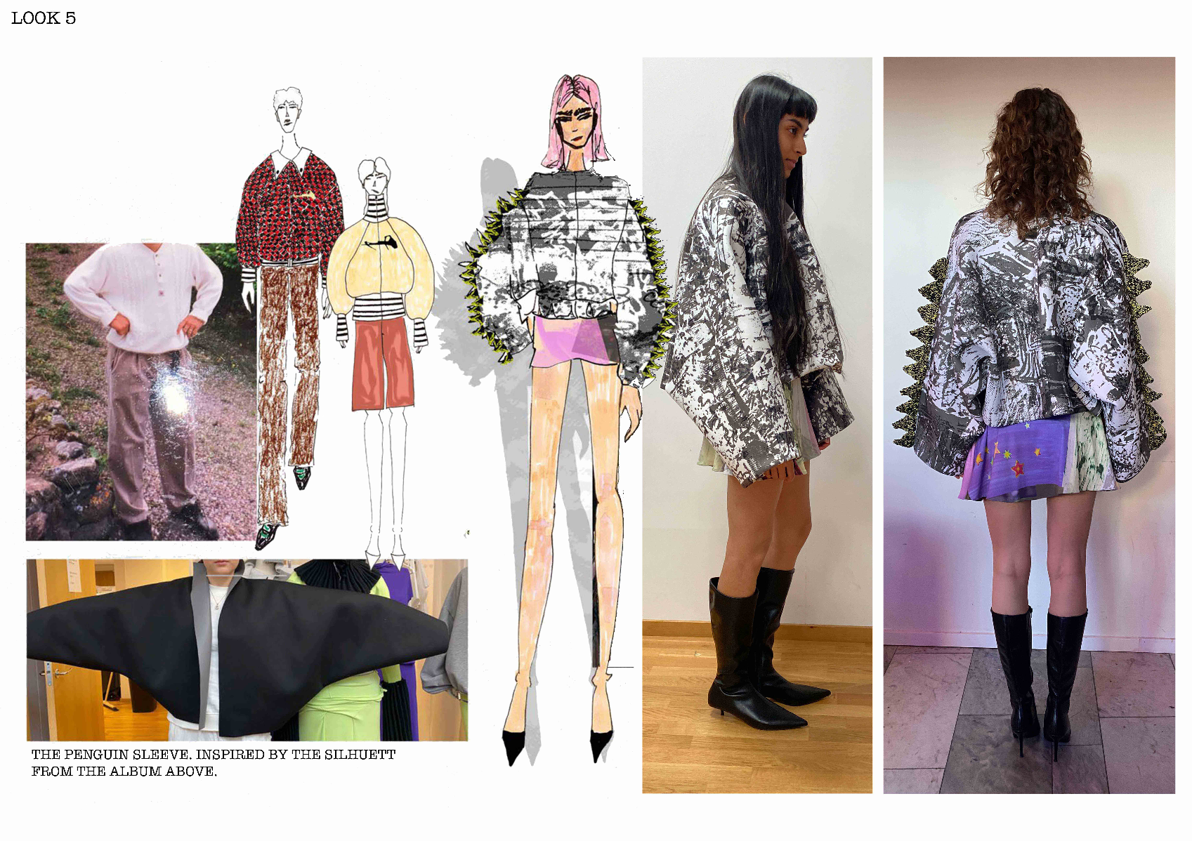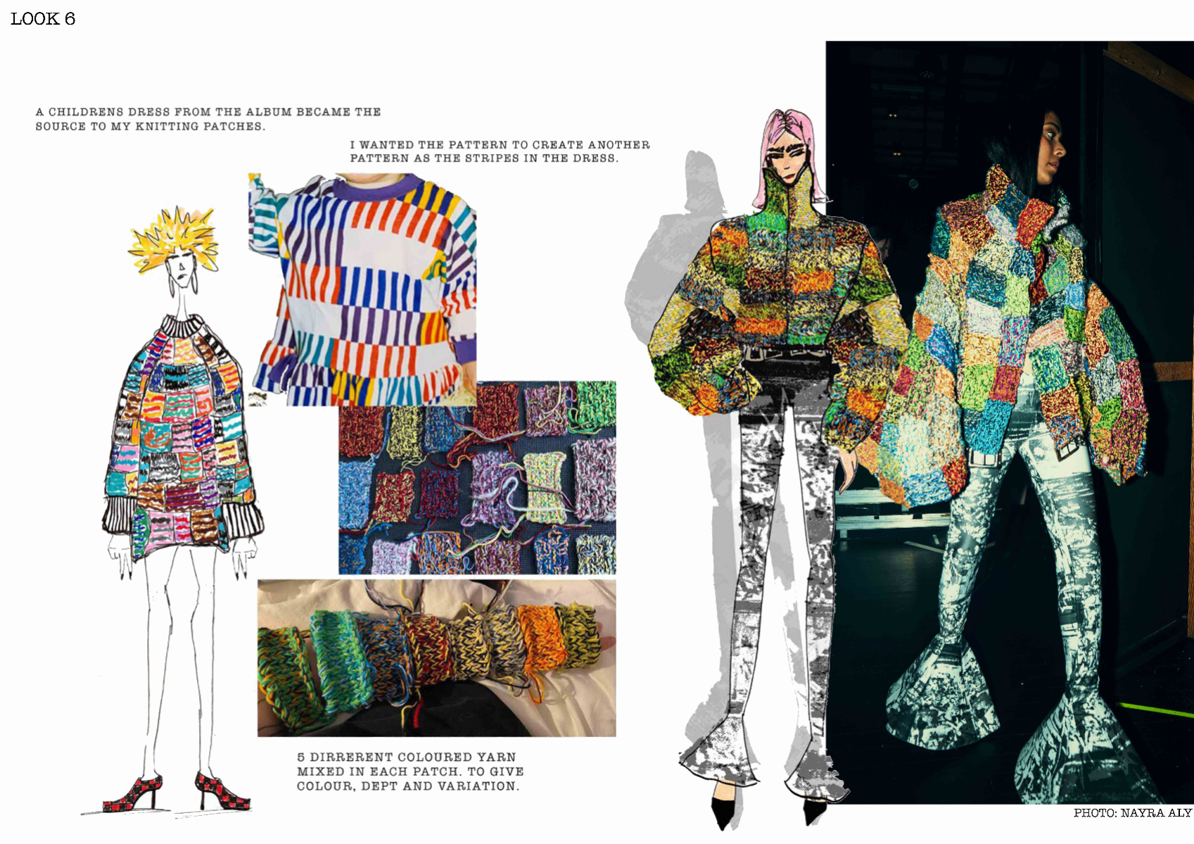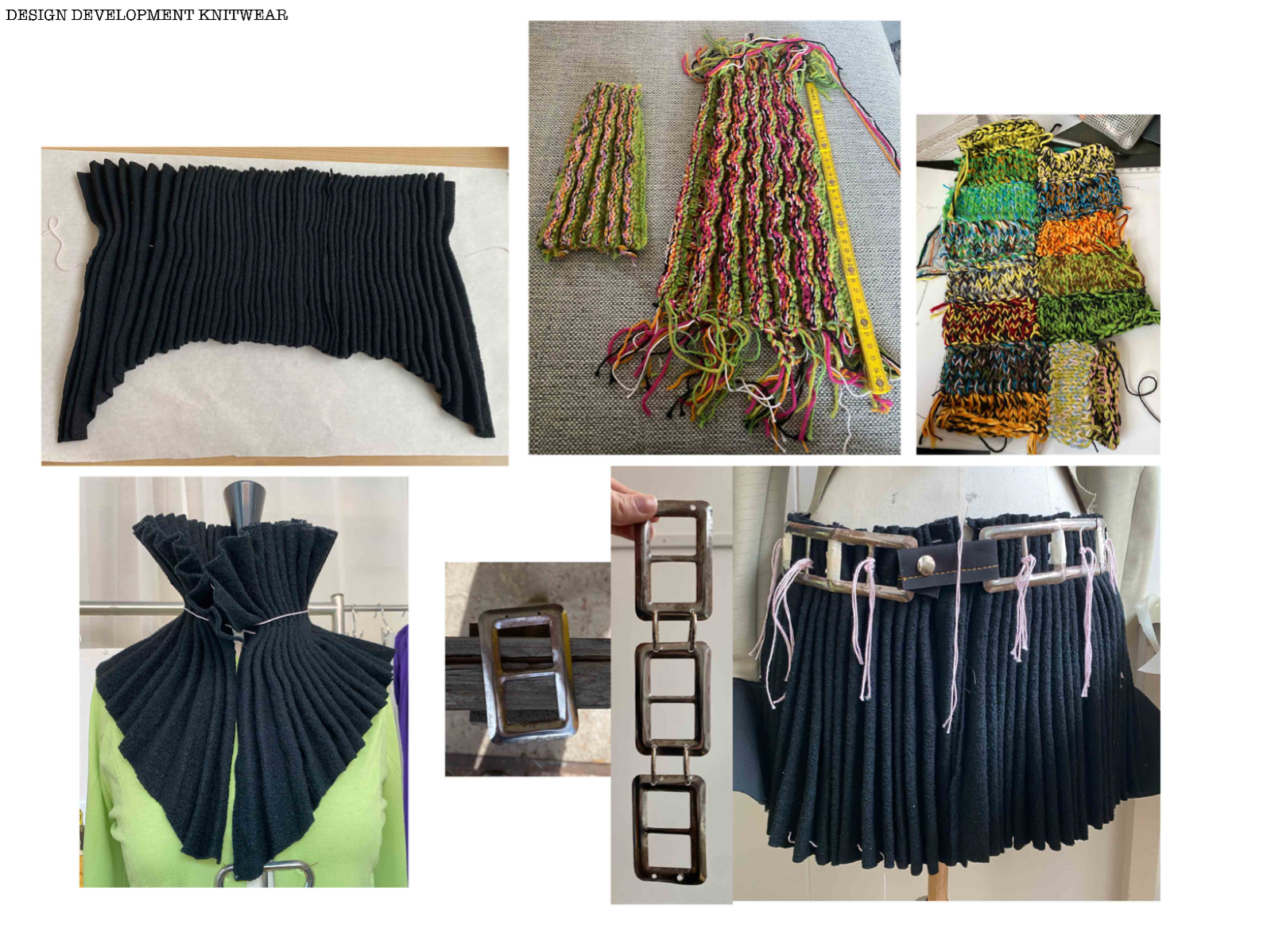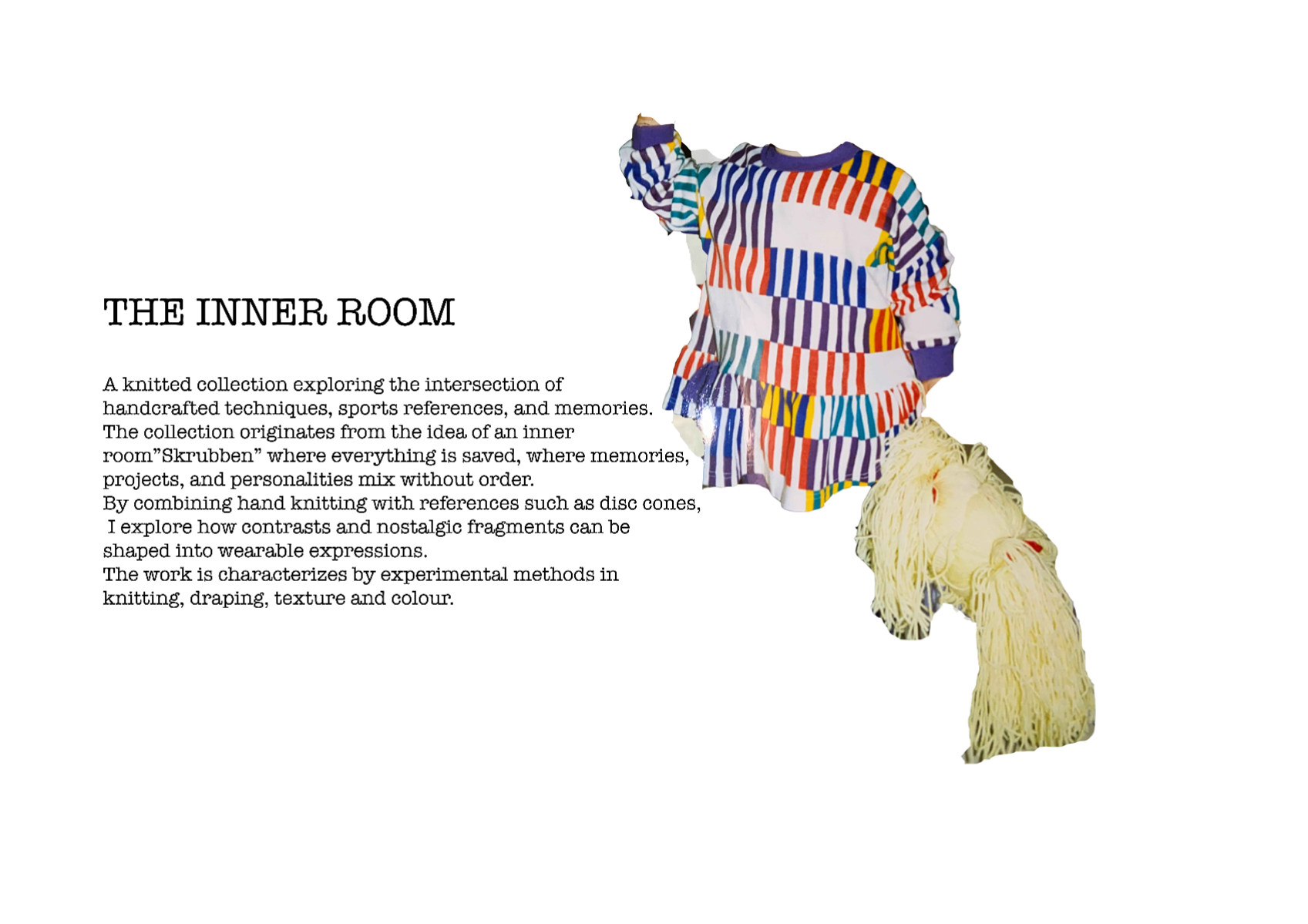 A knitted collection exploring the intersection of handcrafted techniques, sports references, and memories. The collection originates from the idea of an inner room”Skrubben” where everything is saved, where memories, projects, and personalities mix without order. By combining hand knitting with references such as disc cones, I explore how contrasts and nostalgic fragments can be shaped into wearable expressions. The work is characterizes by experimental methods in knitting, draping, texture and colour.