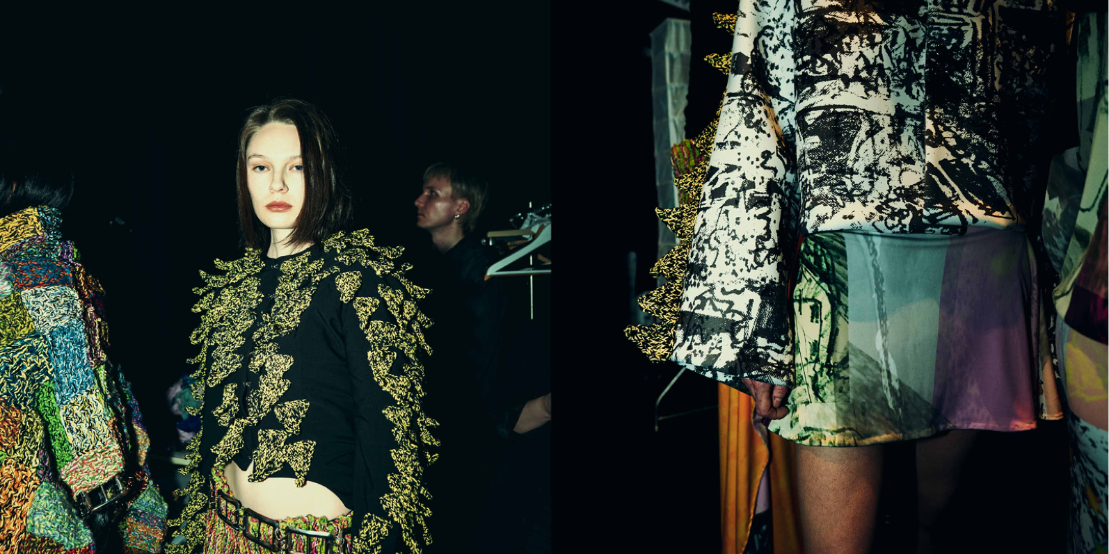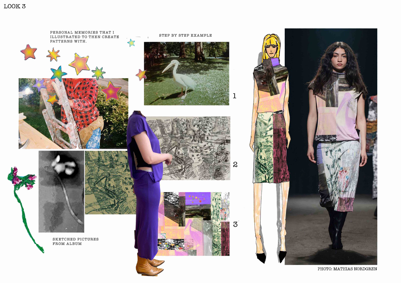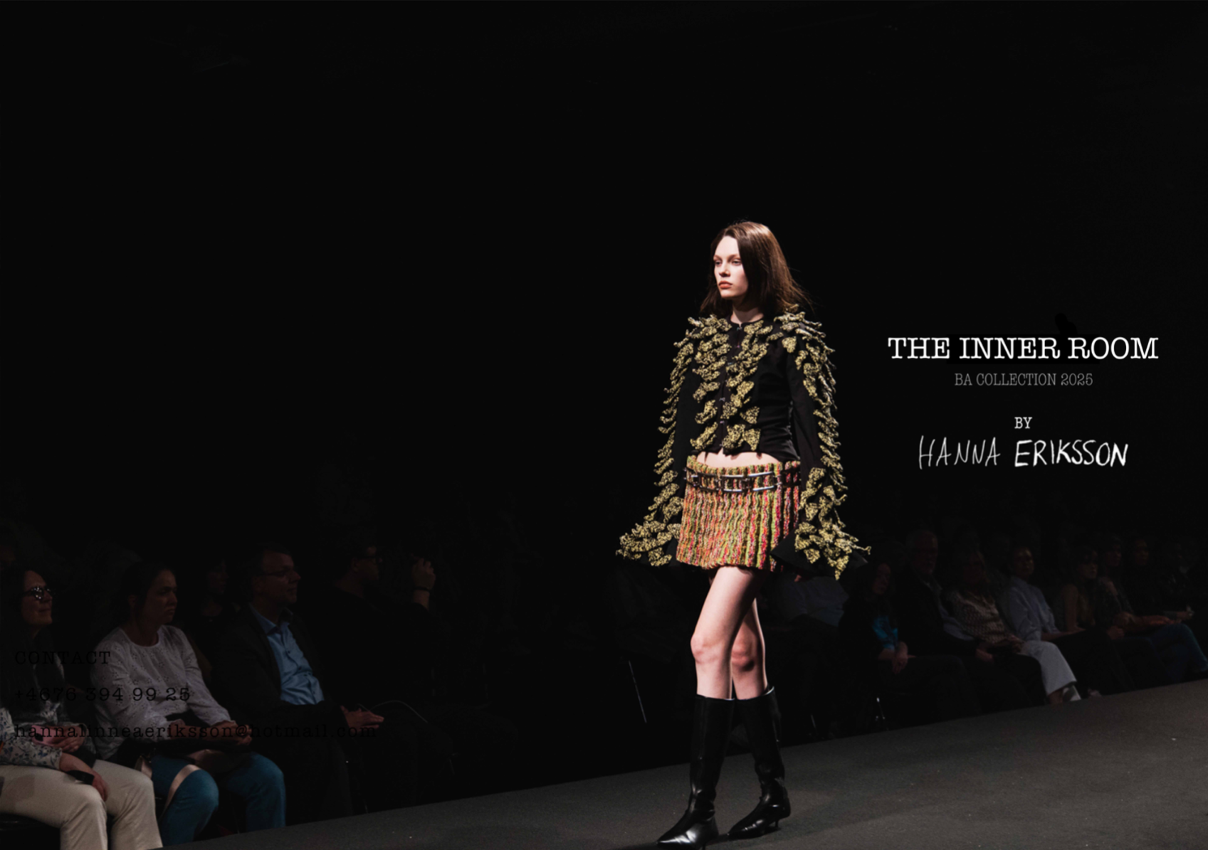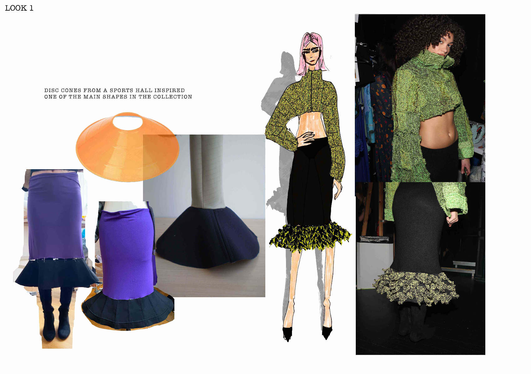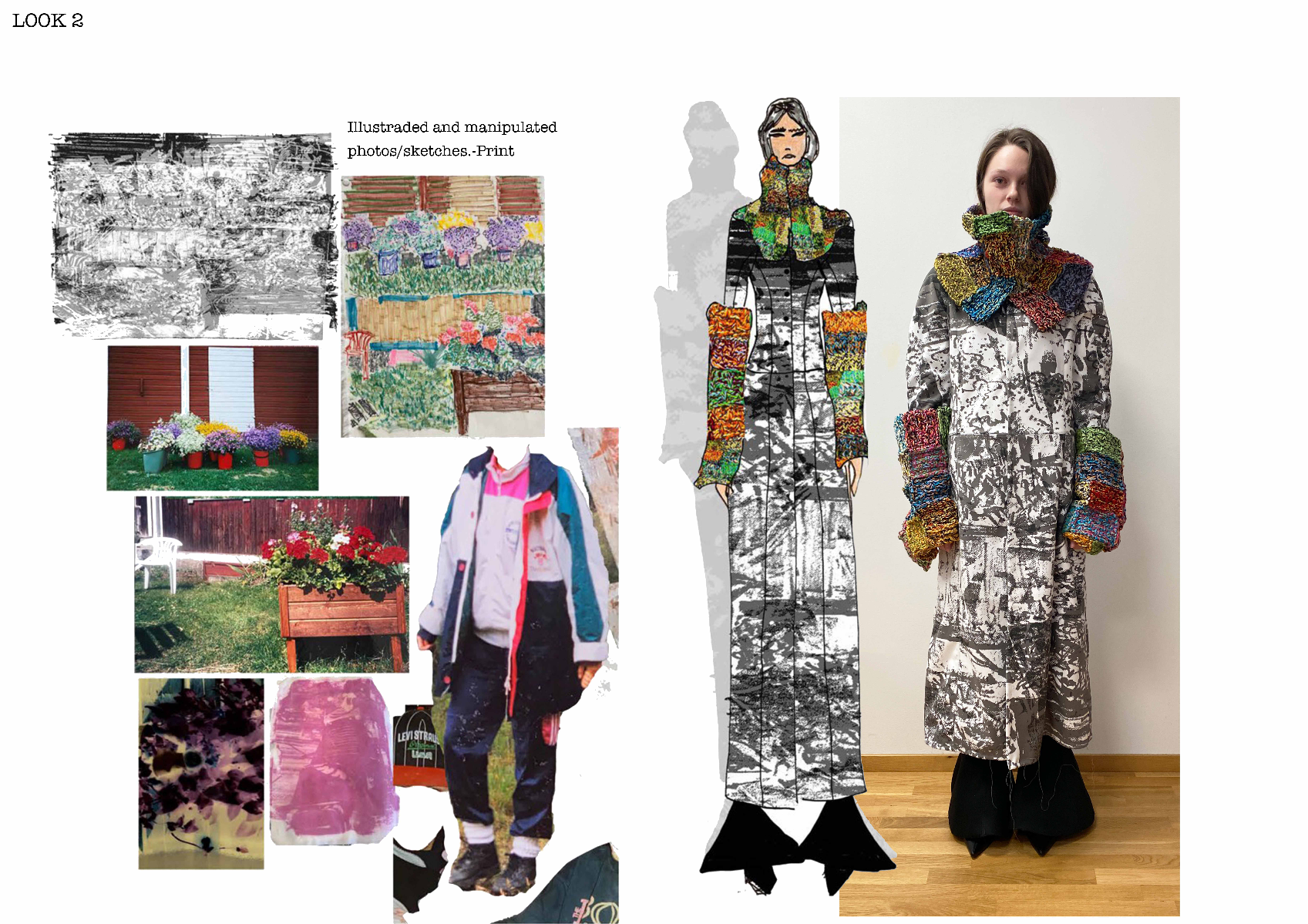 A knitted collection exploring the intersection of handcrafted techniques, sports references, and memories. The collection originates from the idea of an inner room”Skrubben” where everything is saved, where memories, projects, and personalities mix without order. By combining hand knitting with references such as disc cones, I explore how contrasts and nostalgic fragments can be shaped into wearable expressions. The work is characterizes by experimental methods in knitting, draping, texture and colour.