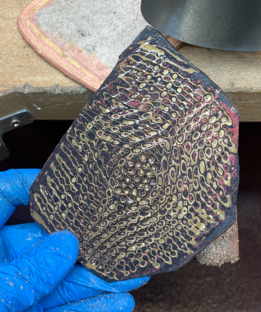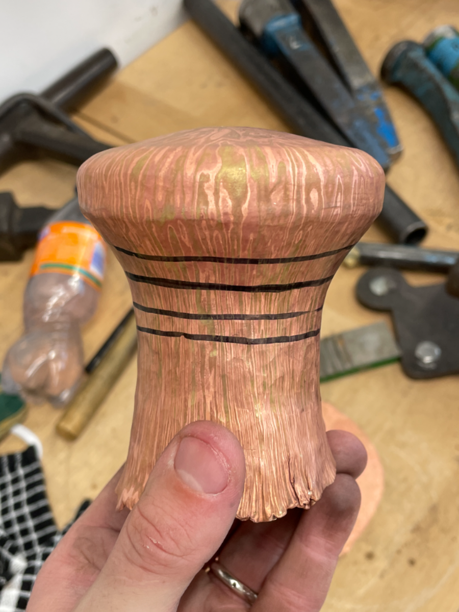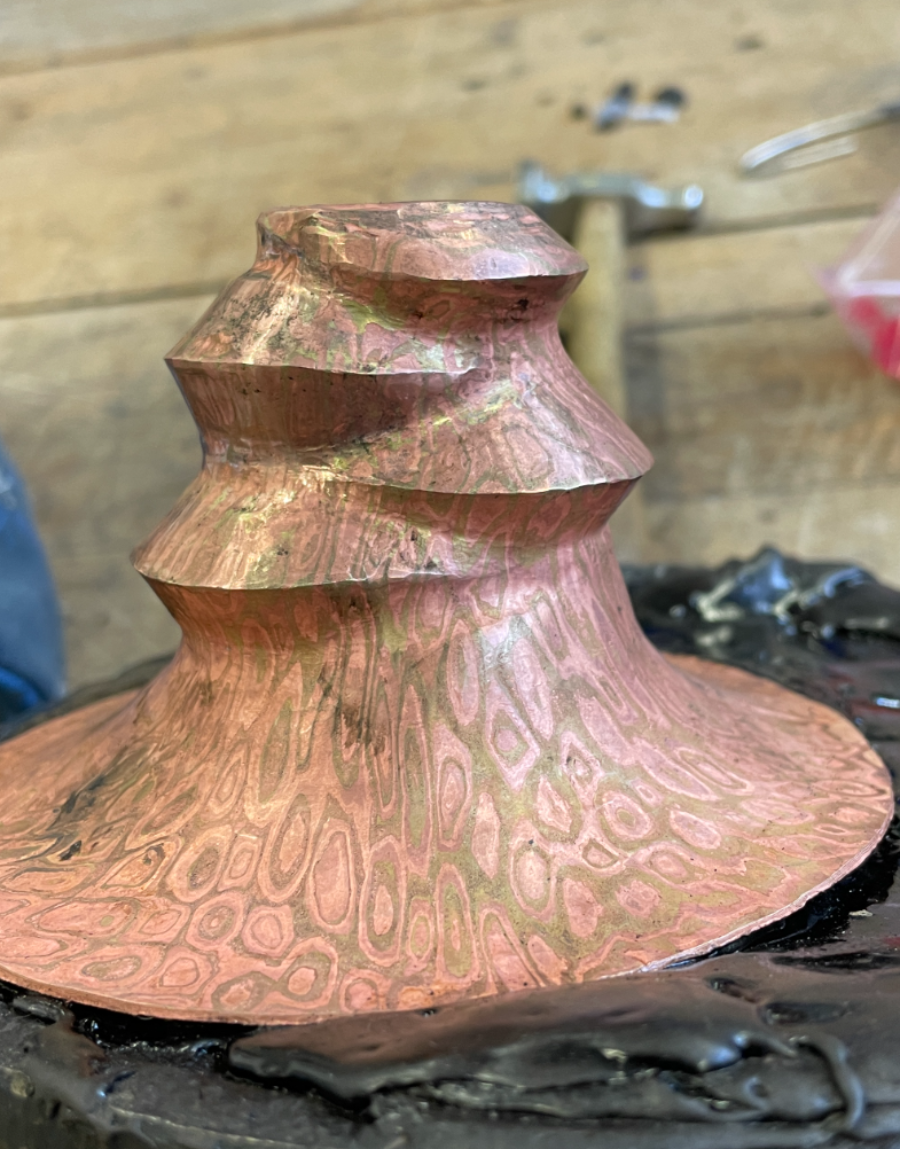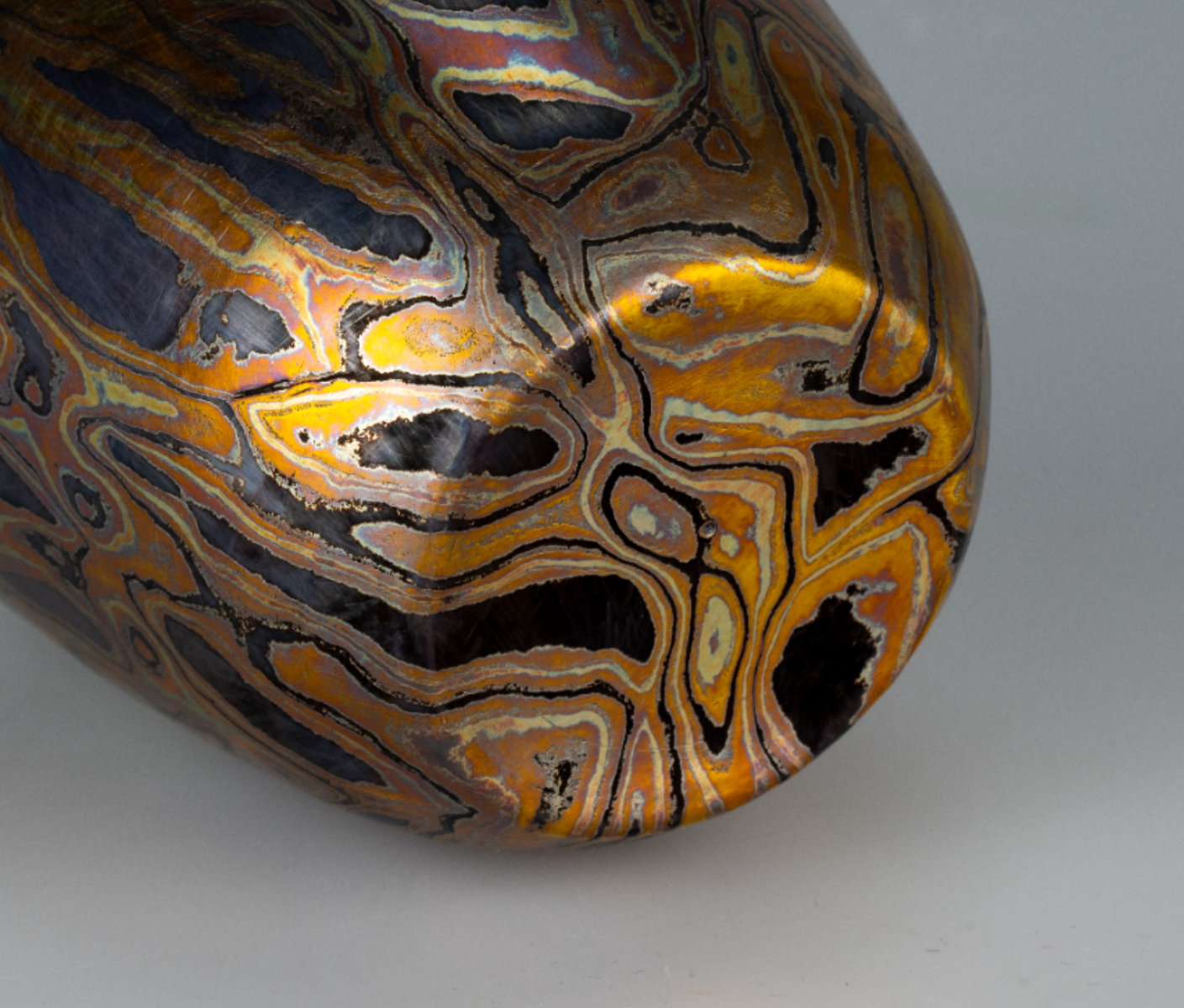 Henry Le Page The UNDUL Collection Mokume Gane Jugs and a Vase, embody the UNDUL Collection’s pursuit of elegance through material complexity. Undulating forms emerge from hand- raised designs, guided by the metallurgy of copper alloys and patination. Beginning with the billet, the process embraces unpredictability, allowing pattern, surface, and silhouette to unfold with an intentional spontaneity. Mokume Gane is a traditional Japanese metalworking technique developed in the early 17th century by the swordsmith Denbei Shoami. The name means “wood grain metal,” referring to the layered appearance of the patterns it creates. By stacking and fusing sheets of different metals, such as silver, copper, and shakudo, skilled artisans form a solid billet, which is then forged, carved, and manipulated to reveal organic layered shapes and patterns. Only one family maintained the tradition into the modern era, keeping it alive until its revival in the 20th century. Today, a small global collective of craftspeople continues to adapt and evolve Mokume Gane, applying it to jewellery, vessels, and sculptural forms. Personally, I use Mokume Gane to explore form, texture, and process in my jewellery and silversmithing pieces. Each work begins with a handmade billet, forged from carefully selected metals and shaped through a process that requires both patience and precision. What draws me back to this technique again and again is its unpredictability and the challenge it presents, a constant dialogue between maker and material. The pieces here are small snapshots of that ongoing, hands-on exchange. I seek to expand this tradition, experimenting with Mokume Gane in ways that bring fresh forms and a stronger presence in the UK @henry_le_page