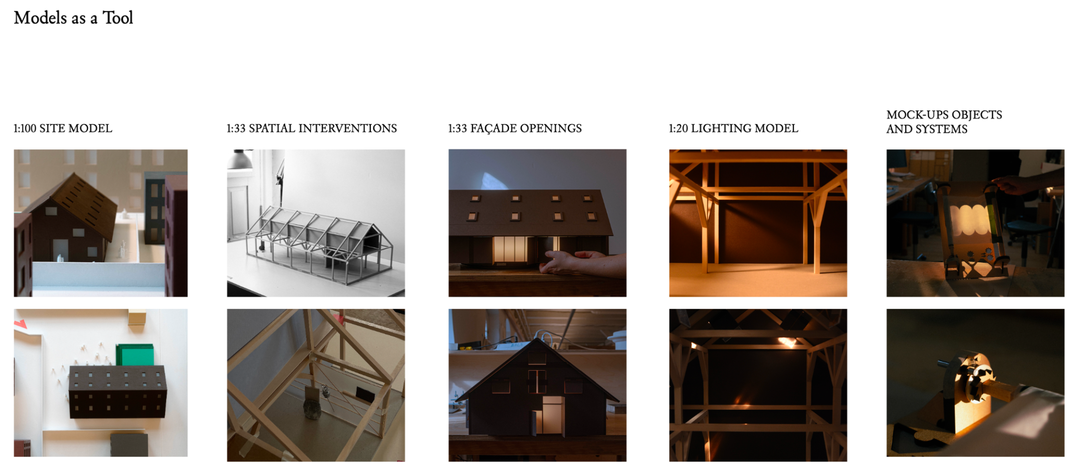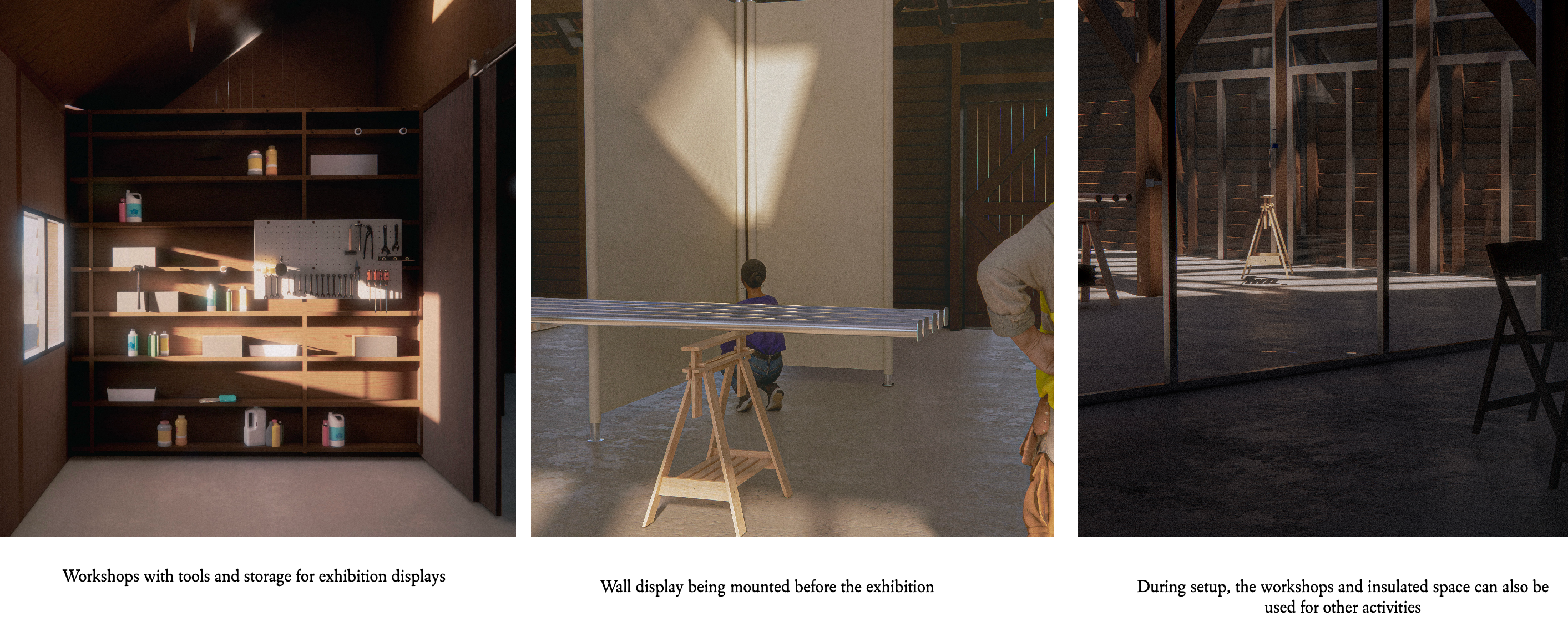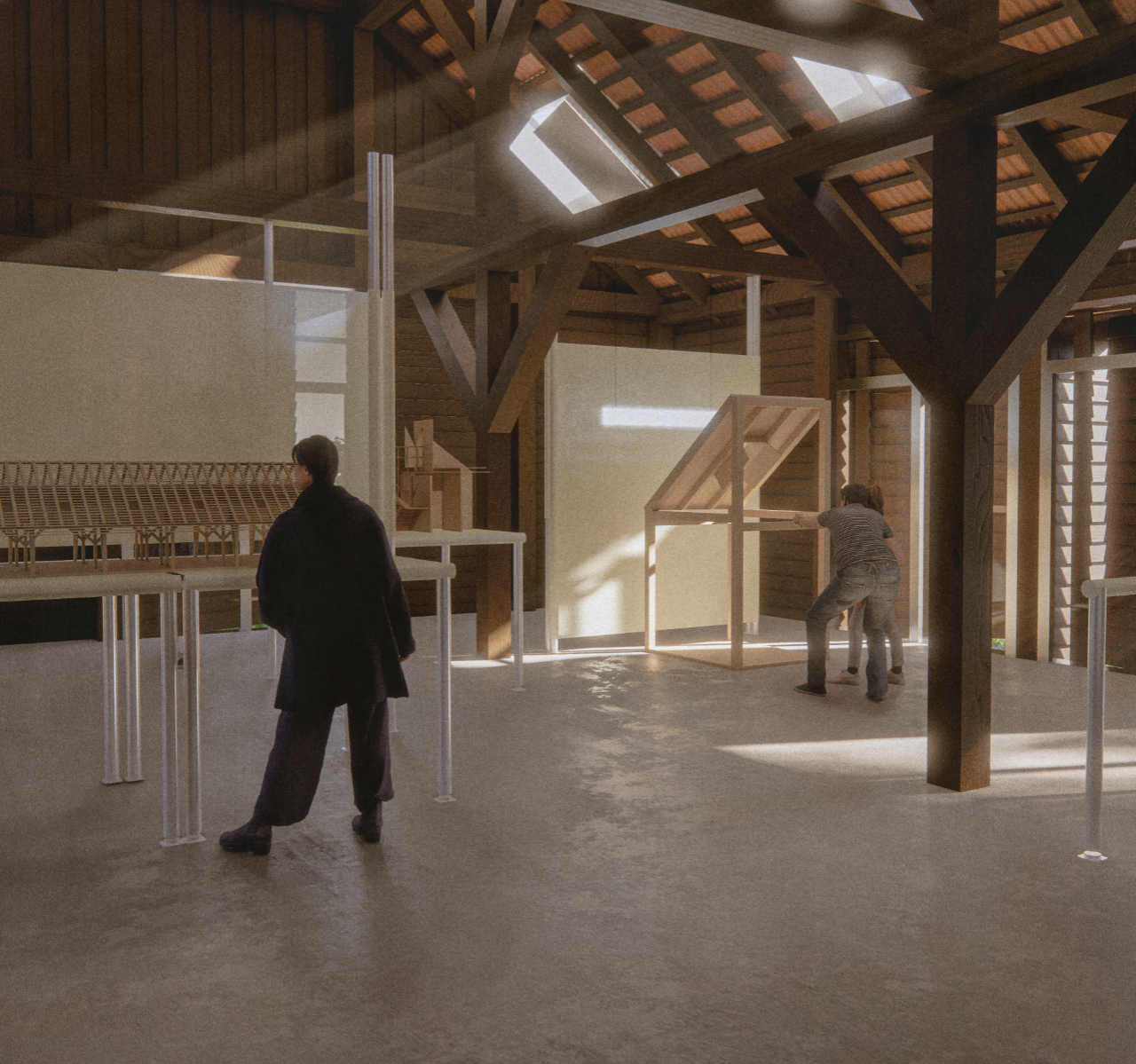The project reimagines a timber barn built in 1907 in Sønderbro, Amager, as a multifunctional workshop and exhibition space activated by Fabrikken for Kunst og Design and open to the local community. It seeks to preserve the barn’s historical character while introducing thoughtful, flexible interventions that adapt the space for contemporary use. Emphasising sensory experience through spatial design and tactile fixtures, the project aims to create an environment that feels welcoming. The barn becomes a place where making, showing, and gathering intersect, supporting both individual practice and shared experience. With limited early access to the barn, we used physical models early on to translate sketches into spatial form. These helped us explore light, scale, object placement, and atmosphere, revealing how the barn’s qualities could support future use. We approached the barn as a dynamic context shaped by human presence. Through observation, material testing, and iterative making, physical models became key tools for shaping and grounding the design.