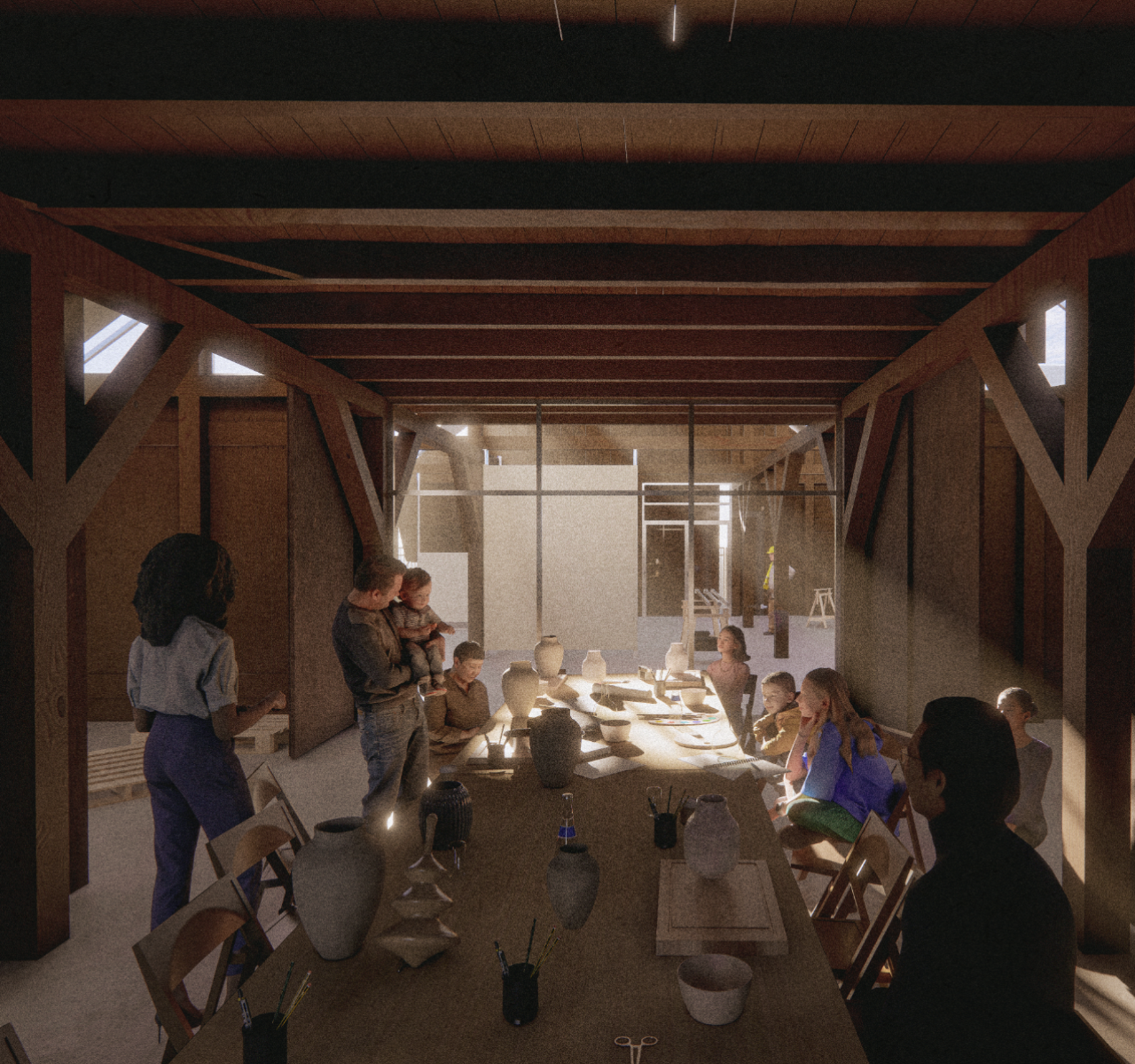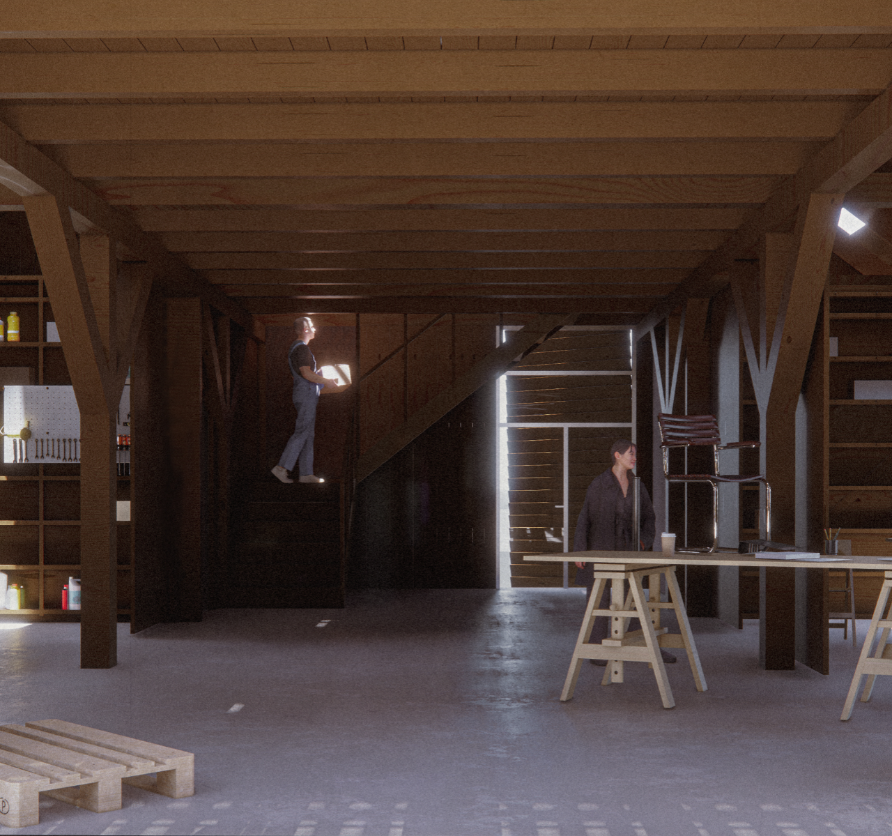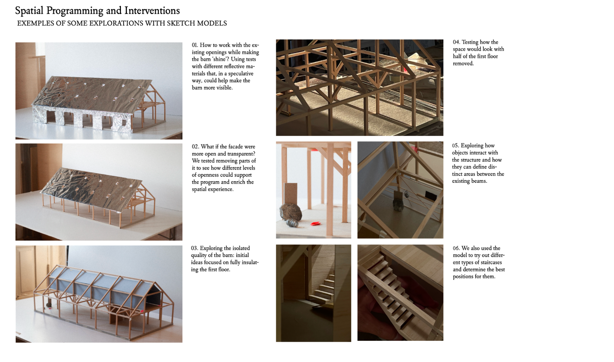 The project reimagines a timber barn built in 1907 in Sønderbro, Amager, as a multifunctional workshop and exhibition space activated by Fabrikken for Kunst og Design and open to the local community. It seeks to preserve the barn’s historical character while introducing thoughtful, flexible interventions that adapt the space for contemporary use. Emphasising sensory experience through spatial design and tactile fixtures, the project aims to create an environment that feels welcoming. The barn becomes a place where making, showing, and gathering intersect, supporting both individual practice and shared experience. With limited early access to the barn, we used physical models early on to translate sketches into spatial form. These helped us explore light, scale, object placement, and atmosphere, revealing how the barn’s qualities could support future use. We approached the barn as a dynamic context shaped by human presence. Through observation, material testing, and iterative making, physical models became key tools for shaping and grounding the design.