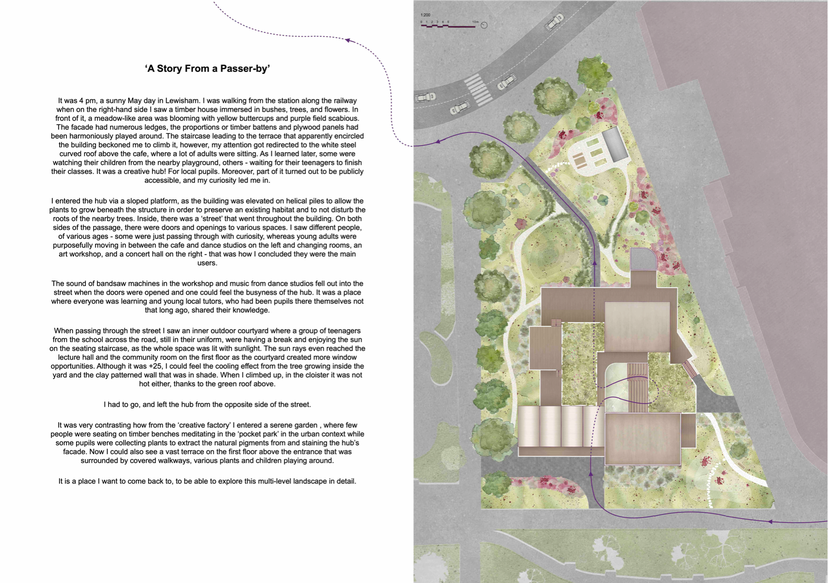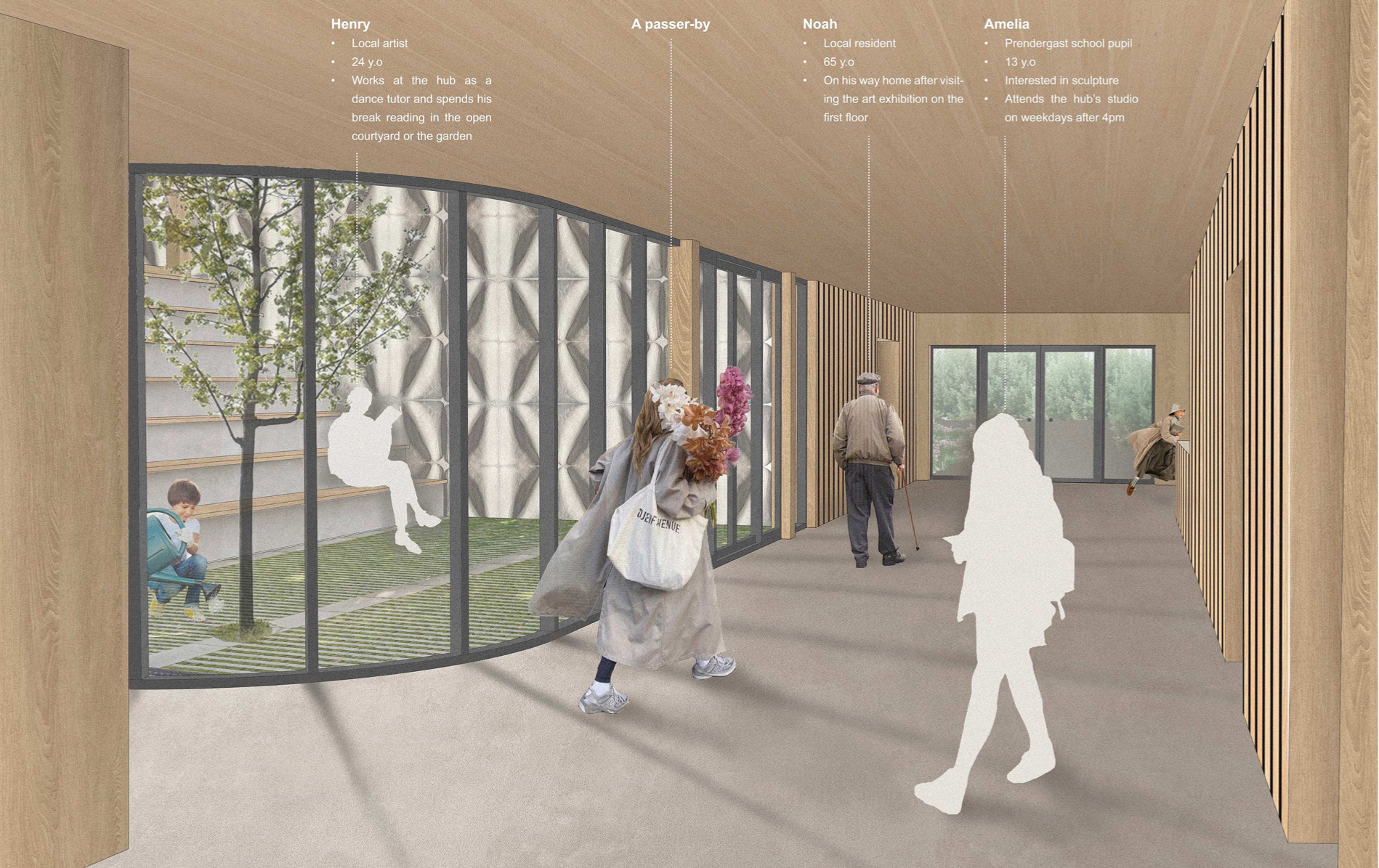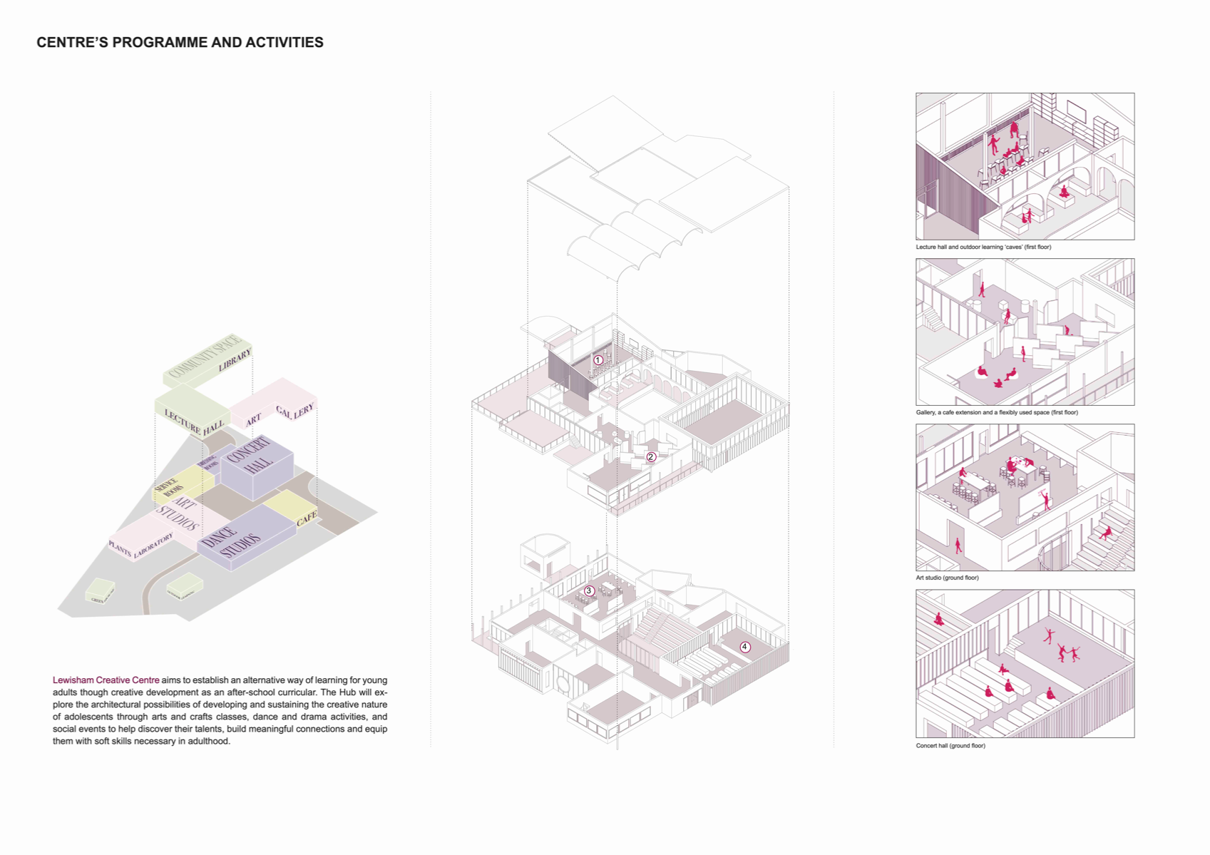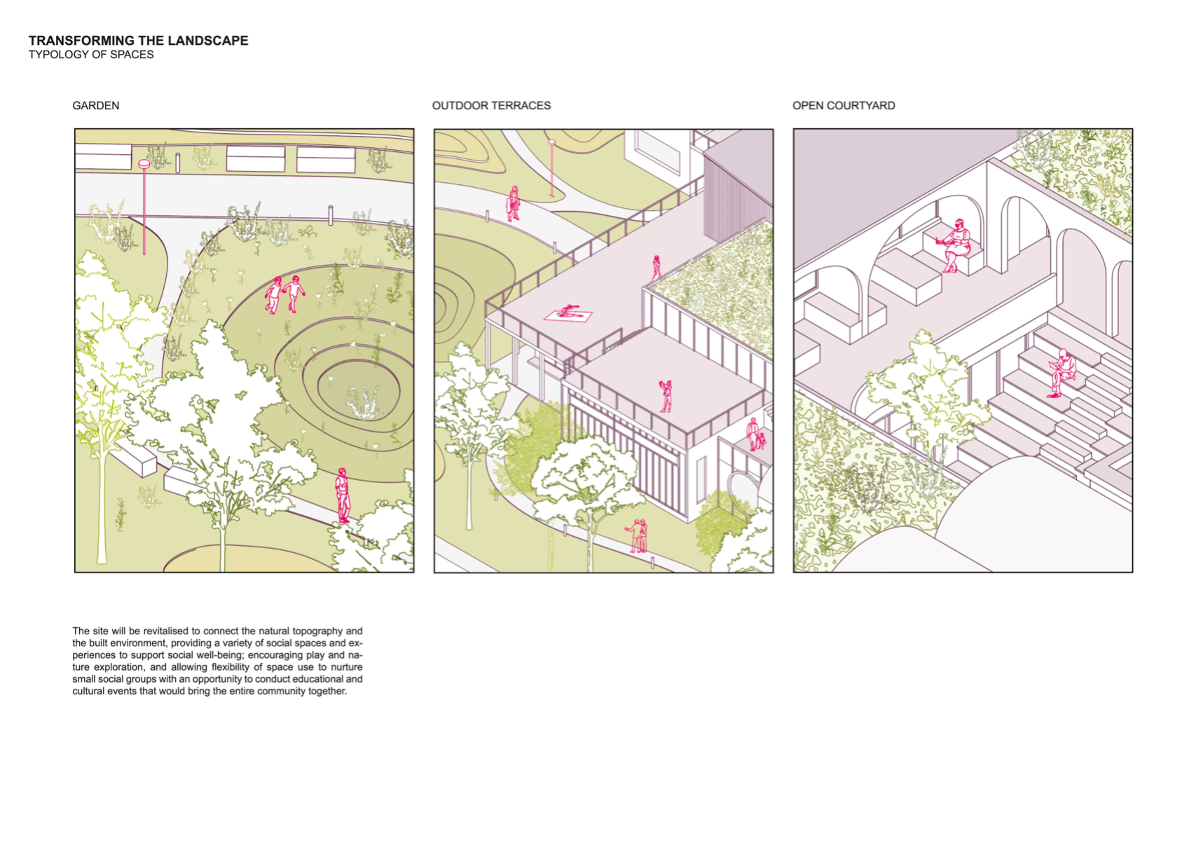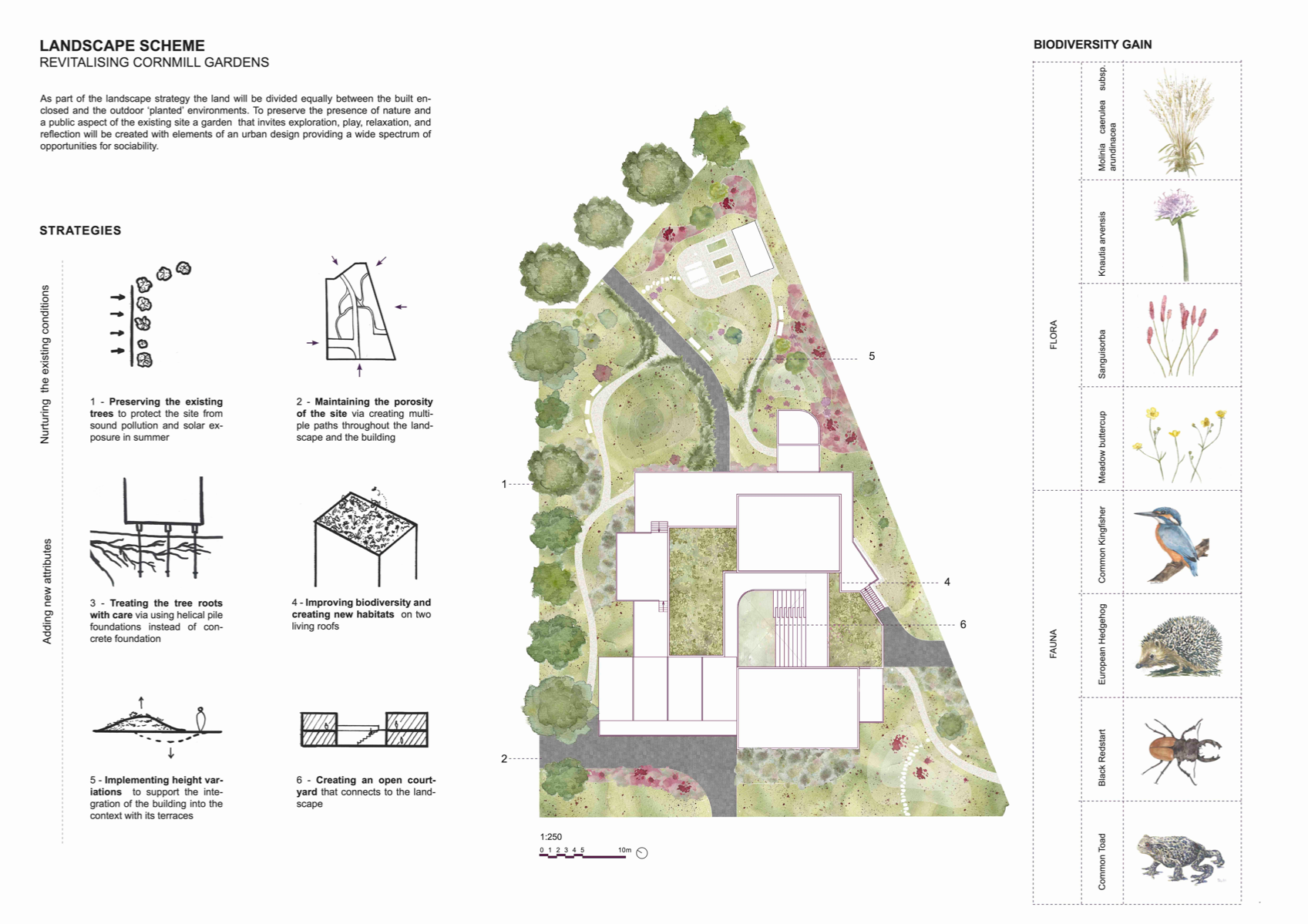 'Transforming the Landscape' is a project revitalising the site of Cornmill Gardens, where the natural topography is merged with the built environment. It presents Lewisham Creative Hub - a civic centre for knowledge exchange and creative development, where all activities are connected through the urban landscape. The project is focused on the provision of a cultural programme in the area with insufficient creative opportunities, on the involvement of teenagers, who lack social and artistic activities. in the life of the neighbourhood, and finally, on the collaboration with local artists and makers for mutual benefit. Passive environmental strategies, the use of sustainable renewable materials, and prioritising users' experience, along with a sensitive approach to the surroundings have shaped the proposal. It aims to support public mental well-being, encourage play and nature exploration, and allow flexibility of space use to conduct educational and cultural events that bring the entire community together.