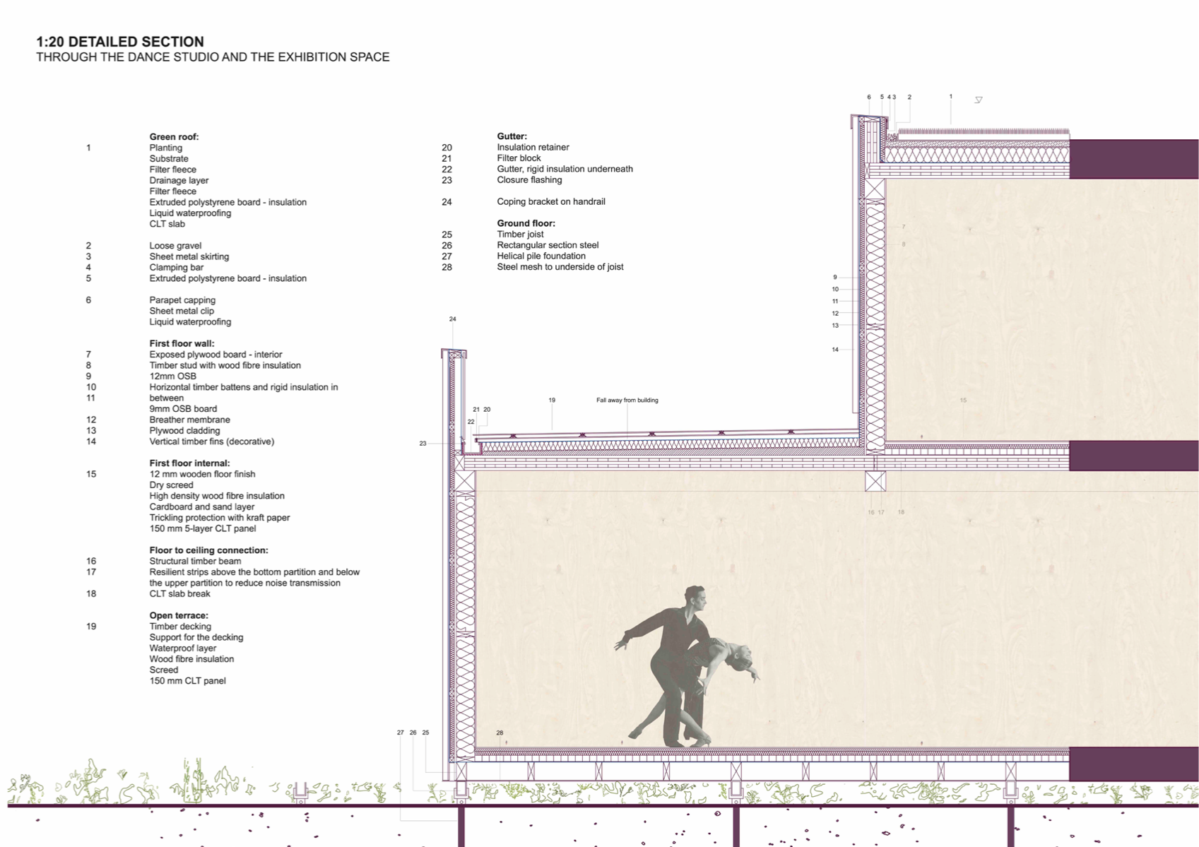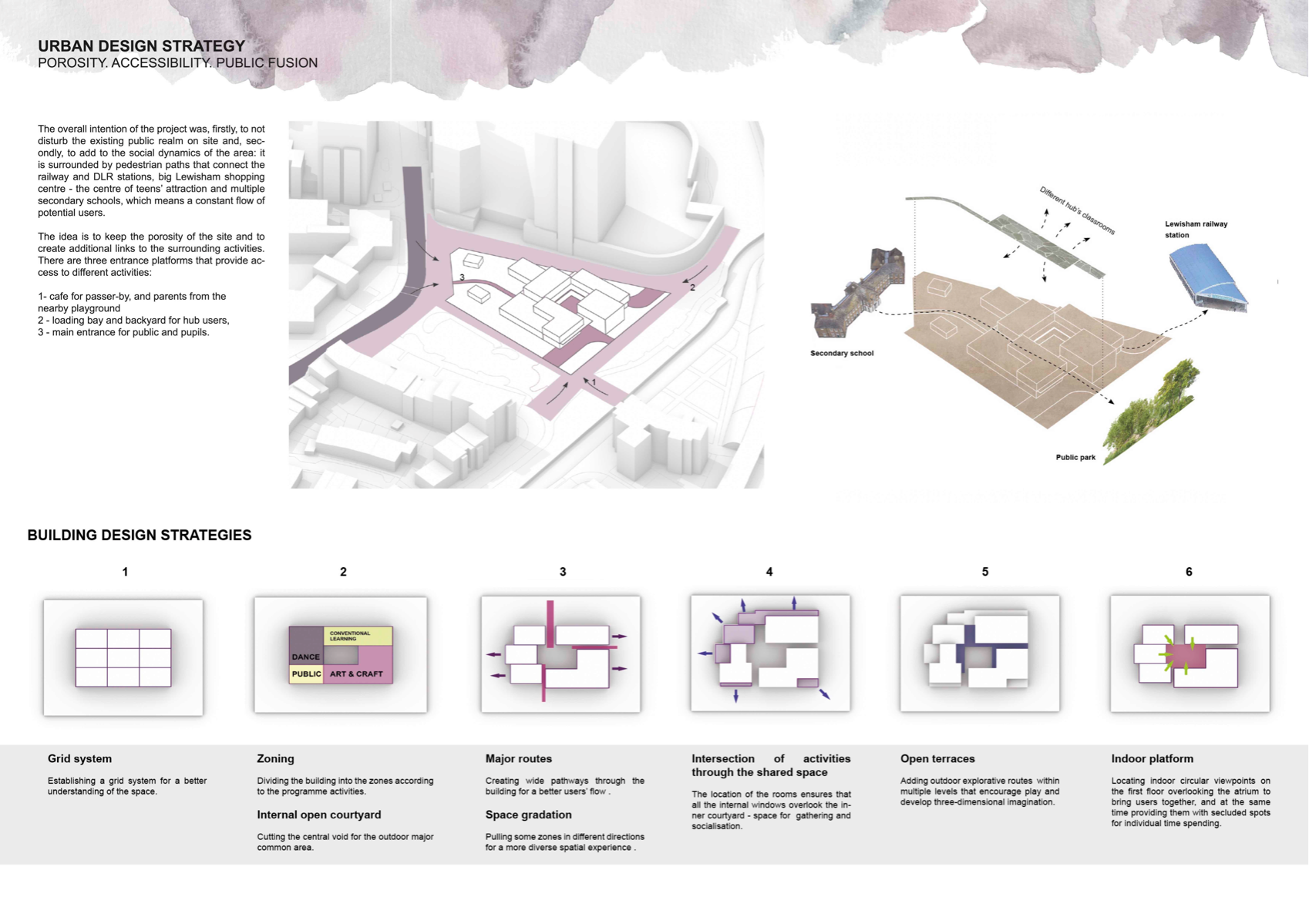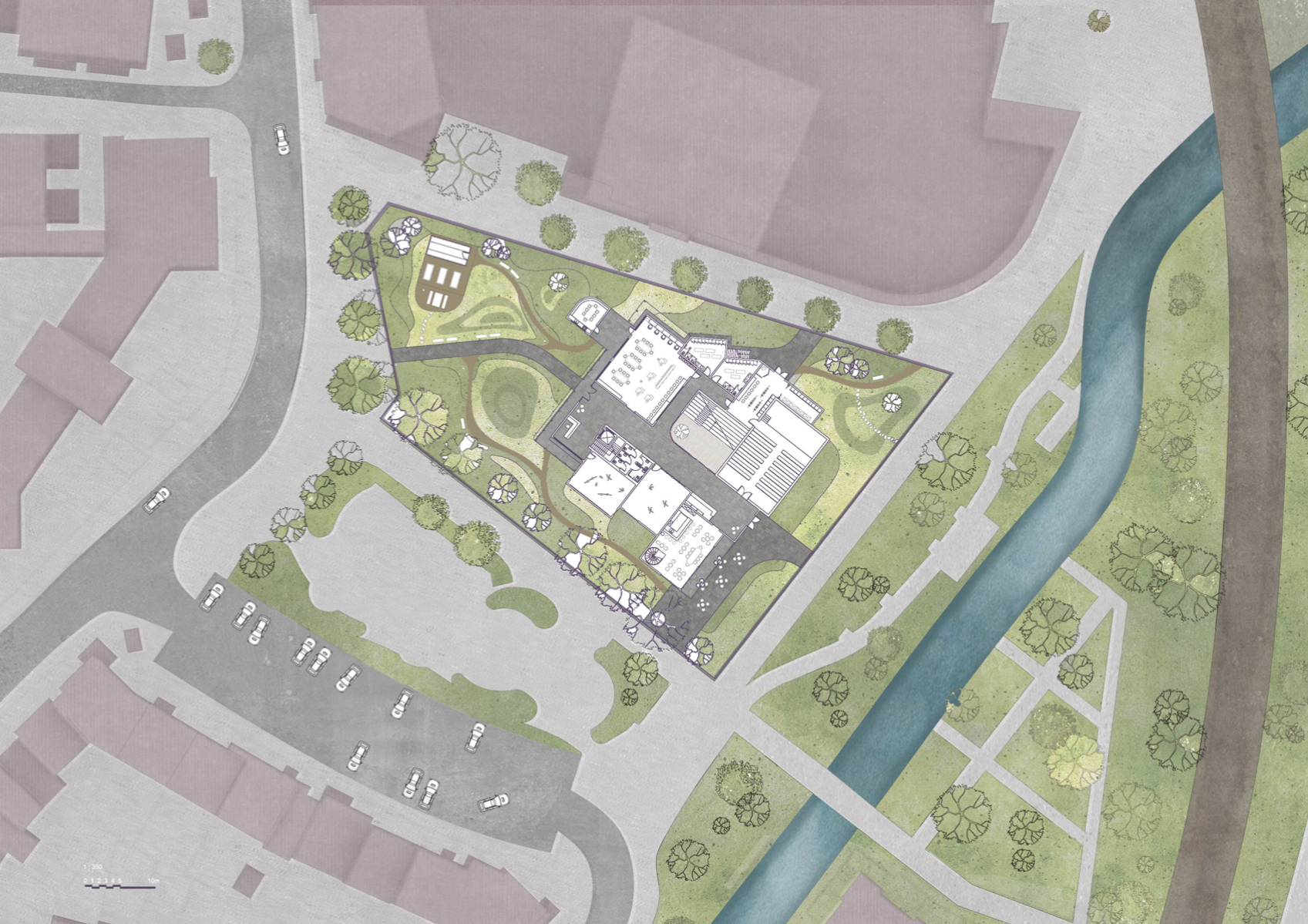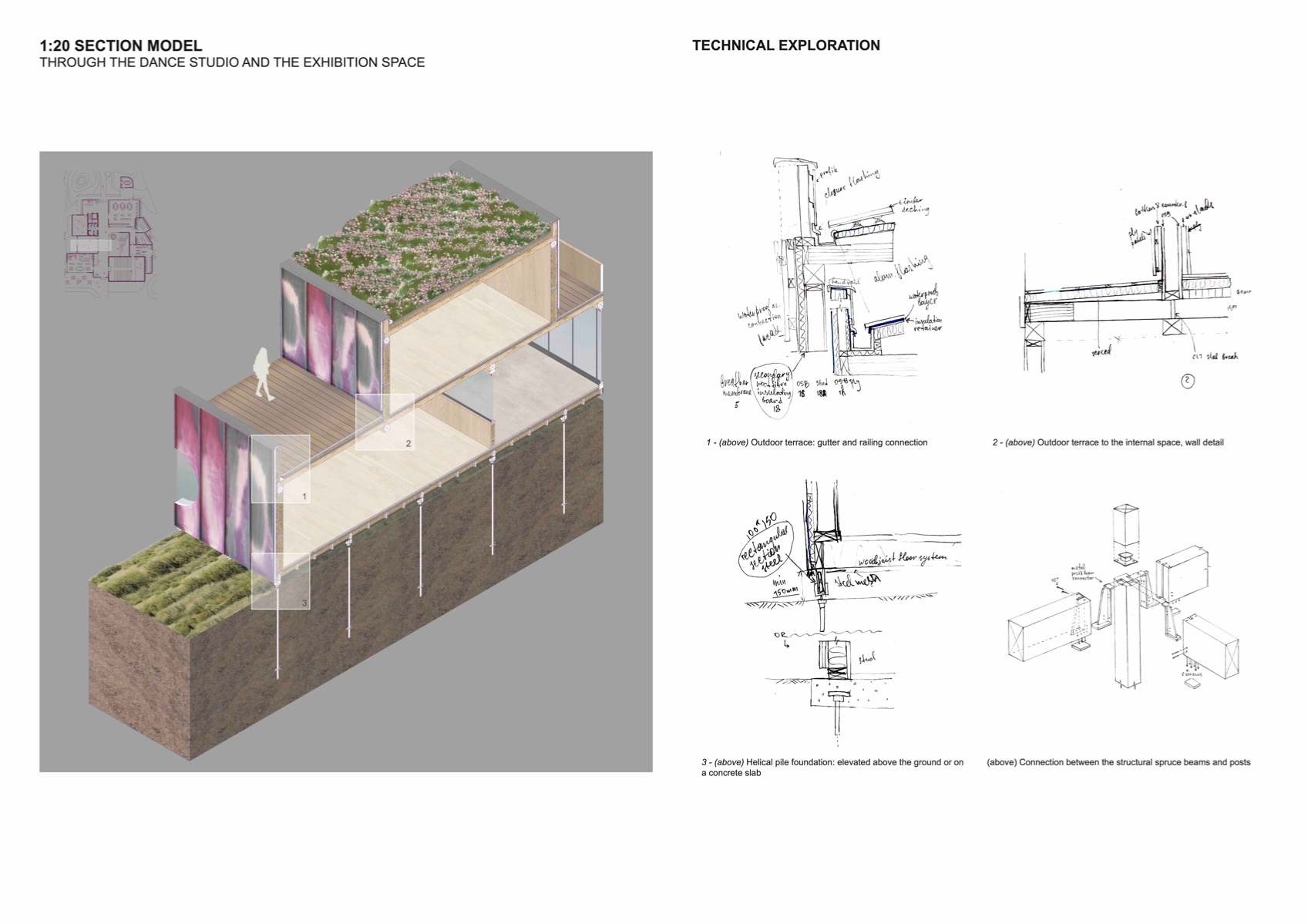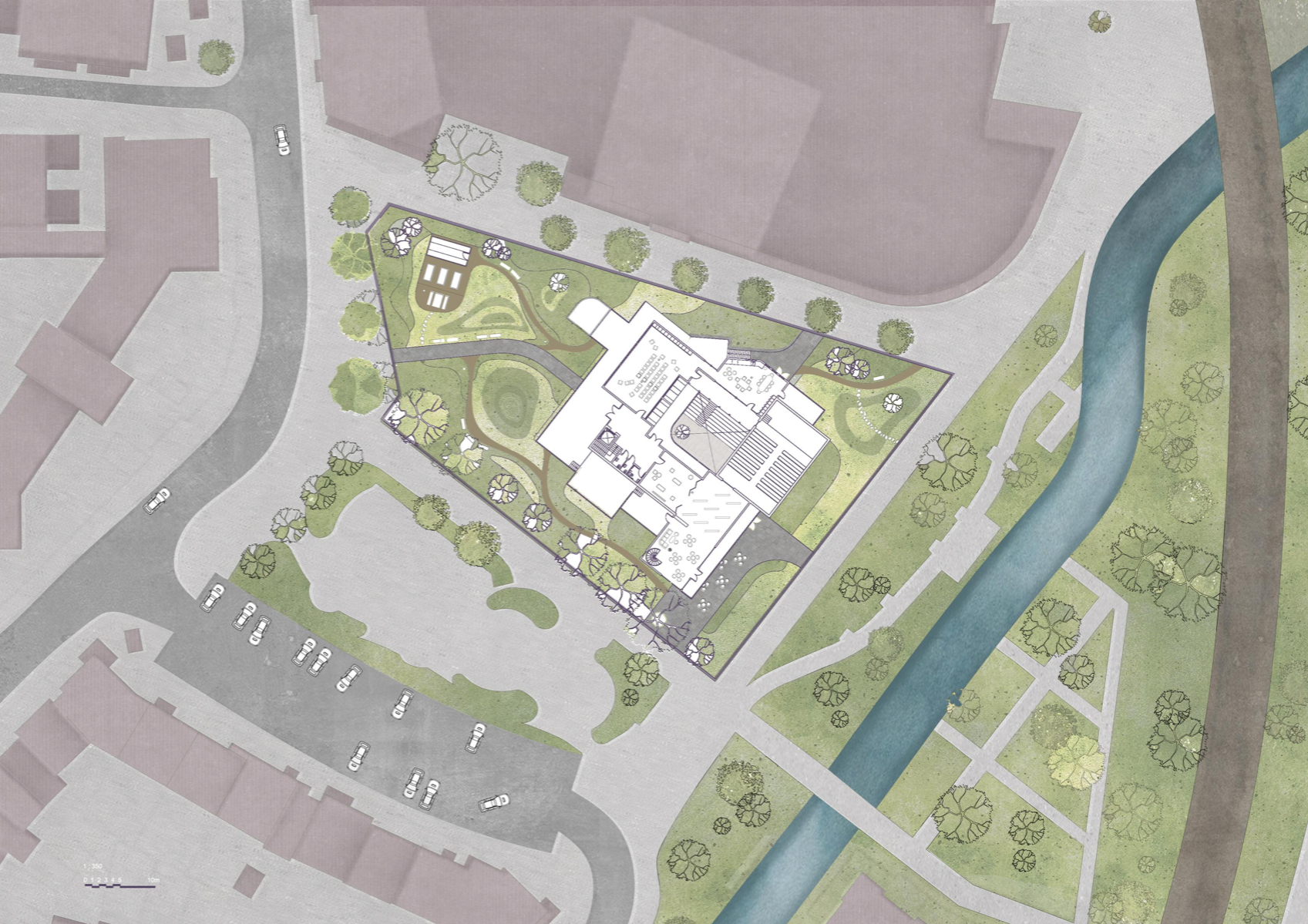 'Transforming the Landscape' is a project revitalising the site of Cornmill Gardens, where the natural topography is merged with the built environment. It presents Lewisham Creative Hub - a civic centre for knowledge exchange and creative development, where all activities are connected through the urban landscape. The project is focused on the provision of a cultural programme in the area with insufficient creative opportunities, on the involvement of teenagers, who lack social and artistic activities. in the life of the neighbourhood, and finally, on the collaboration with local artists and makers for mutual benefit. Passive environmental strategies, the use of sustainable renewable materials, and prioritising users' experience, along with a sensitive approach to the surroundings have shaped the proposal. It aims to support public mental well-being, encourage play and nature exploration, and allow flexibility of space use to conduct educational and cultural events that bring the entire community together.