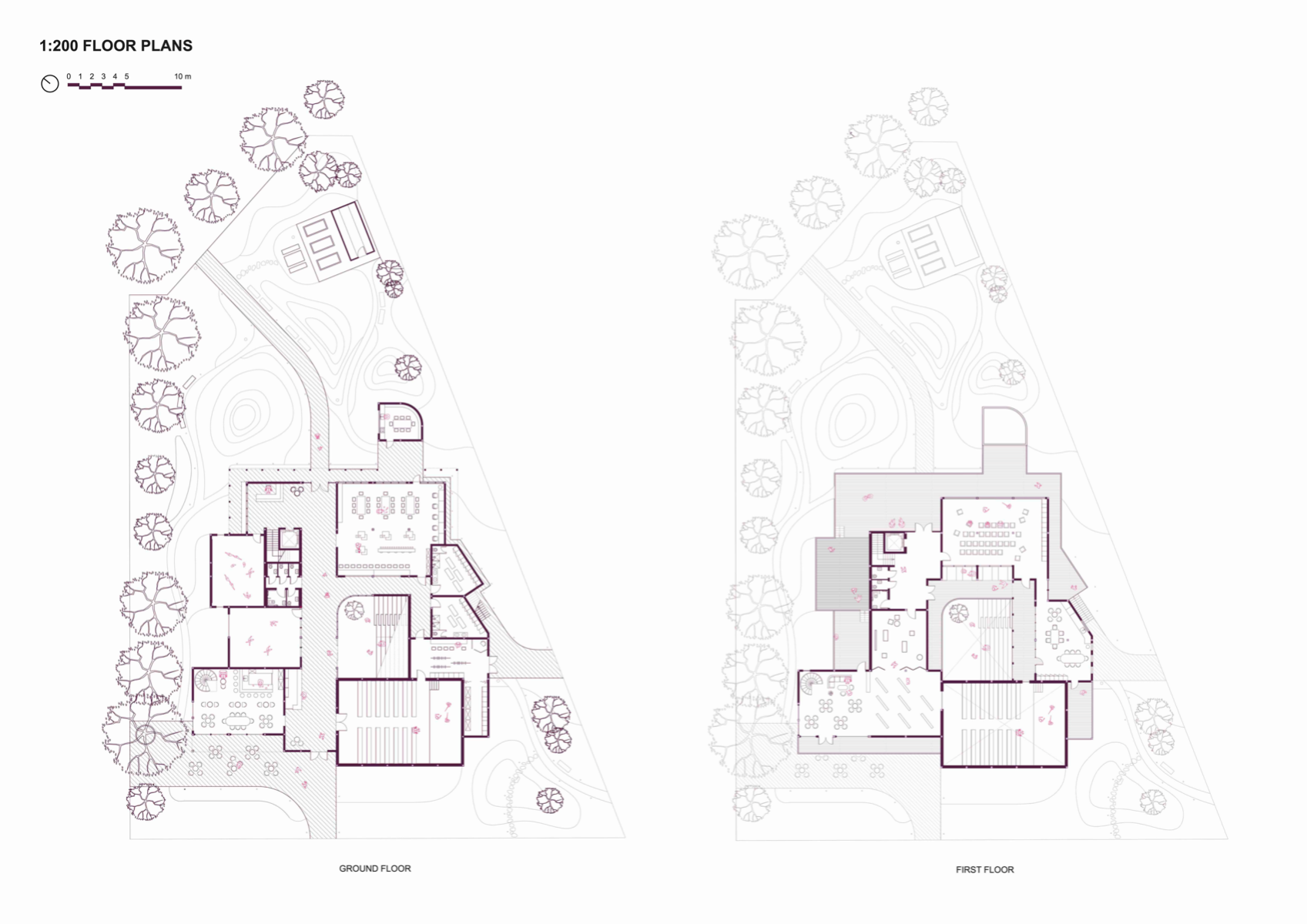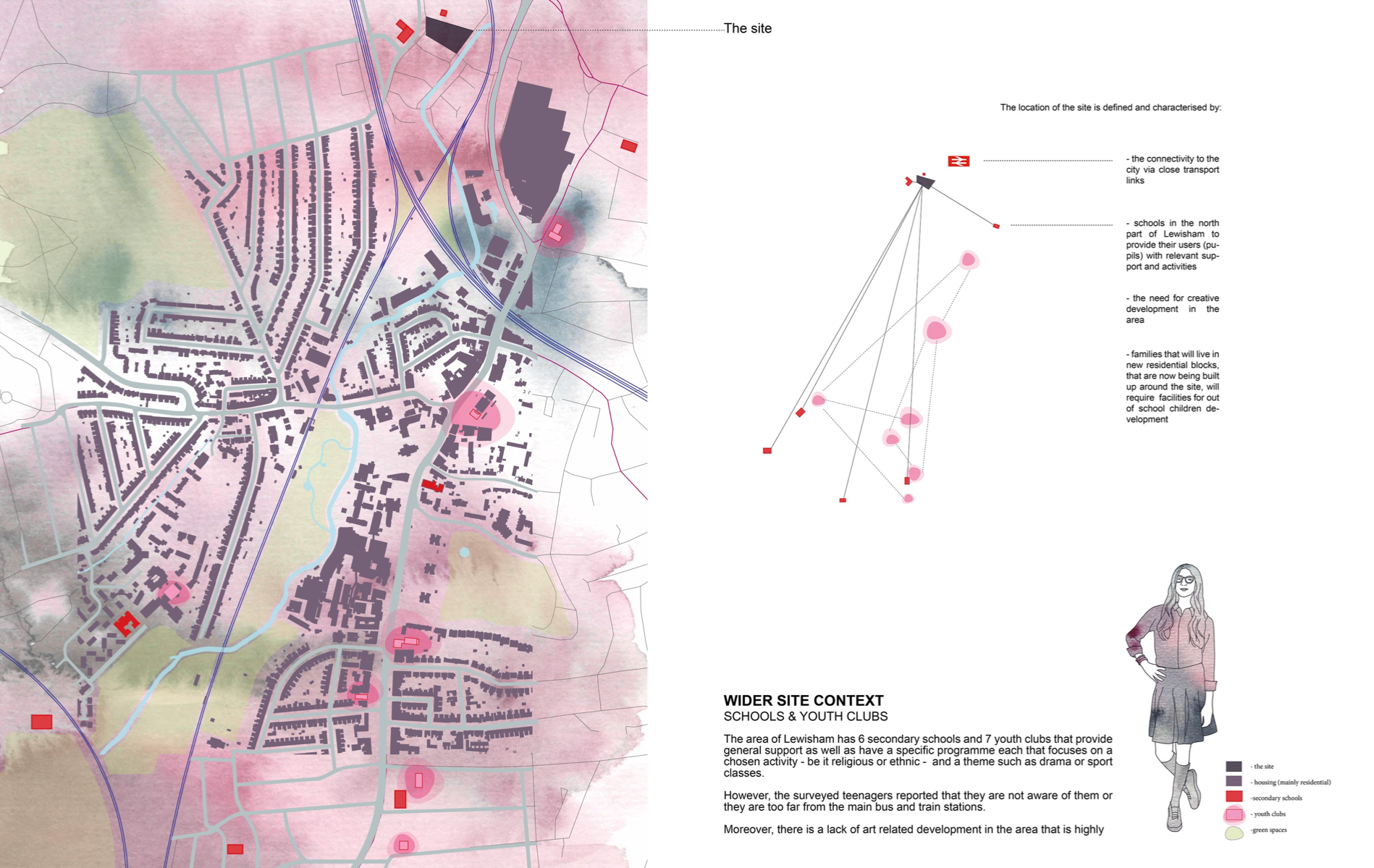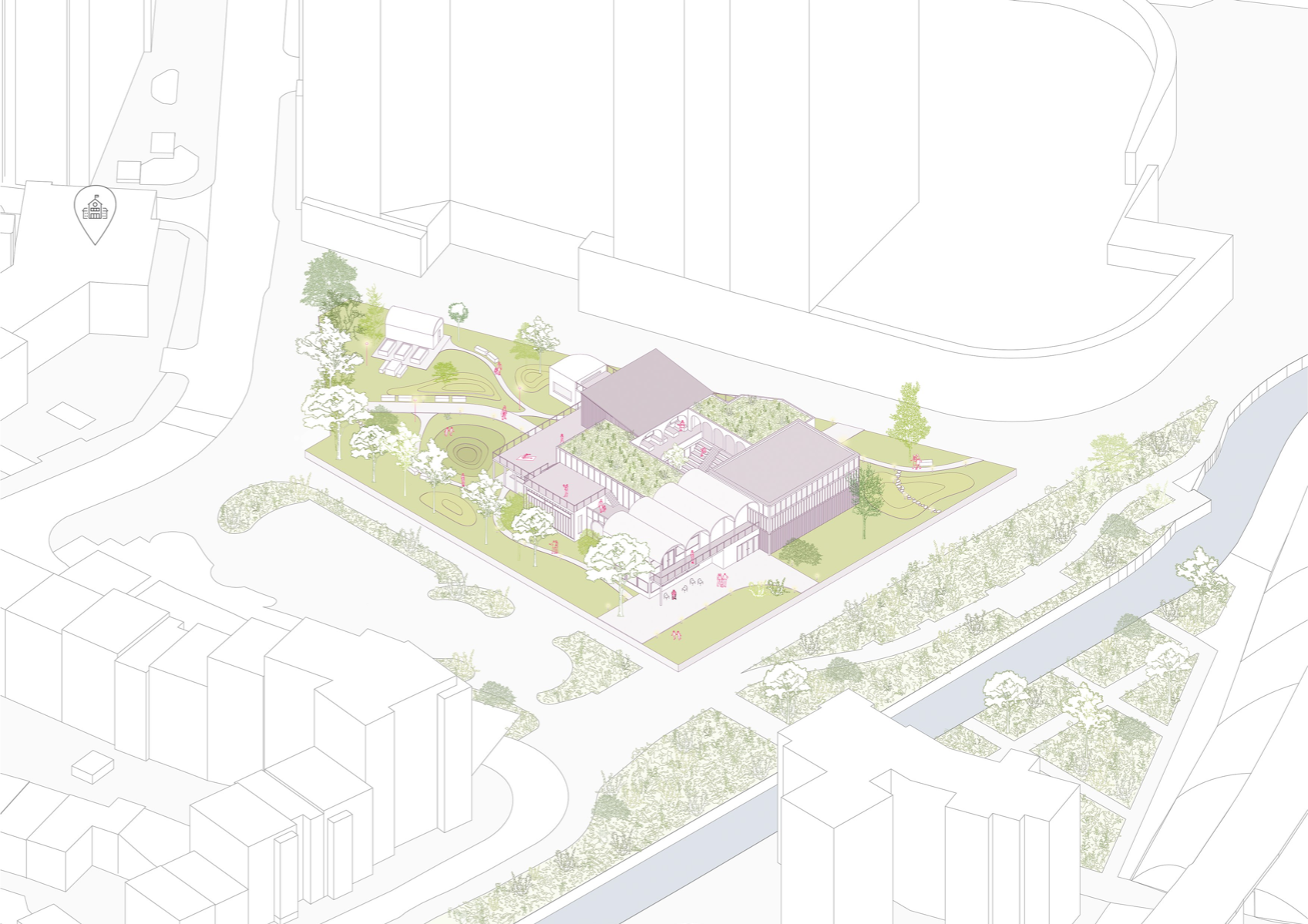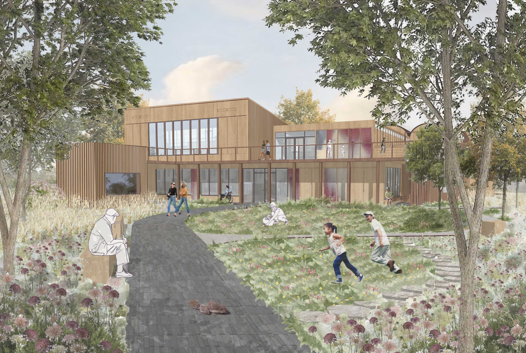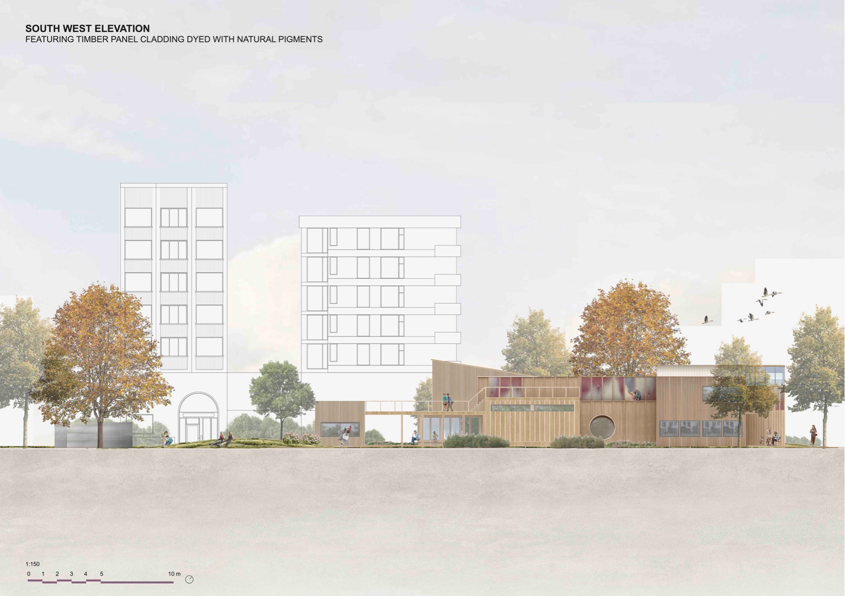 'Transforming the Landscape' is a project revitalising the site of Cornmill Gardens, where the natural topography is merged with the built environment. It presents Lewisham Creative Hub - a civic centre for knowledge exchange and creative development, where all activities are connected through the urban landscape. The project is focused on the provision of a cultural programme in the area with insufficient creative opportunities, on the involvement of teenagers, who lack social and artistic activities. in the life of the neighbourhood, and finally, on the collaboration with local artists and makers for mutual benefit. Passive environmental strategies, the use of sustainable renewable materials, and prioritising users' experience, along with a sensitive approach to the surroundings have shaped the proposal. It aims to support public mental well-being, encourage play and nature exploration, and allow flexibility of space use to conduct educational and cultural events that bring the entire community together.