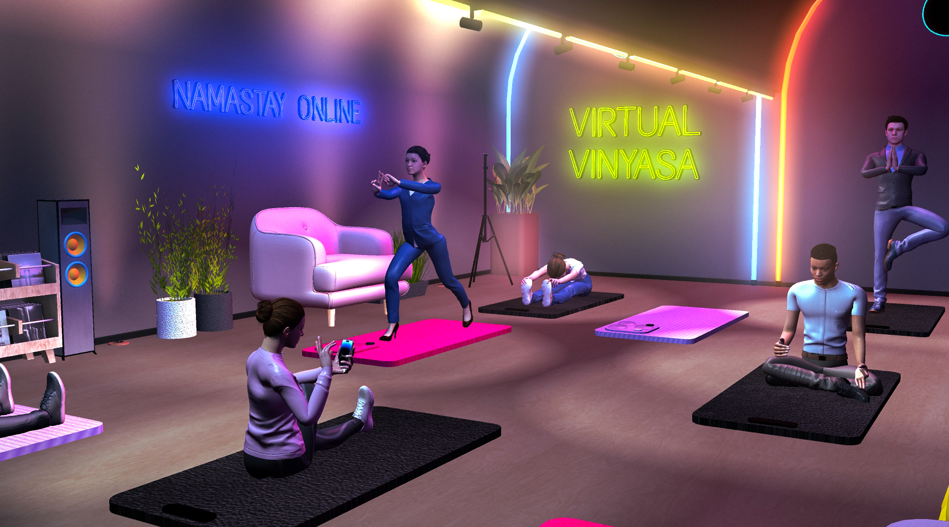 "Virtual Vinyasa" explores the subject of digital dependency by playfully examining the monetization of users' time and attention in our tech-driven world. Set against the backdrop of current chaotic digital consumption, this project reimagines yoga, blending this serene practice with the gestures of modern device use, like scrolling and taking selfies. The animation features a futuristic aesthetic, with sleek furnishings and glowing accents blending together to create an energetic atmosphere. Through this guided session, viewers are invited to laugh, reflect, and question the impact of their digital habits, ultimately encouraging a more mindful approach to technology and digital engagement. Music by Bonkers, 2022.