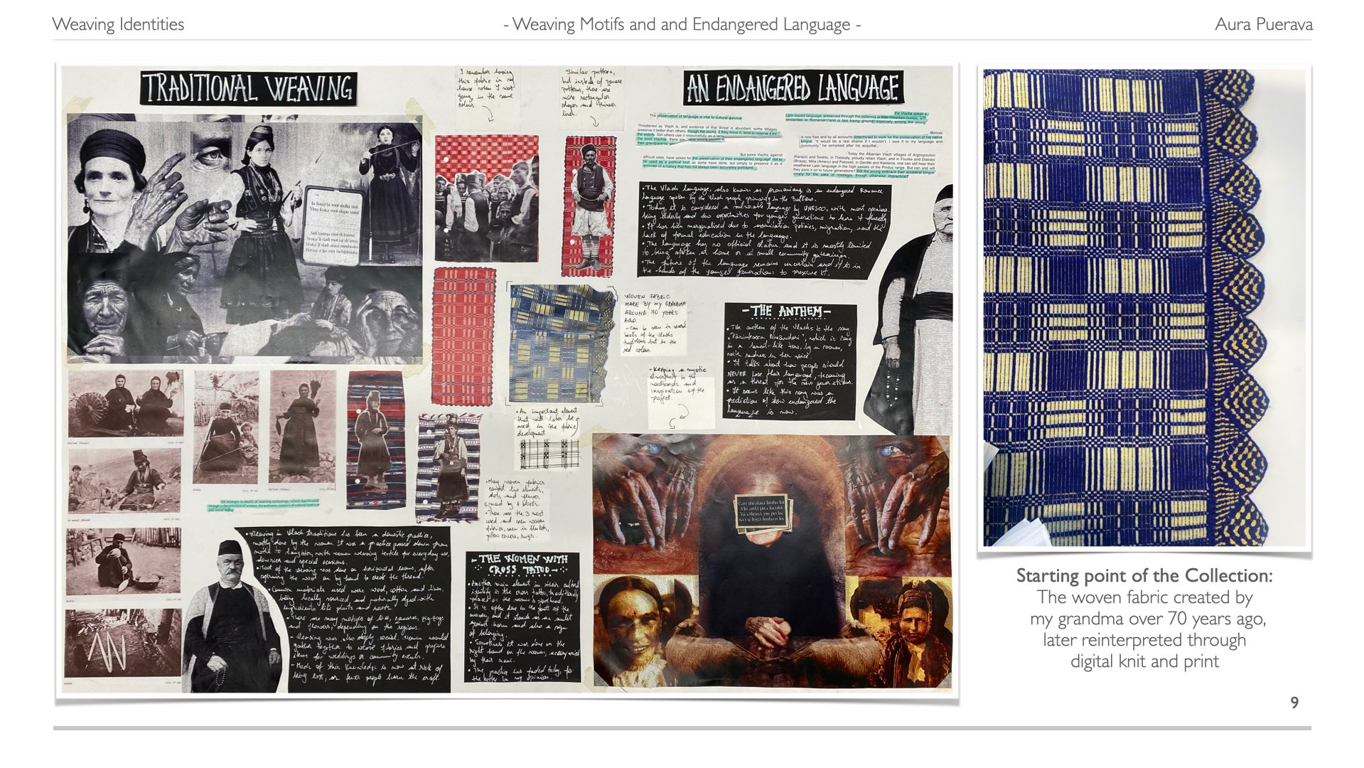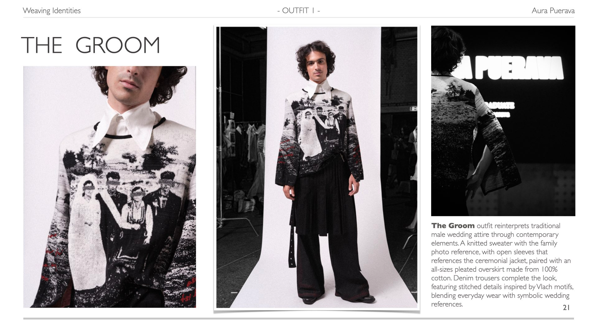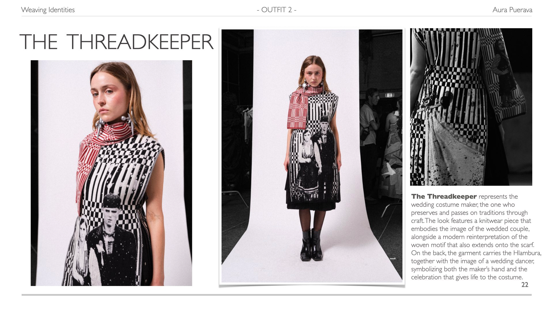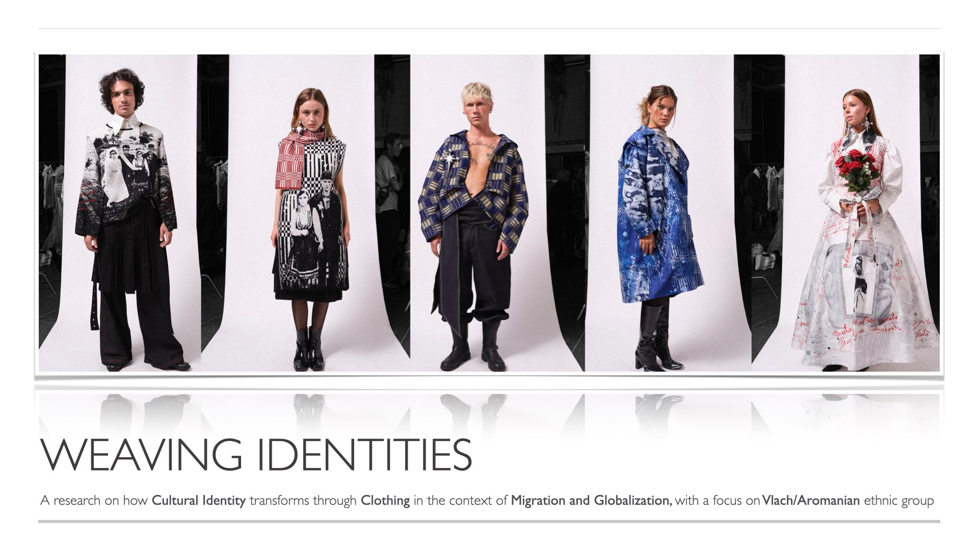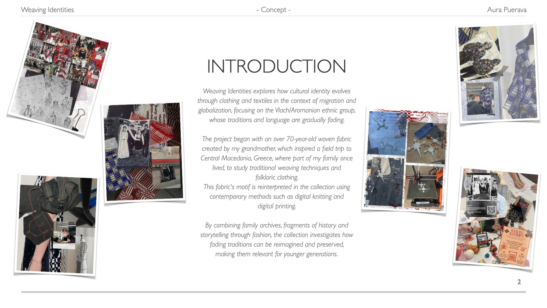Weaving Identities explores how cultural identity evolves through clothing and textiles in the context of migration and globalisation, focusing on the Vlach/Aromanian ethnic group, whose traditions and language are gradually fading. The project began with an over 70-year-old woven fabric created by my grandmother, which inspired a field trip to Central Macedonia, Greece, where part of my family once lived, to study traditional weaving techniques and folkloric clothing. This fabric's motif is reinterpreted in the collection using contemporary methods such as digital knitting and digital printing. By combining family archives, fragments of history and storytelling through fashion, the collection investigates how fading traditions can be reimagined and preserved, making them relevant for younger generations.