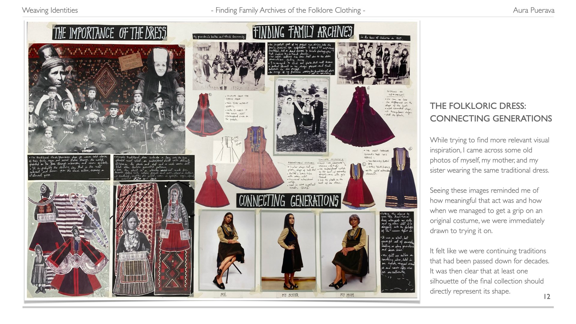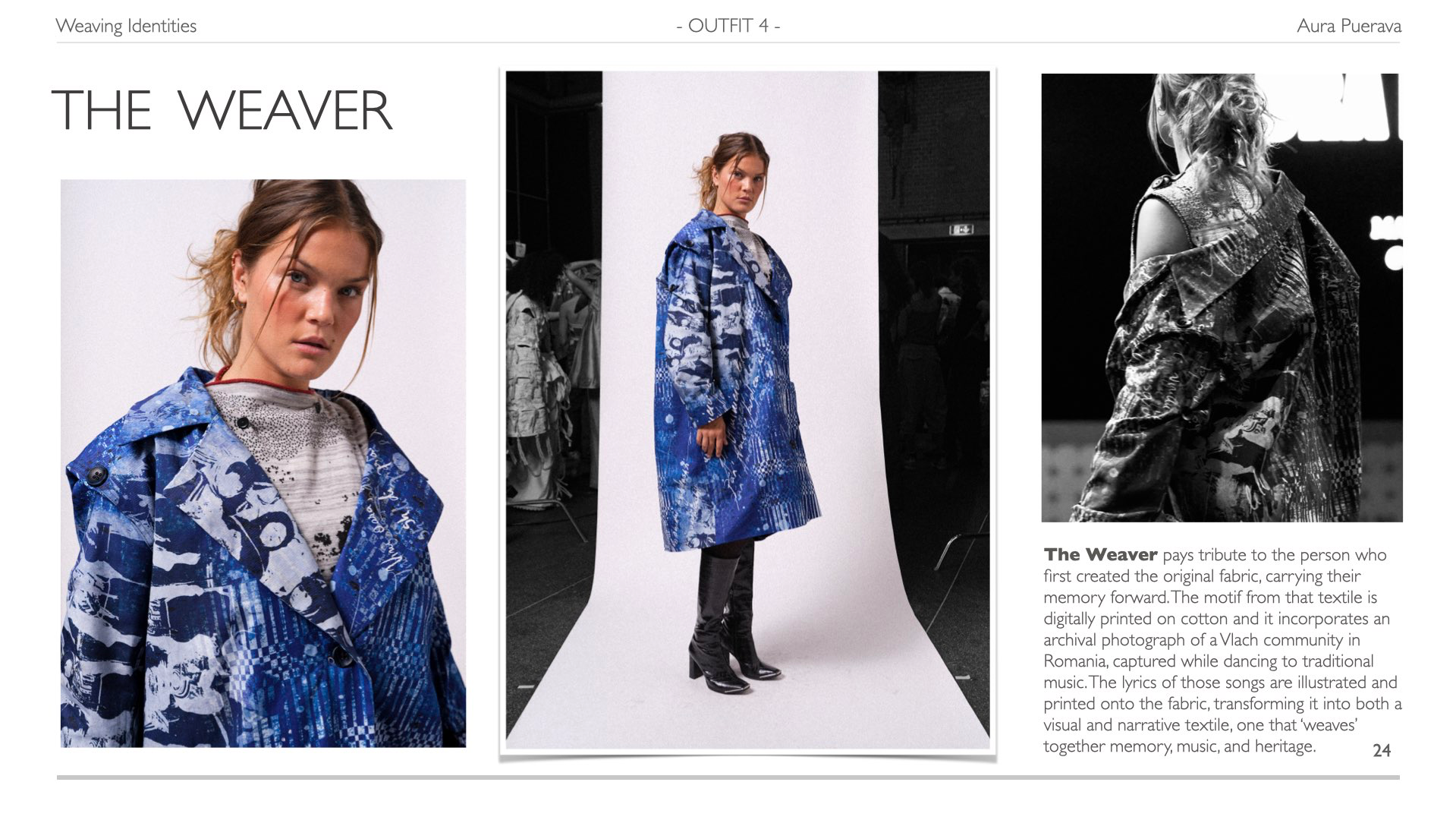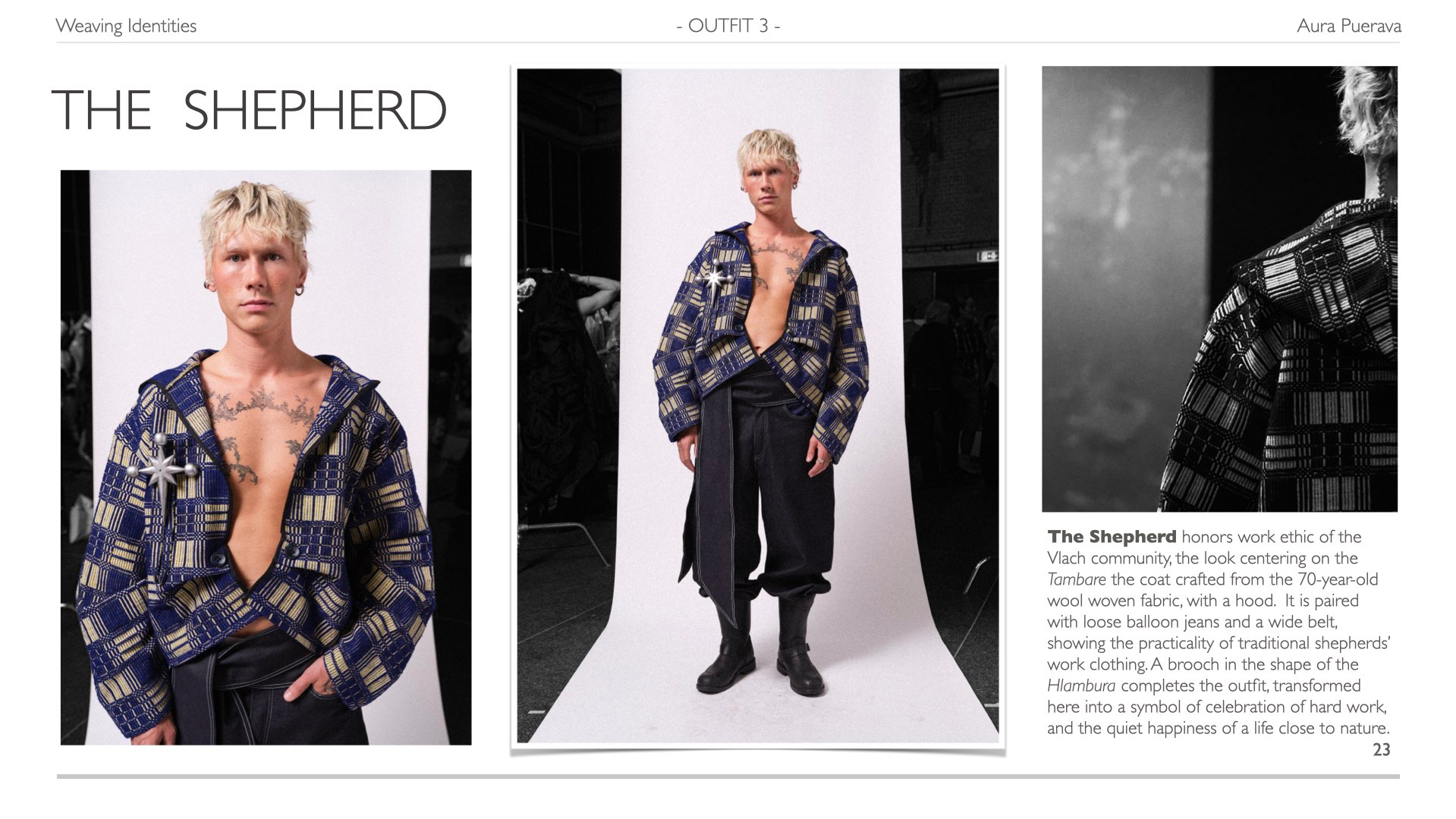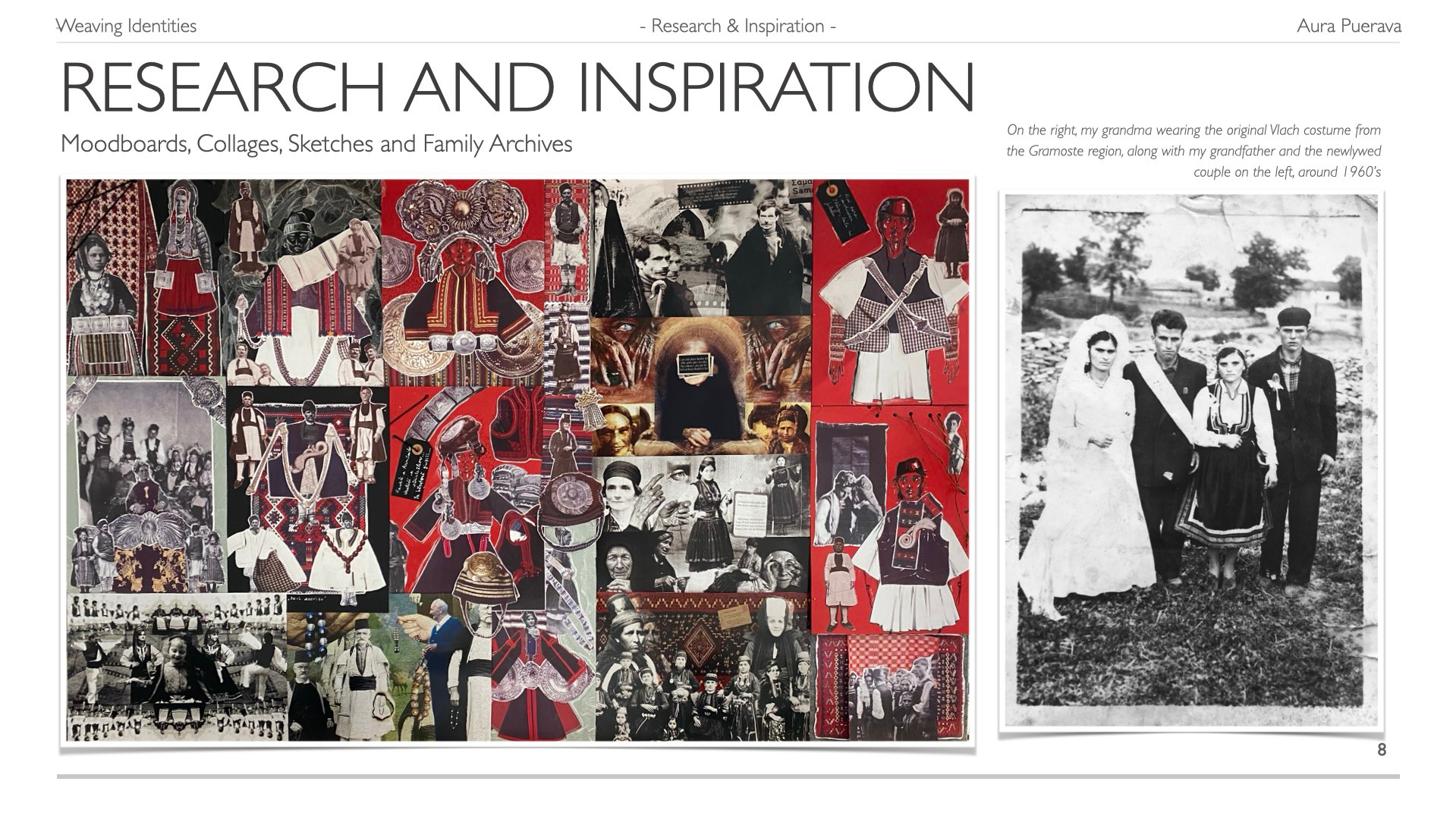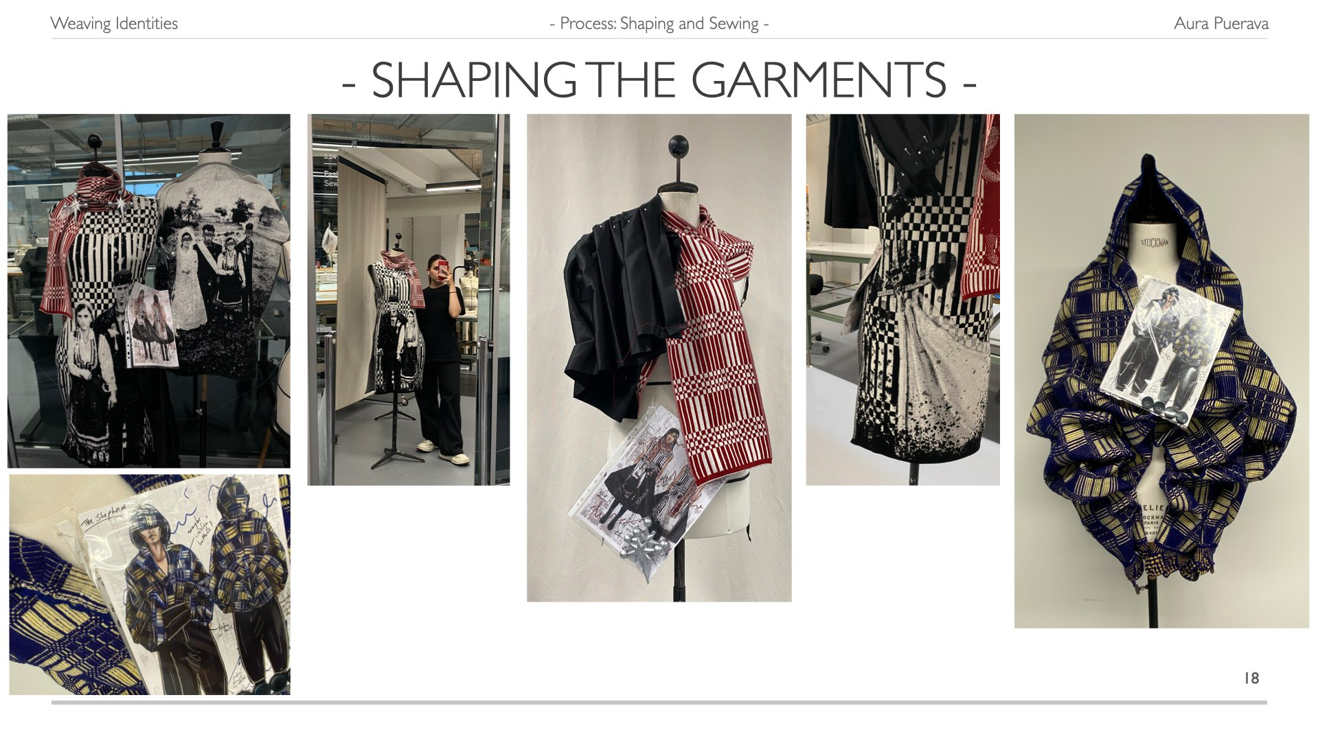 Weaving Identities explores how cultural identity evolves through clothing and textiles in the context of migration and globalisation, focusing on the Vlach/Aromanian ethnic group, whose traditions and language are gradually fading. The project began with an over 70-year-old woven fabric created by my grandmother, which inspired a field trip to Central Macedonia, Greece, where part of my family once lived, to study traditional weaving techniques and folkloric clothing. This fabric's motif is reinterpreted in the collection using contemporary methods such as digital knitting and digital printing. By combining family archives, fragments of history and storytelling through fashion, the collection investigates how fading traditions can be reimagined and preserved, making them relevant for younger generations.