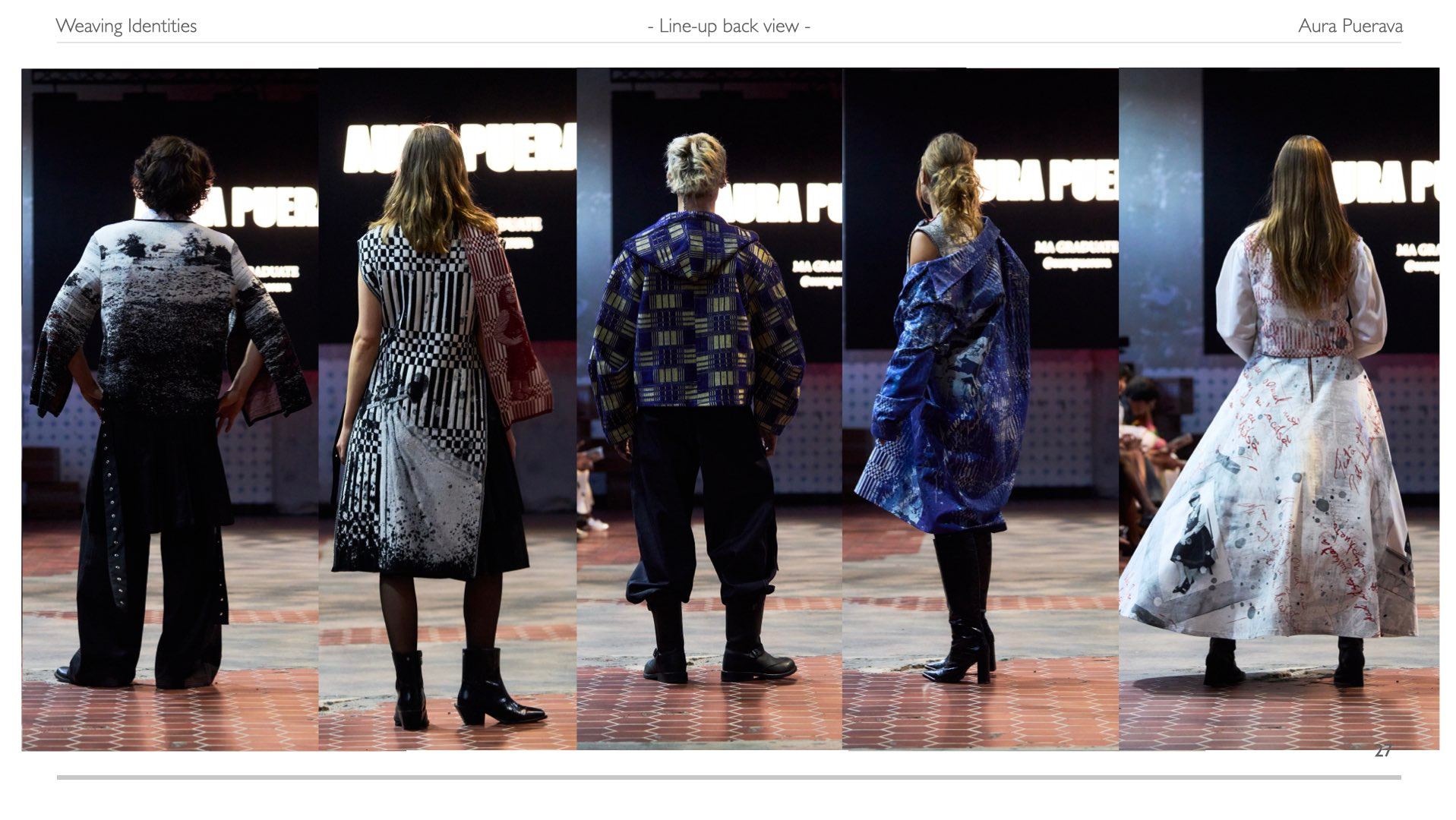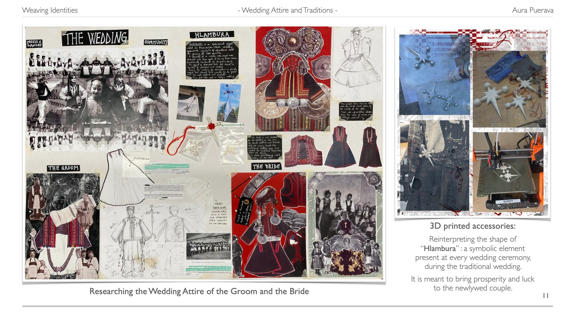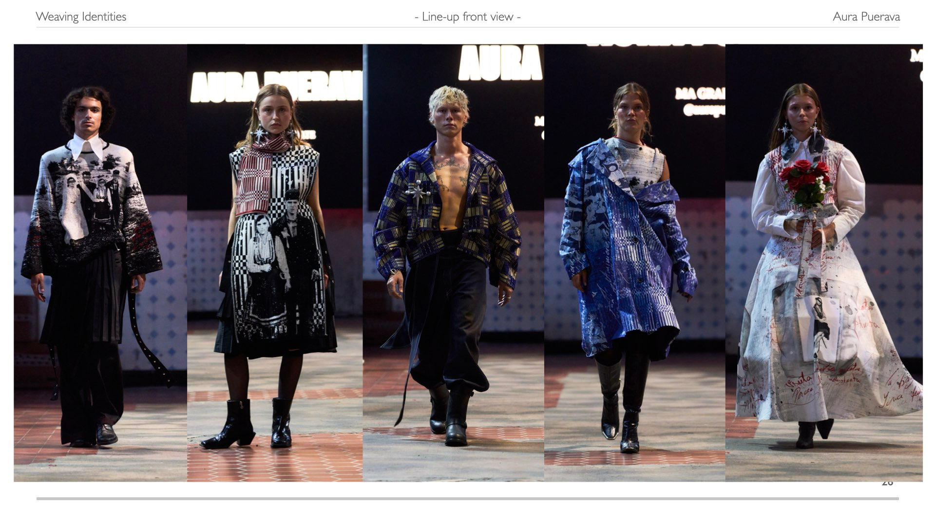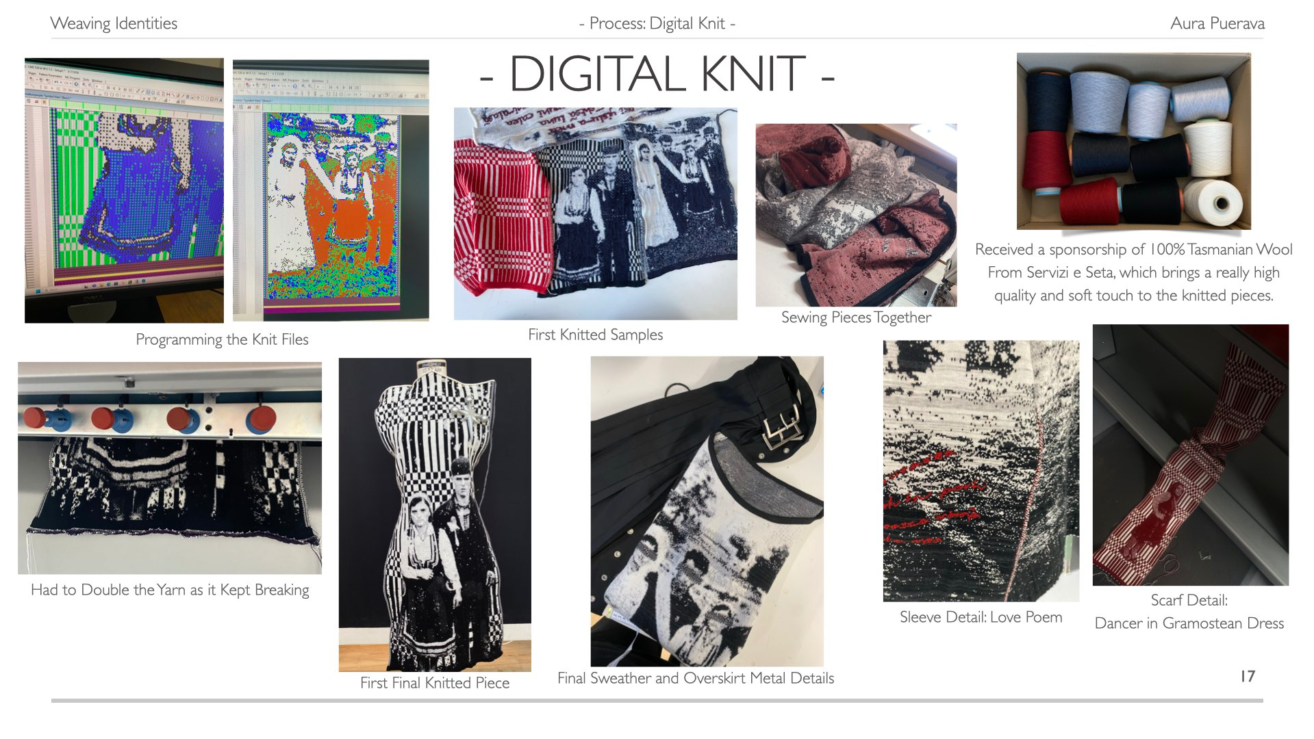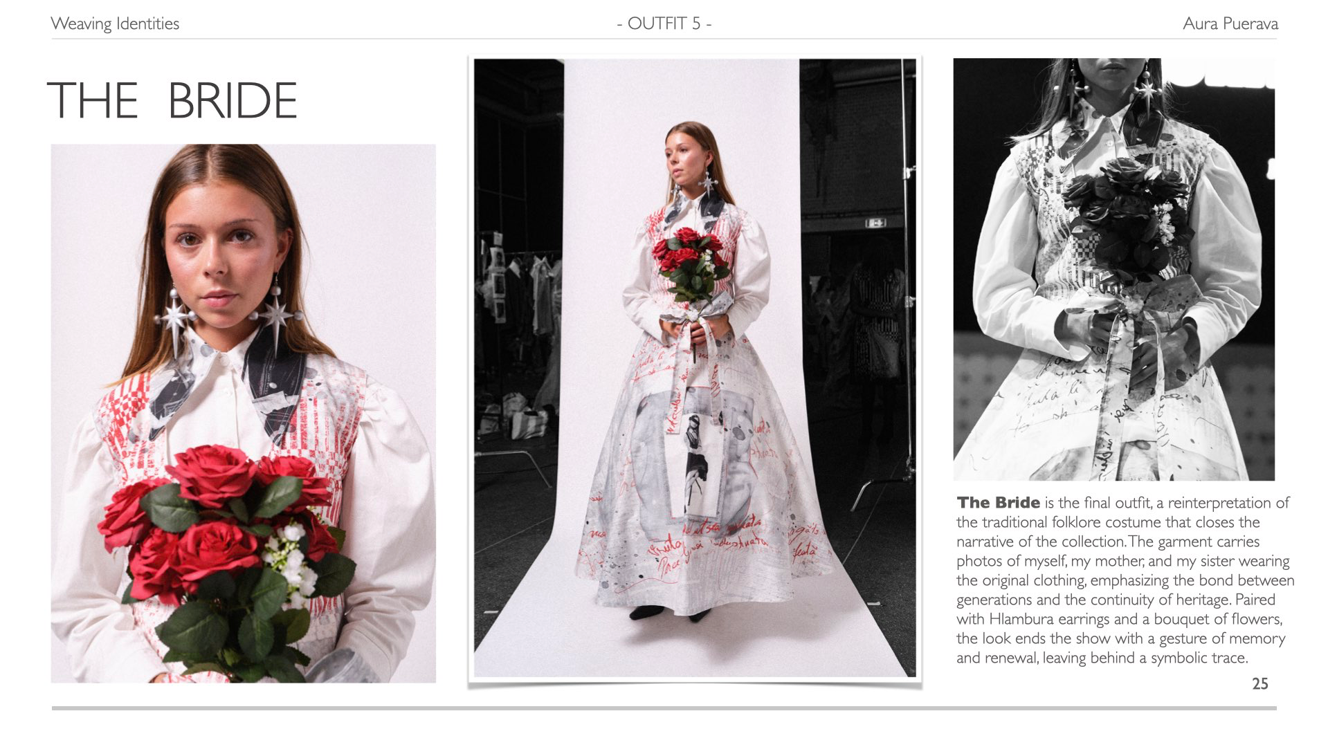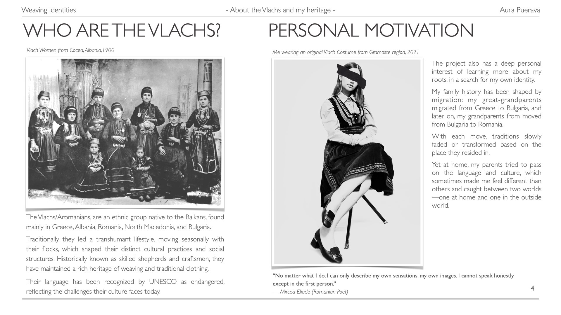 Weaving Identities explores how cultural identity evolves through clothing and textiles in the context of migration and globalisation, focusing on the Vlach/Aromanian ethnic group, whose traditions and language are gradually fading. The project began with an over 70-year-old woven fabric created by my grandmother, which inspired a field trip to Central Macedonia, Greece, where part of my family once lived, to study traditional weaving techniques and folkloric clothing. This fabric's motif is reinterpreted in the collection using contemporary methods such as digital knitting and digital printing. By combining family archives, fragments of history and storytelling through fashion, the collection investigates how fading traditions can be reimagined and preserved, making them relevant for younger generations.