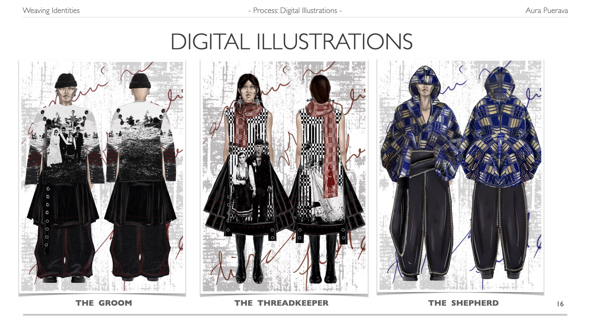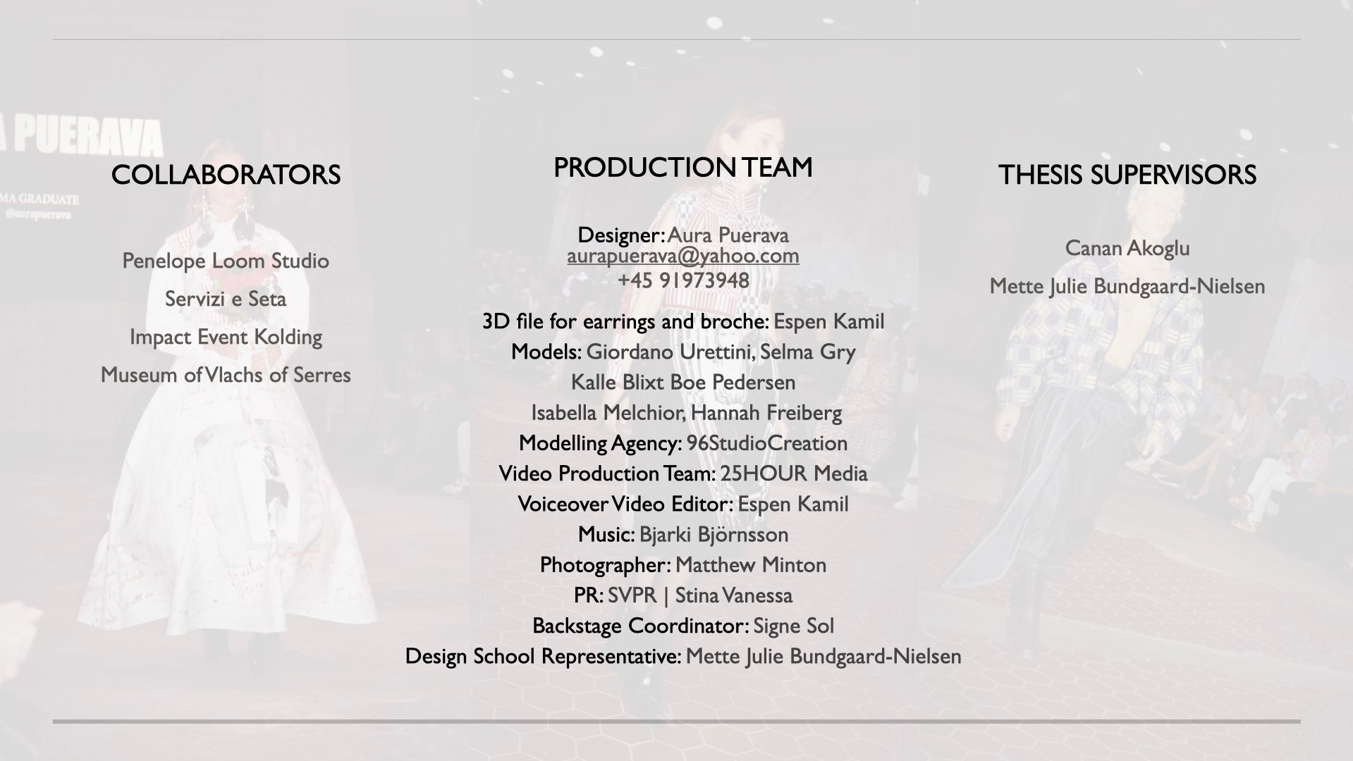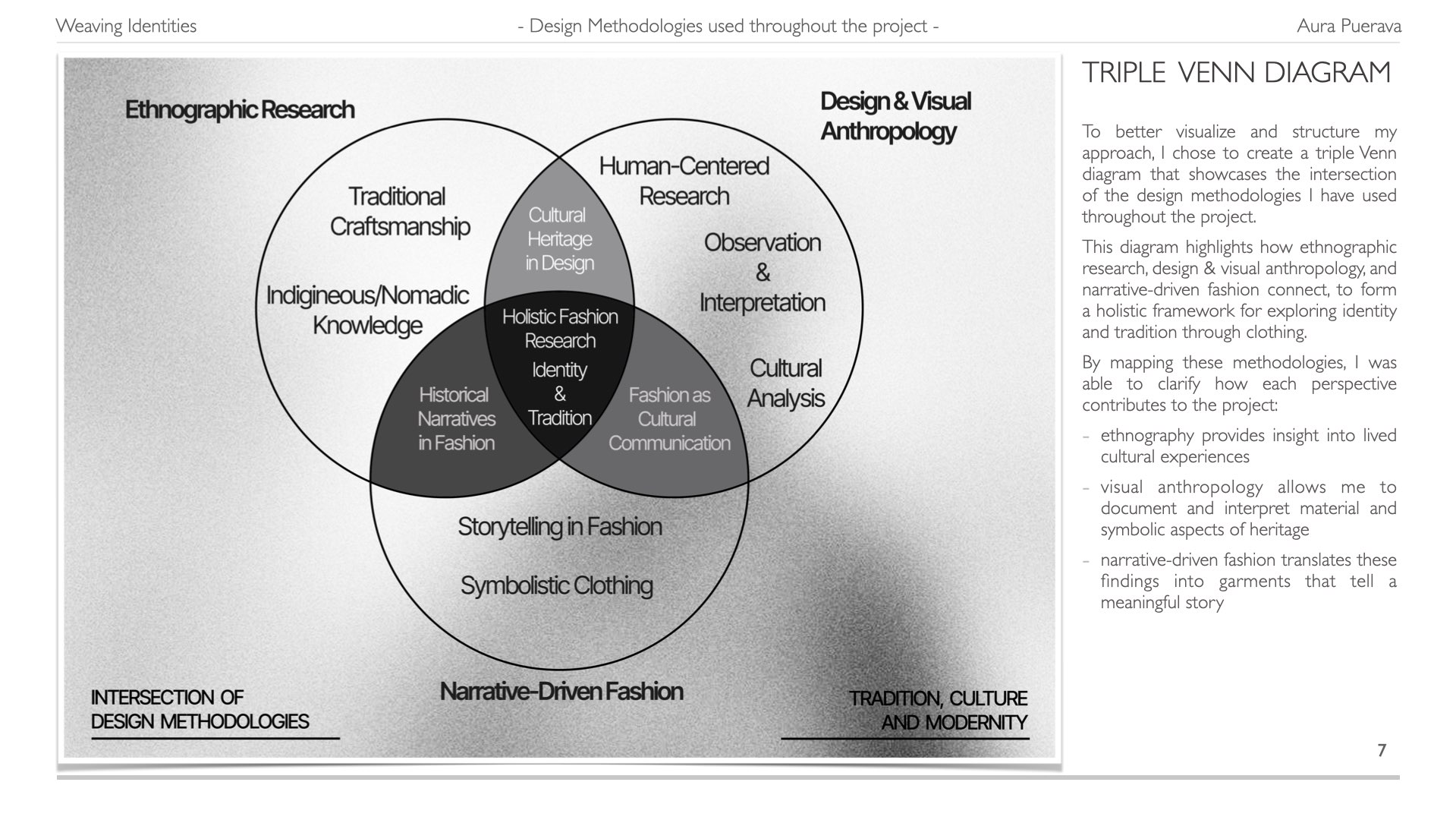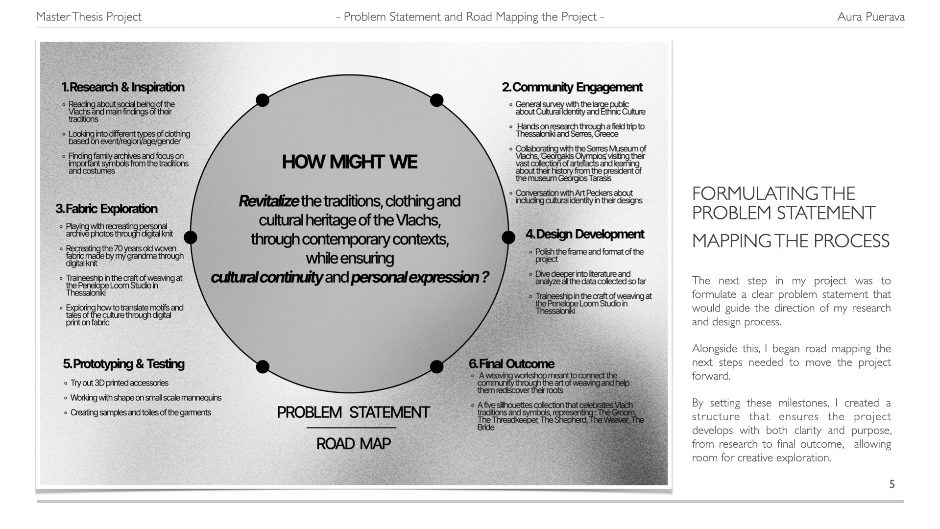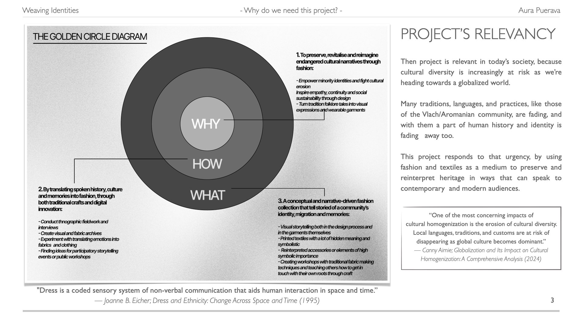 Weaving Identities explores how cultural identity evolves through clothing and textiles in the context of migration and globalisation, focusing on the Vlach/Aromanian ethnic group, whose traditions and language are gradually fading. The project began with an over 70-year-old woven fabric created by my grandmother, which inspired a field trip to Central Macedonia, Greece, where part of my family once lived, to study traditional weaving techniques and folkloric clothing. This fabric's motif is reinterpreted in the collection using contemporary methods such as digital knitting and digital printing. By combining family archives, fragments of history and storytelling through fashion, the collection investigates how fading traditions can be reimagined and preserved, making them relevant for younger generations.