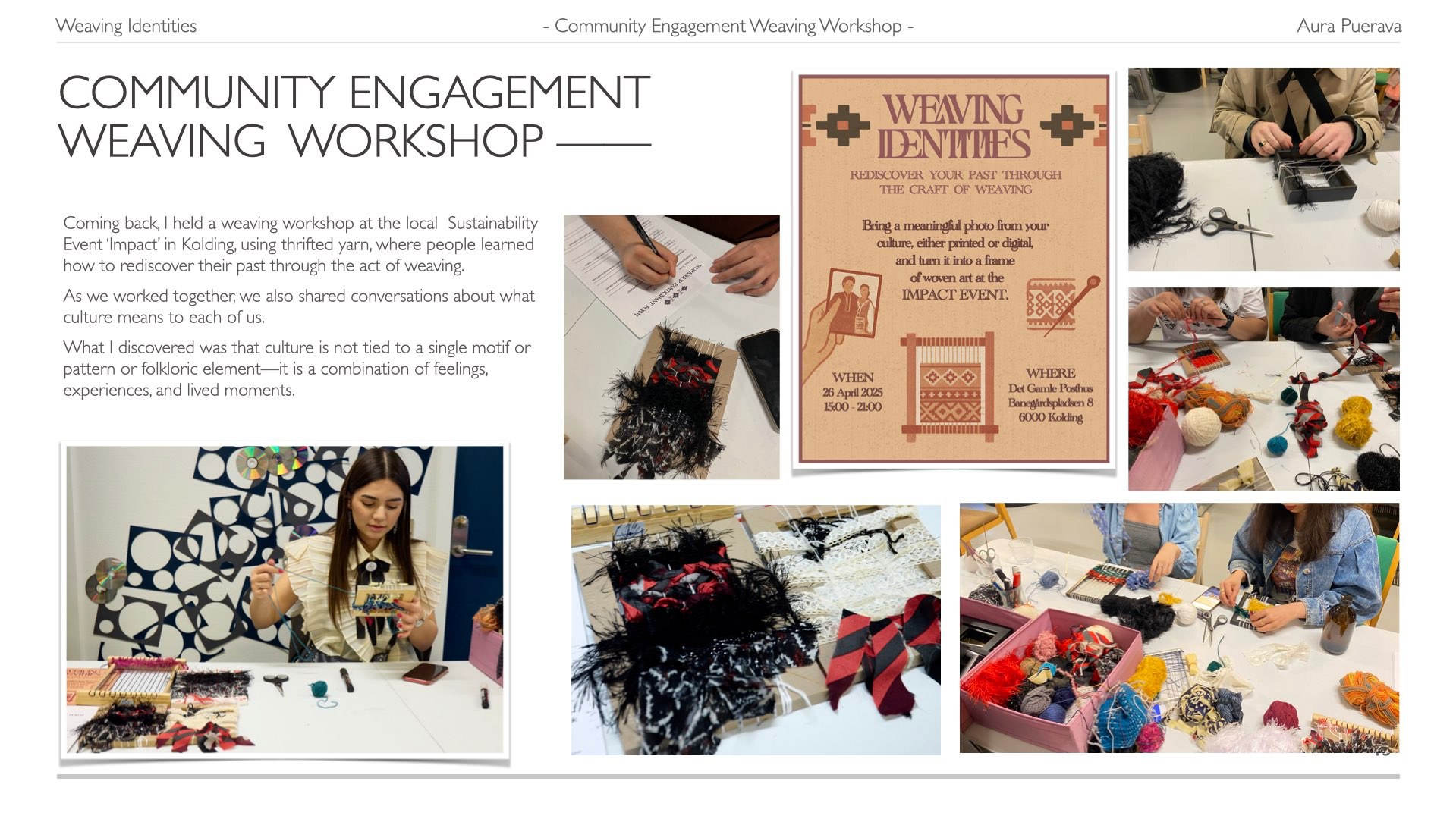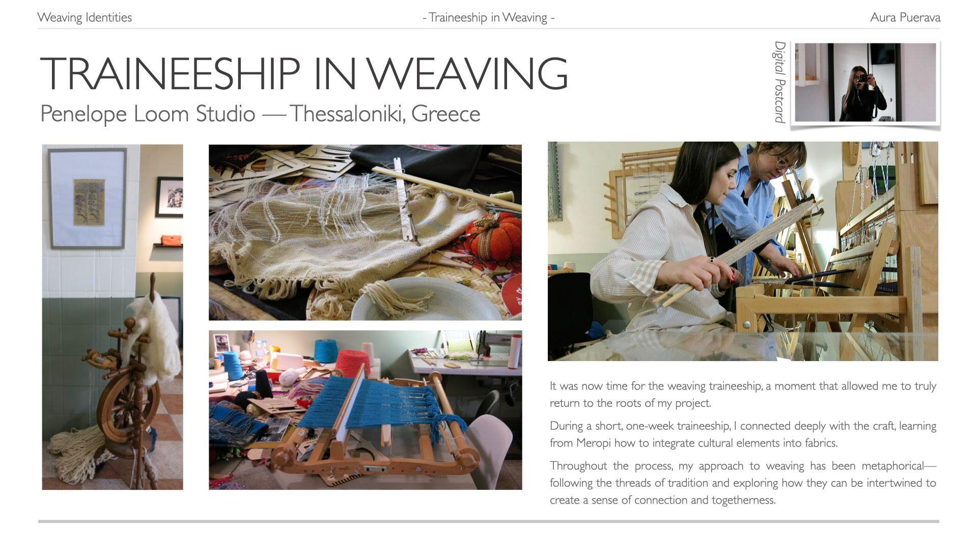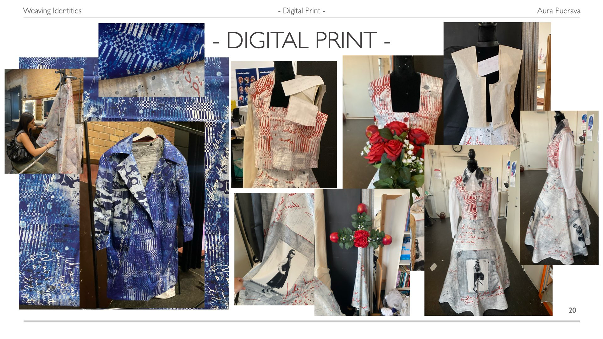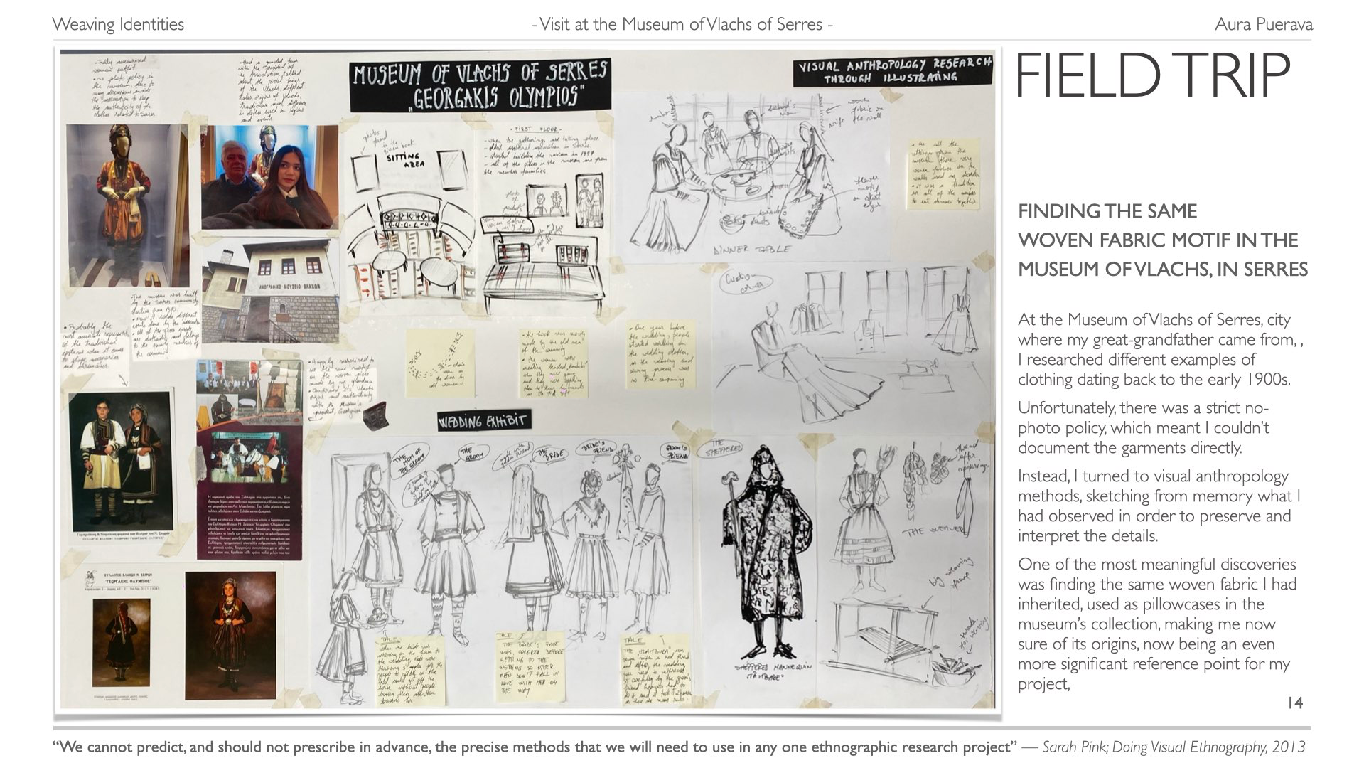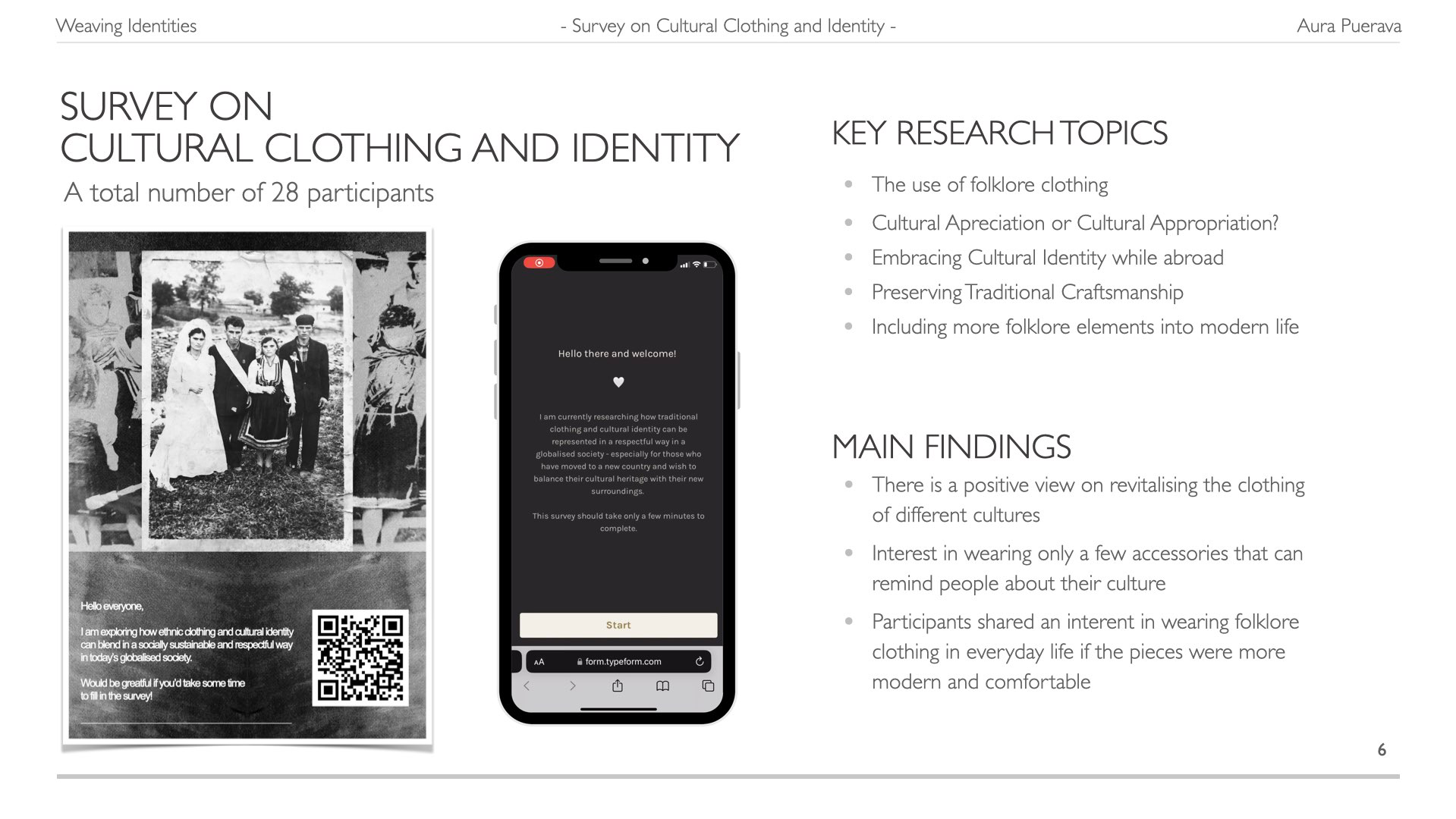 Weaving Identities explores how cultural identity evolves through clothing and textiles in the context of migration and globalisation, focusing on the Vlach/Aromanian ethnic group, whose traditions and language are gradually fading. The project began with an over 70-year-old woven fabric created by my grandmother, which inspired a field trip to Central Macedonia, Greece, where part of my family once lived, to study traditional weaving techniques and folkloric clothing. This fabric's motif is reinterpreted in the collection using contemporary methods such as digital knitting and digital printing. By combining family archives, fragments of history and storytelling through fashion, the collection investigates how fading traditions can be reimagined and preserved, making them relevant for younger generations.