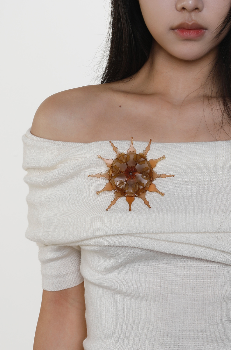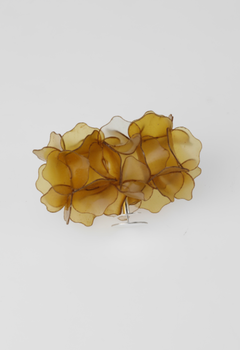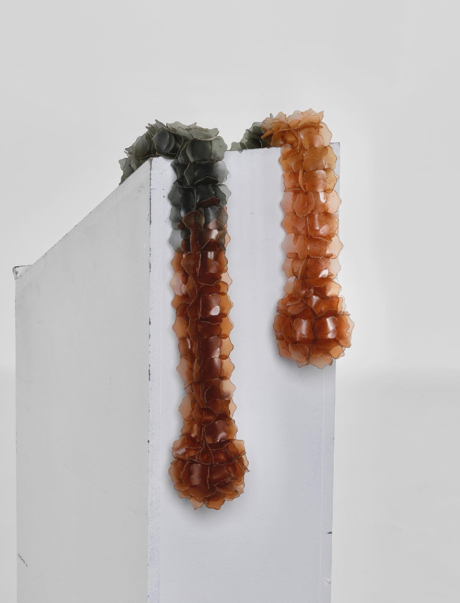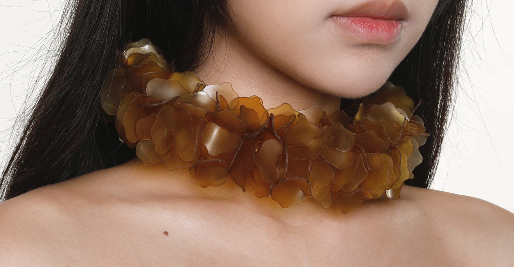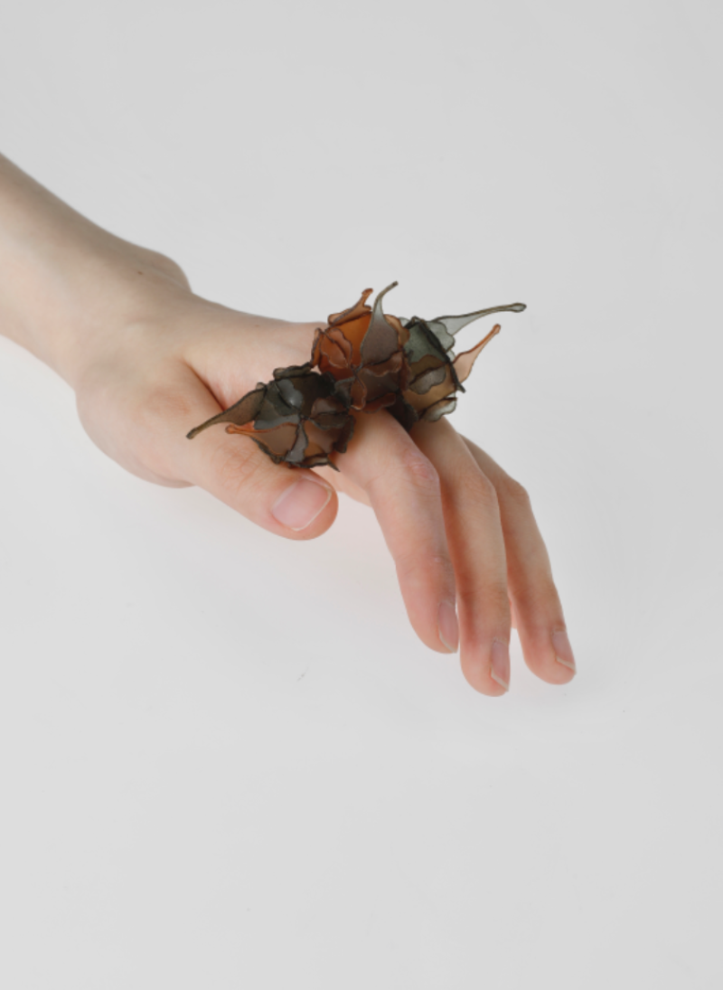 The project explores jewellery as a living extension of the marine cycle. Using fish scale bioplastic—a biodegradable material developed from discarded fish waste—I transform overlooked residue into poetic, wearable forms. Inspired by seaweed, plankton, and coral, the modular designs expand and flow across the body like organisms reclaiming space. Coloured with natural plant and fruit dyes, the pieces highlight the vibrancy and fragility of marine ecosystems. Designed to biodegrade, they invite reflection on impermanence and our relationship with adornment, offering an alternative narrative rooted in transformation, ecological responsibility, and the rhythms of the sea.